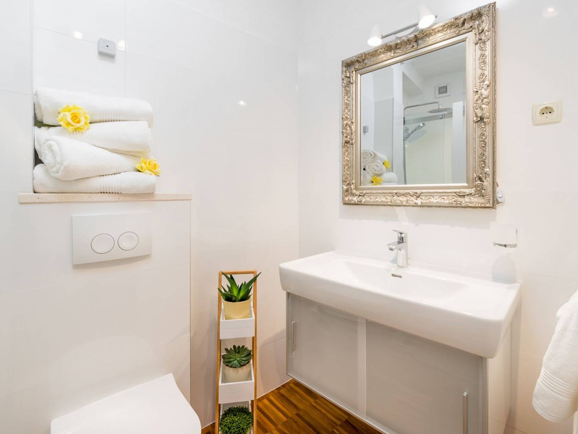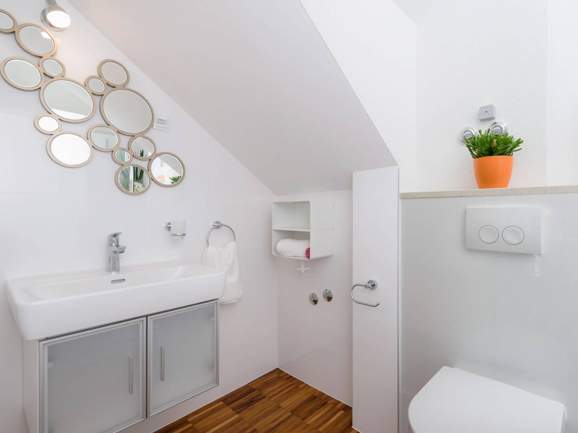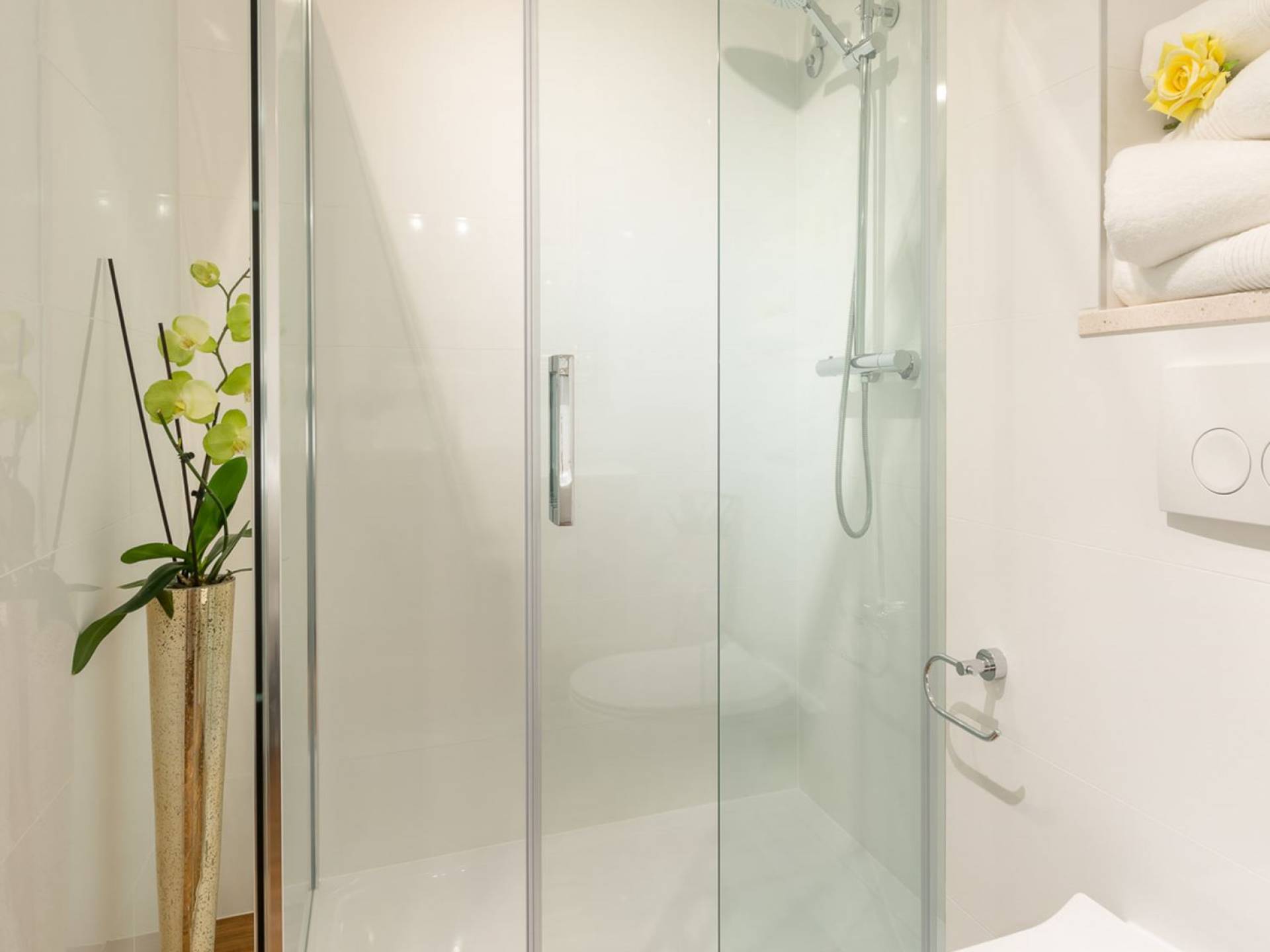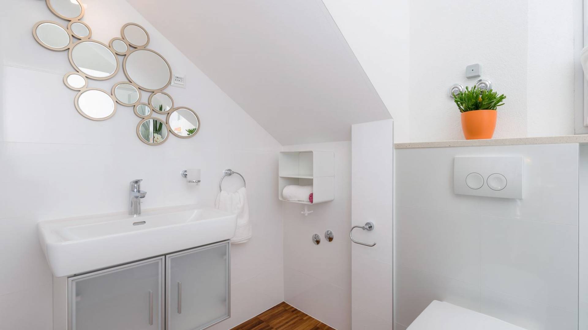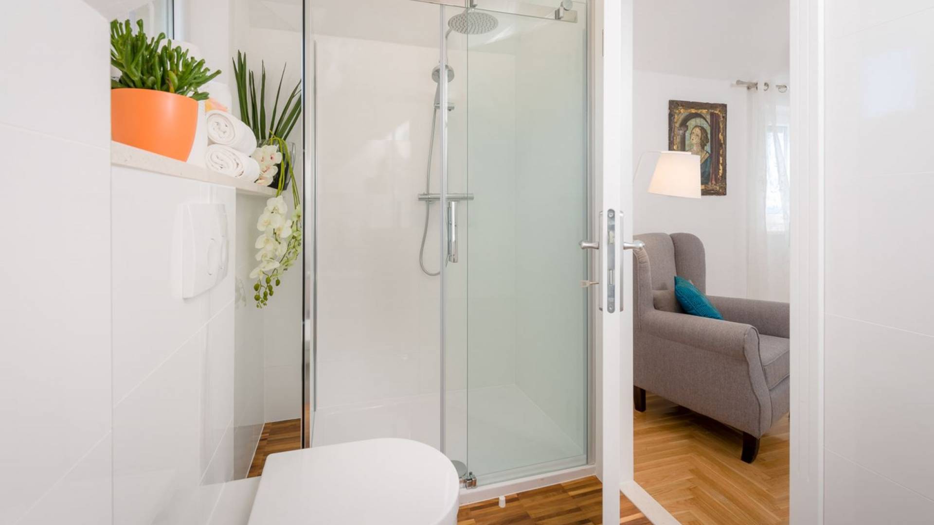 На верхнем этаже есть две спальни хорошего размера, обе с паркетным полом, одна с двуспальной кроватью, а другая с двумя односпальными кроватями. В каждом номере есть ванная комната. Спальня с двуспальной кроватью имеет вид на юг и запад, а это значит, что из нее открывается прекрасный вид на море.
