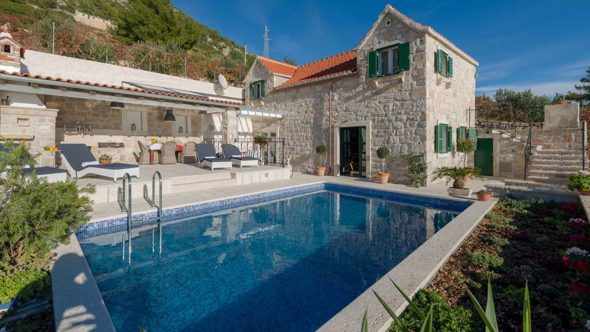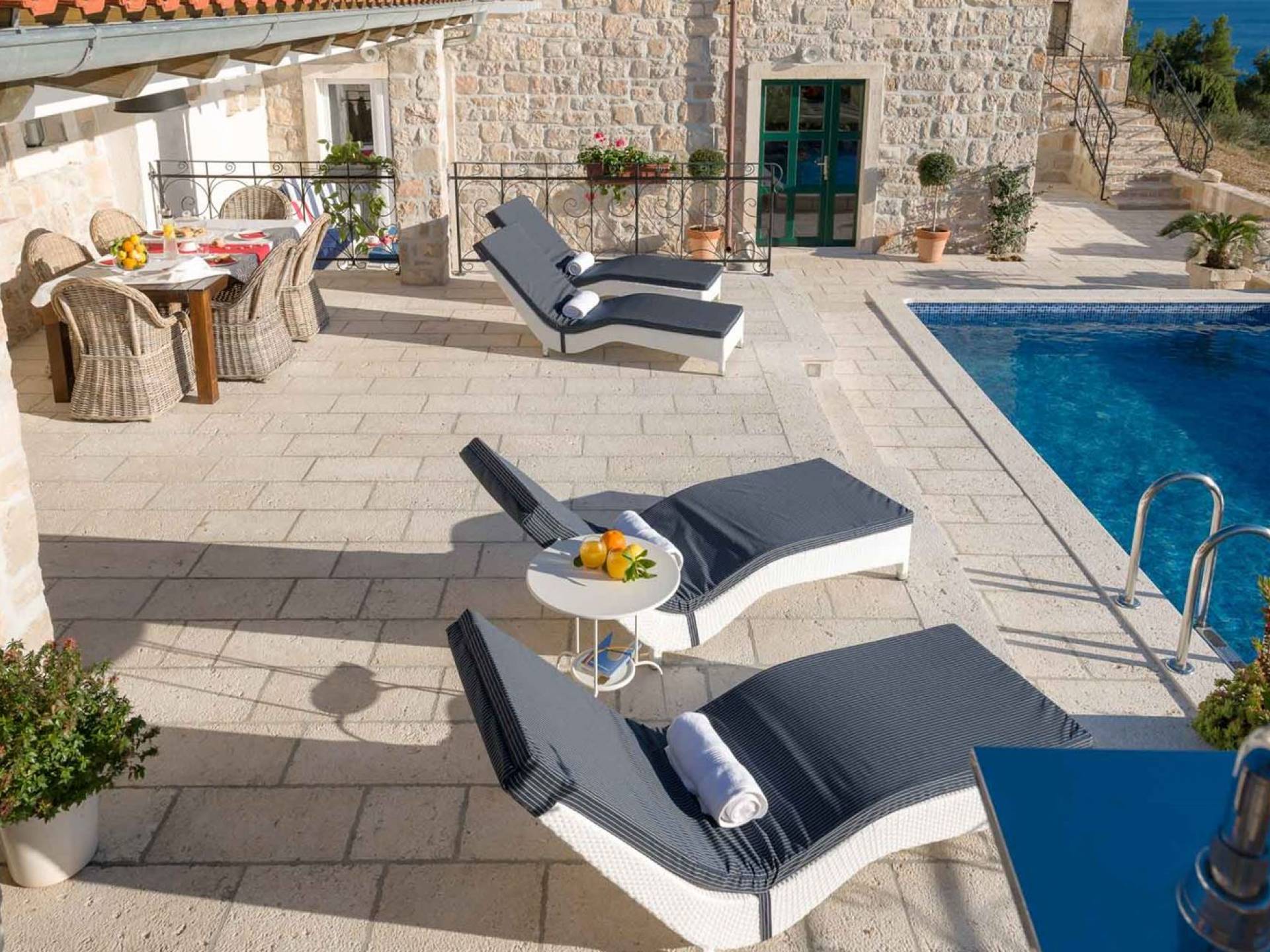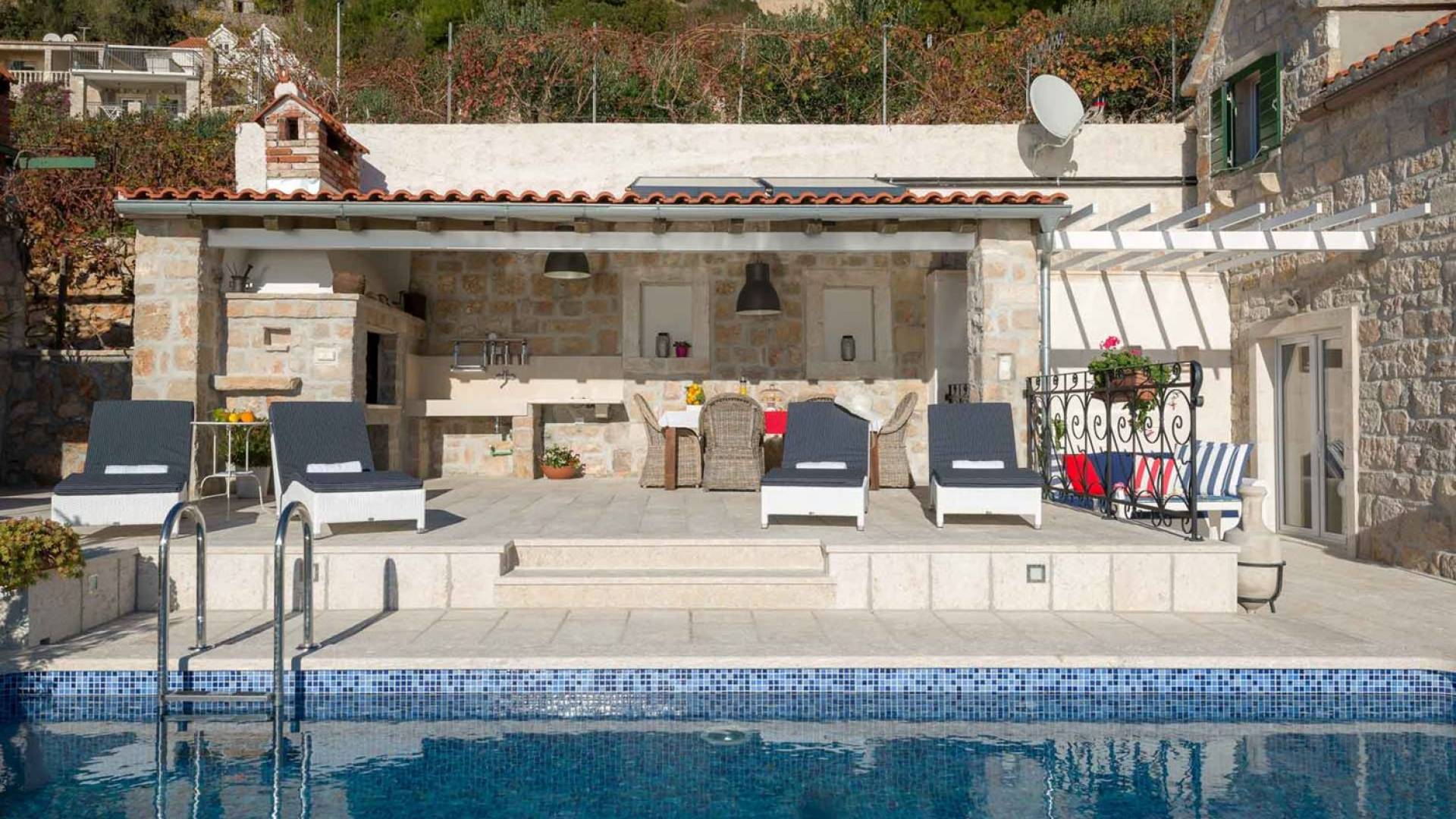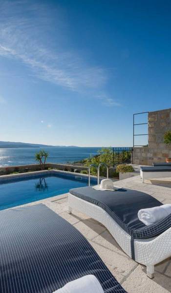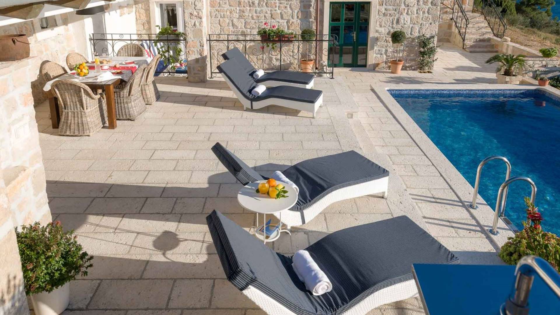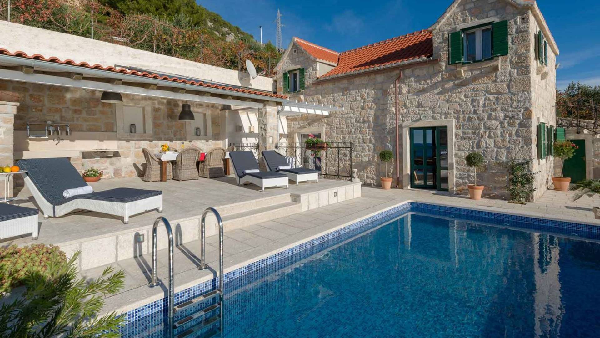 Двери гостиной на первом этаже выходят на большую частично крытую террасу, оборудованную всем кухонным оборудованием для приготовления пищи на свежем воздухе. За большим деревянным столом под крытой террасой с видом на море могут легко разместиться 6 человек. Каменная терраса сочетает в себе бассейн, окруженный удобными шезлонгами, и душ на открытом воздухе.