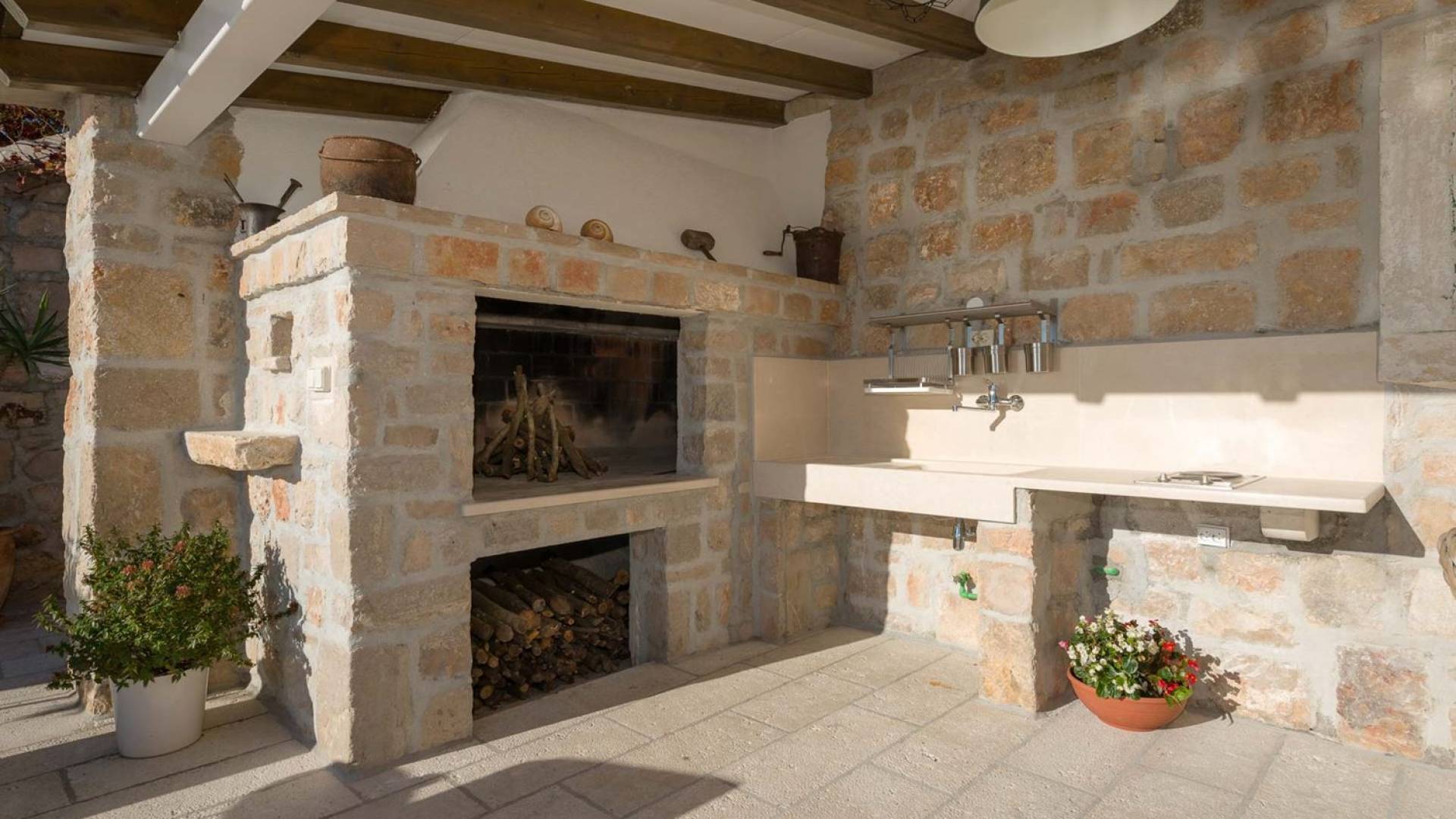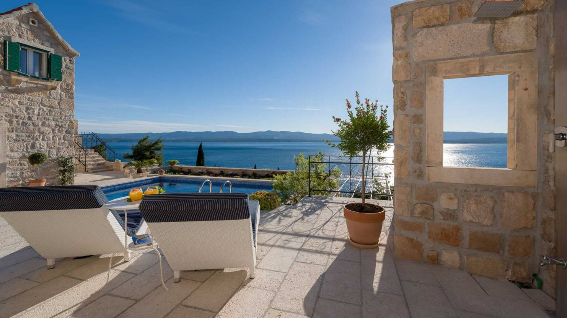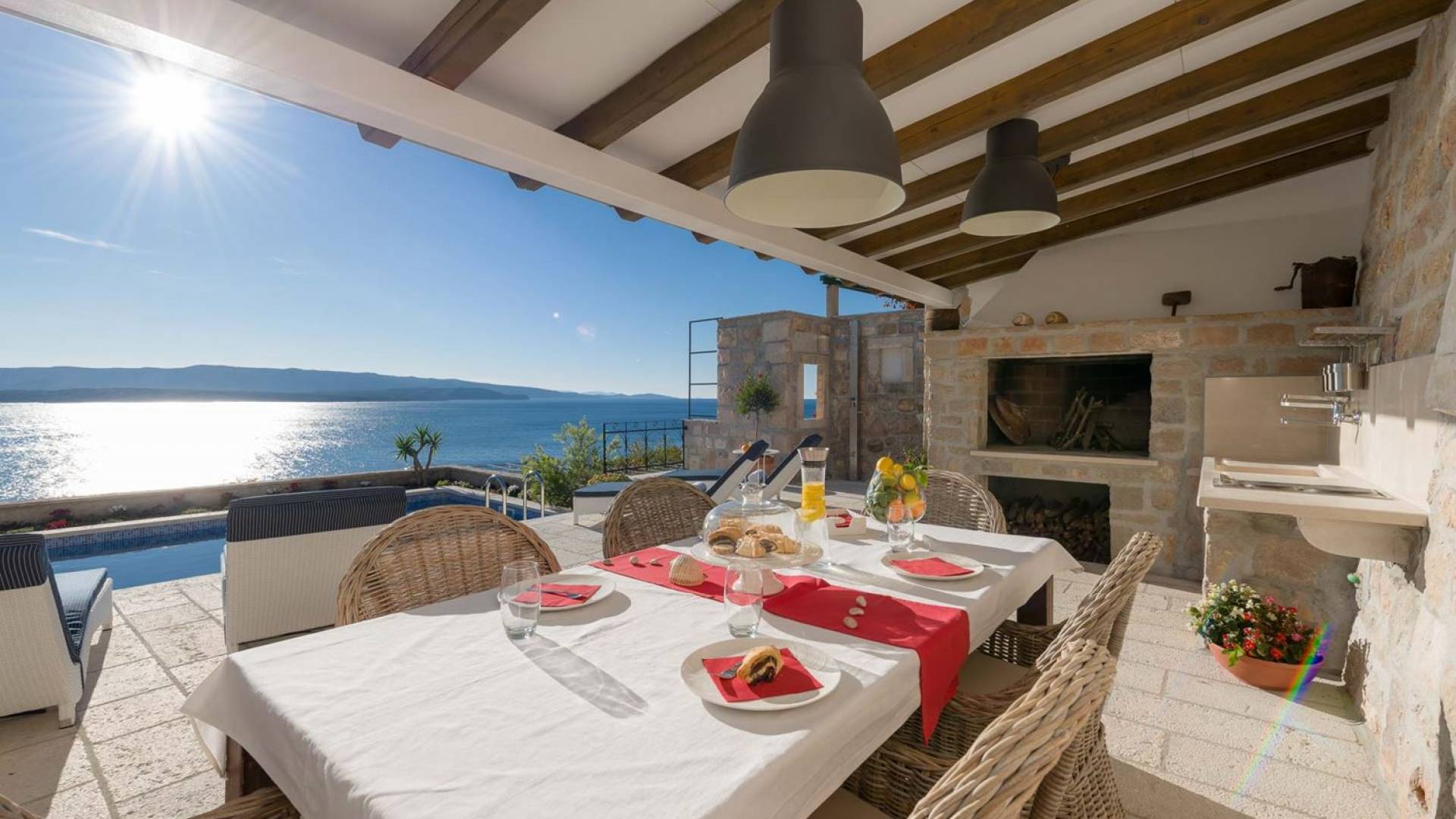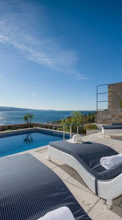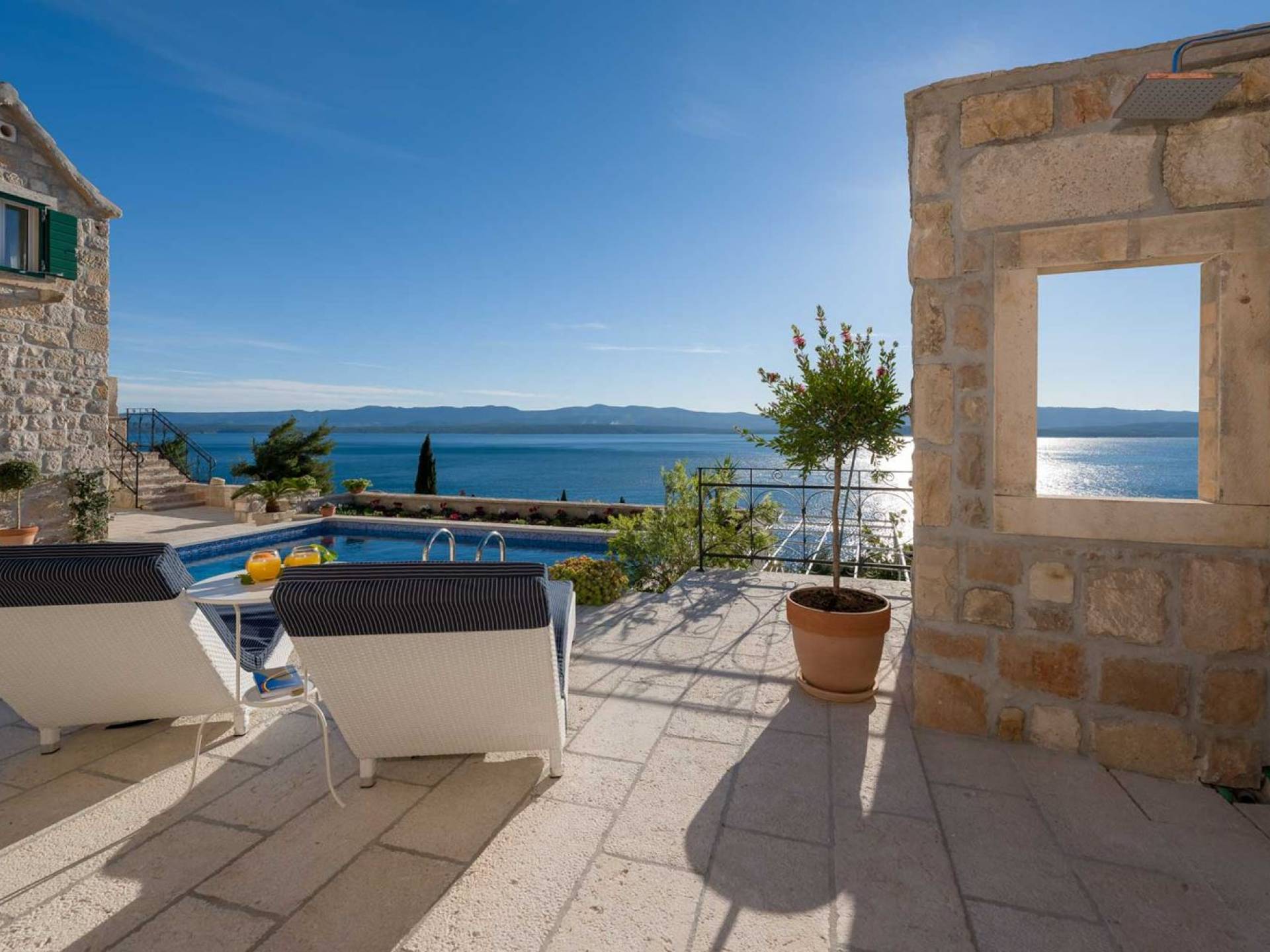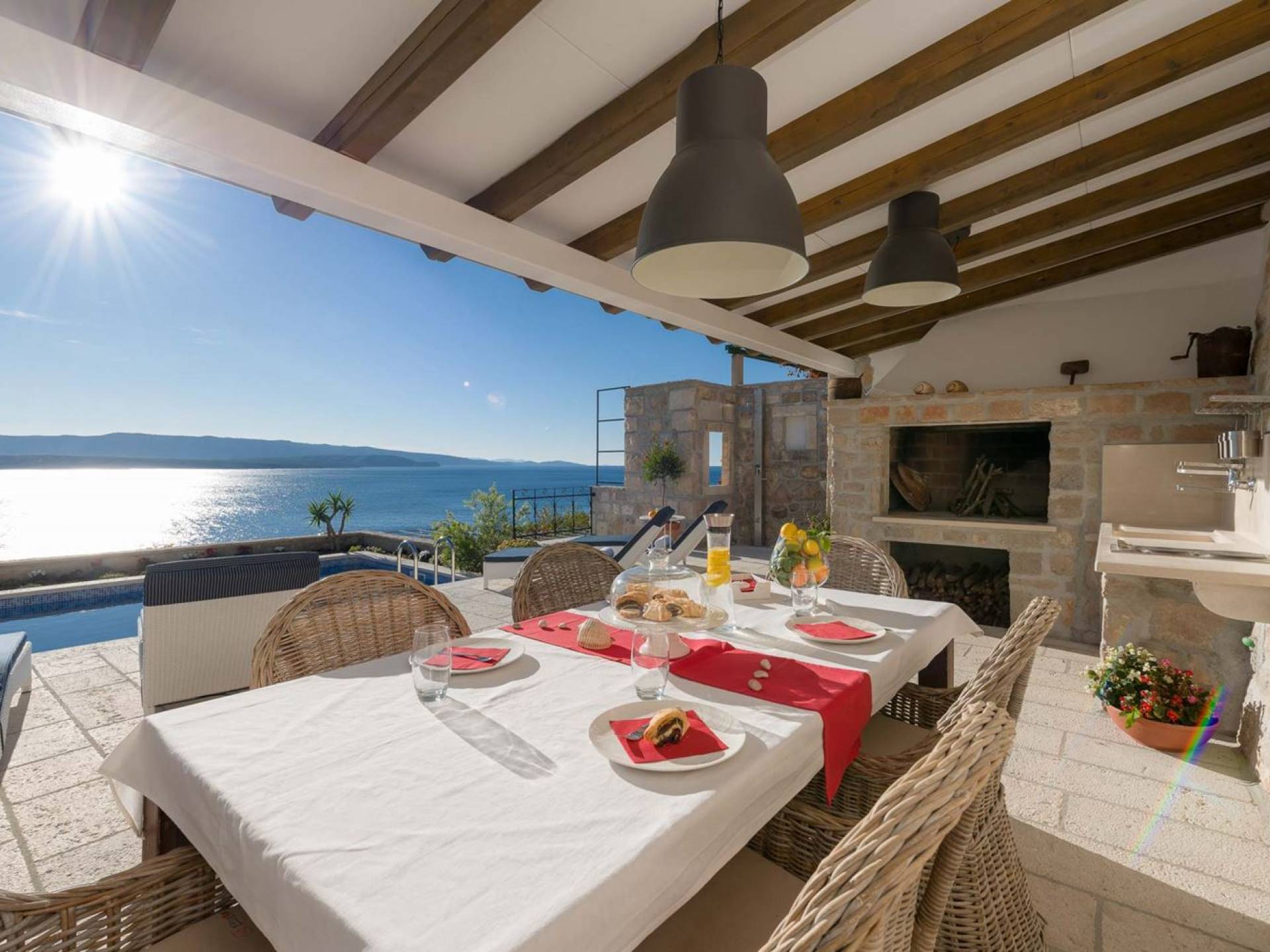 Двери гостиной на первом этаже выходят на большую частично крытую террасу, оборудованную всем кухонным оборудованием для приготовления пищи на свежем воздухе. За большим деревянным столом под крытой террасой с видом на море могут легко разместиться 6 человек. Каменная терраса сочетает в себе бассейн, окруженный удобными шезлонгами, и душ на открытом воздухе.
