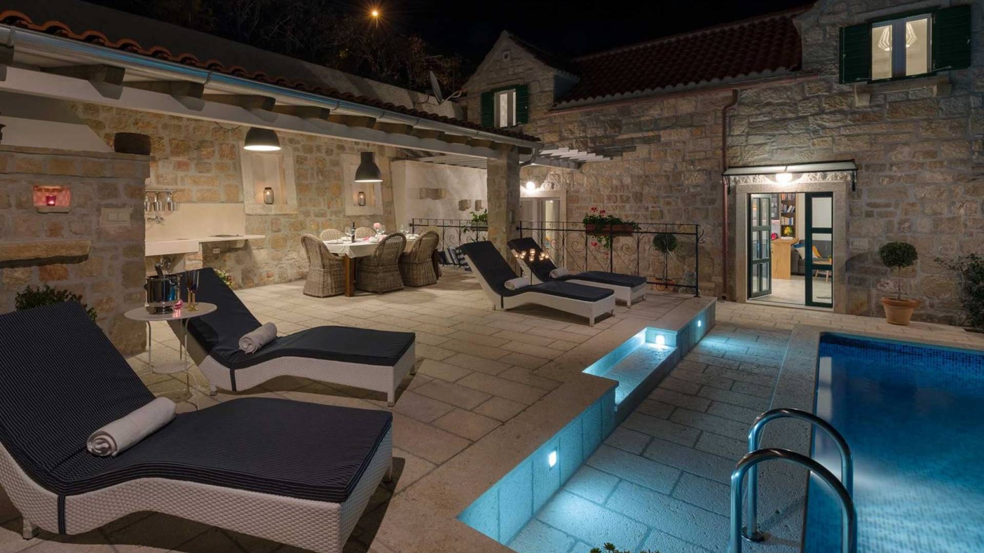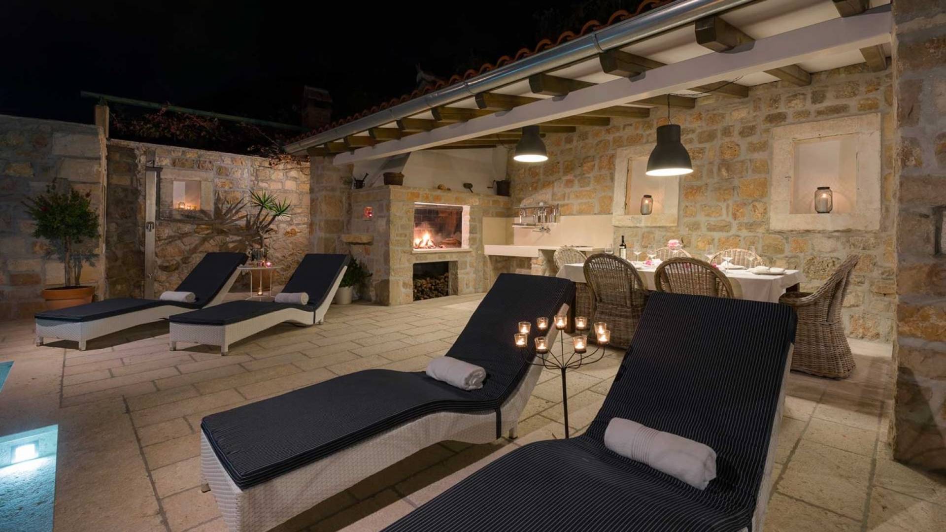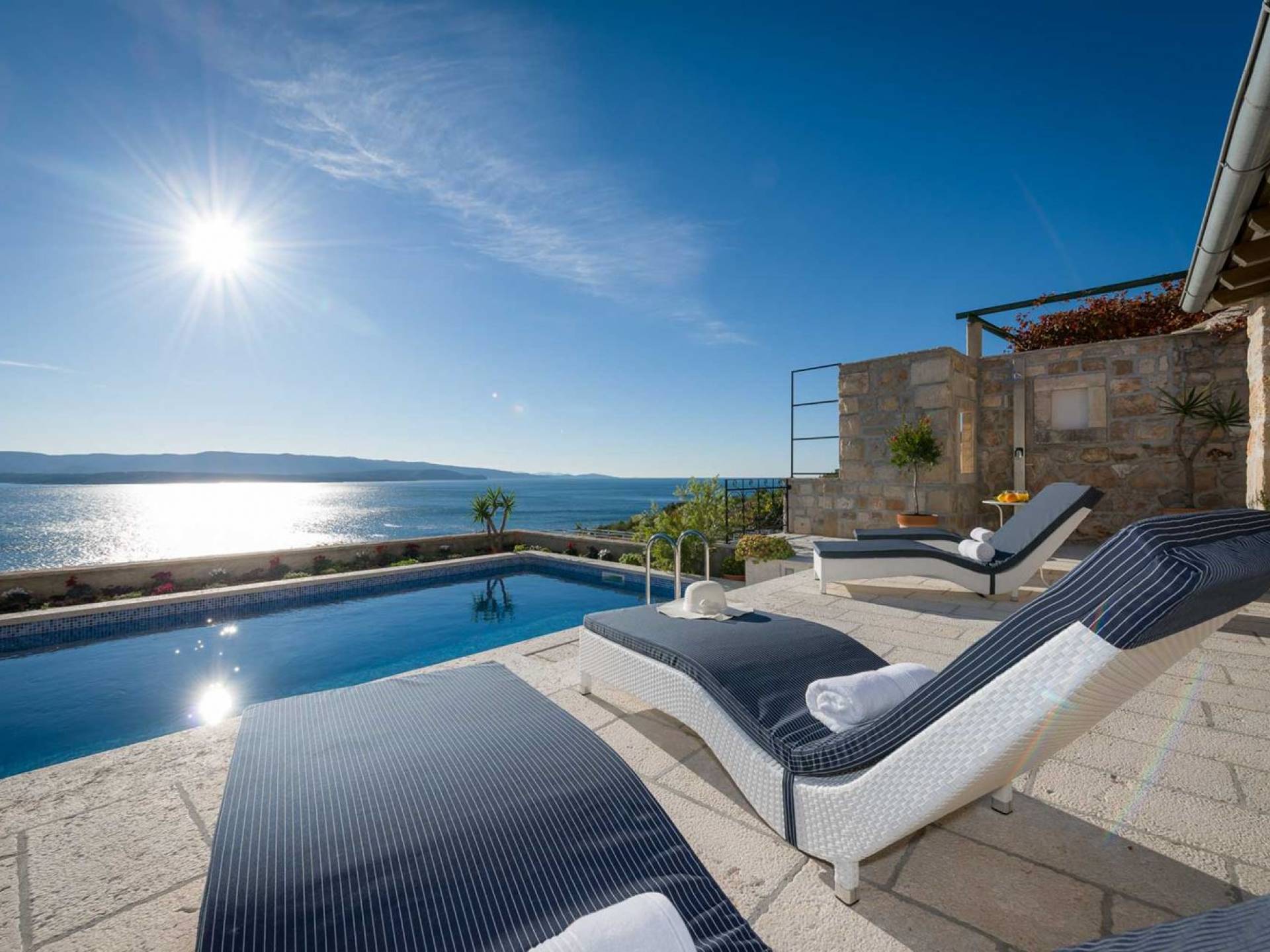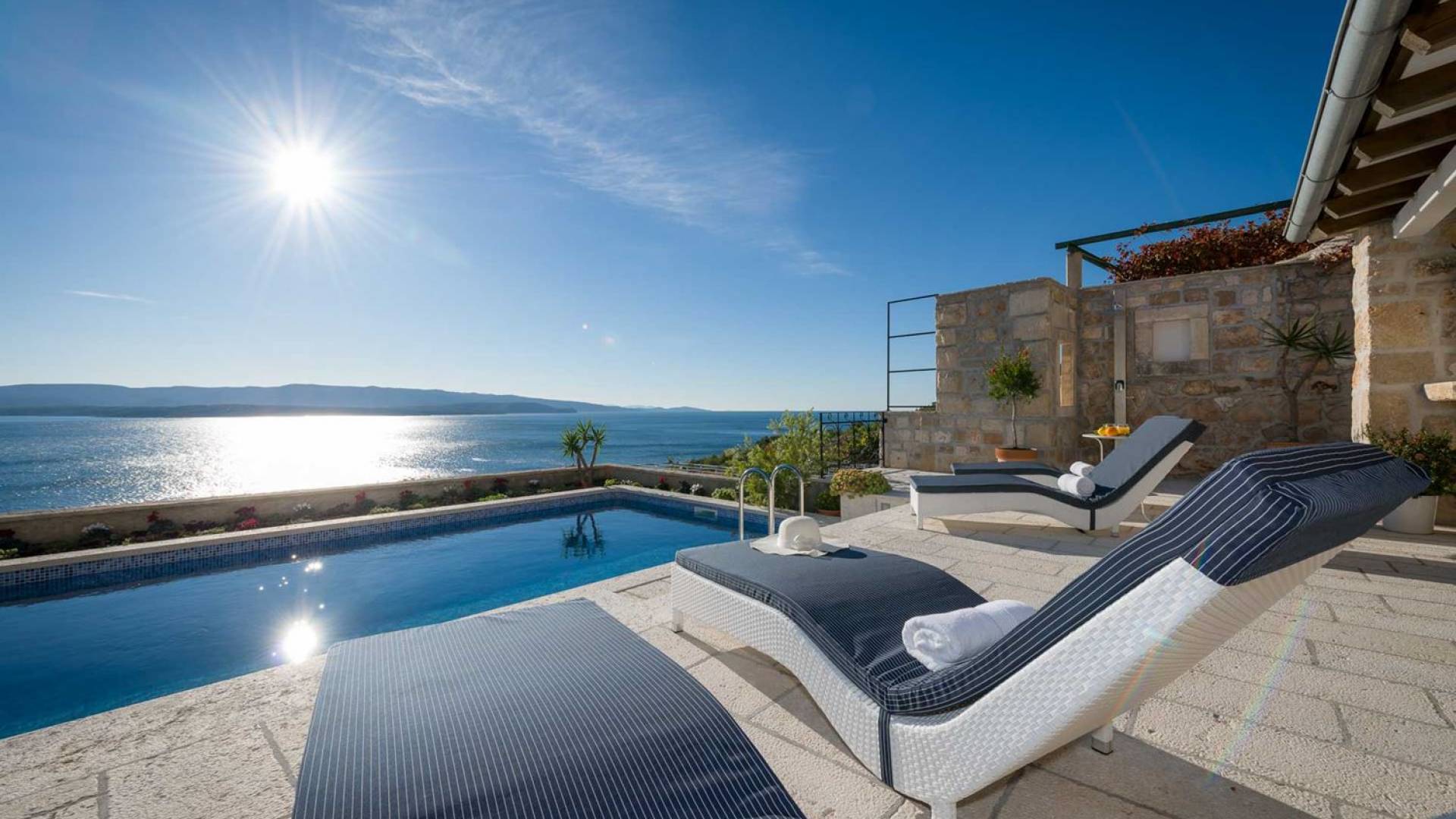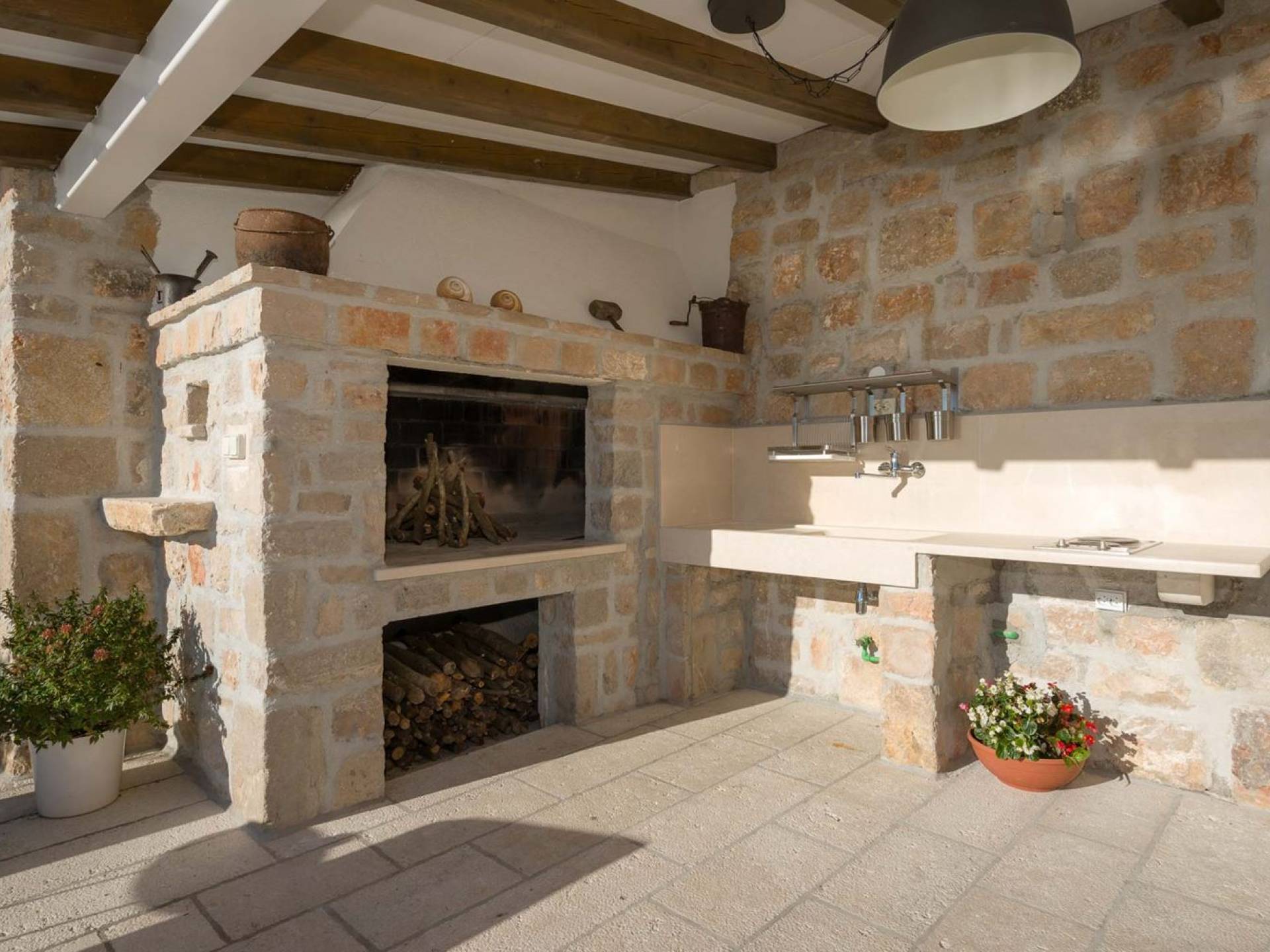 Двери гостиной на первом этаже выходят на большую частично крытую террасу, оборудованную всем кухонным оборудованием для приготовления пищи на свежем воздухе. За большим деревянным столом под крытой террасой с видом на море могут легко разместиться 6 человек. Каменная терраса сочетает в себе бассейн, окруженный удобными шезлонгами, и душ на открытом воздухе.