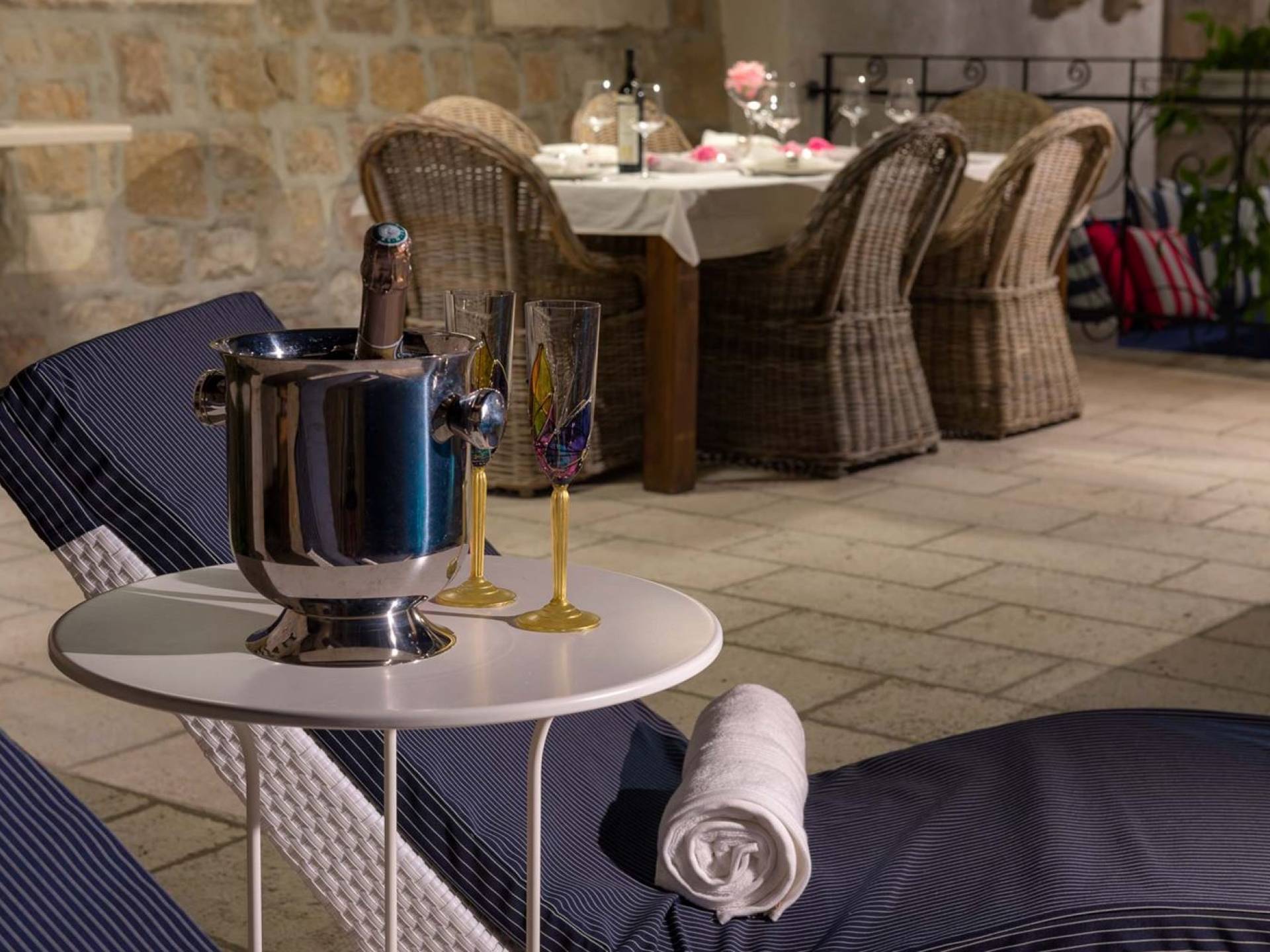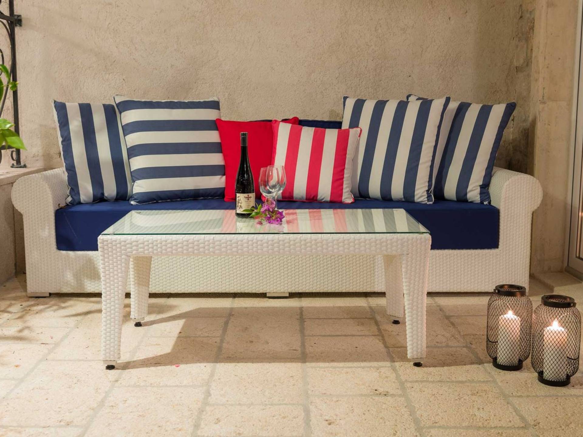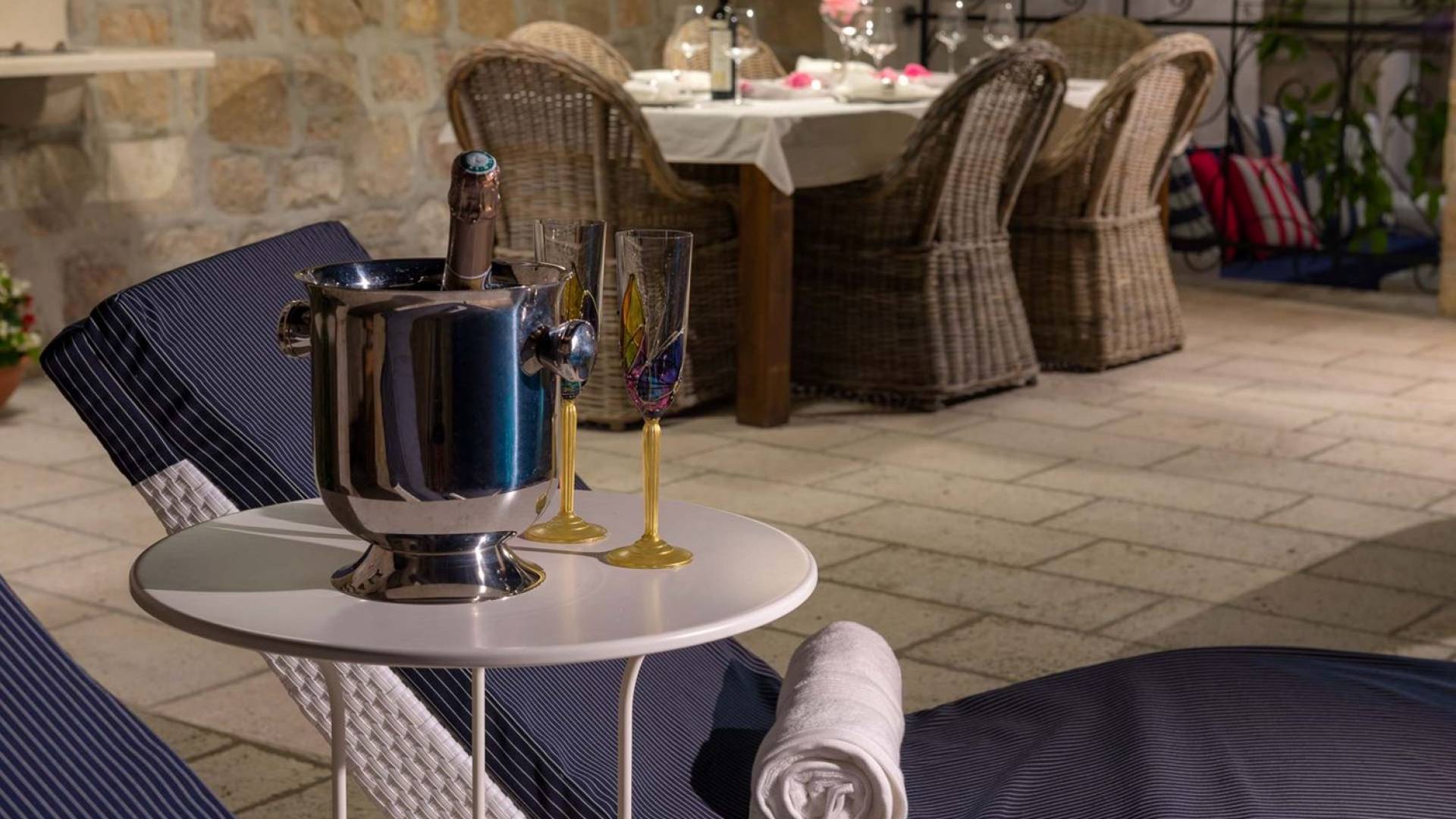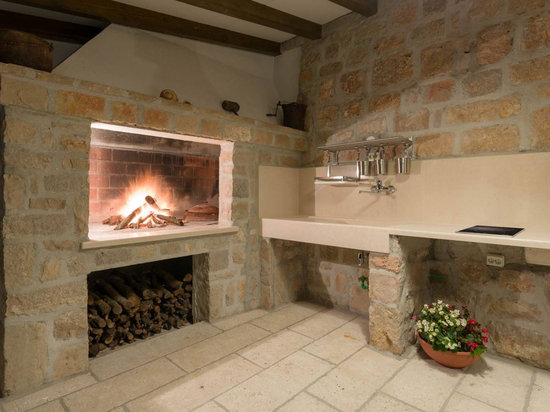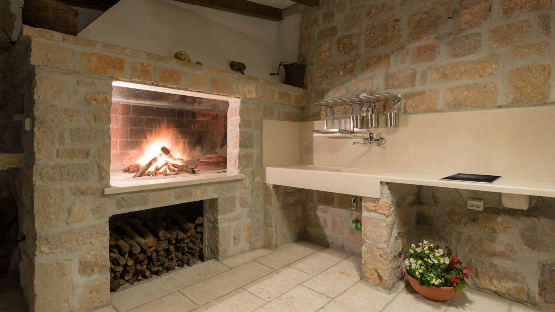 Двери гостиной на первом этаже выходят на большую частично крытую террасу, оборудованную всем кухонным оборудованием для приготовления пищи на свежем воздухе. За большим деревянным столом под крытой террасой с видом на море могут легко разместиться 6 человек. Каменная терраса сочетает в себе бассейн, окруженный удобными шезлонгами, и душ на открытом воздухе.