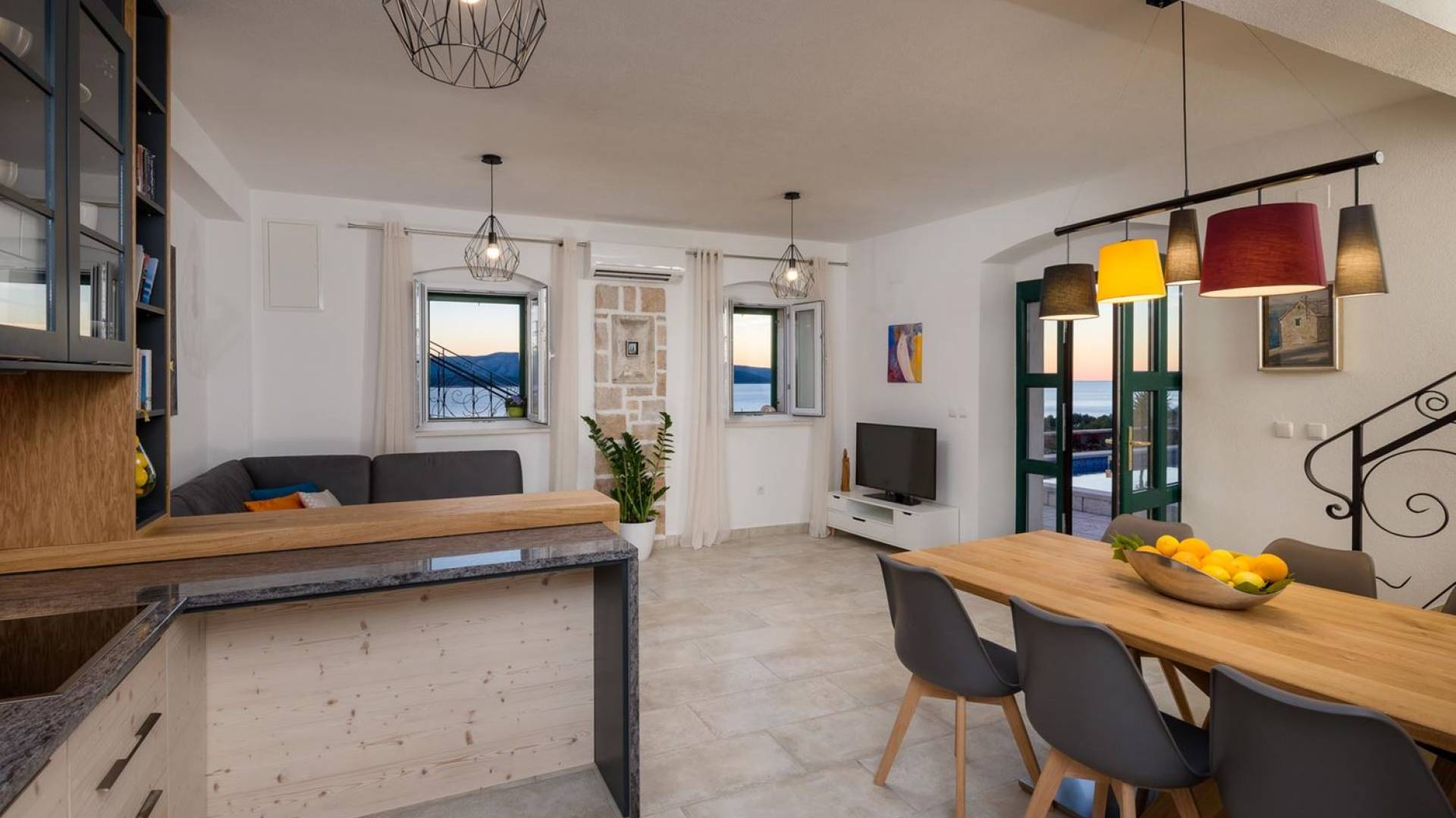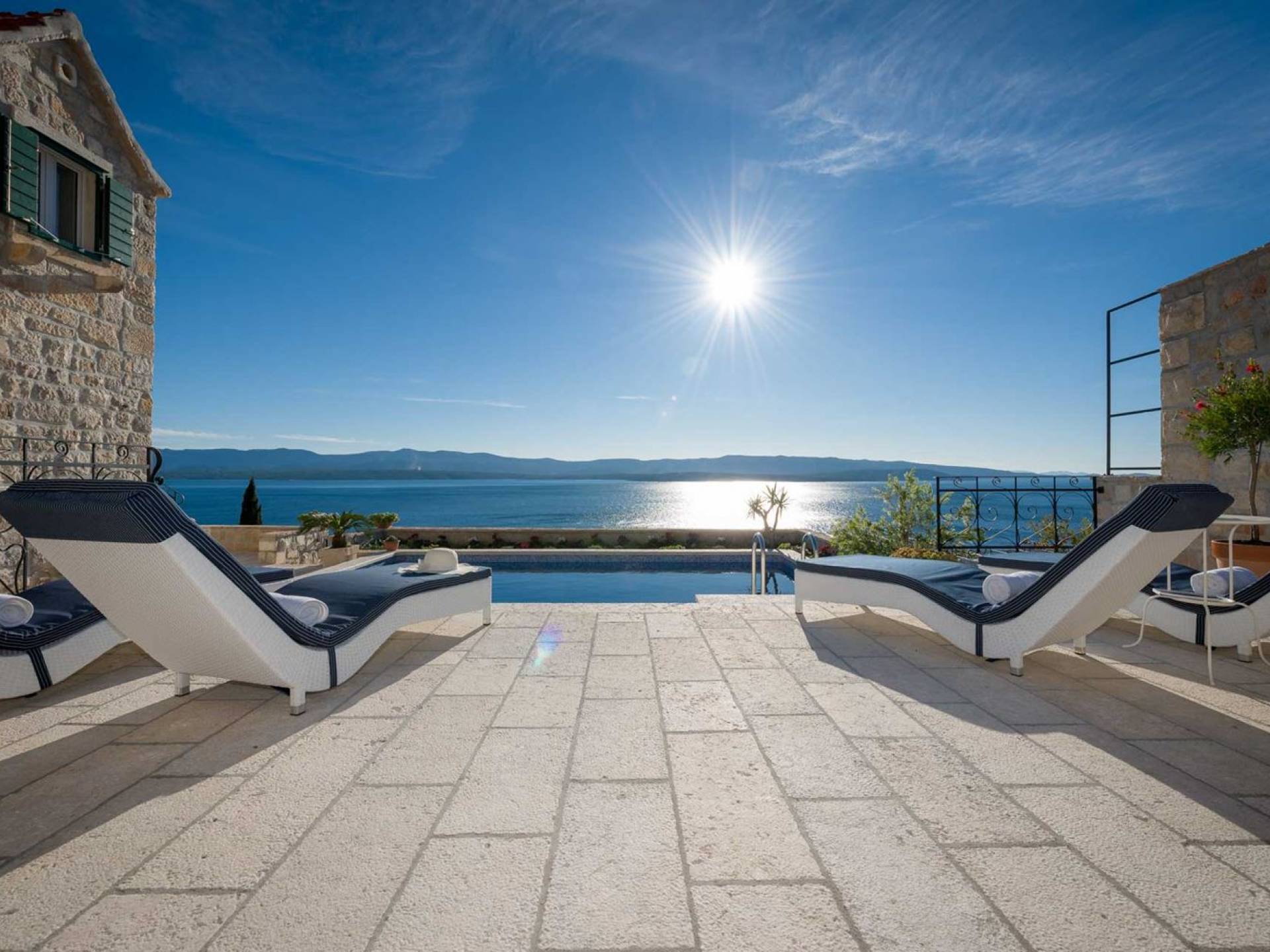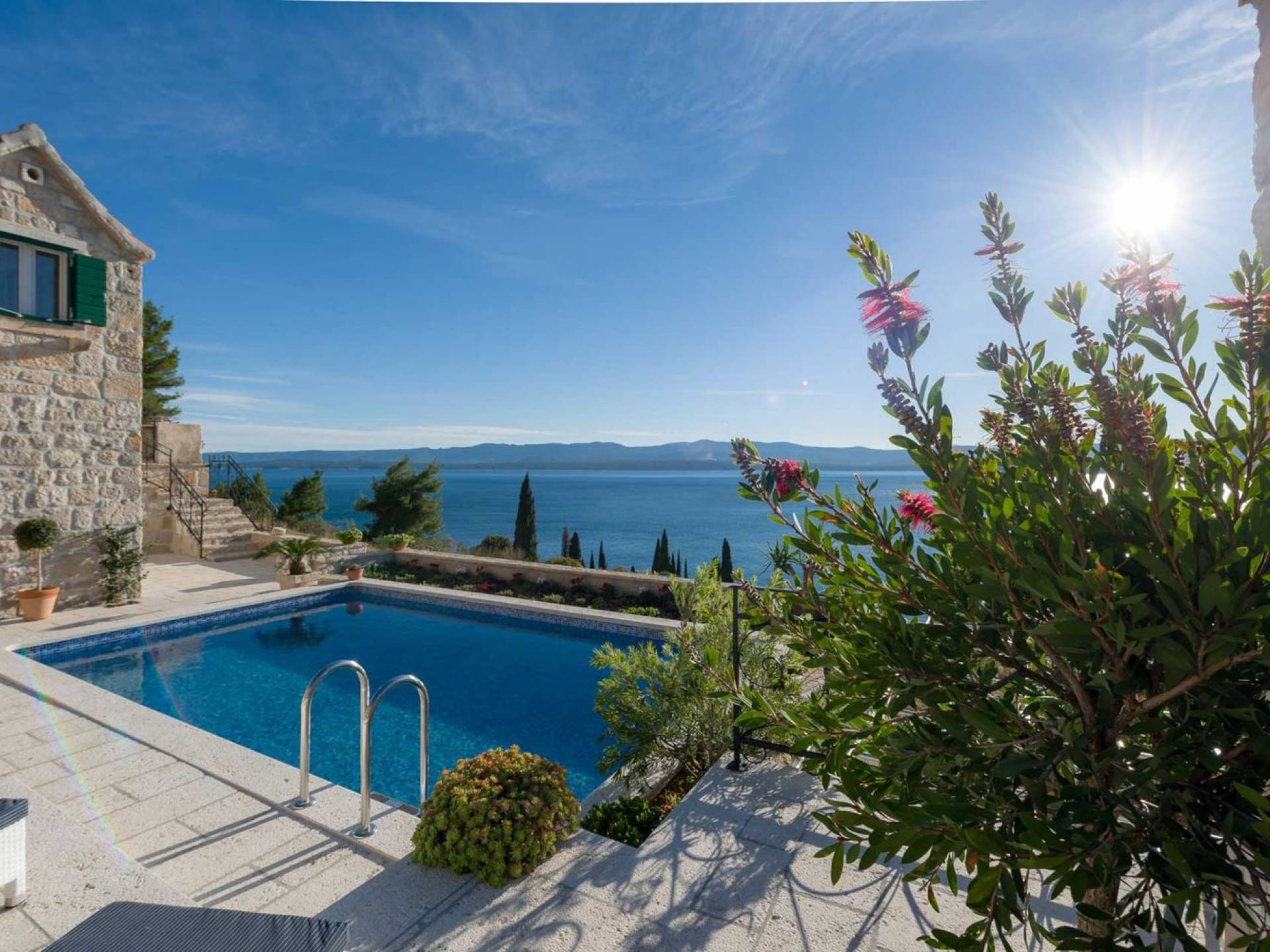 Самая волшебная часть собственности - это захватывающий дух вид на синее море, виноградники, оливковые рощи, остров Хвар... Незабываемые закаты и рассветы, а также все чудесные оттенки синего между ними.