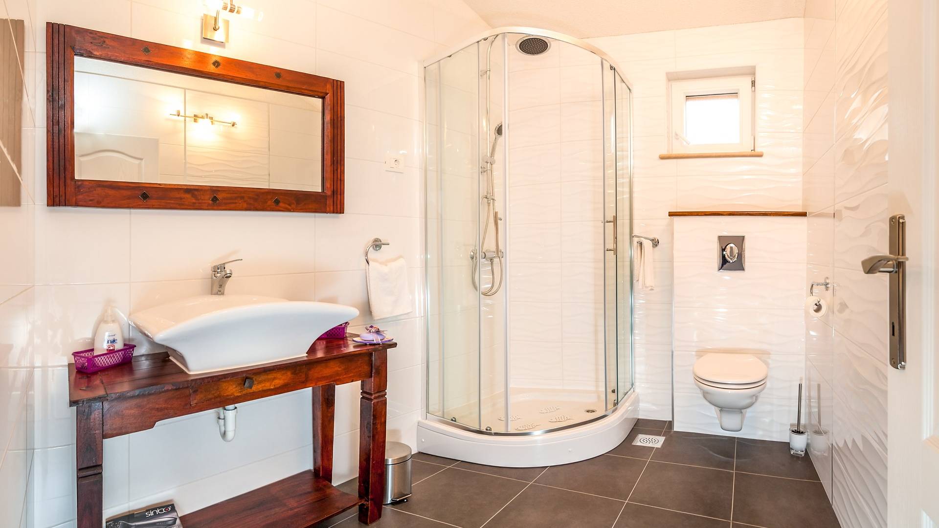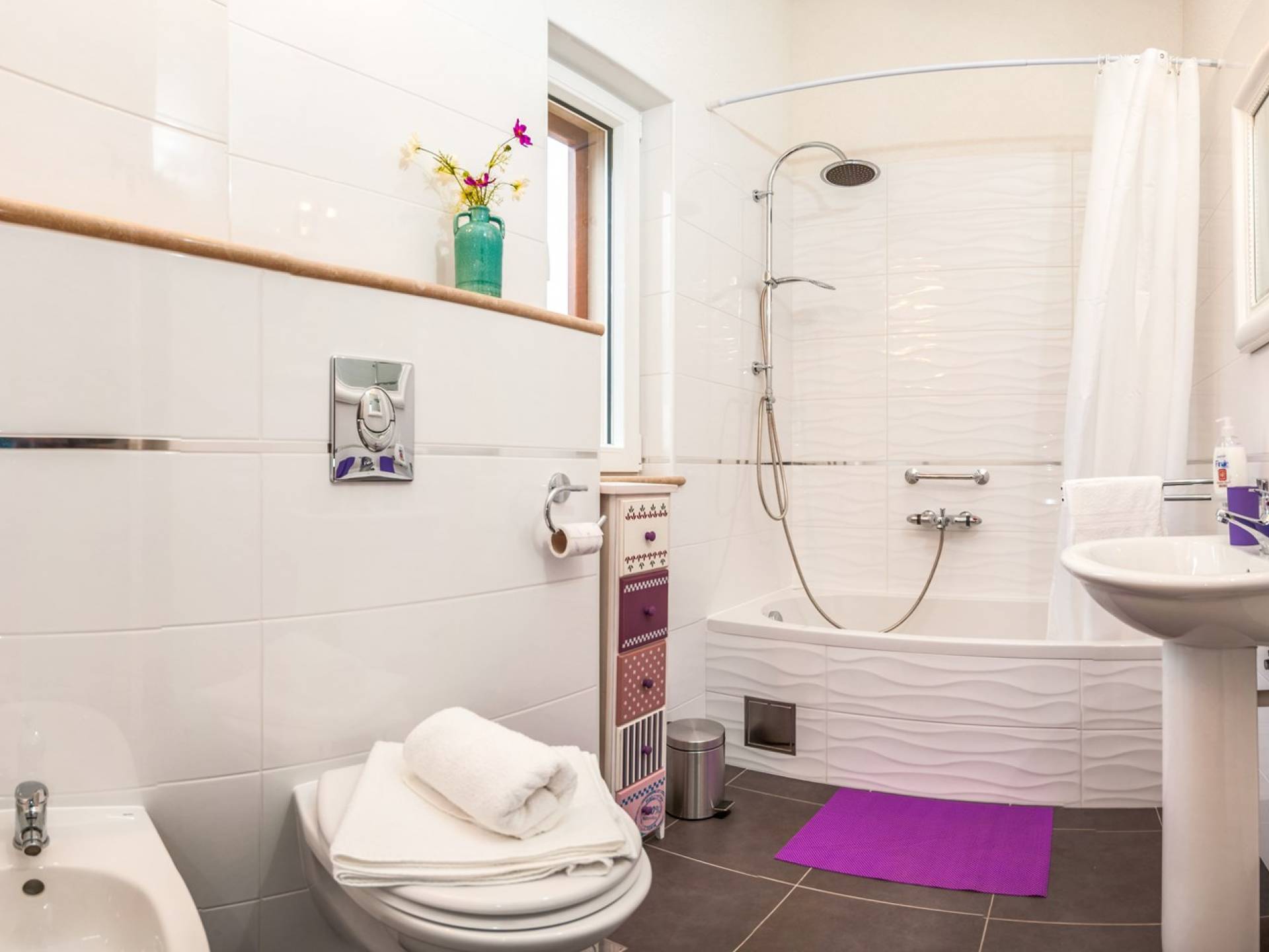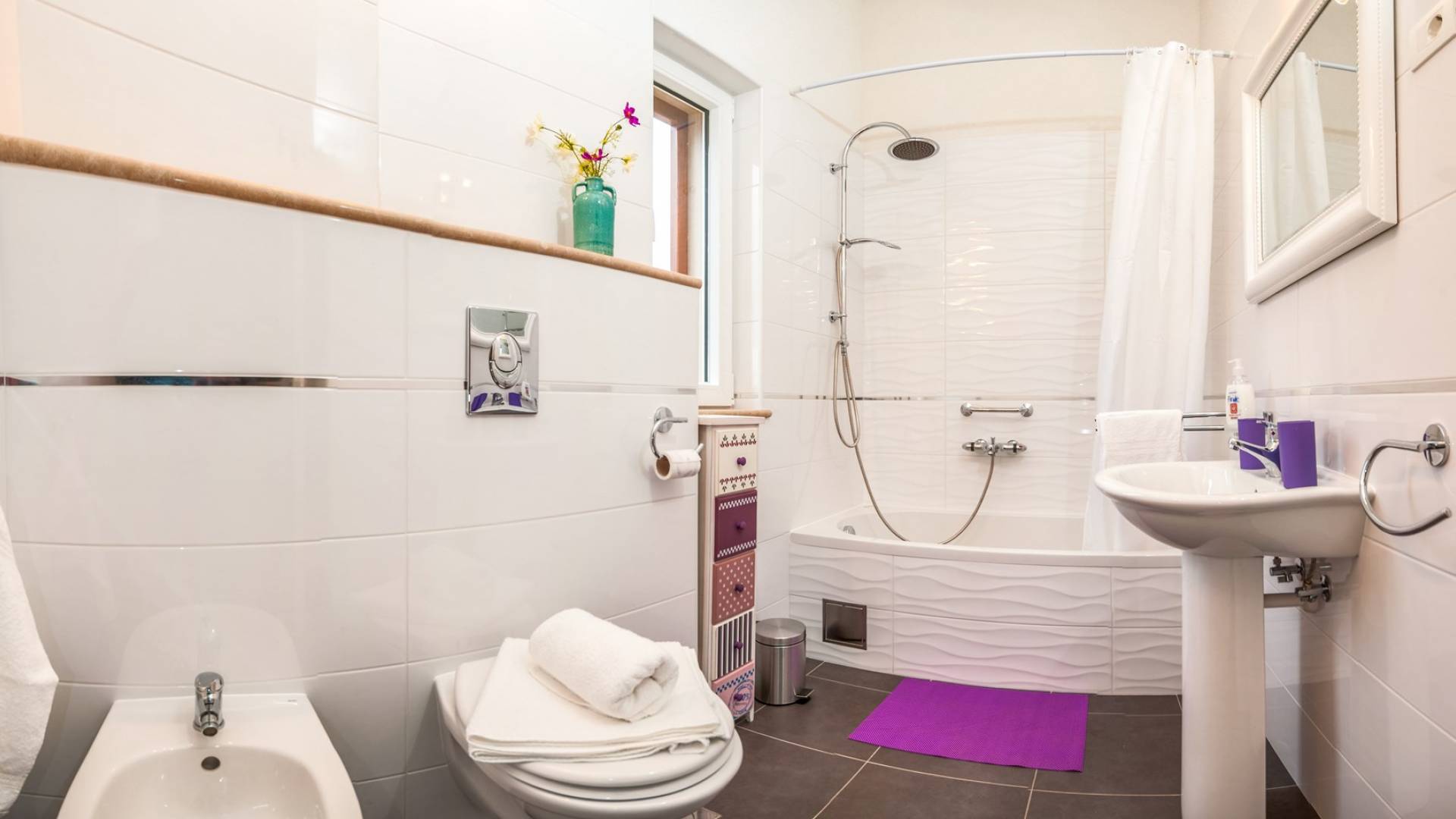 Каждая из трех комнат имеет свою собственную. ванная комната. Один из них традиционно обставлен деревянной мебелью, другой выполнен в белом романтическом стиле, смоделированном узором гостиной, а третий - с двуспальной кроватью с розовыми вставками и сердечками, висящими на стене.