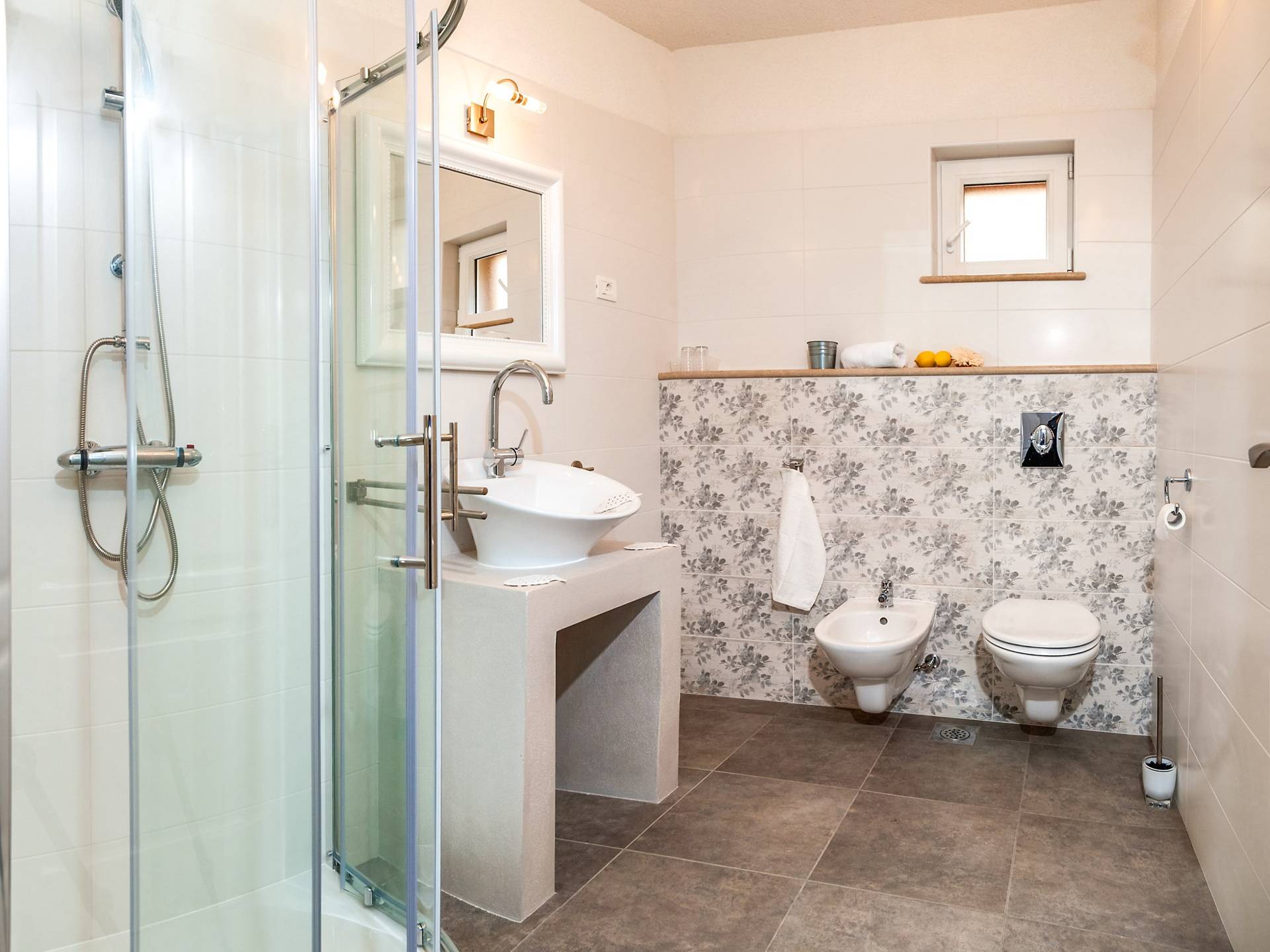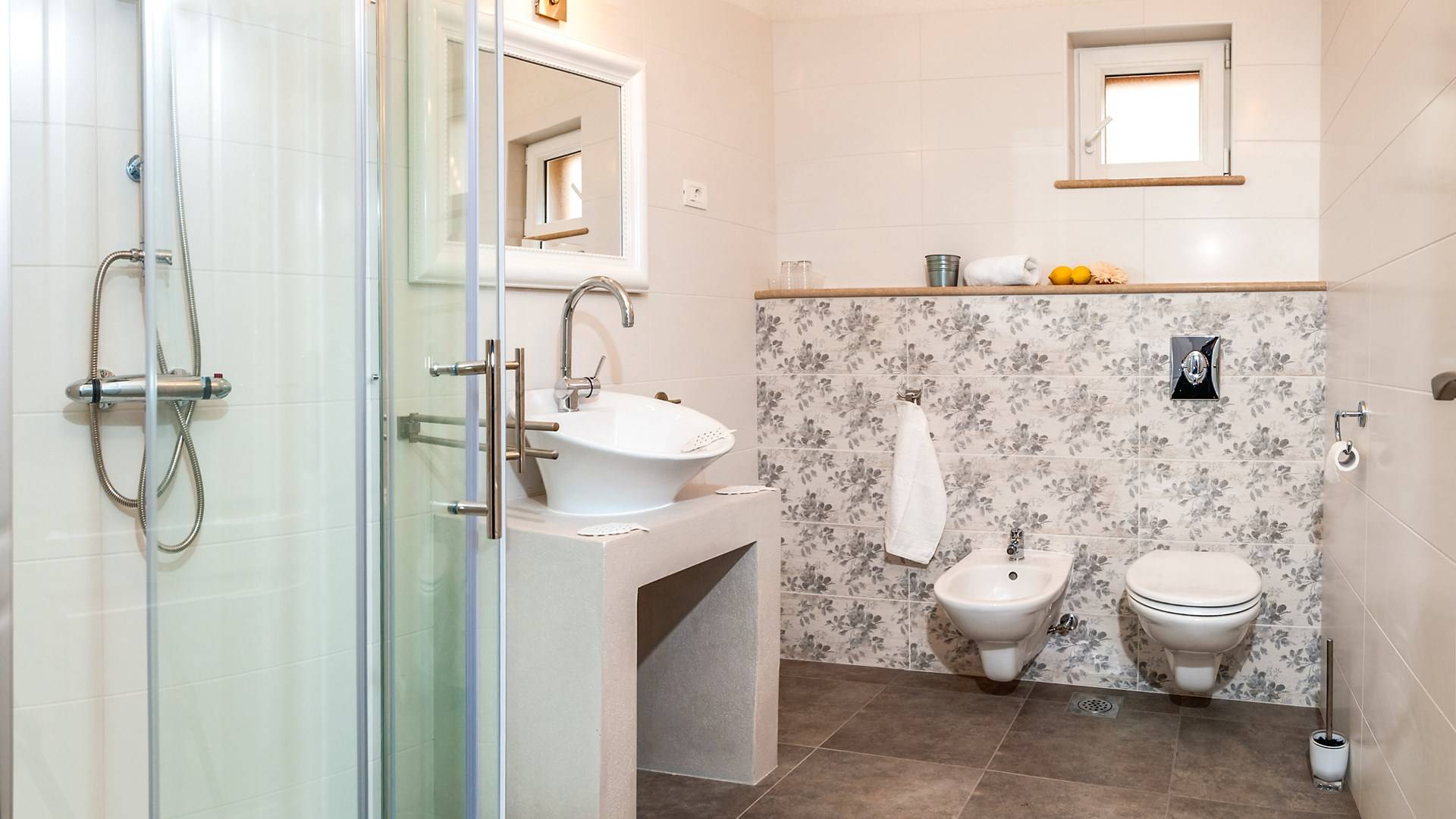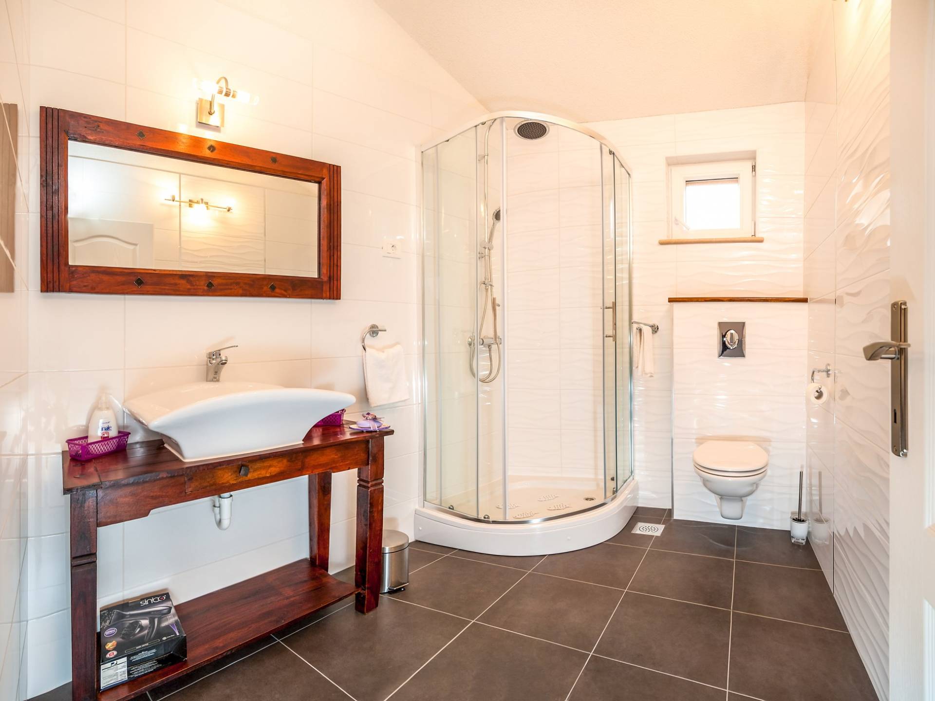 Каждая из трех комнат имеет свою собственную. ванная комната. Один из них традиционно обставлен деревянной мебелью, другой выполнен в белом романтическом стиле, смоделированном узором гостиной, а третий - с двуспальной кроватью с розовыми вставками и сердечками, висящими на стене.
