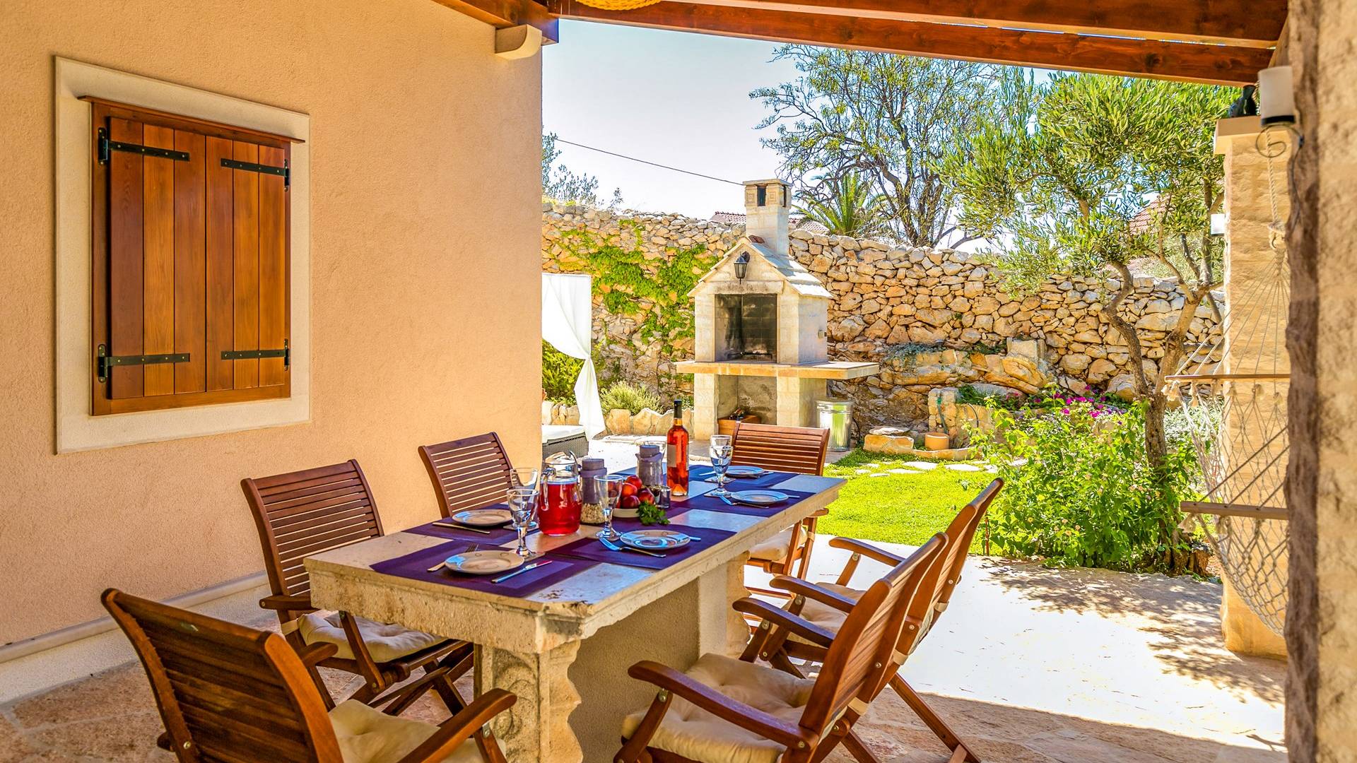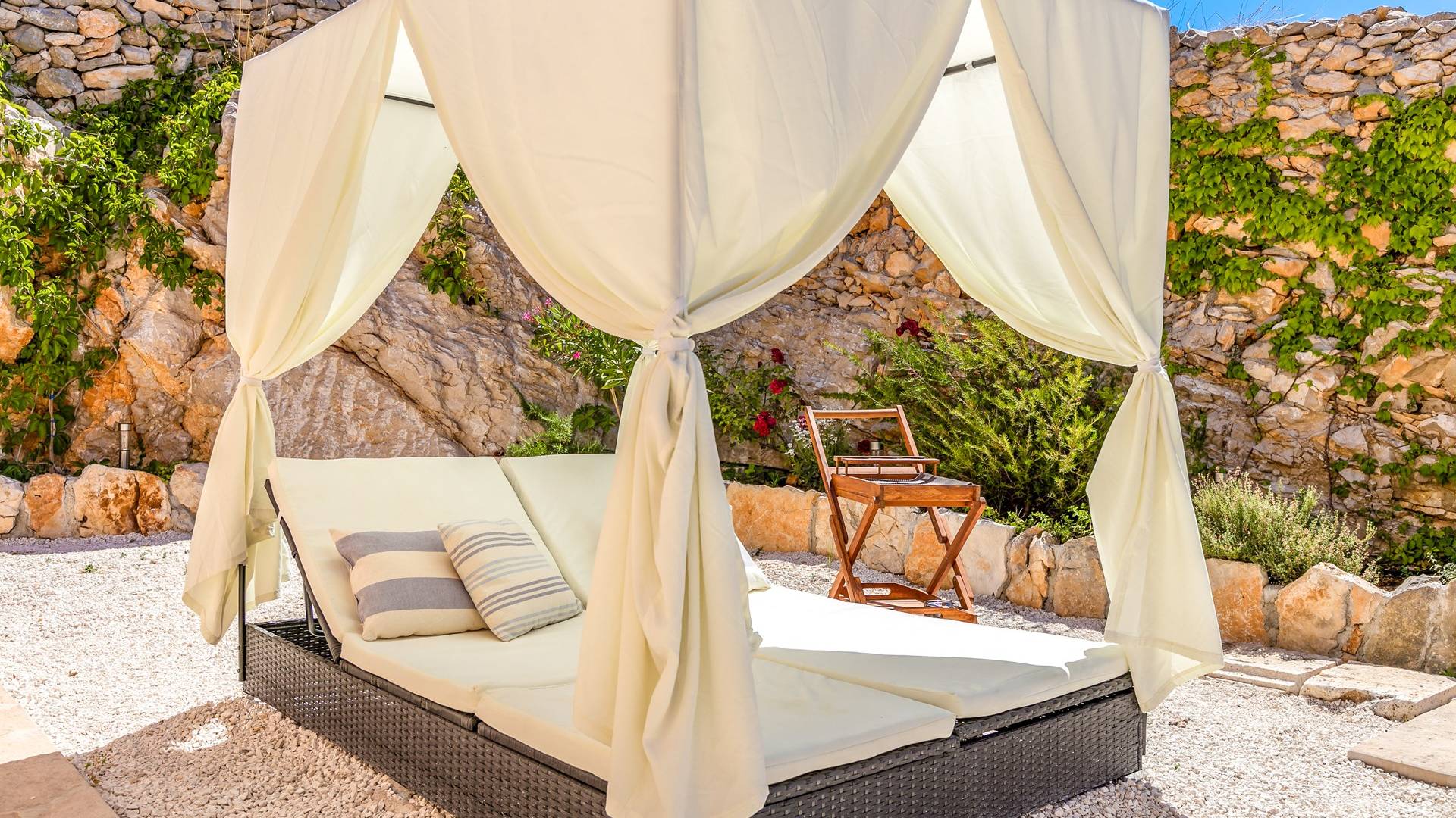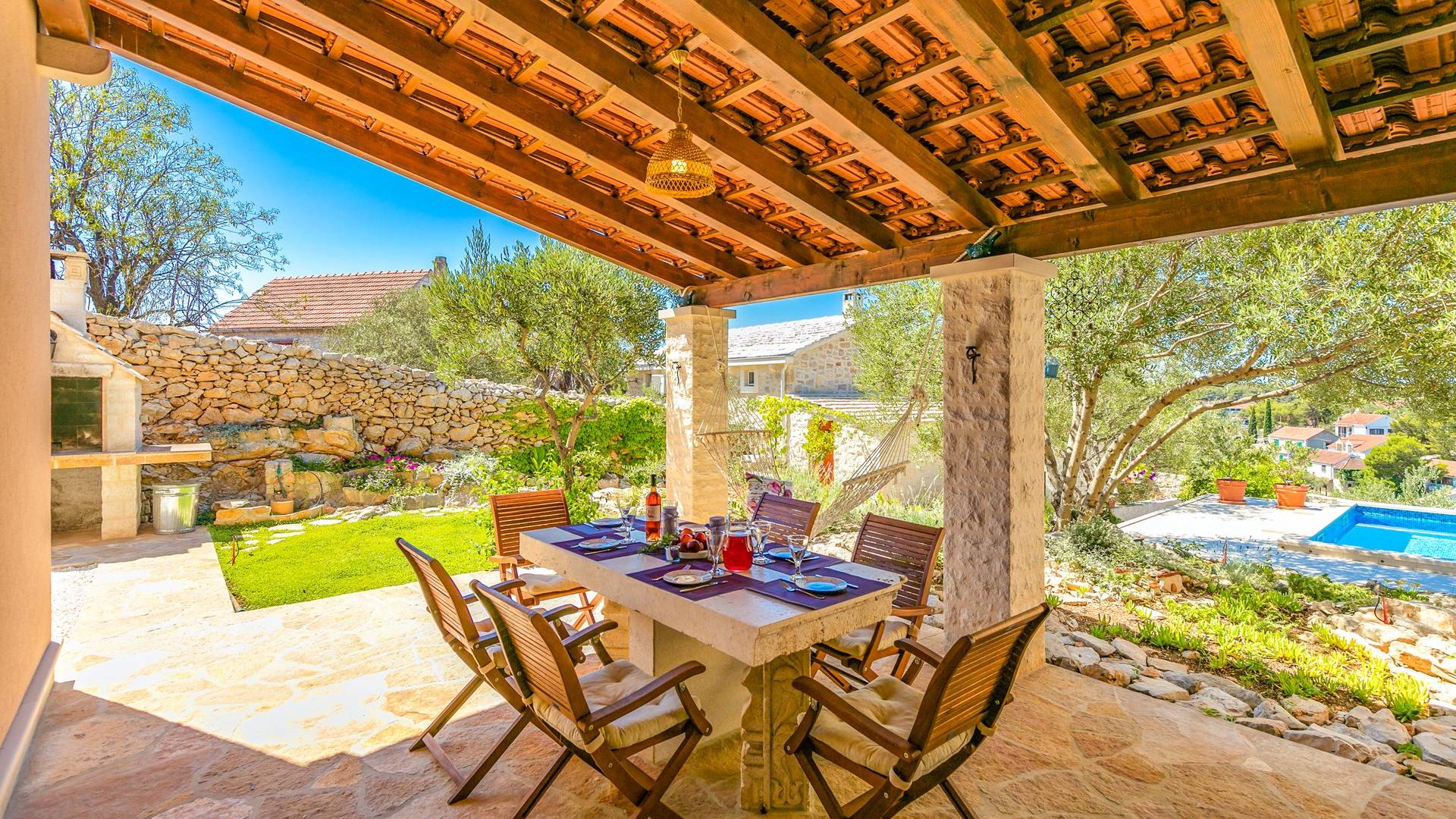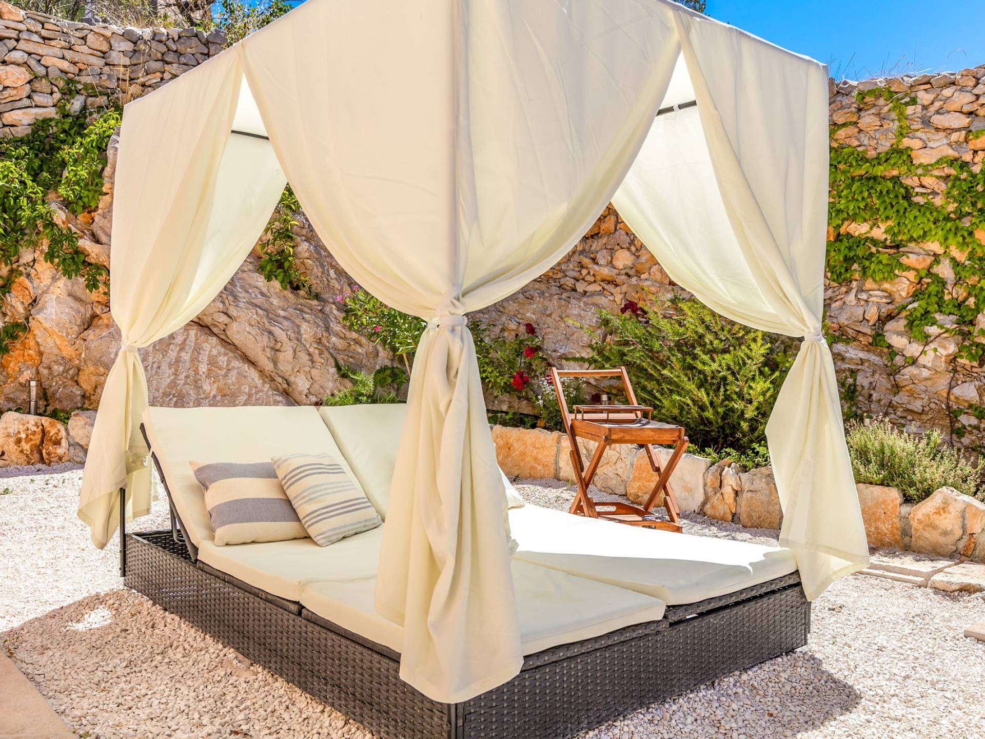 Ступеньки, ведущие к дому, освещаются встроенными в стену светильниками. За ними следует красивый сад с цветами и фигурными кустами. Над ним расположен бассейн с душем на открытом воздухе. Крытая терраса имеет естественное укрытие от солнца: большое оливковое дерево дарит свежесть всему участку. Каменный стол, вокруг которого расставлены складные деревянные стулья, создает впечатление присутствия в своеобразном храме. Рядом с ним также есть каменный гриль.