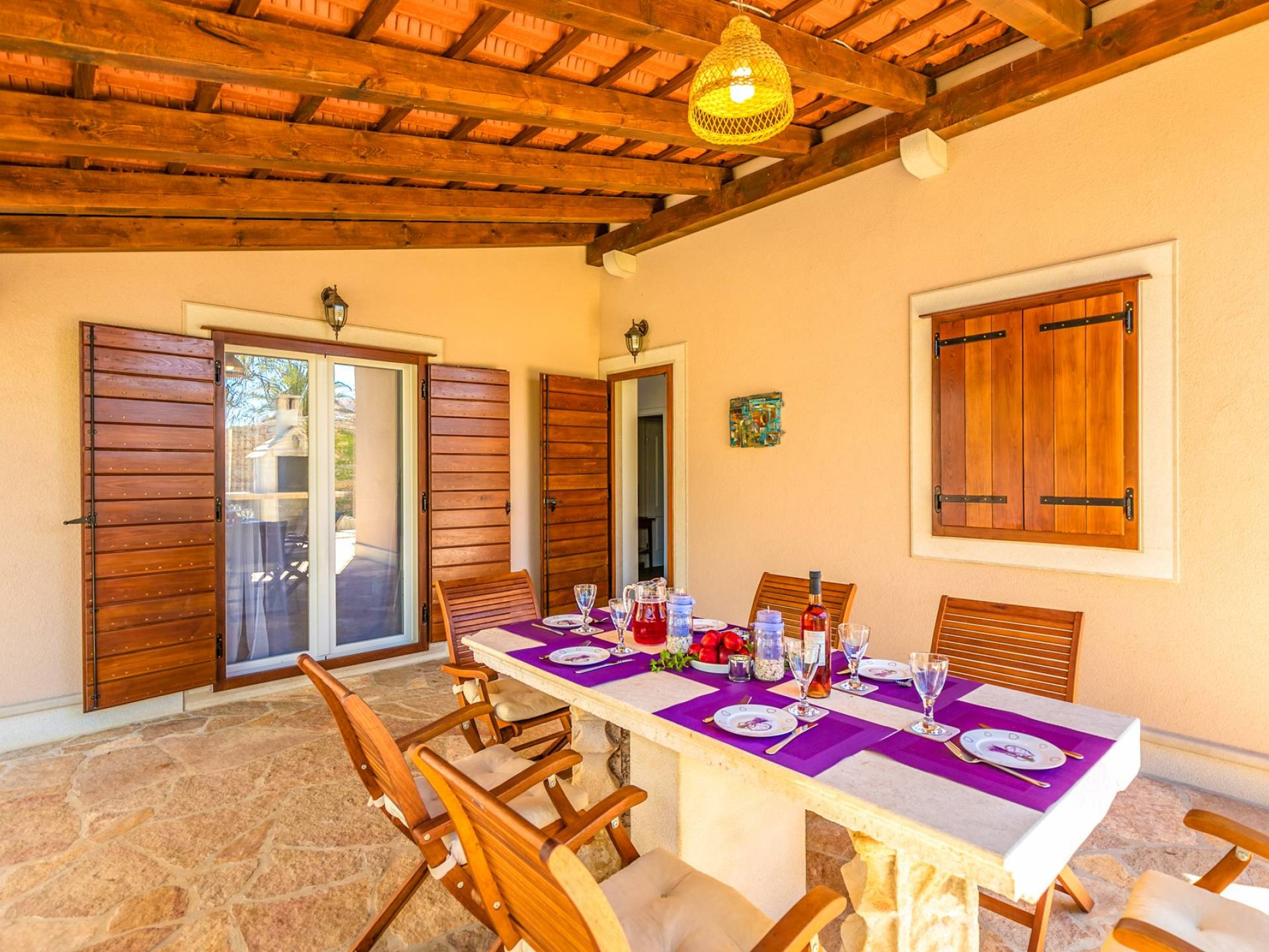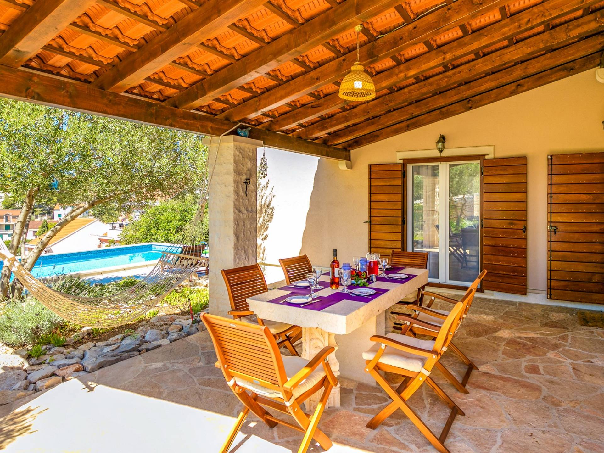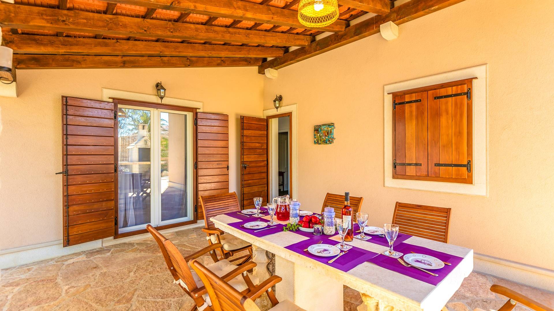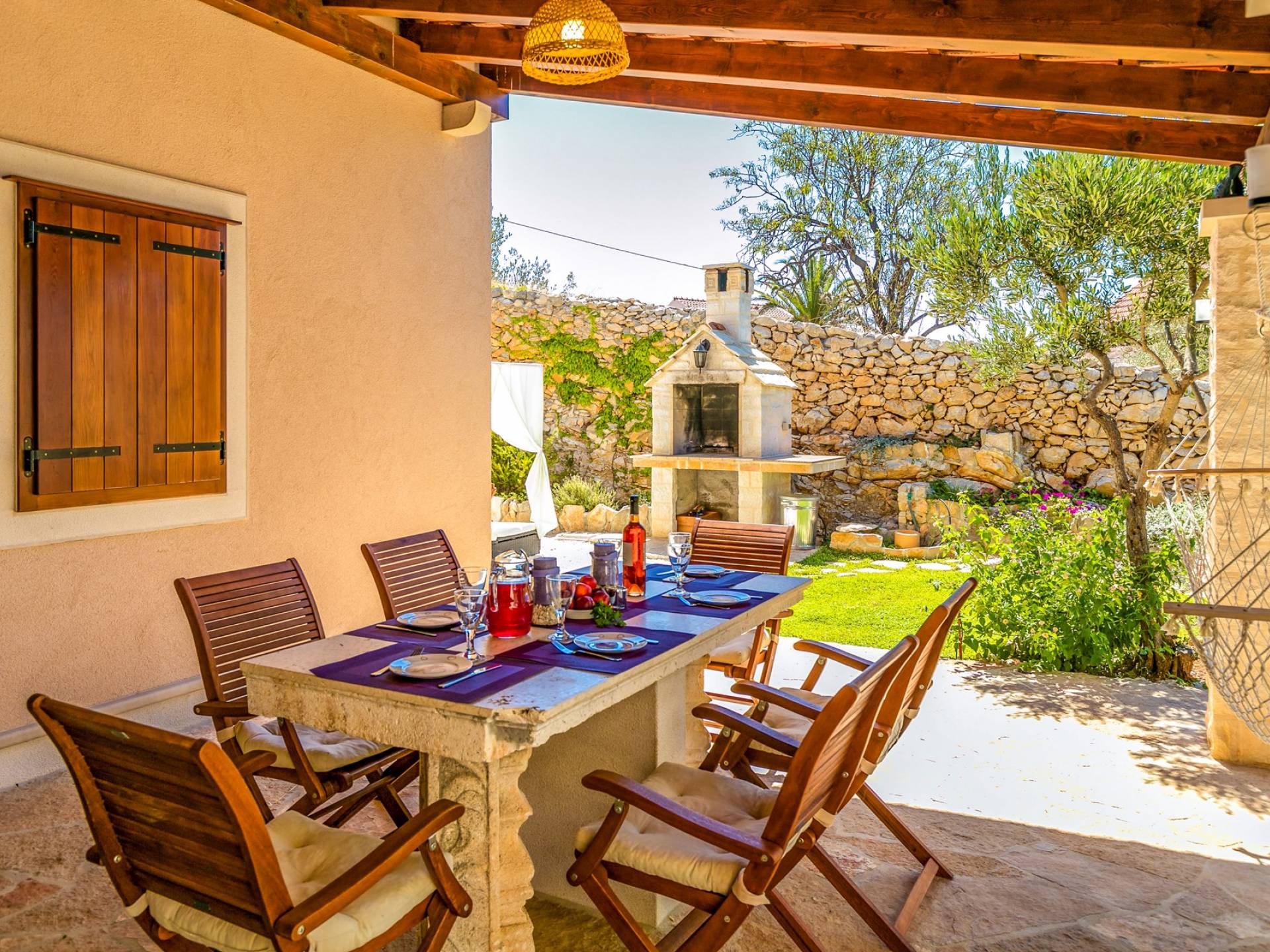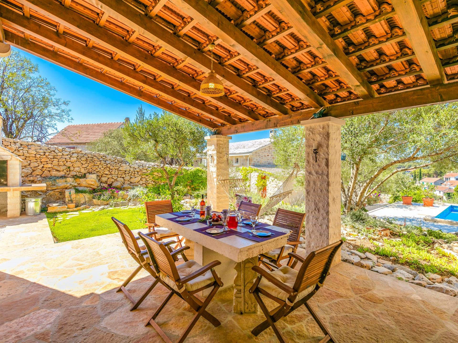 Ступеньки, ведущие к дому, освещаются встроенными в стену светильниками. За ними следует красивый сад с цветами и фигурными кустами. Над ним расположен бассейн с душем на открытом воздухе. Крытая терраса имеет естественное укрытие от солнца: большое оливковое дерево дарит свежесть всему участку. Каменный стол, вокруг которого расставлены складные деревянные стулья, создает впечатление присутствия в своеобразном храме. Рядом с ним также есть каменный гриль.