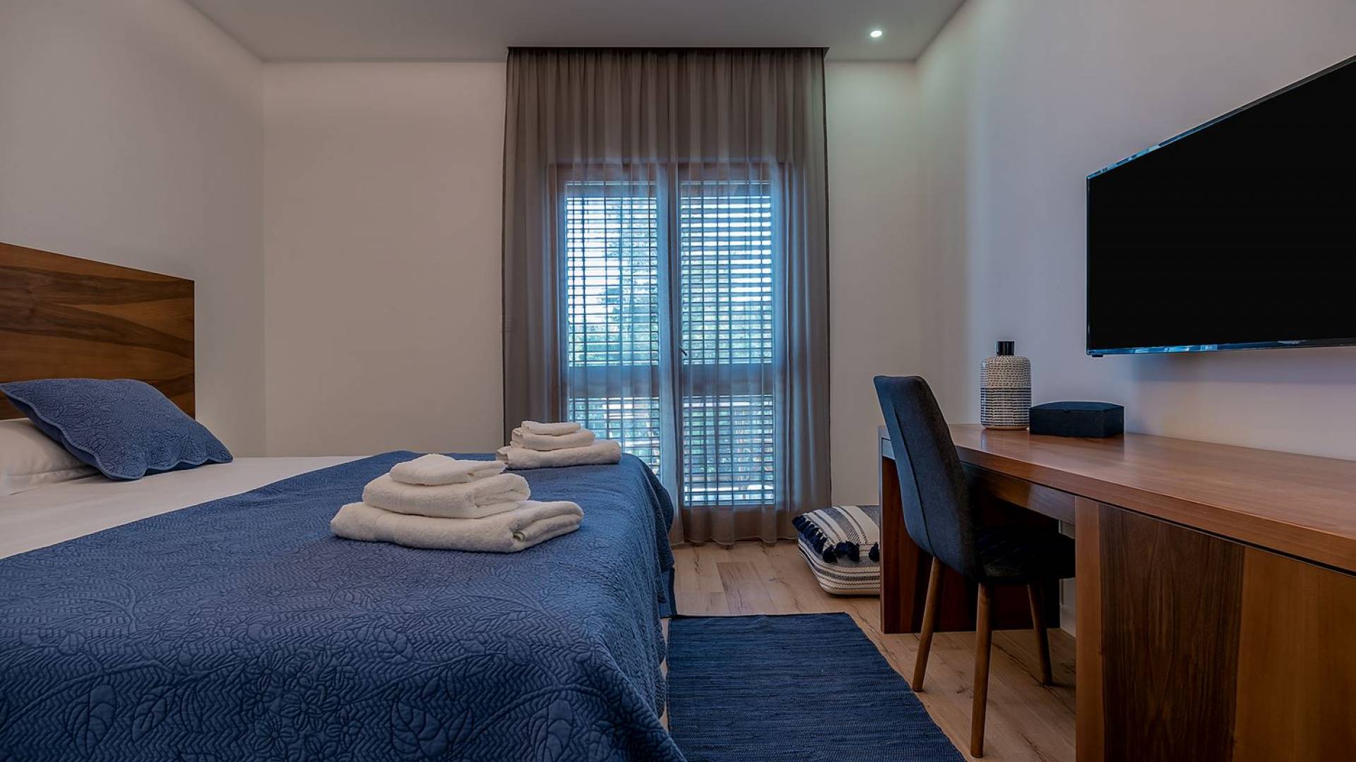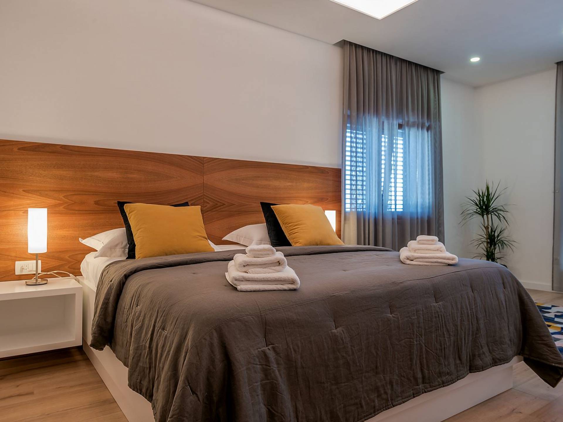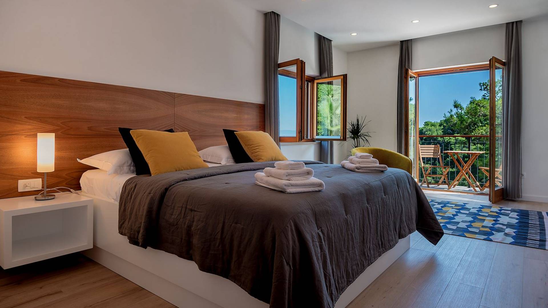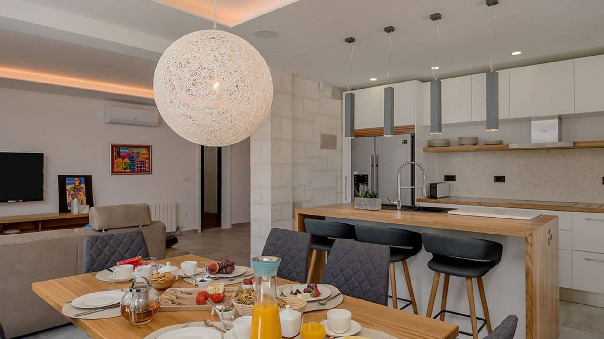 Вилла разделена на два уровня с четырьмя спальнями и четырьмя ванными комнатами, дополнительным туалетом, а также большой гостиной, столовой и полностью оборудованной кухней. На первом этаже находится элегантно обставленная гостиная и столовая с внушительным обеденным столом, большим диваном и стеклянными дверями, выходящими на панорамные террасы. В полностью оборудованную кухню можно попасть из гостиной, а также с террасы. На этом этаже также находится главная спальня с ванной комнатой, гардеробной и прачечной. Все номера имеют выход на террасы с шезлонгами и обеденной зоной с фреской.