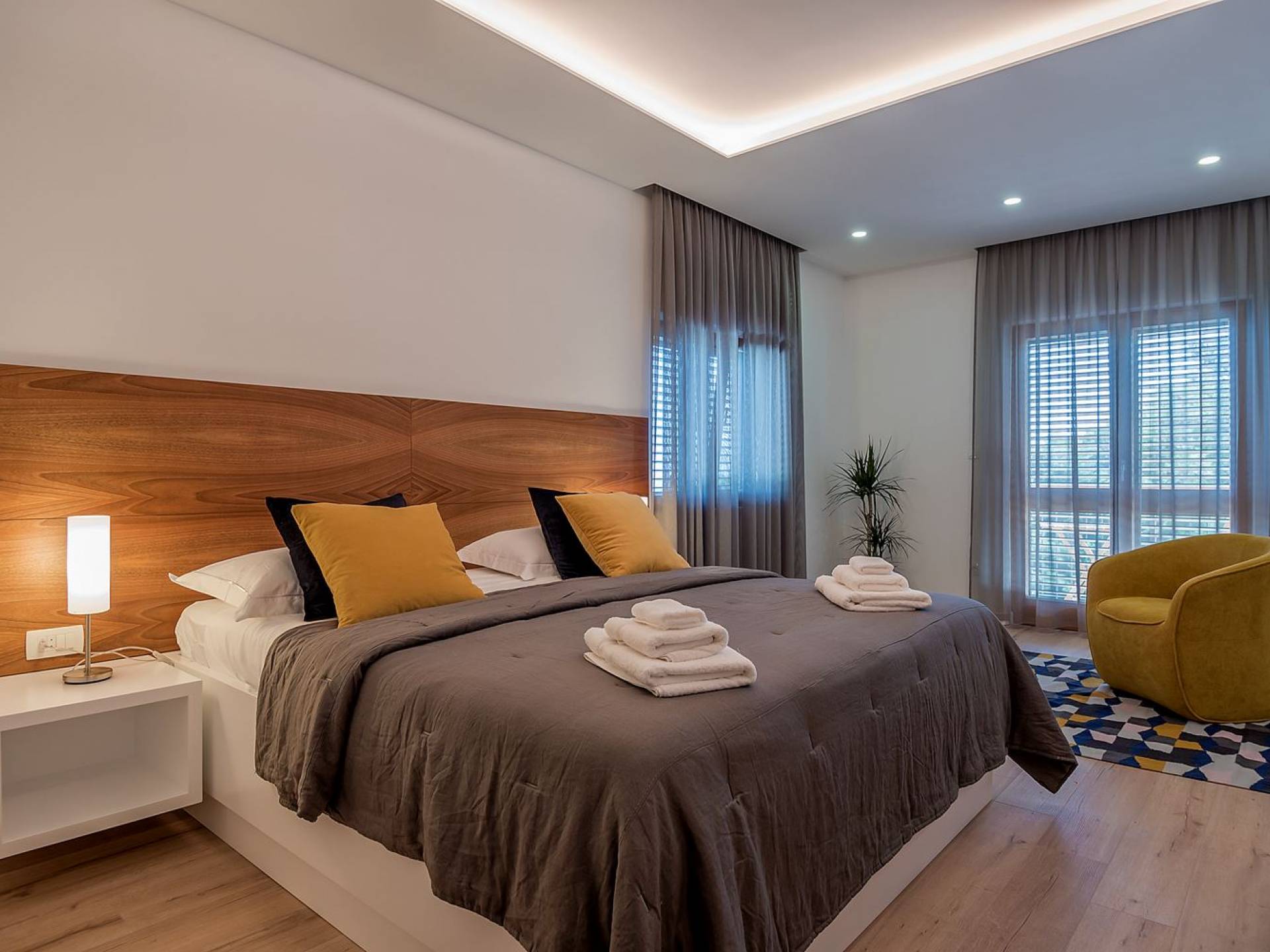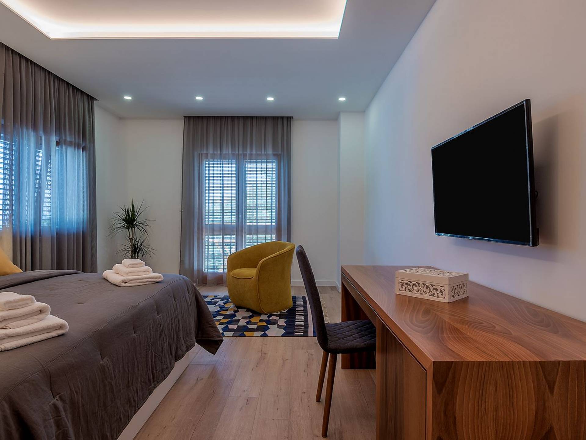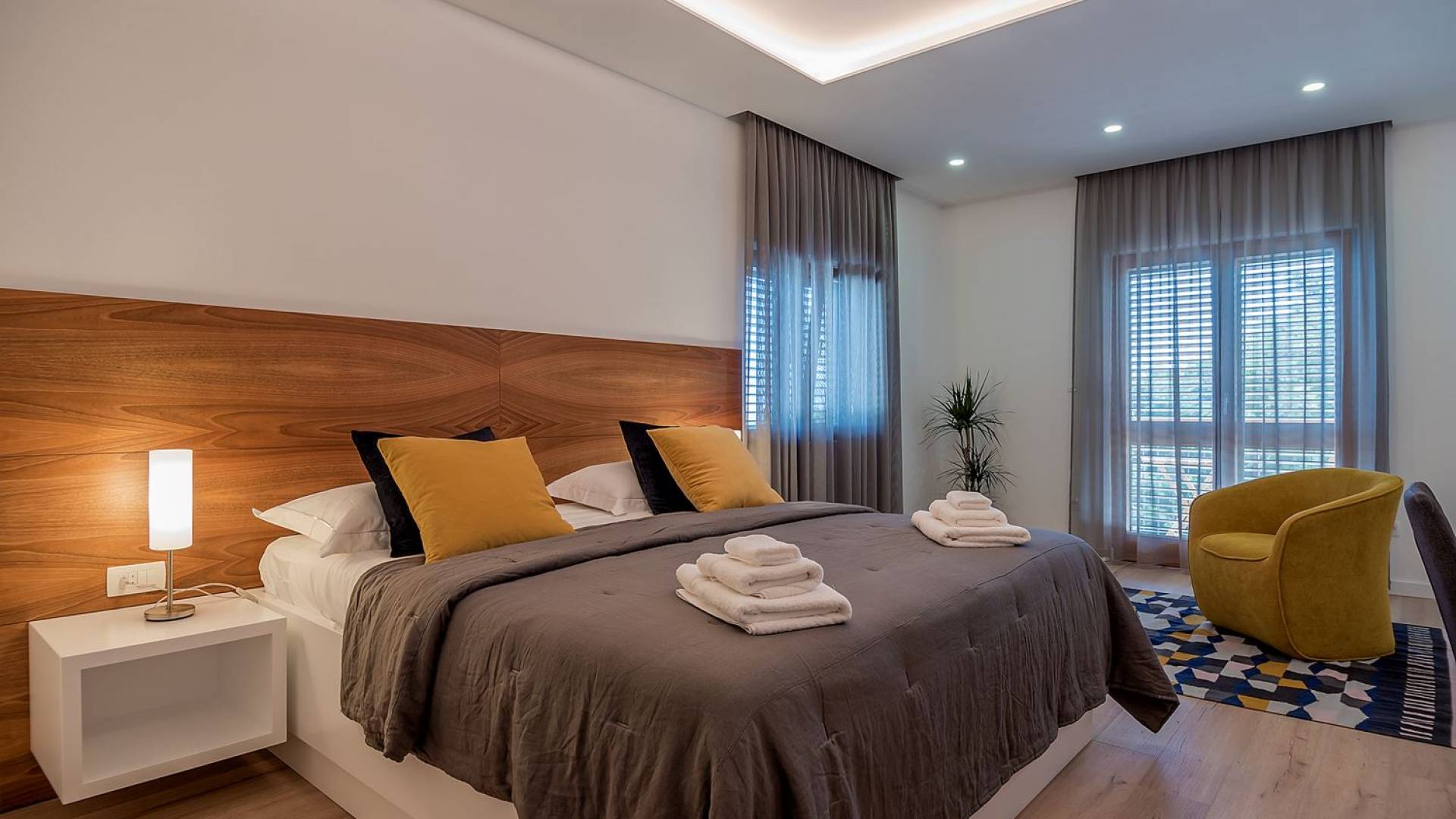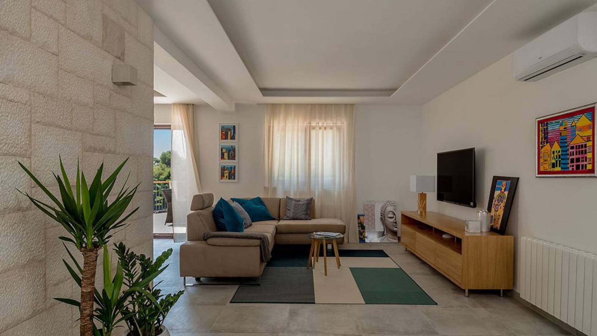 Вилла разделена на два уровня с четырьмя спальнями и четырьмя ванными комнатами, дополнительным туалетом, а также большой гостиной, столовой и полностью оборудованной кухней. На первом этаже находится элегантно обставленная гостиная и столовая с внушительным обеденным столом, большим диваном и стеклянными дверями, выходящими на панорамные террасы. В полностью оборудованную кухню можно попасть из гостиной, а также с террасы. На этом этаже также находится главная спальня с ванной комнатой, гардеробной и прачечной. Все номера имеют выход на террасы с шезлонгами и обеденной зоной с фреской.