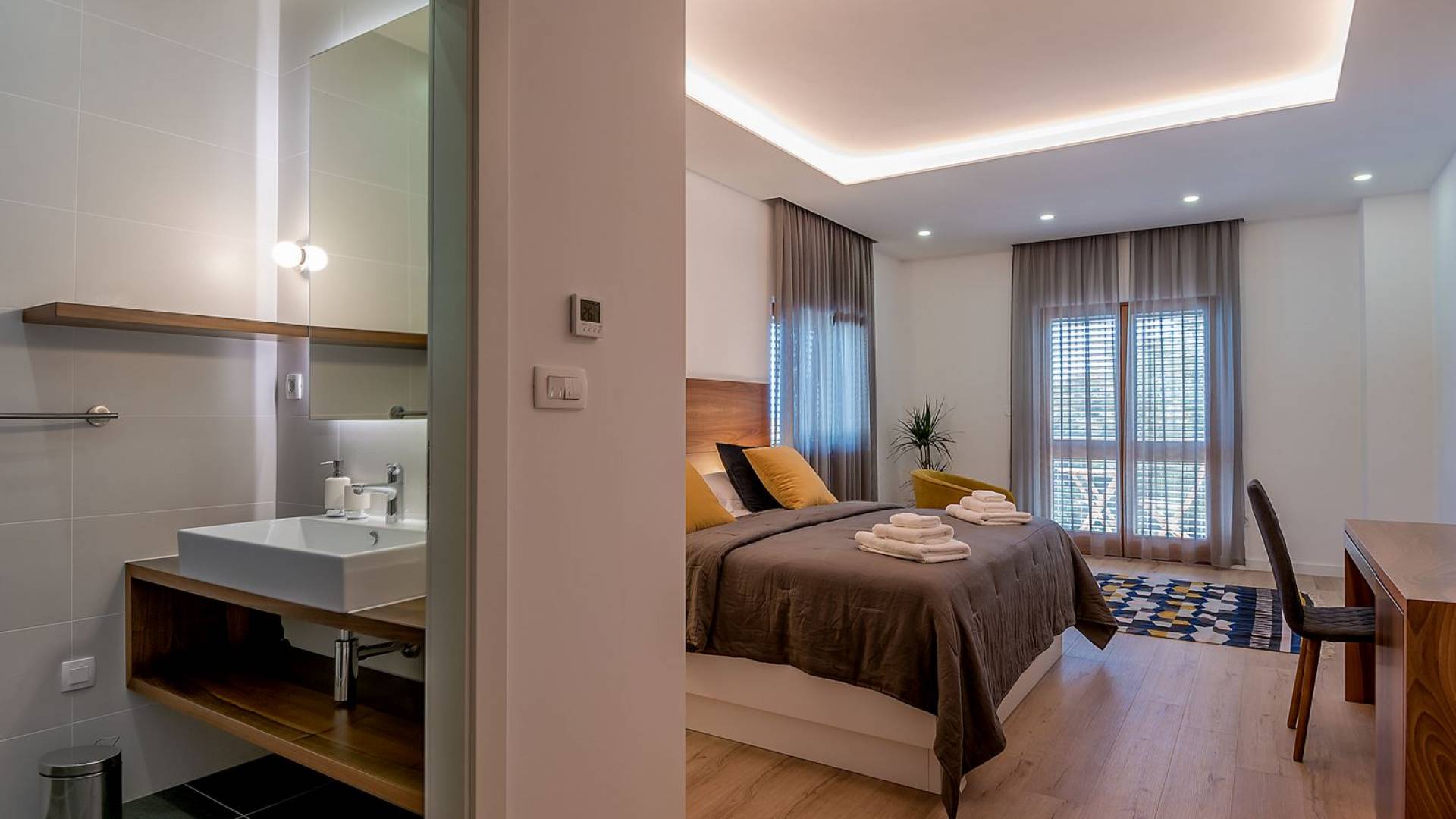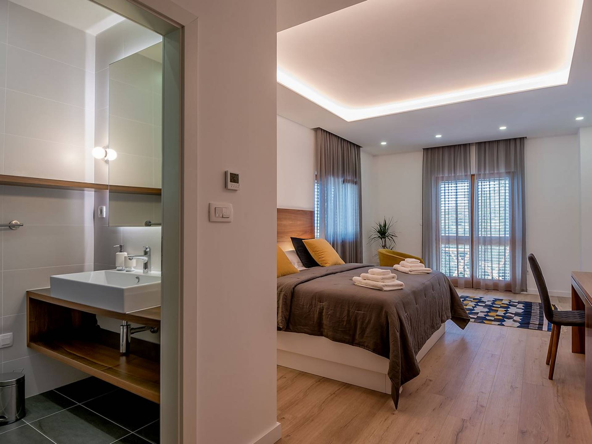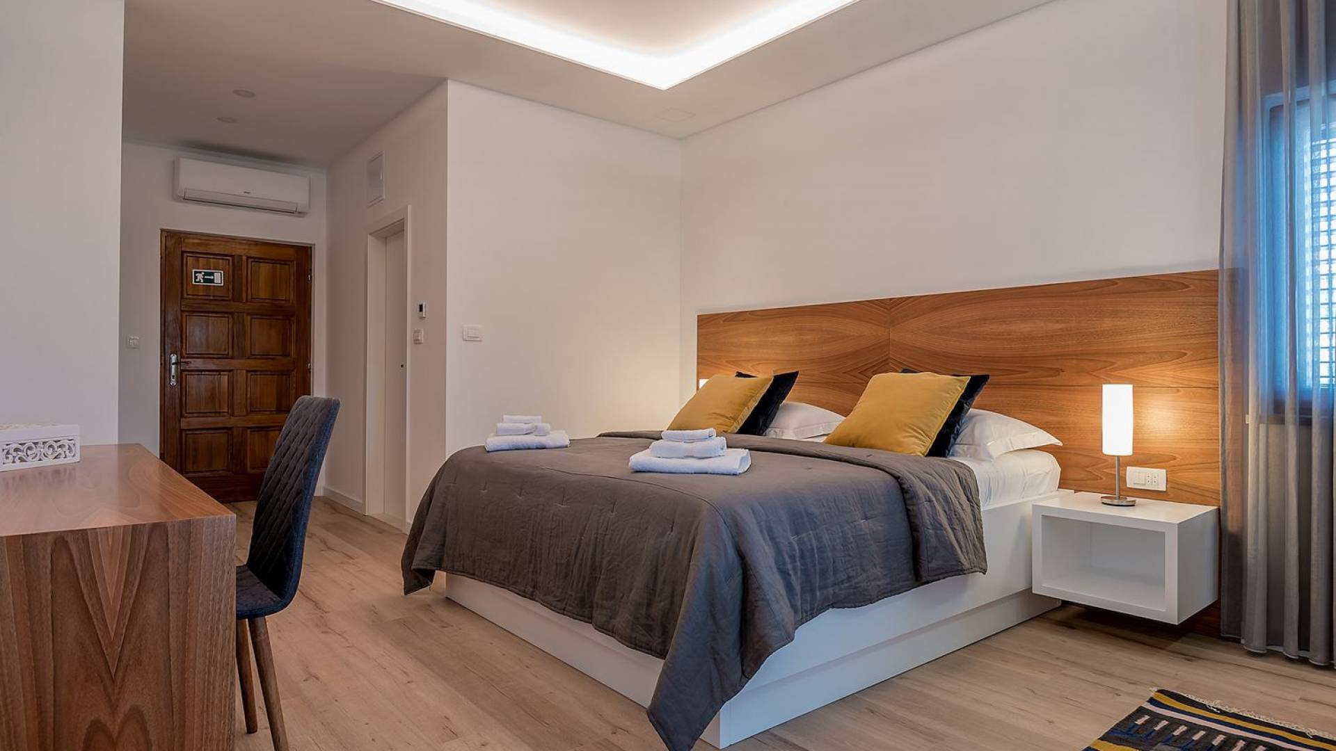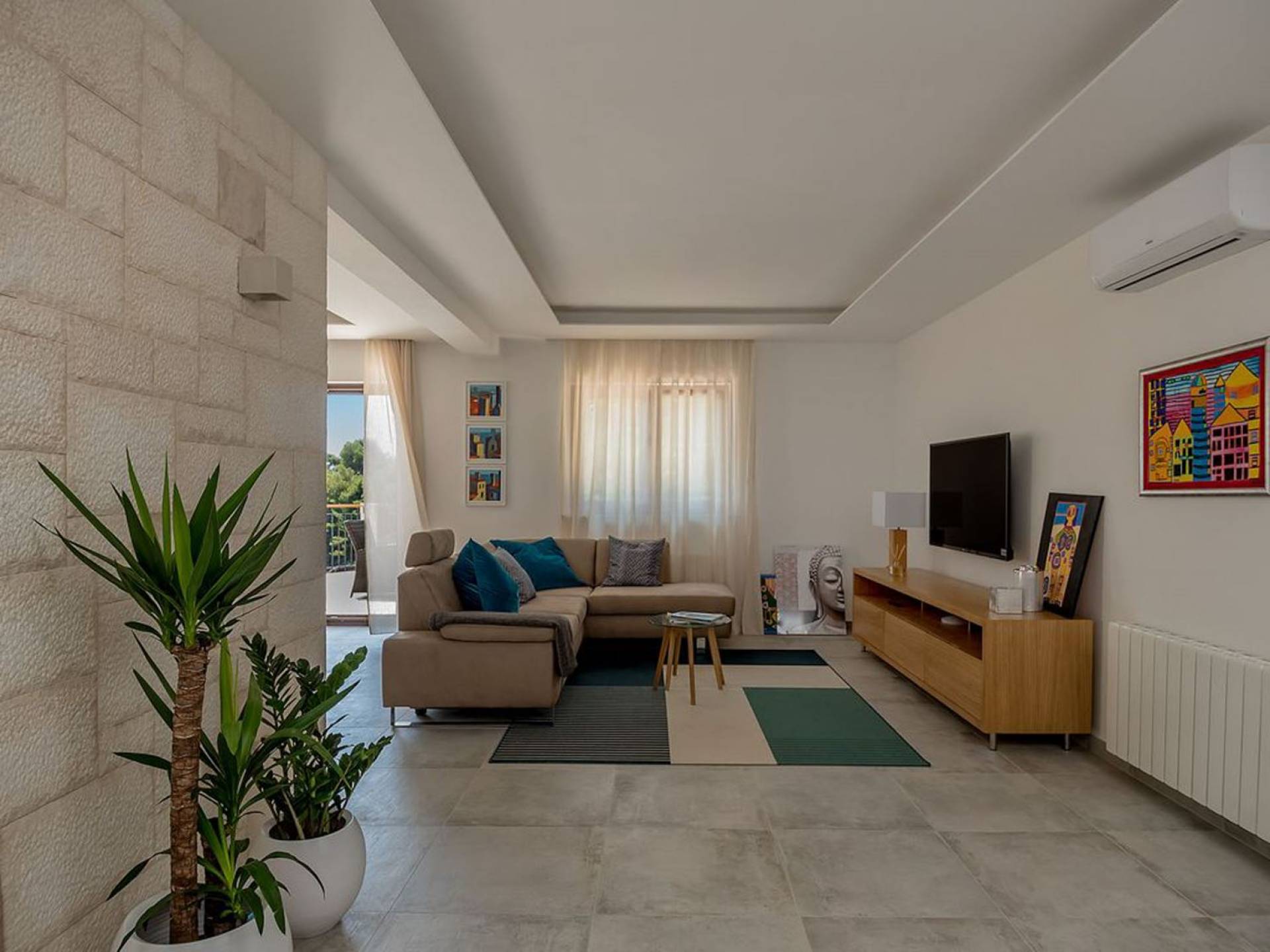 Вилла разделена на два уровня с четырьмя спальнями и четырьмя ванными комнатами, дополнительным туалетом, а также большой гостиной, столовой и полностью оборудованной кухней. На первом этаже находится элегантно обставленная гостиная и столовая с внушительным обеденным столом, большим диваном и стеклянными дверями, выходящими на панорамные террасы. В полностью оборудованную кухню можно попасть из гостиной, а также с террасы. На этом этаже также находится главная спальня с ванной комнатой, гардеробной и прачечной. Все номера имеют выход на террасы с шезлонгами и обеденной зоной с фреской.