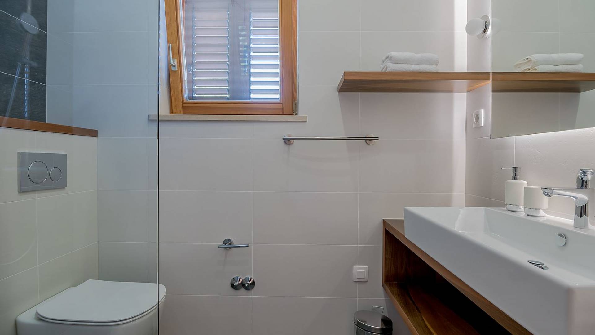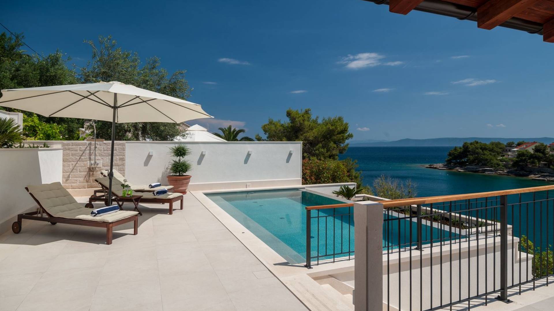 В нем также есть величественный бассейн площадью 24 м² с видом на солнце и море, два душа на открытом воздухе, шезлонги, затененная обеденная зона со столом и барбекю, а также барный уголок. Со всеми максимальными удобствами, а также частным тренажерным залом на первом этаже, эта вилла удовлетворит все желания спокойного отдыха.