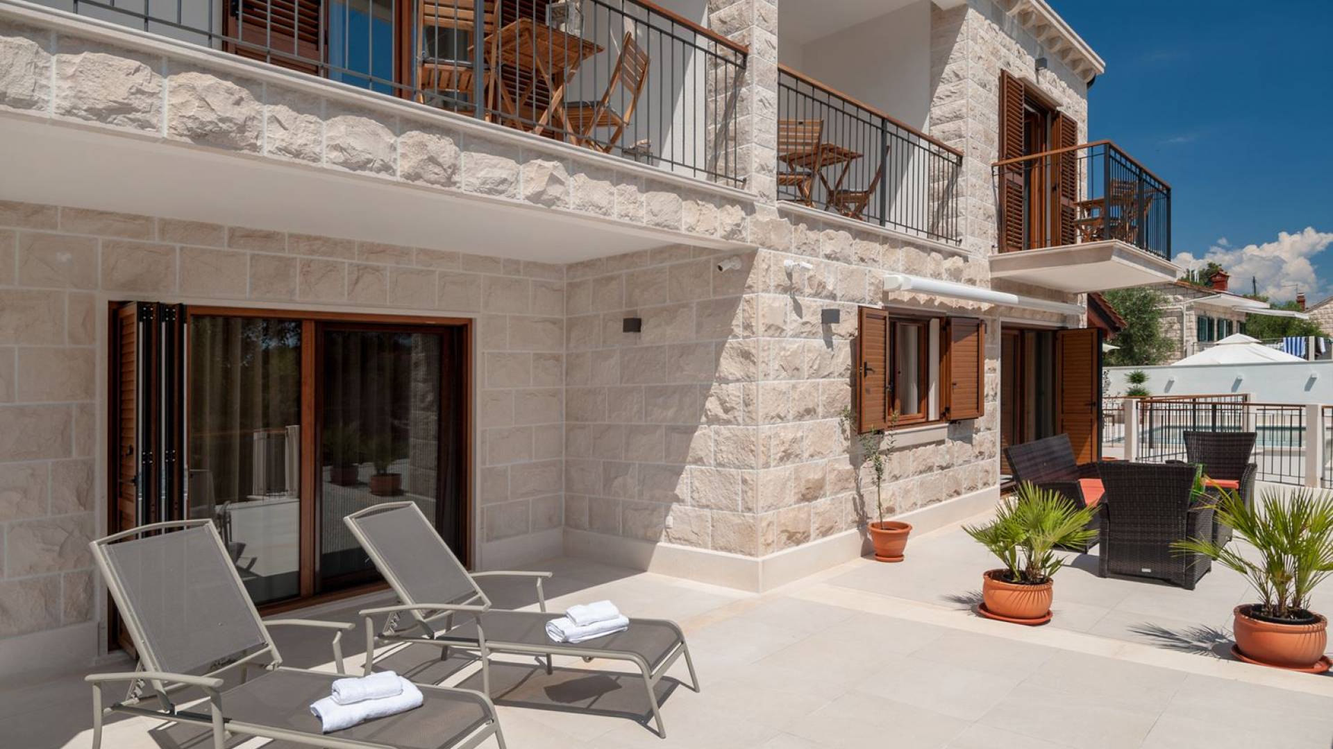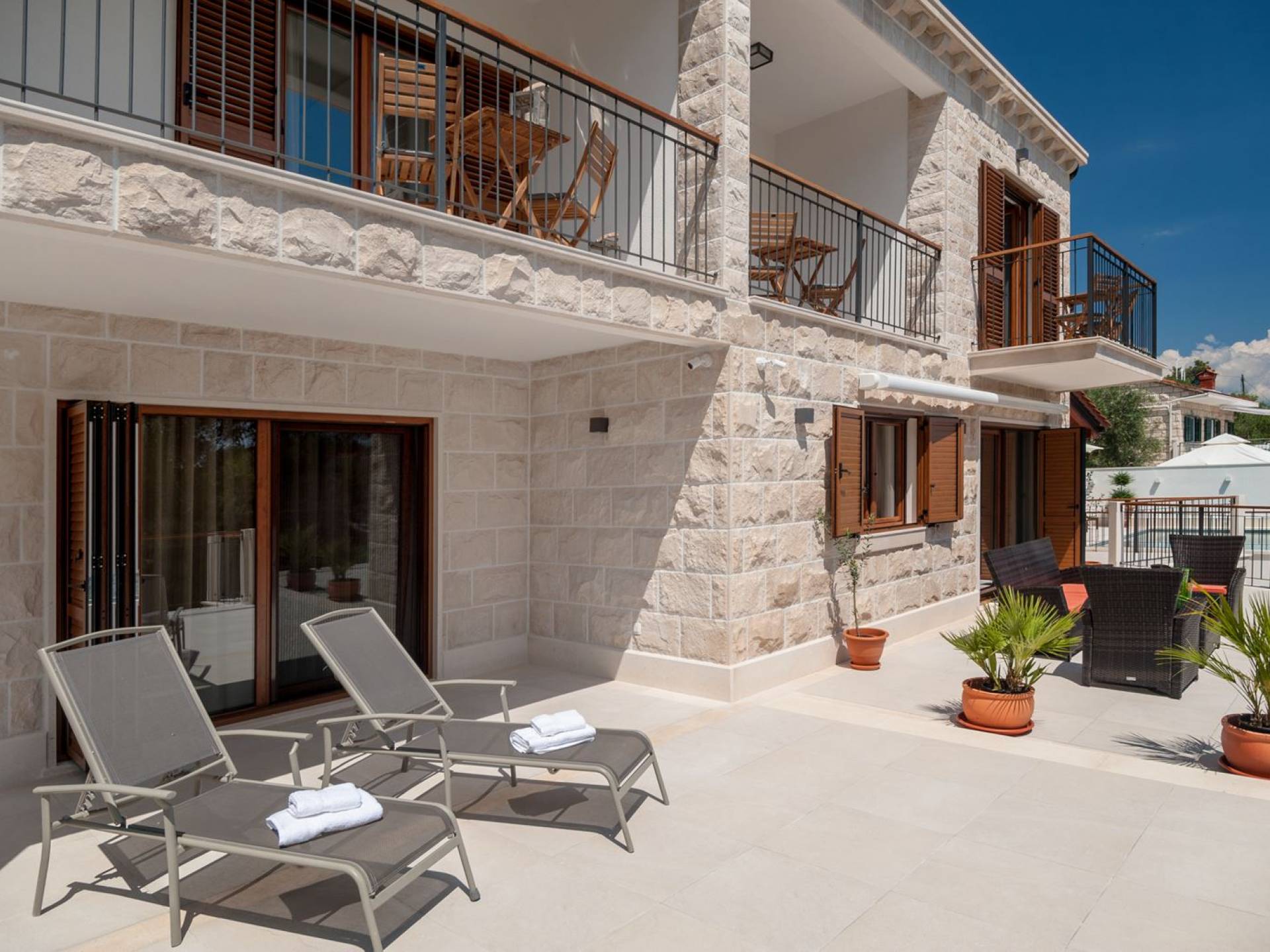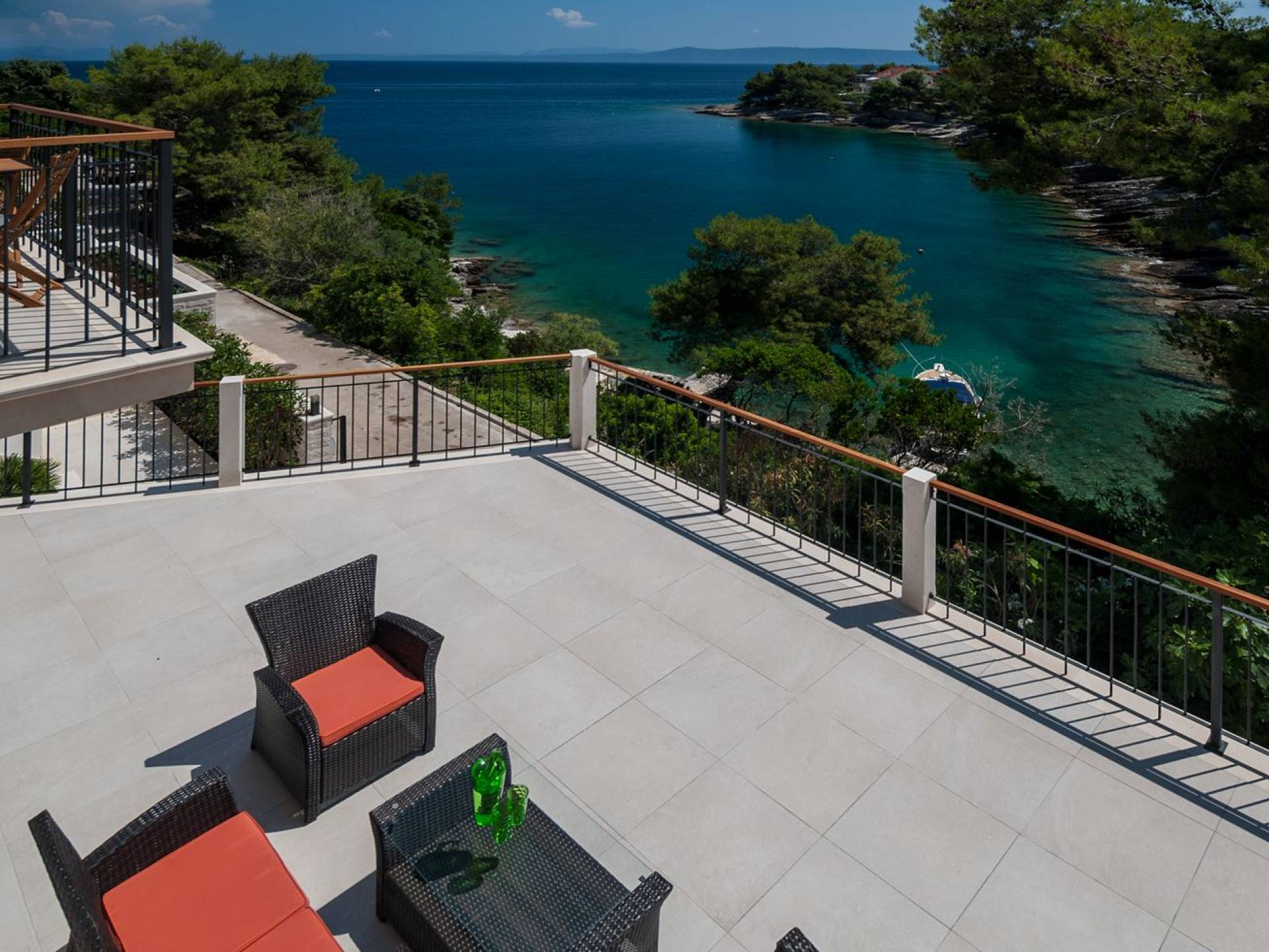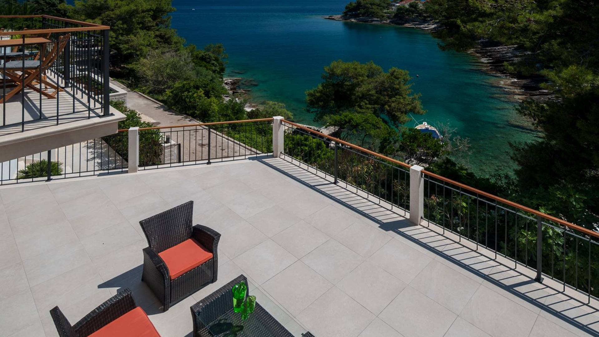 На втором этаже, куда можно подняться по наружной лестнице, находятся три спальни с двуспальными кроватями и ванными комнатами. В каждой спальне есть собственный телевизор и стеклянные двери, ведущие на балконы с захватывающим видом и удобными и меблированными открытыми площадками.