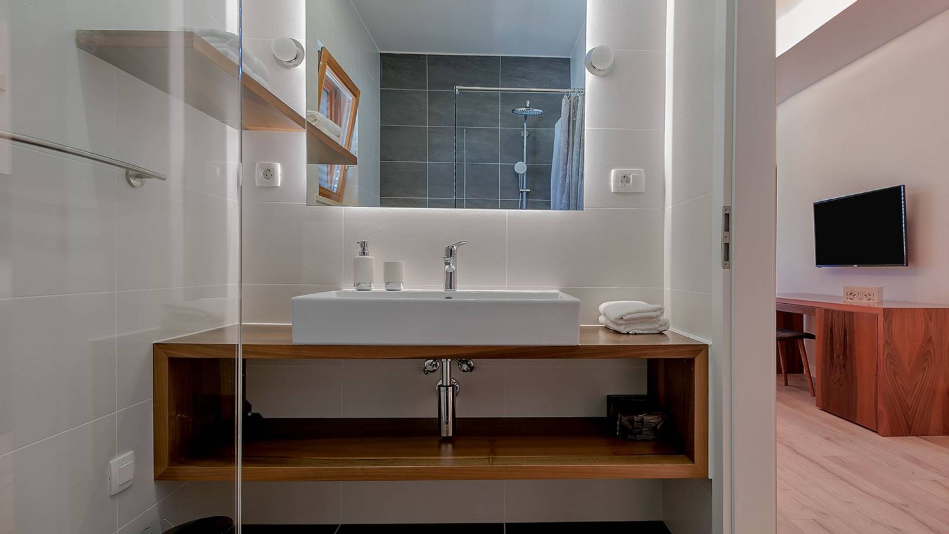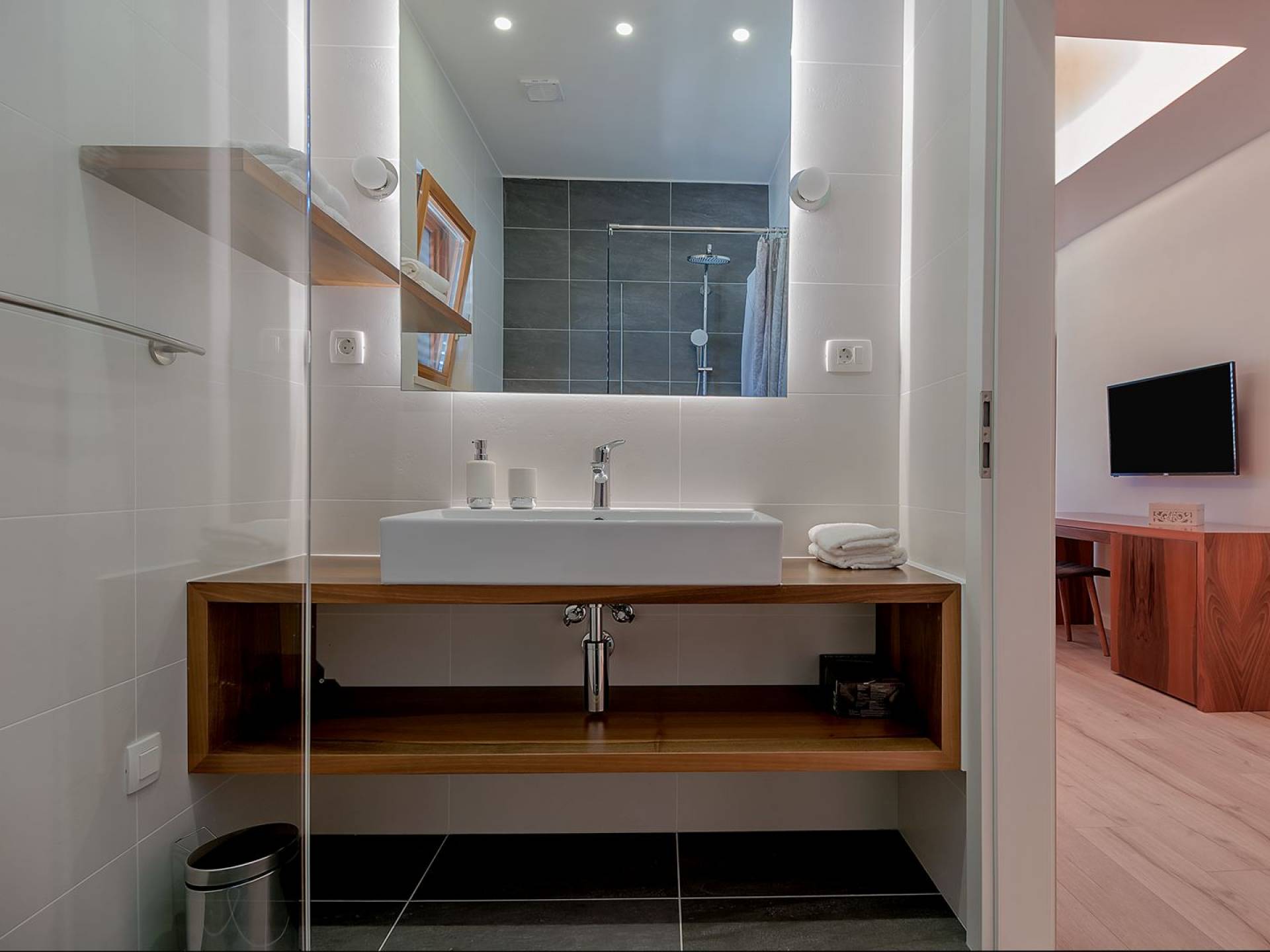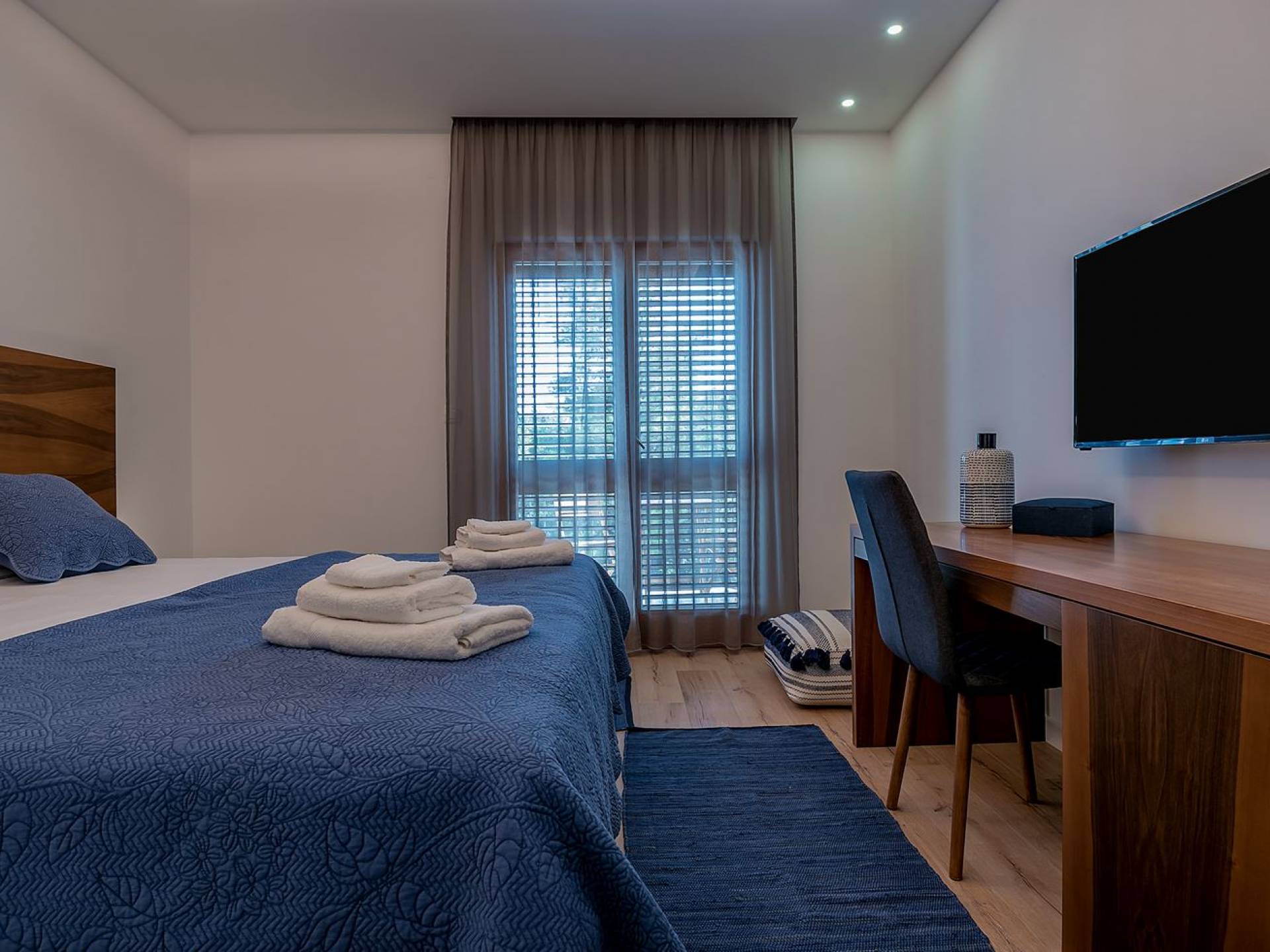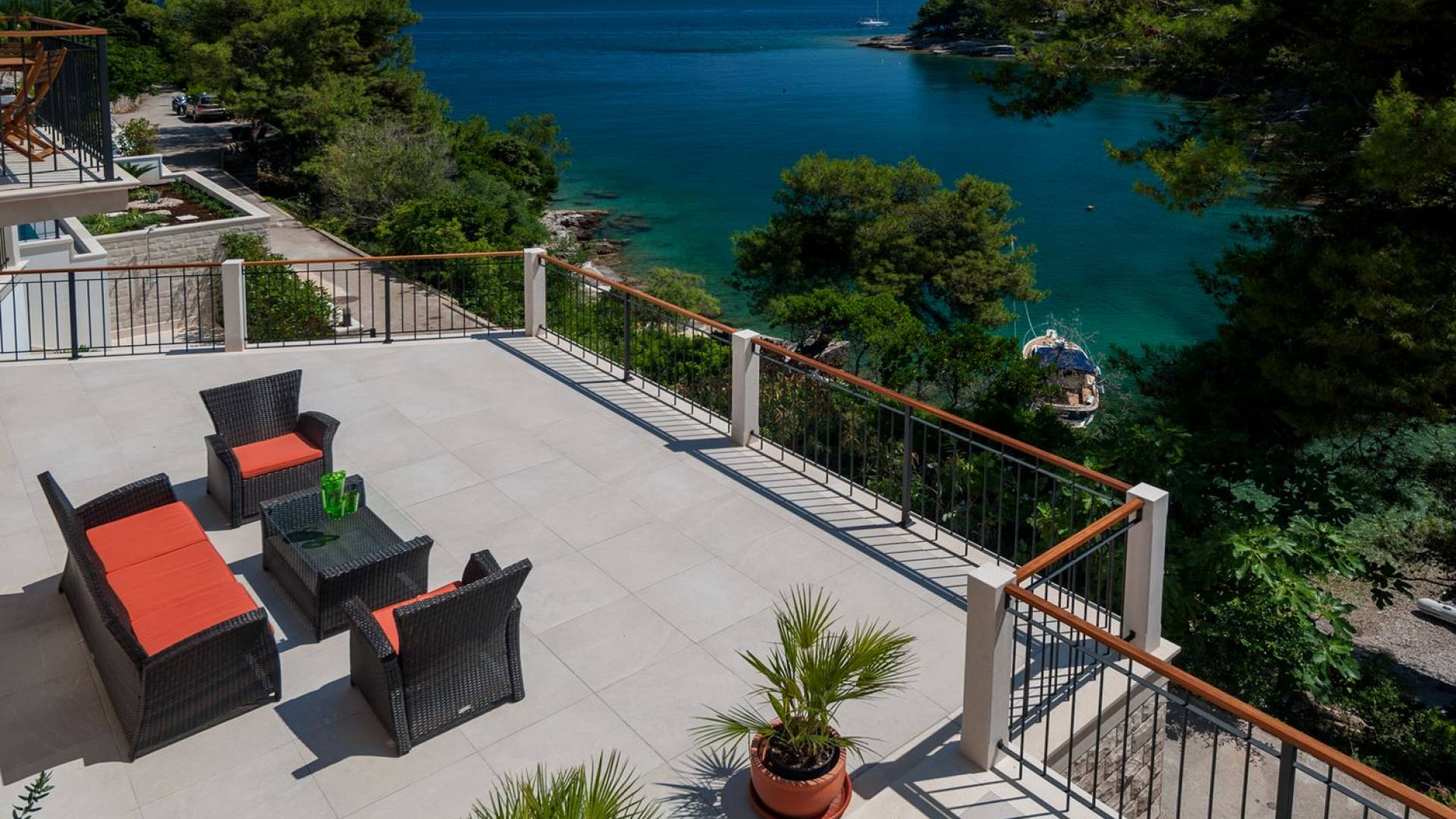 На втором этаже, куда можно подняться по наружной лестнице, находятся три спальни с двуспальными кроватями и ванными комнатами. В каждой спальне есть собственный телевизор и стеклянные двери, ведущие на балконы с захватывающим видом и удобными и меблированными открытыми площадками.