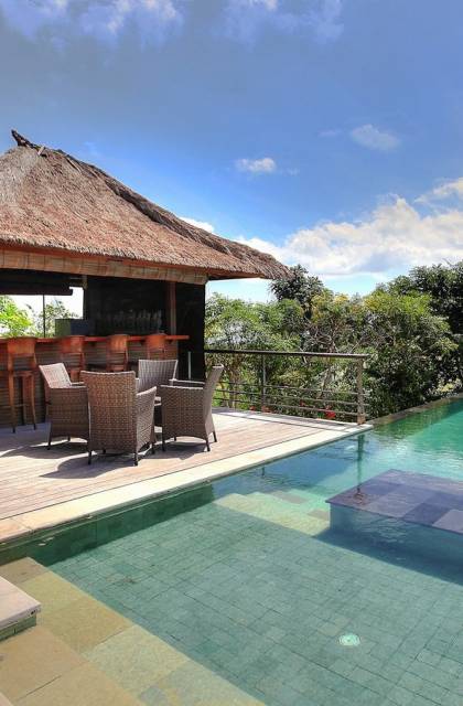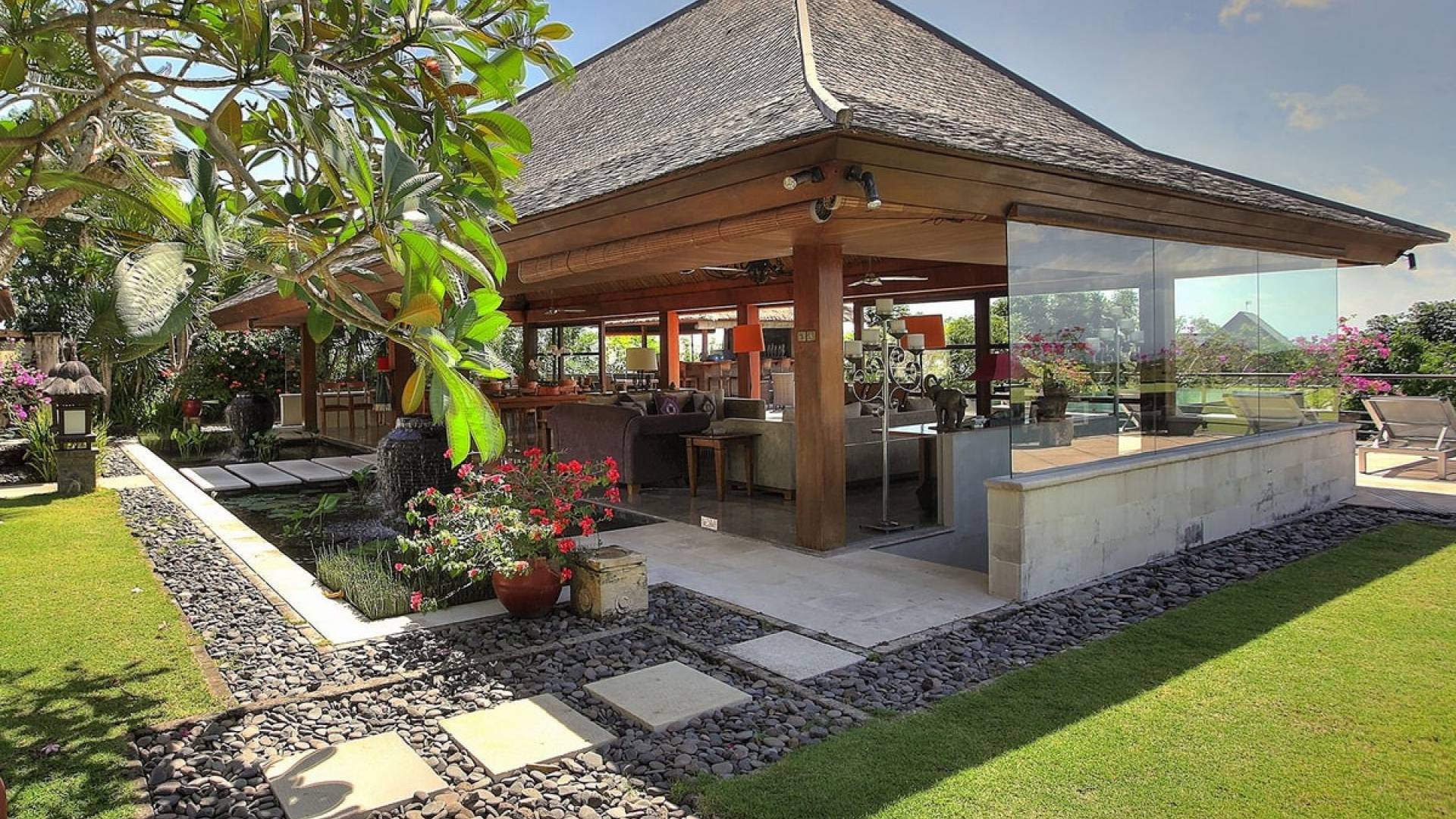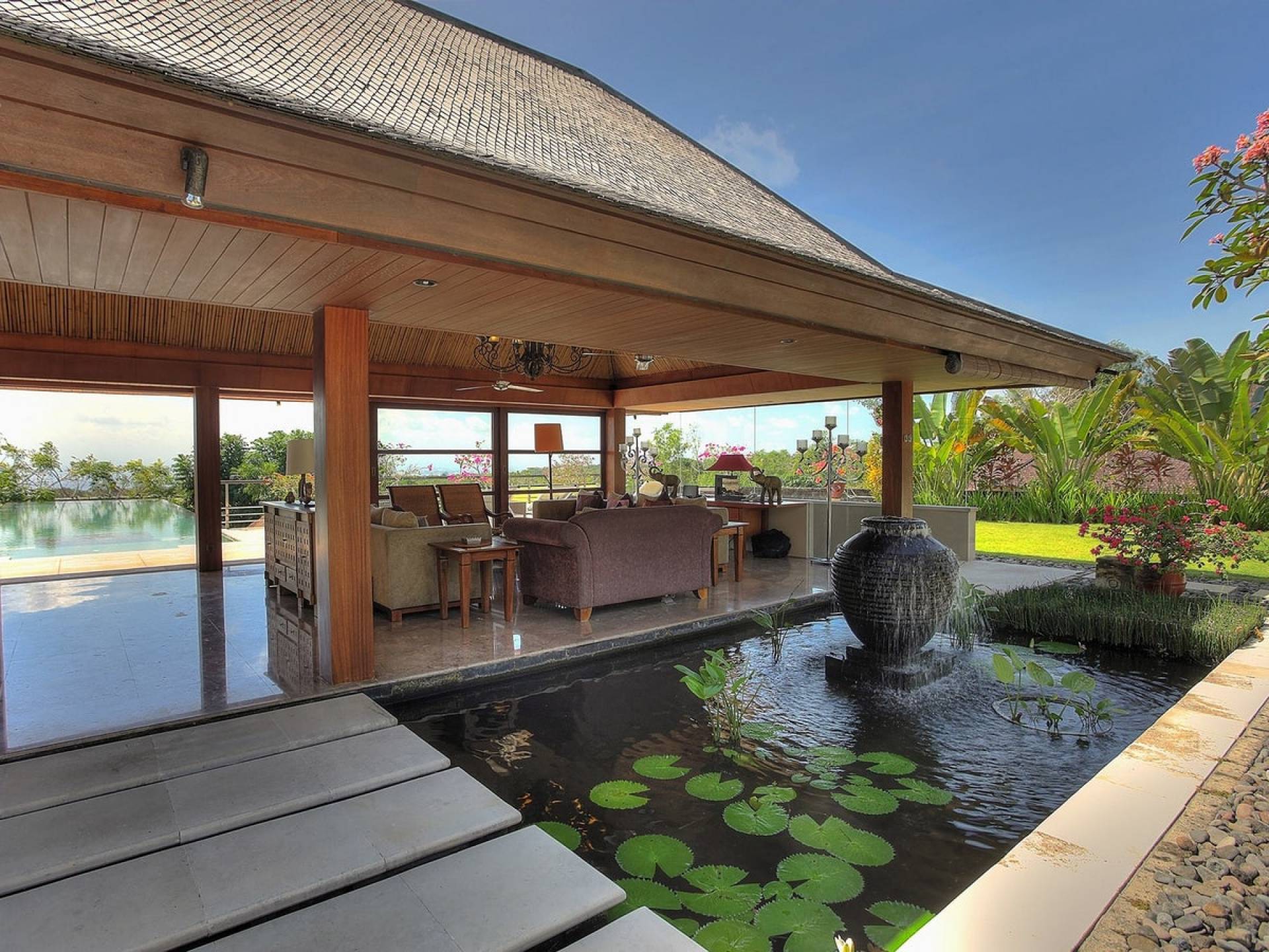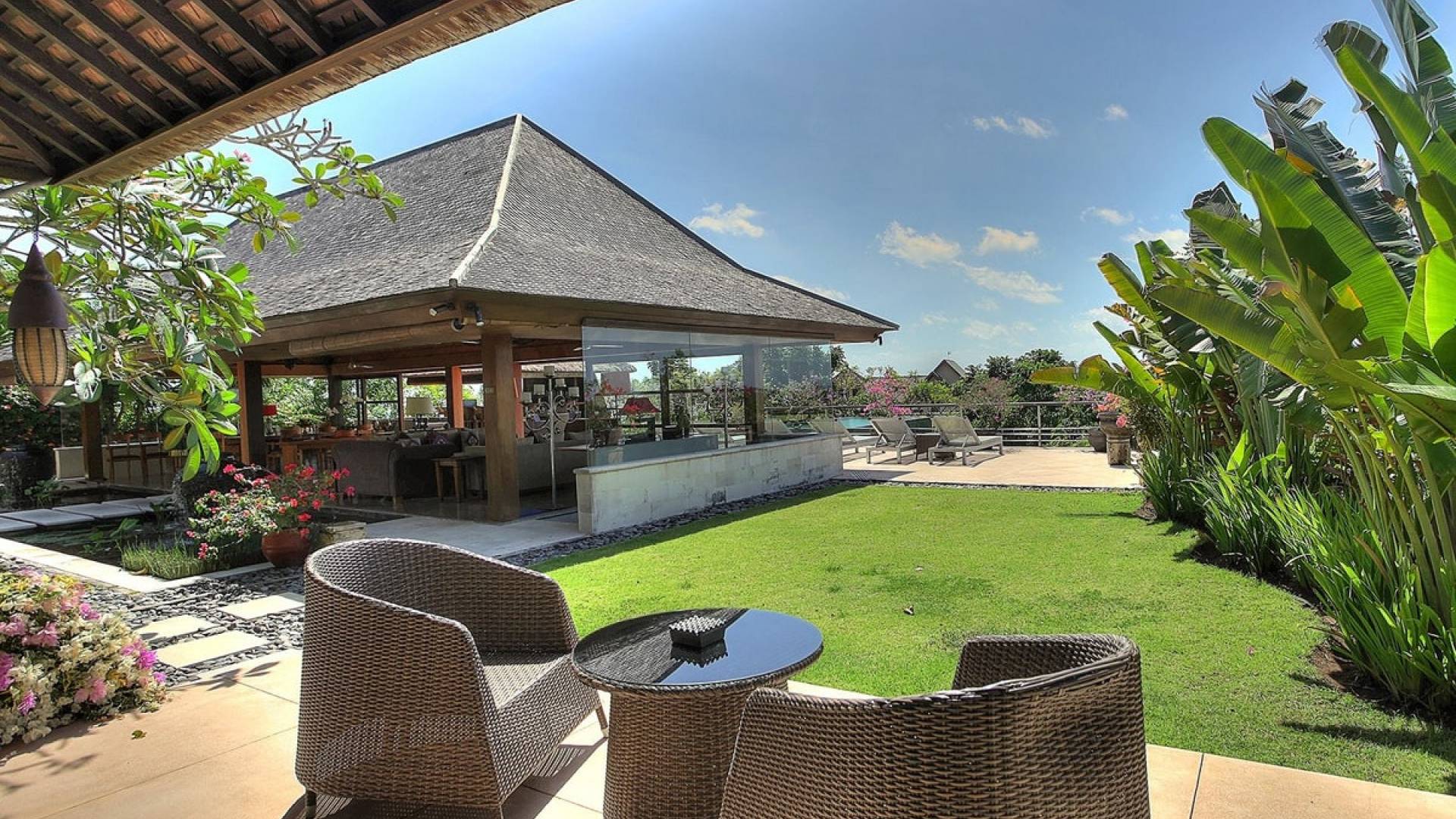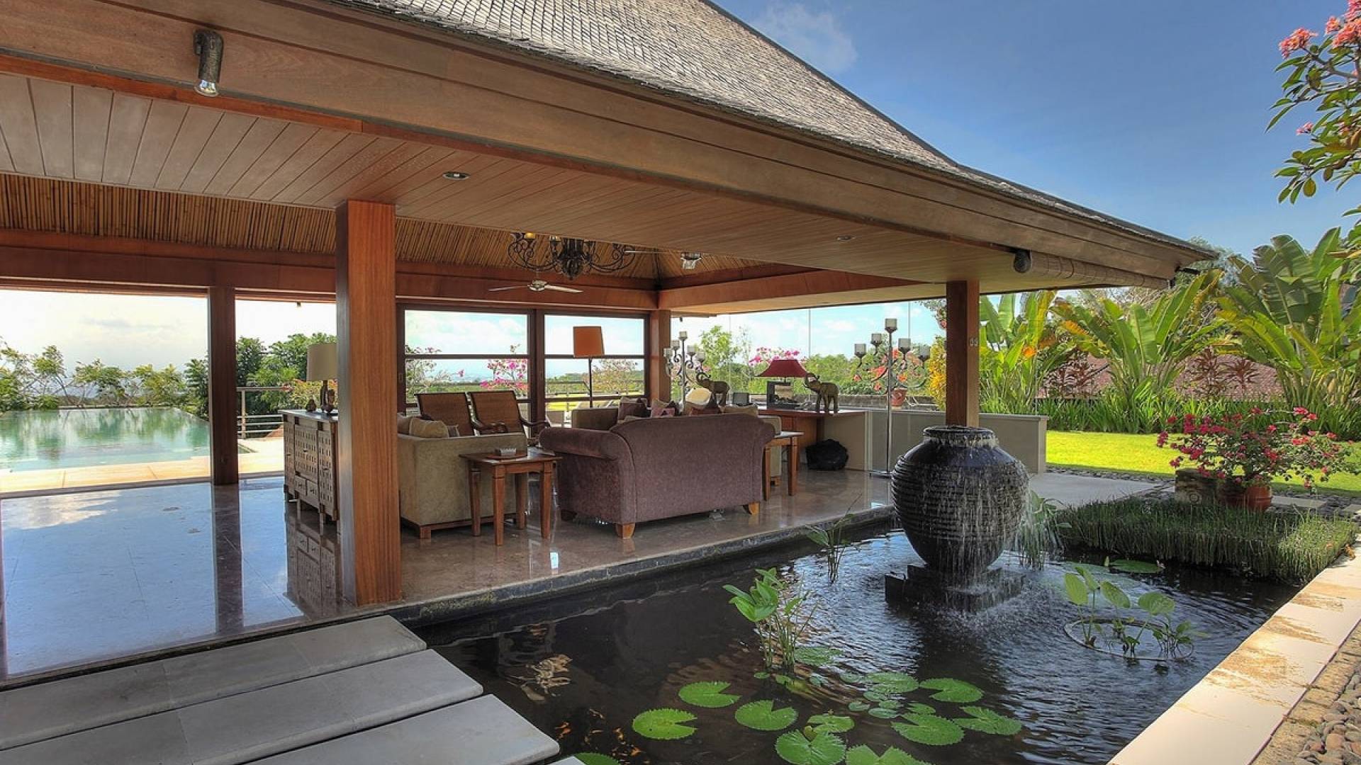 Эта полностью укомплектованная вилла с пятью спальнями, спроектированная так, чтобы максимально открывать великолепные виды и ловить ветерок, состоит из нескольких павильонов и впечатляющего 16-метрового частного бассейна, дополненного лужайками, террасами и водными элементами. В современной балийской архитектуре используются такие местные материалы, как палиманский камень, тиковое дерево и кровельная черепица из железного дерева.
