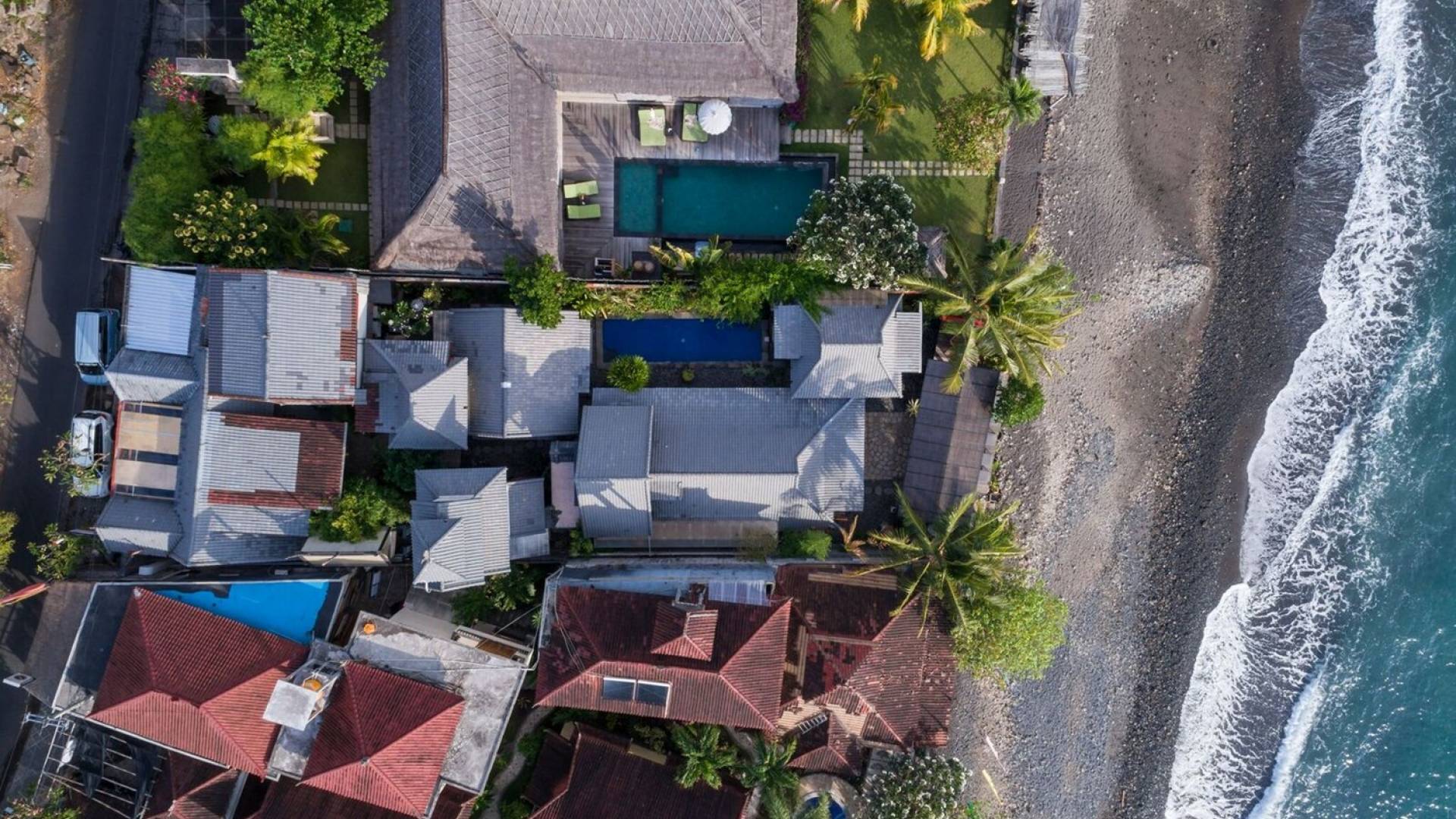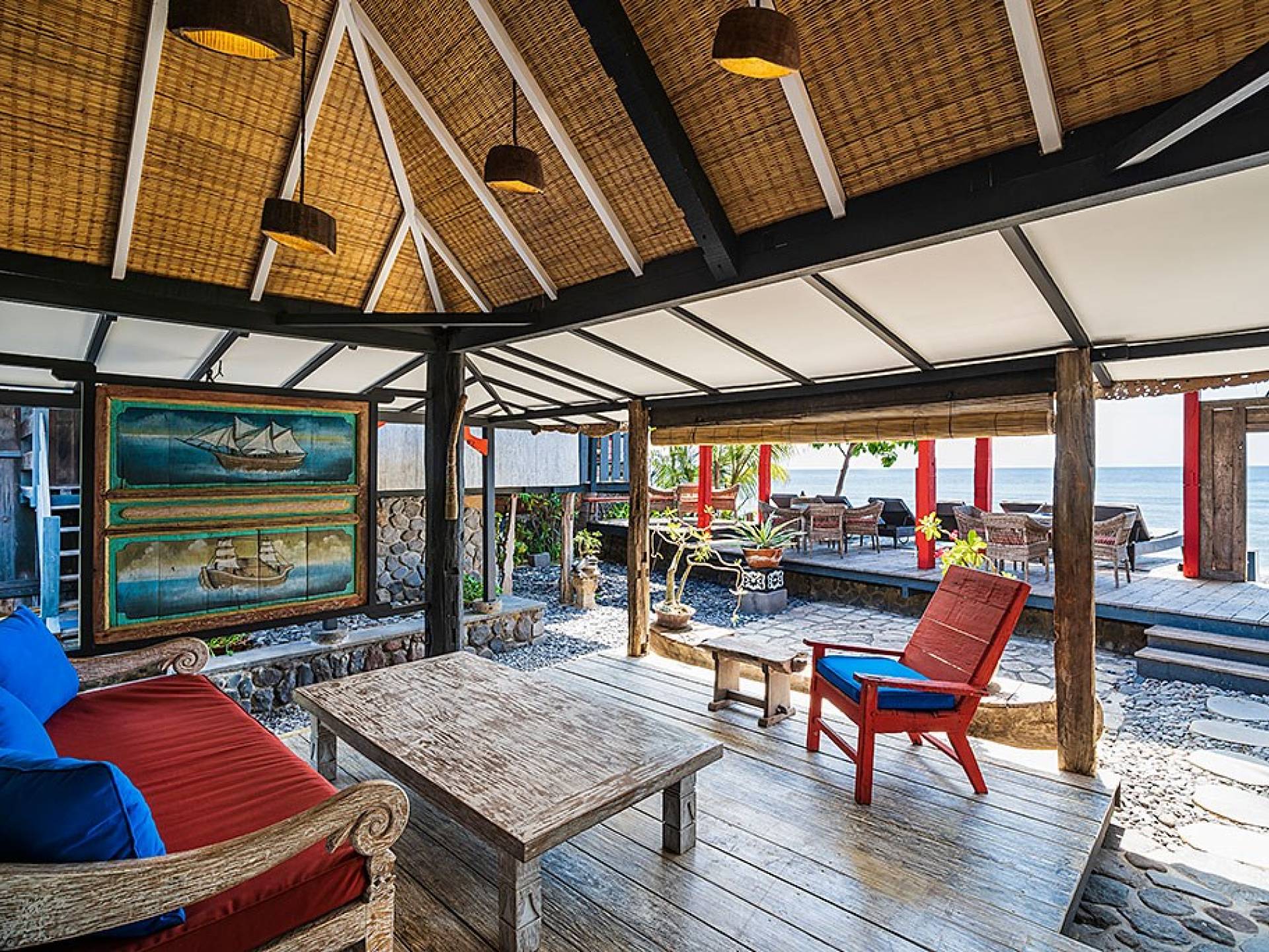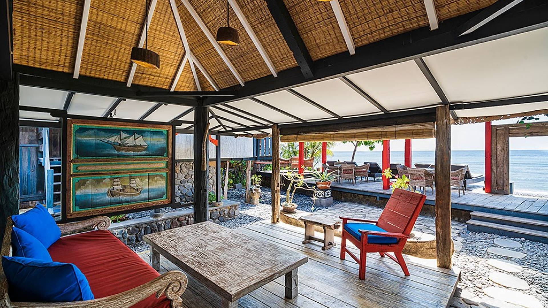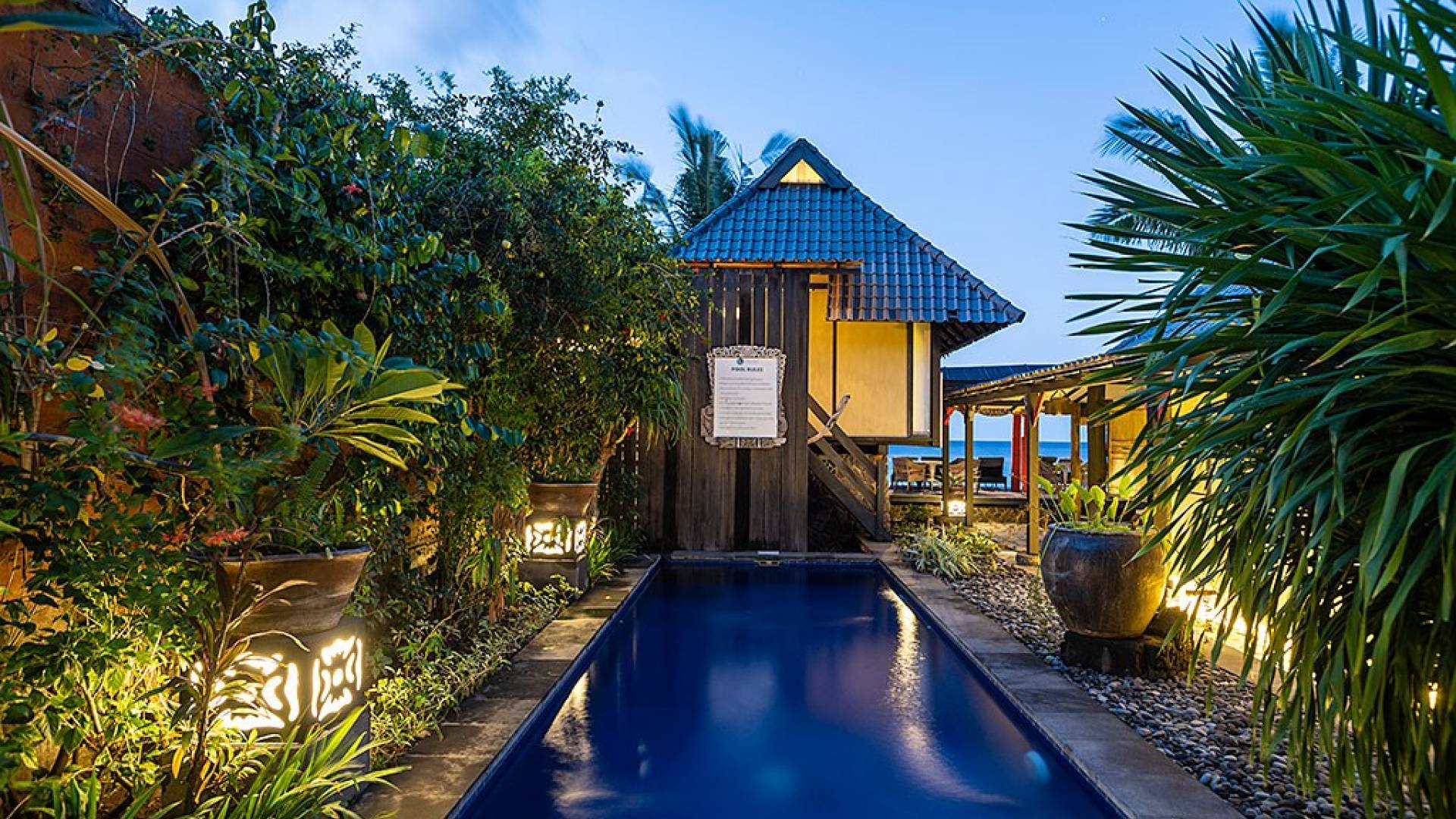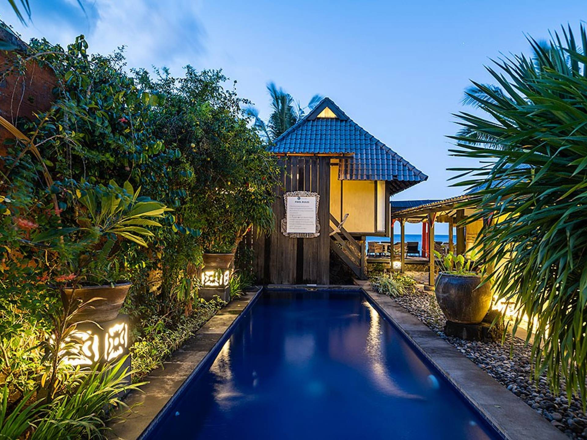 Приблизительно в 95 км от международного аэропорта Нгурах-Рай Бали и построенный в 2010 году с сильным тяготением к японской архитектуре и любви к востоку, этот домик изначально был построен голландским джентльменом как дом для семейного отдыха с использованием его замечательной коллекции старого дерева. и состоит из 3 коттеджей (коттеджи Sea House - теперь известные как Amed, Shiro - теперь известные как Jemeluk и Dragon Fly - теперь известные как Tirta Gangga). Позже он построил еще 3 коттеджа (High Tide - теперь известный как Tulamben, Tower - теперь известный как Karangasem, и Sea View - теперь известный как Seraya), прежде чем превратить его в коммерческий домик, который в 2013 году был известен как Pondok Laut. пока не сменил владельца в декабре 2017 года.