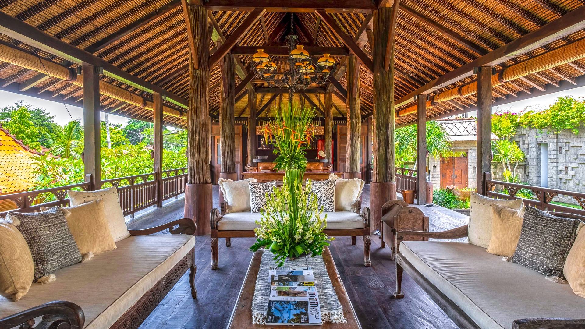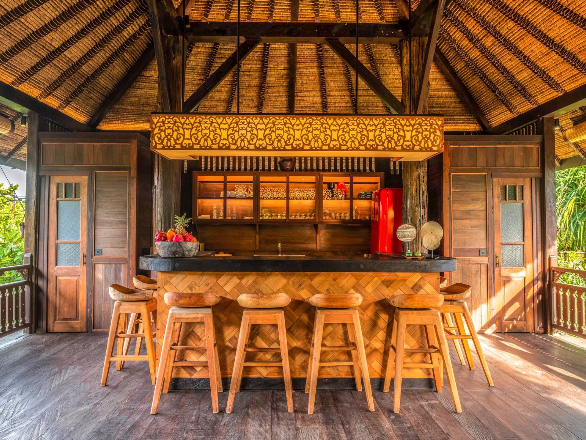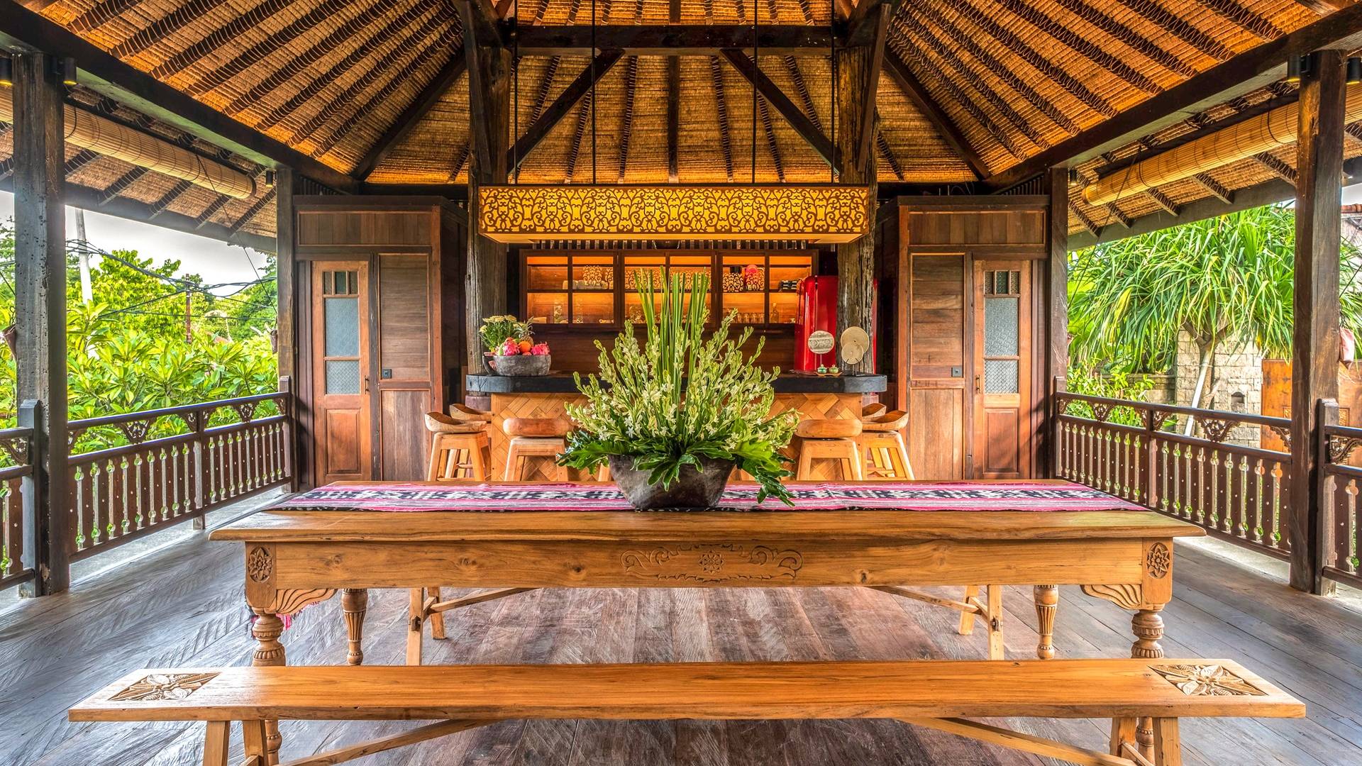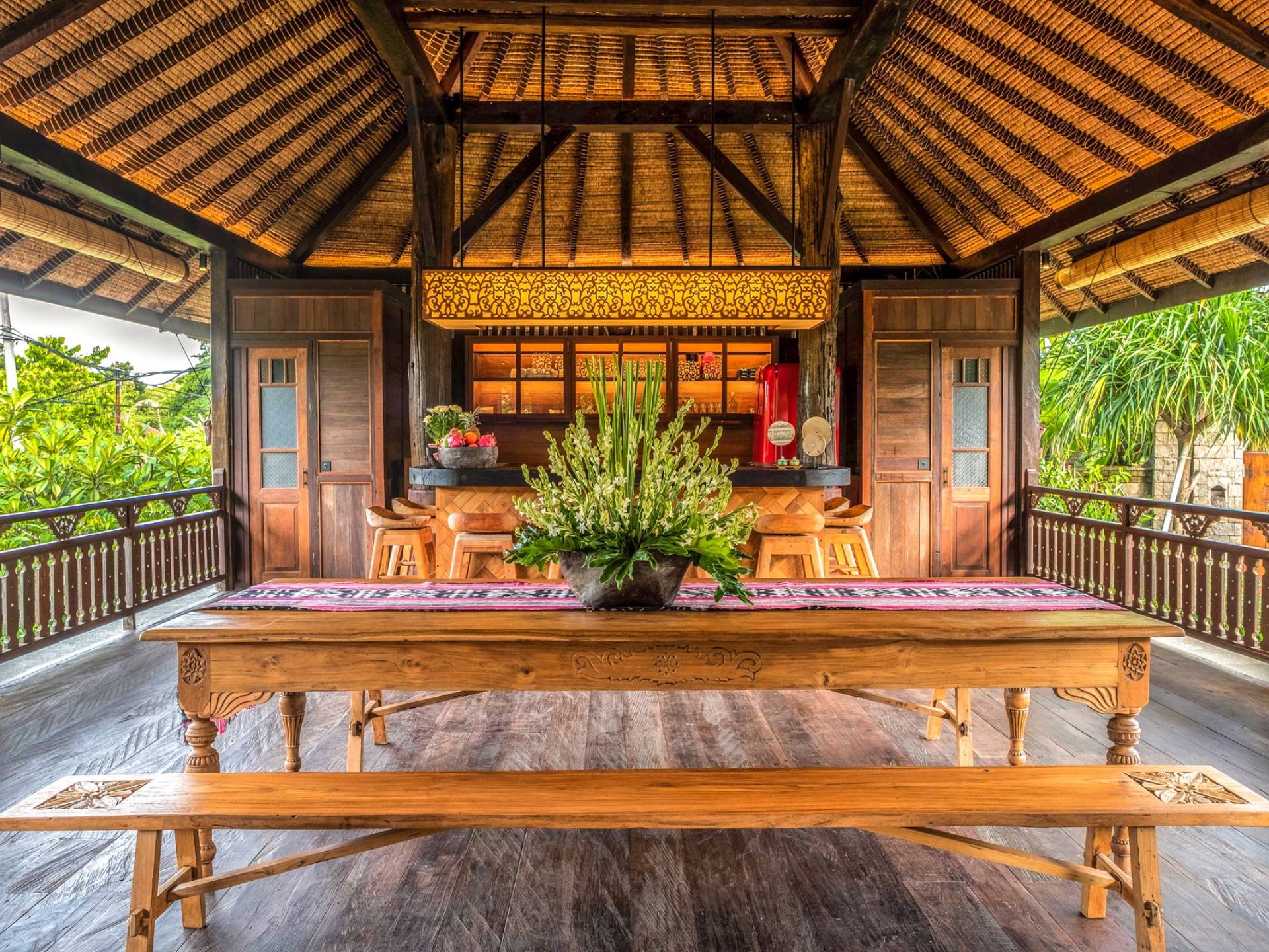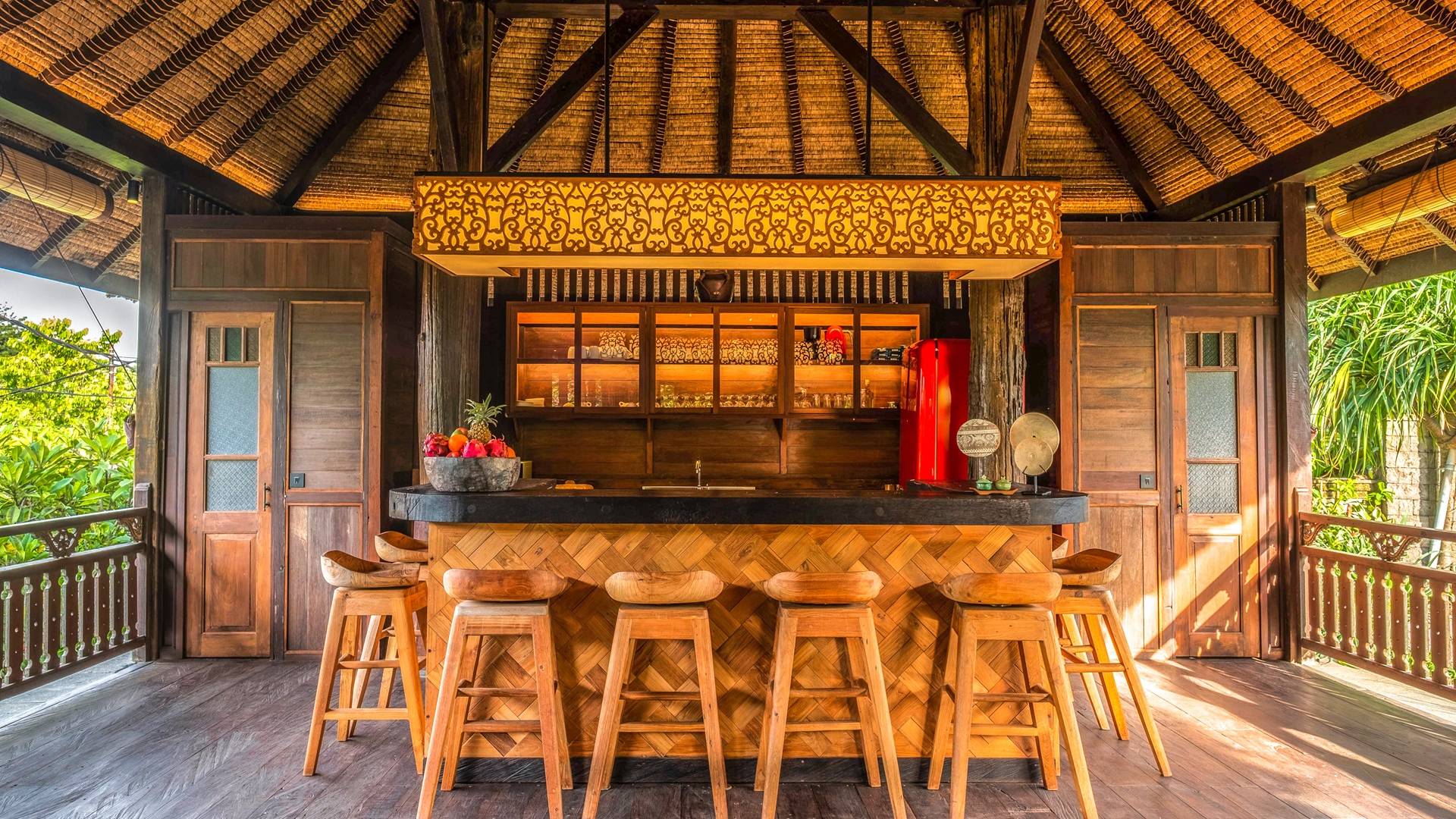 Огромный полуоткрытый павильон в балийском стиле - сердце общества на вилле. Под высокой соломенной крышей из аланг-аланга вы найдете шикарные, но современные кресла, традиционную яванскую кушетку и большой диван. Кухня в островном стиле и барная стойка с раковиной оборудованы эспрессо-машиной, а барные стулья у стойки - идеальное место, чтобы насладиться коктейлем или бутылкой вина, чтобы отпраздновать отпуск на Бали. В обеденной зоне потрясающий старинный обеденный стол из железного дерева - идеальное место для повседневных завтраков, а также ужинов при свечах, приготовленных вашим поваром на частной вилле.