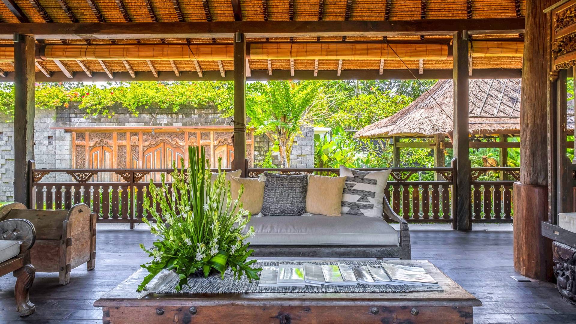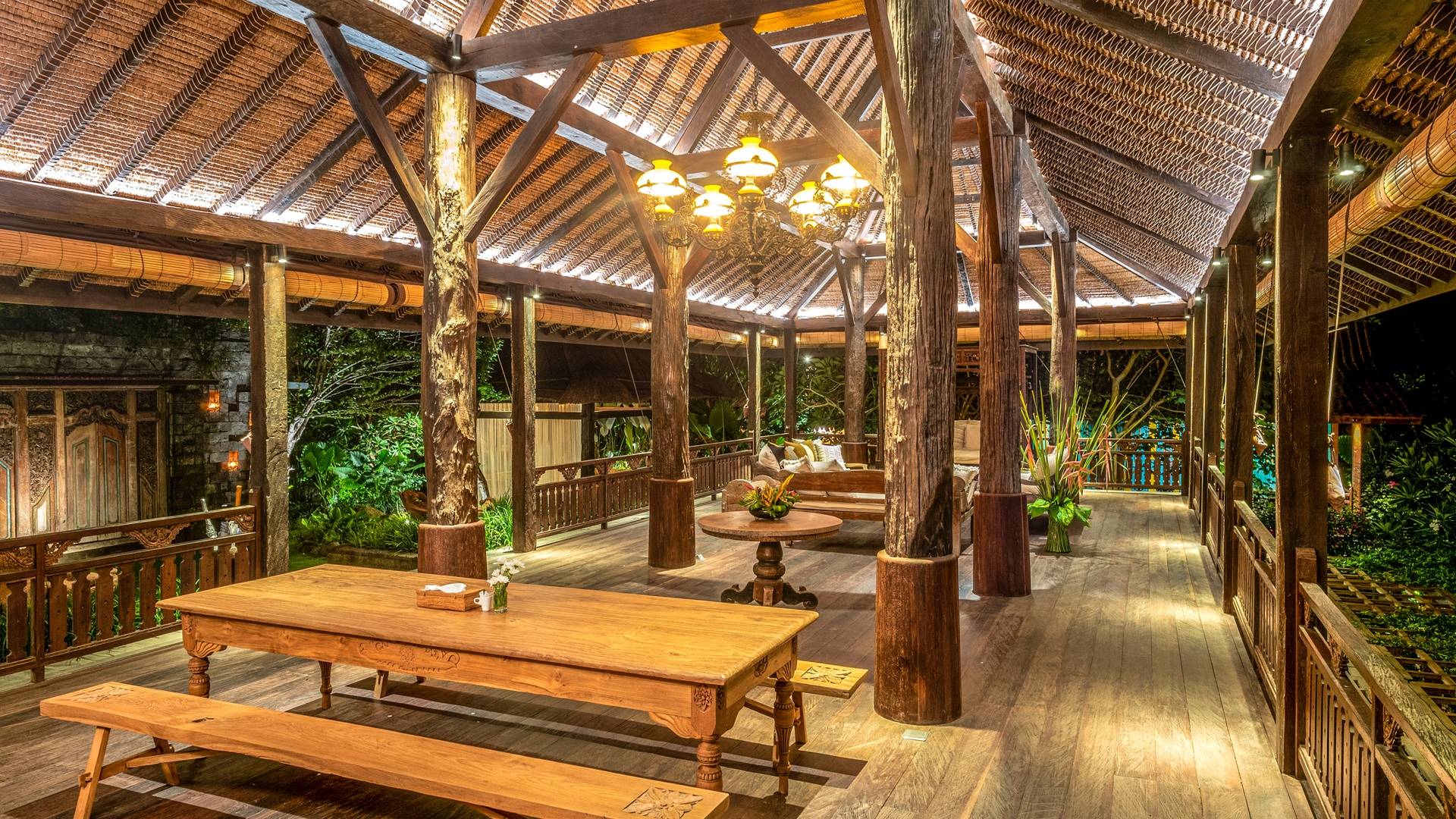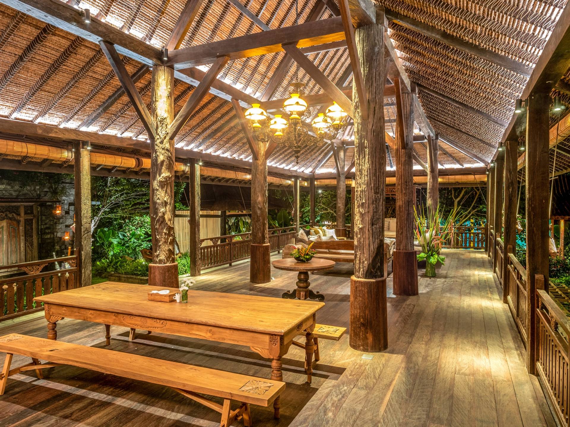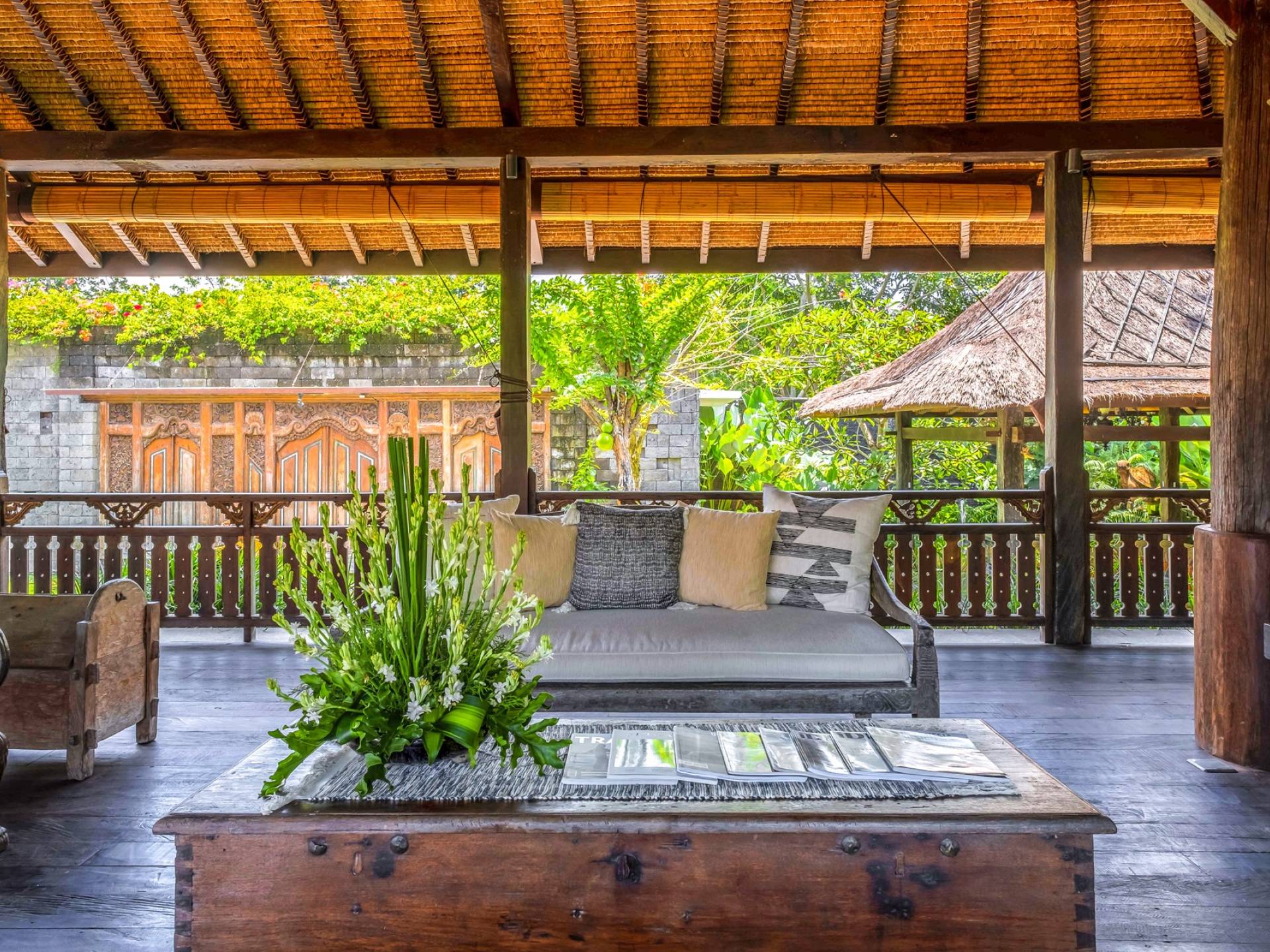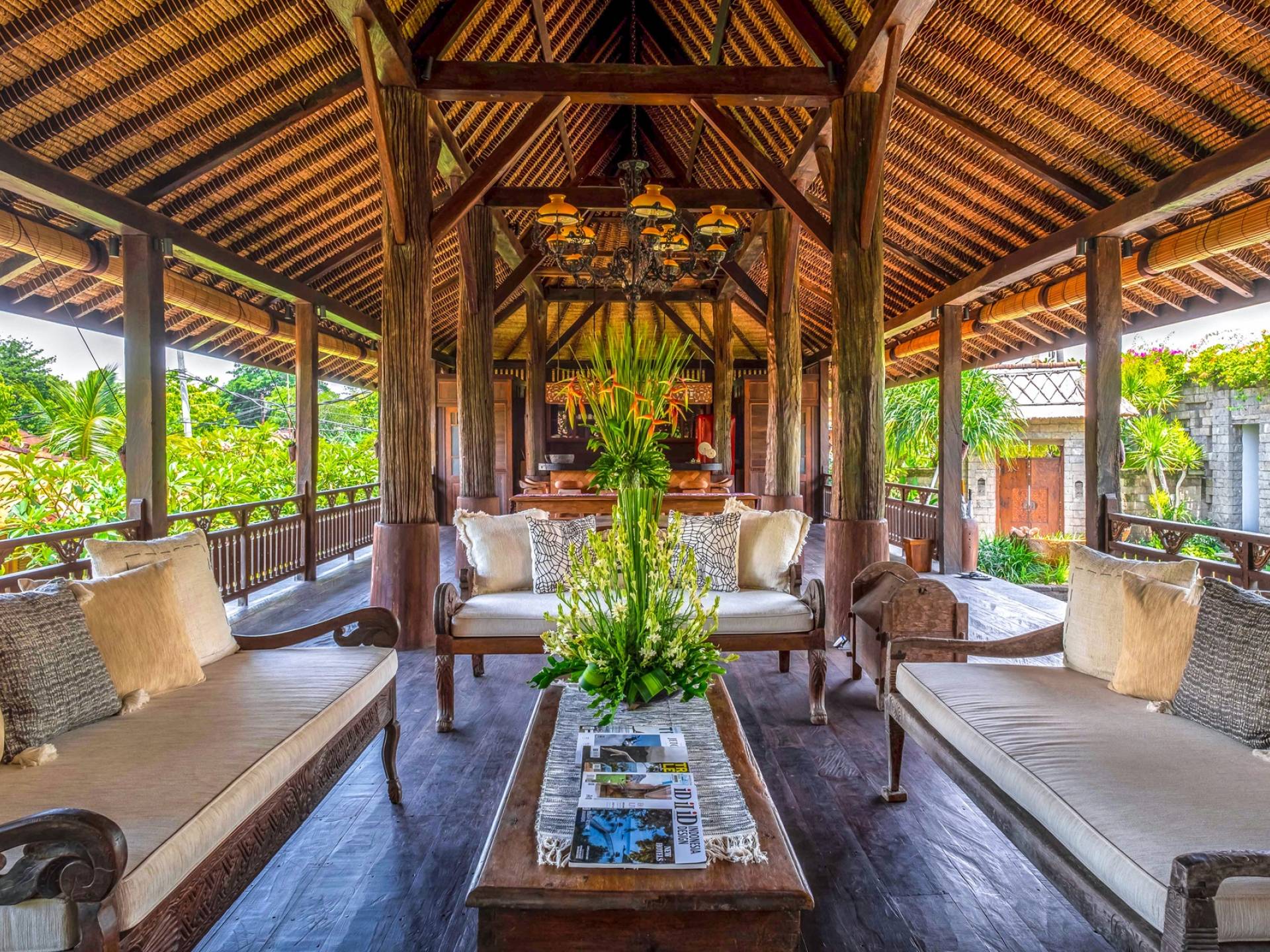 Огромный полуоткрытый павильон в балийском стиле - сердце общества на вилле. Под высокой соломенной крышей из аланг-аланга вы найдете шикарные, но современные кресла, традиционную яванскую кушетку и большой диван. Кухня в островном стиле и барная стойка с раковиной оборудованы эспрессо-машиной, а барные стулья у стойки - идеальное место, чтобы насладиться коктейлем или бутылкой вина, чтобы отпраздновать отпуск на Бали. В обеденной зоне потрясающий старинный обеденный стол из железного дерева - идеальное место для повседневных завтраков, а также ужинов при свечах, приготовленных вашим поваром на частной вилле.