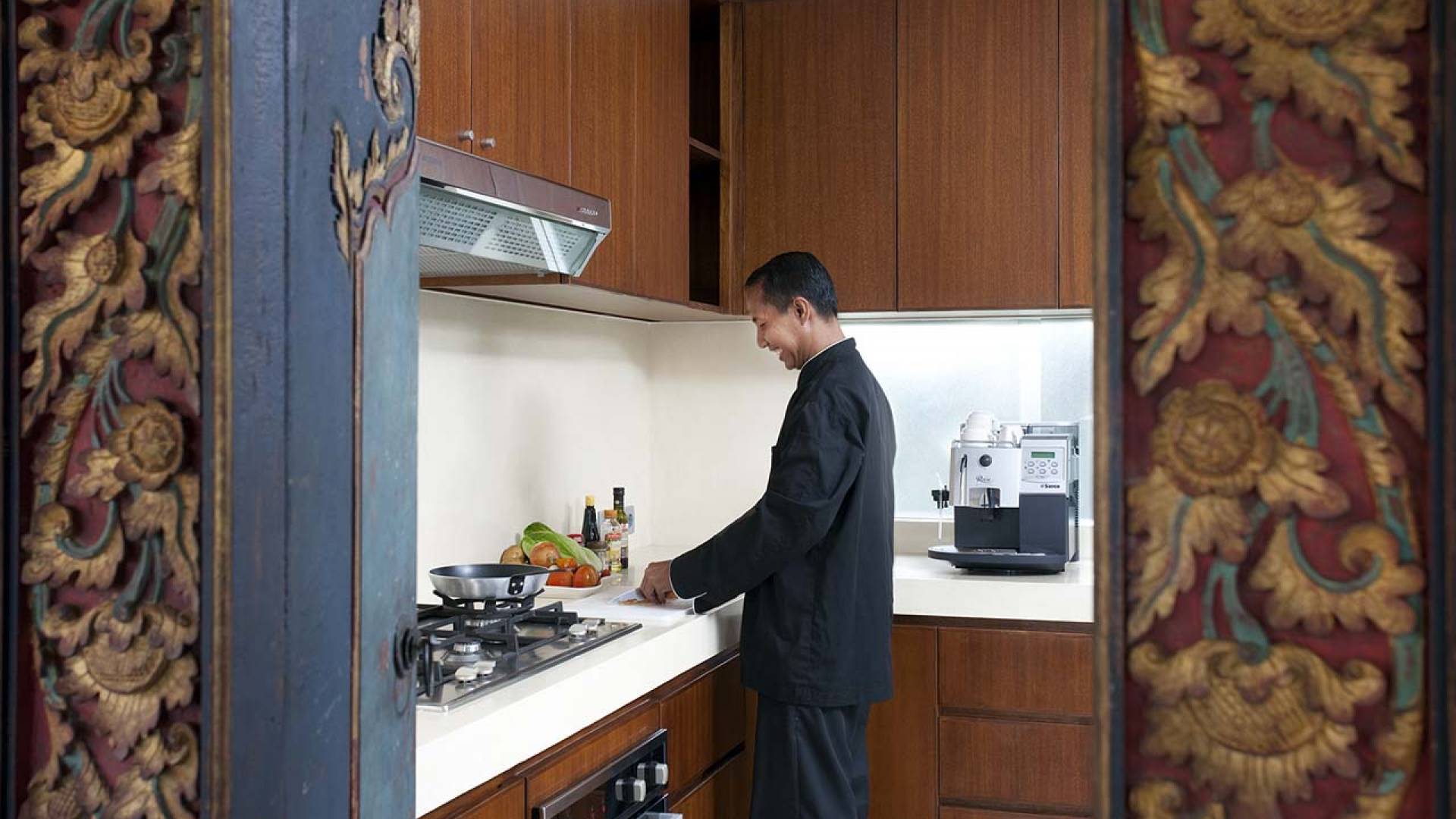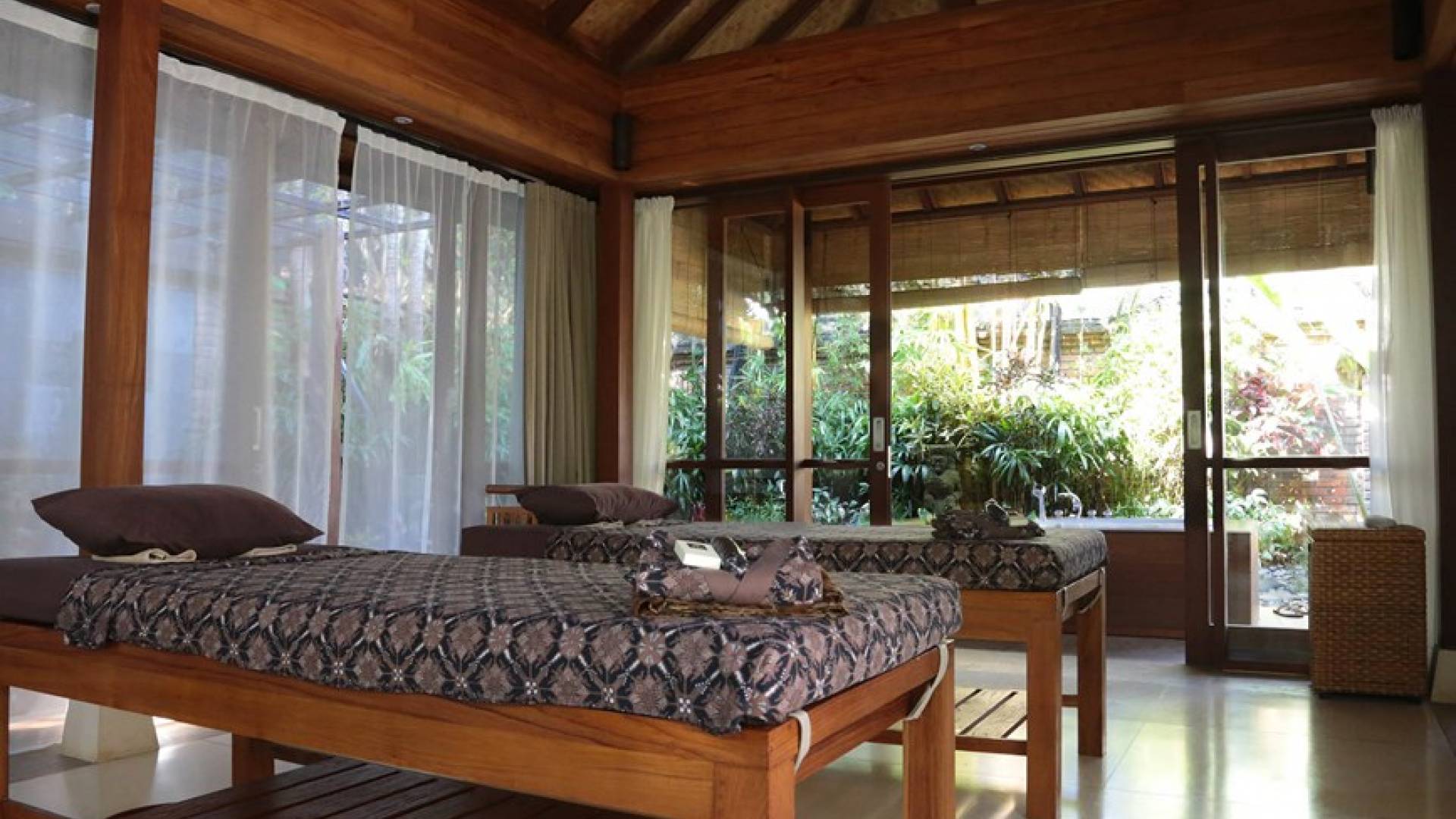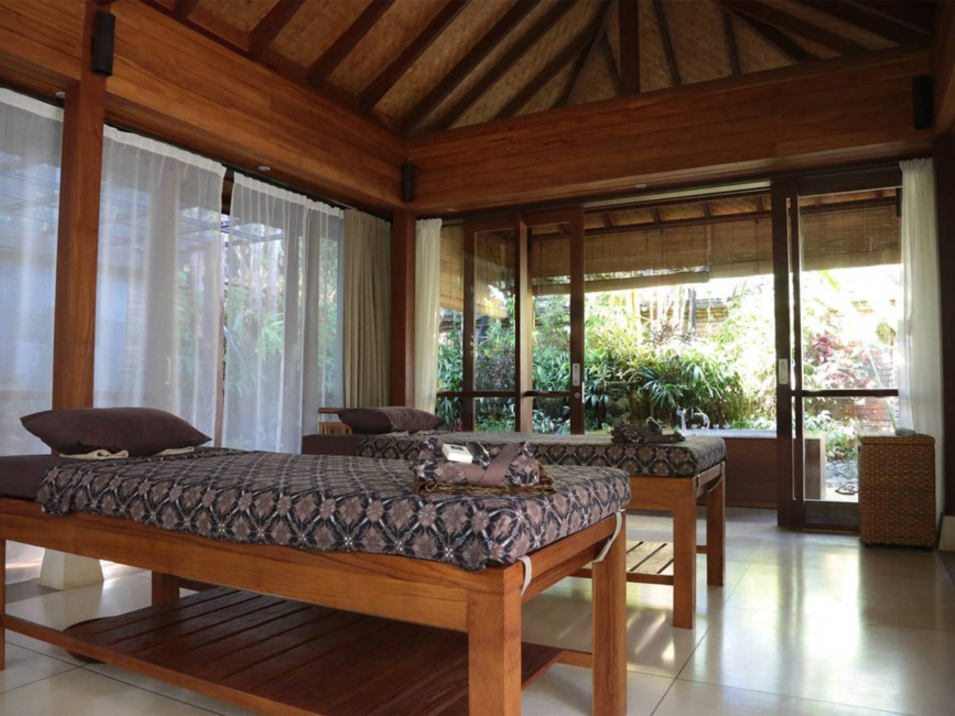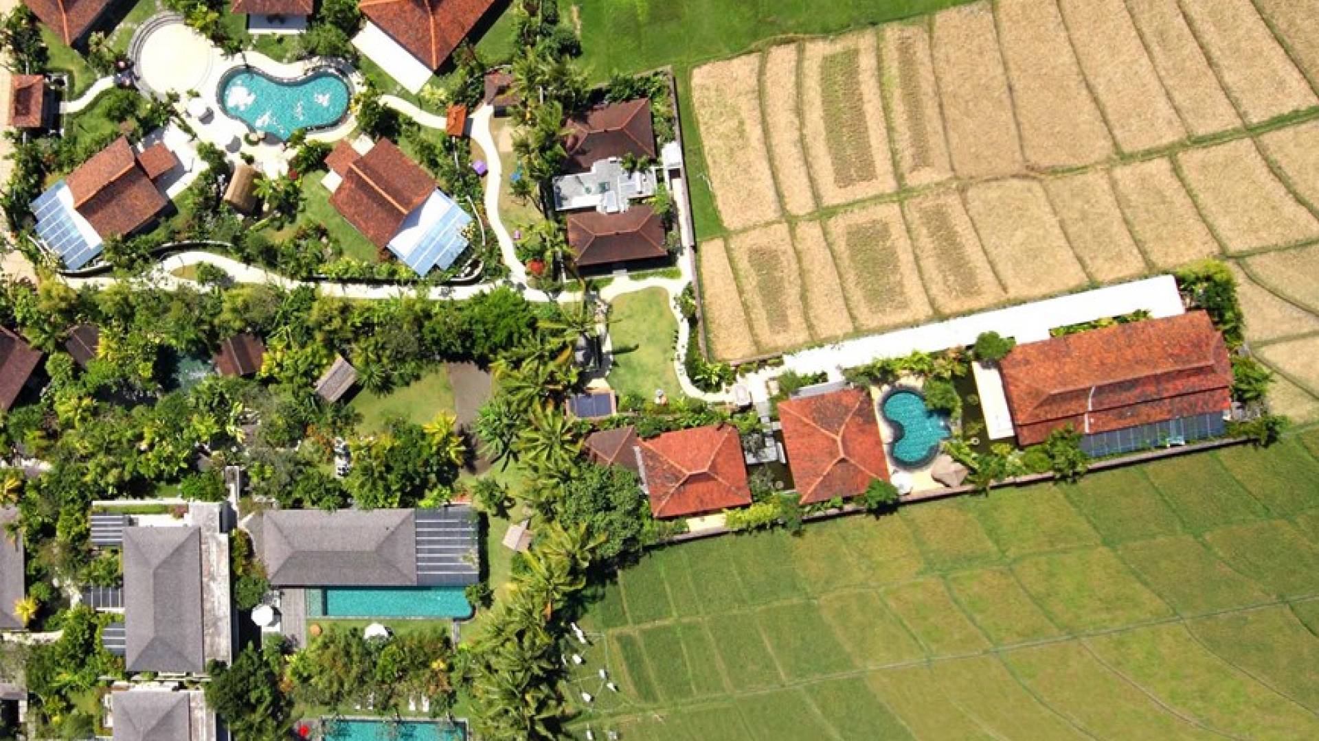 Вилла Сати состоит из нескольких отдельных павильонов, хорошо расположенных среди ухоженных садов. Самый большой из них - это открытый жилой павильон, который смотрит на пространство для выступлений в стиле амфитеатра рядом с большим бассейном произвольной формы. Бассейн окружают четыре павильона для джогло, в каждом из которых есть спальня с ванной в саду и солнечная терраса. Среди них - шестое и самое маленькое здание - старинный лумбунг (традиционный рисовый сарай), который также служит домиком для игр.