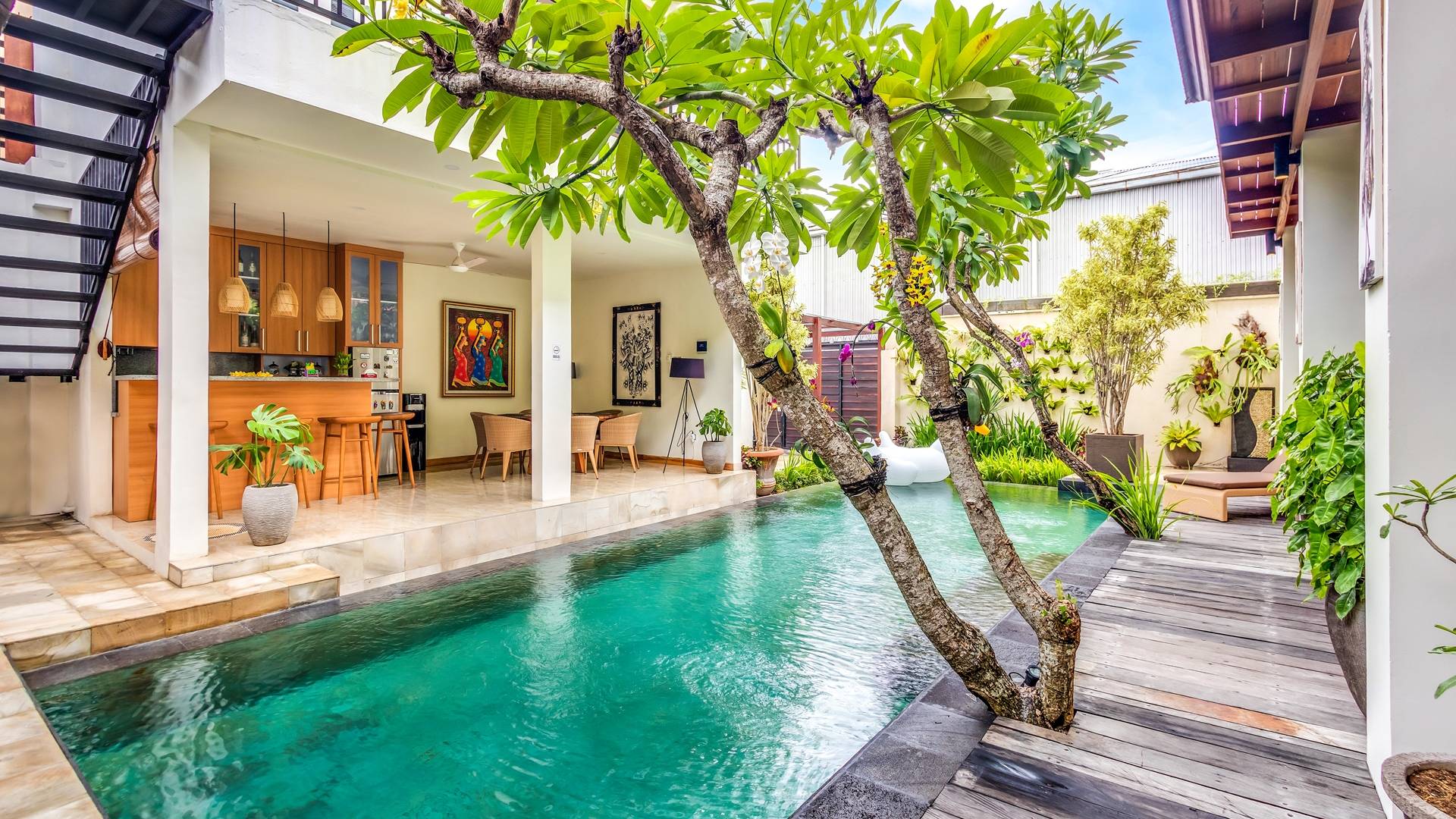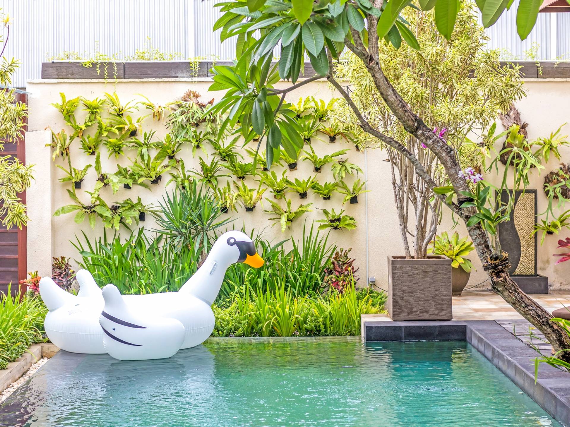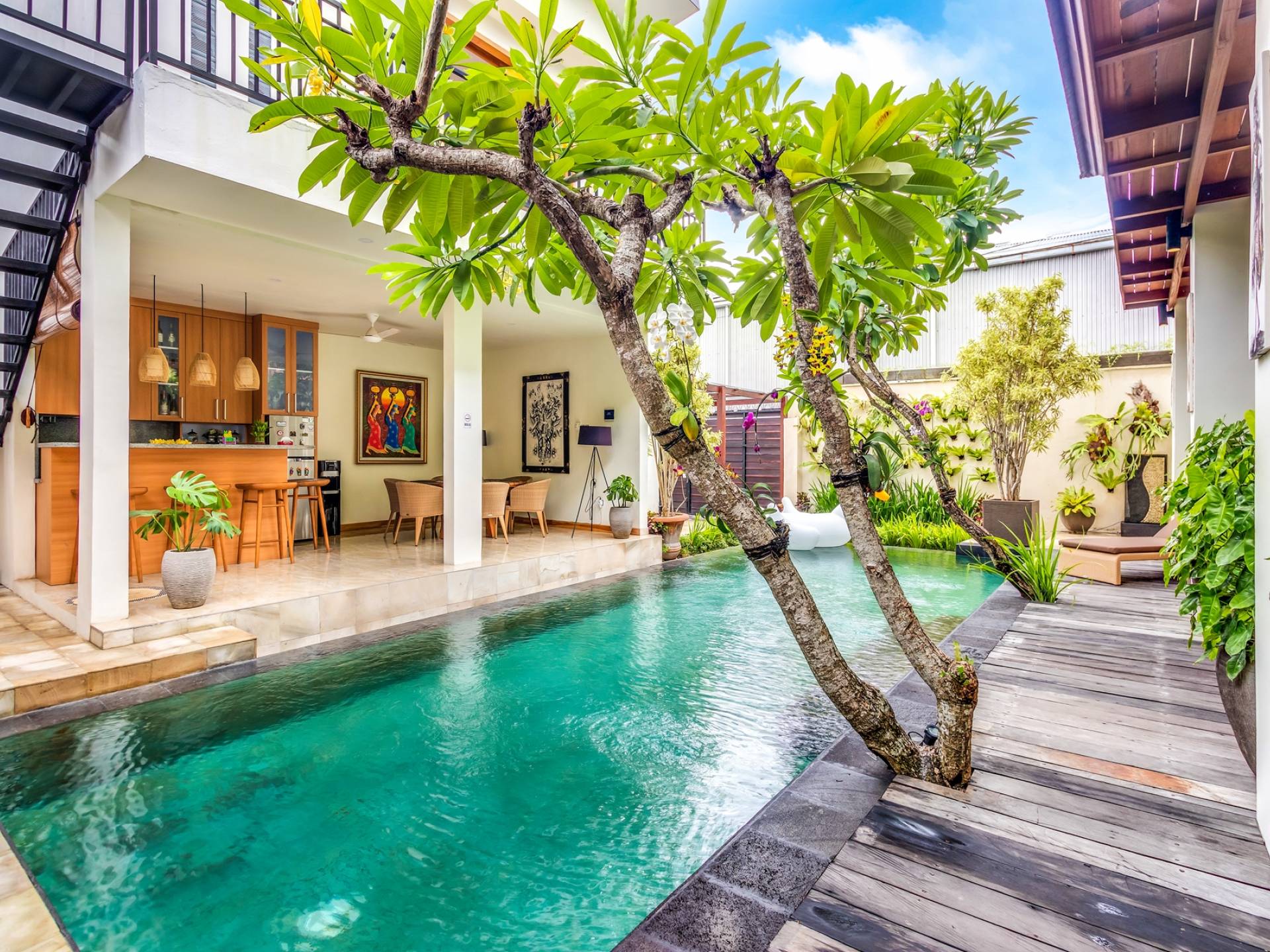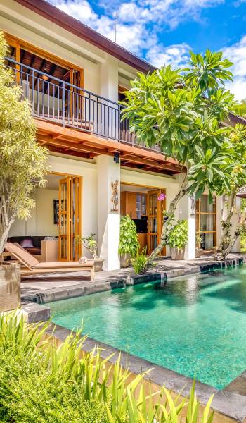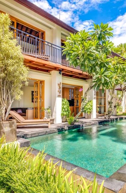 При входе на виллу Amrina вас встречает большой частный бассейн, окруженный тропическими деревьями и шезлонгами. Открытая гостиная с видом на бассейн обеспечивает идеальное место, чтобы спрятаться от солнца и присматривать за детьми, играющими в бассейне. Сочная зелень и деревянная терраса создают идиллический сад, в котором можно насладиться тишиной и покоем, окружающим виллу. Терраса на крыше спрятана за виллой с шезлонгами для полного уединения, чтобы погреться на солнце, а возвышенное пространство идеально подходит для наблюдения за знаменитыми балийскими закатами.