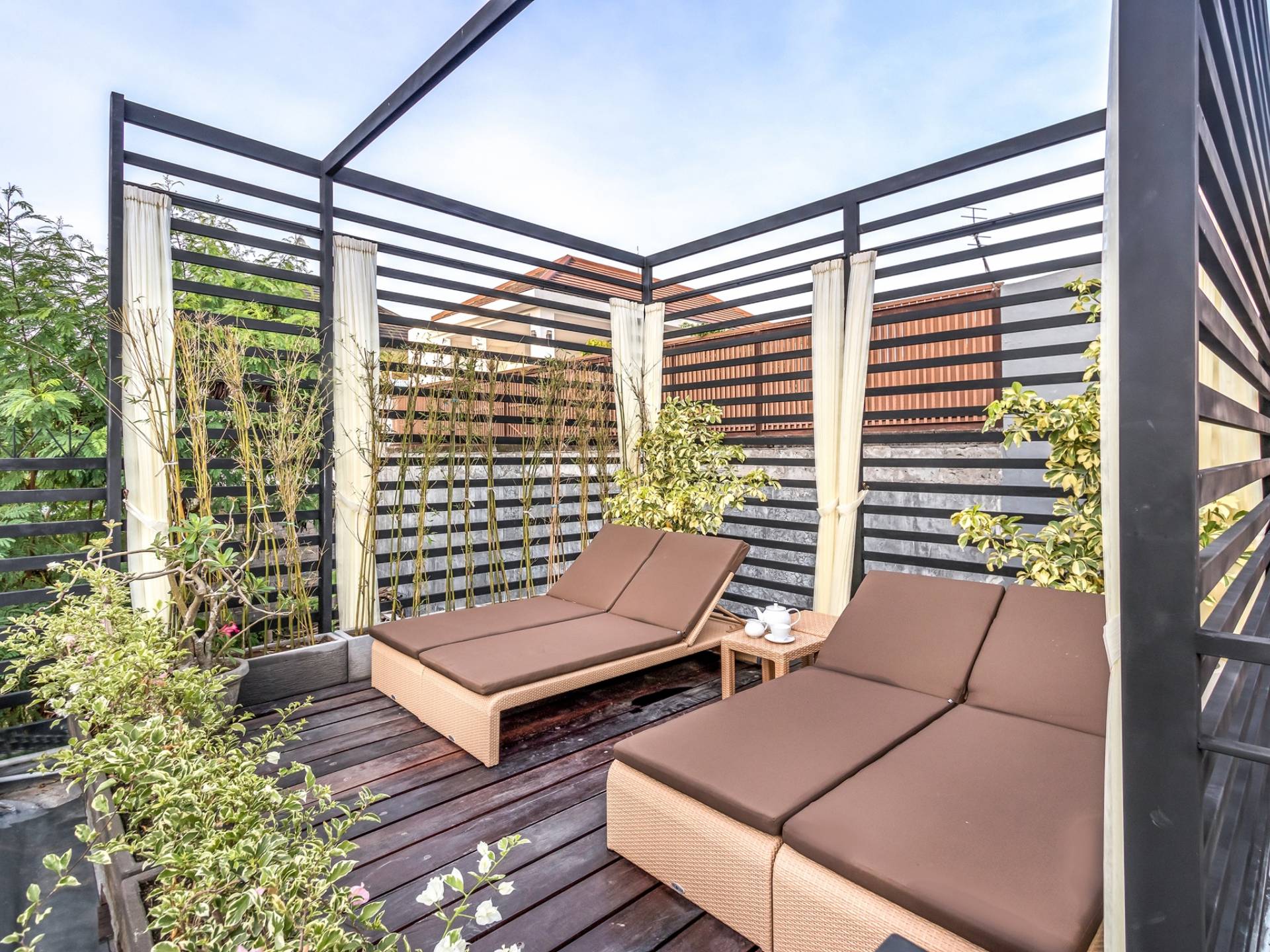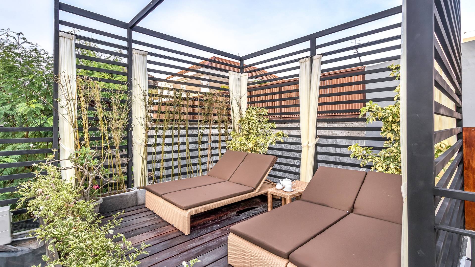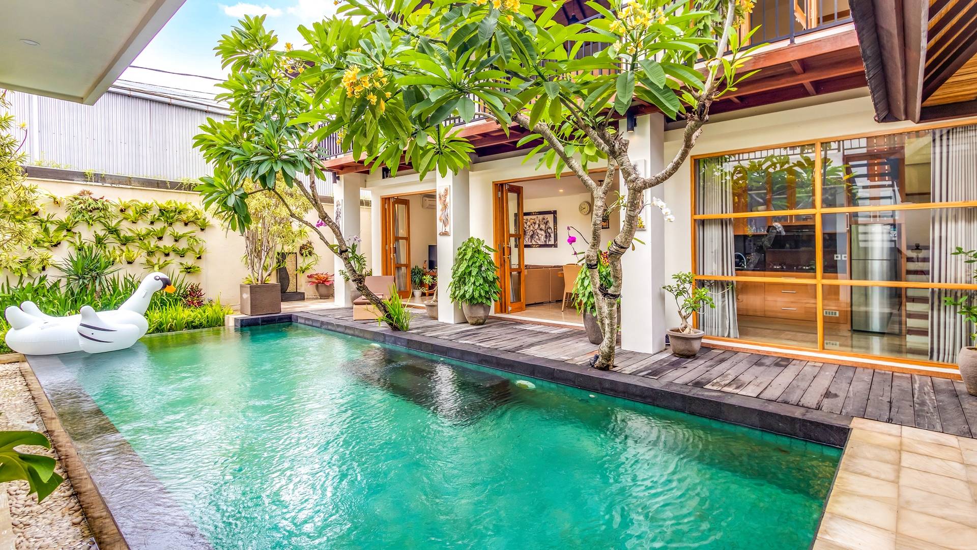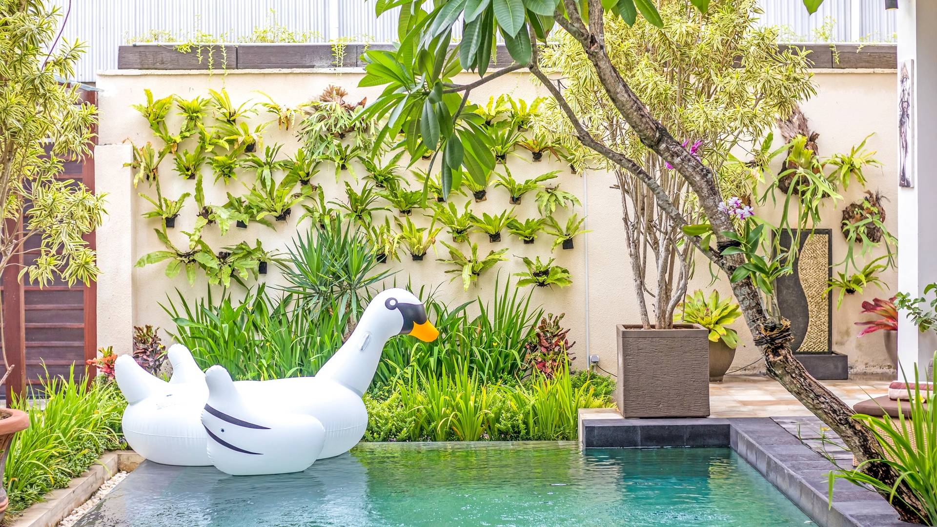 При входе на виллу Amrina вас встречает большой частный бассейн, окруженный тропическими деревьями и шезлонгами. Открытая гостиная с видом на бассейн обеспечивает идеальное место, чтобы спрятаться от солнца и присматривать за детьми, играющими в бассейне. Сочная зелень и деревянная терраса создают идиллический сад, в котором можно насладиться тишиной и покоем, окружающим виллу. Терраса на крыше спрятана за виллой с шезлонгами для полного уединения, чтобы погреться на солнце, а возвышенное пространство идеально подходит для наблюдения за знаменитыми балийскими закатами.
