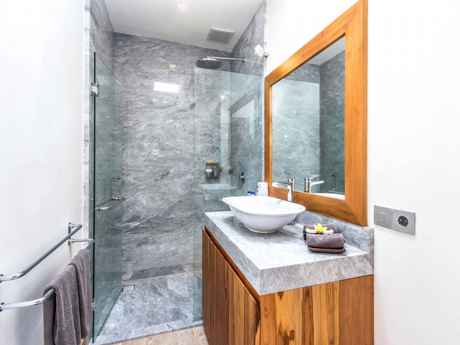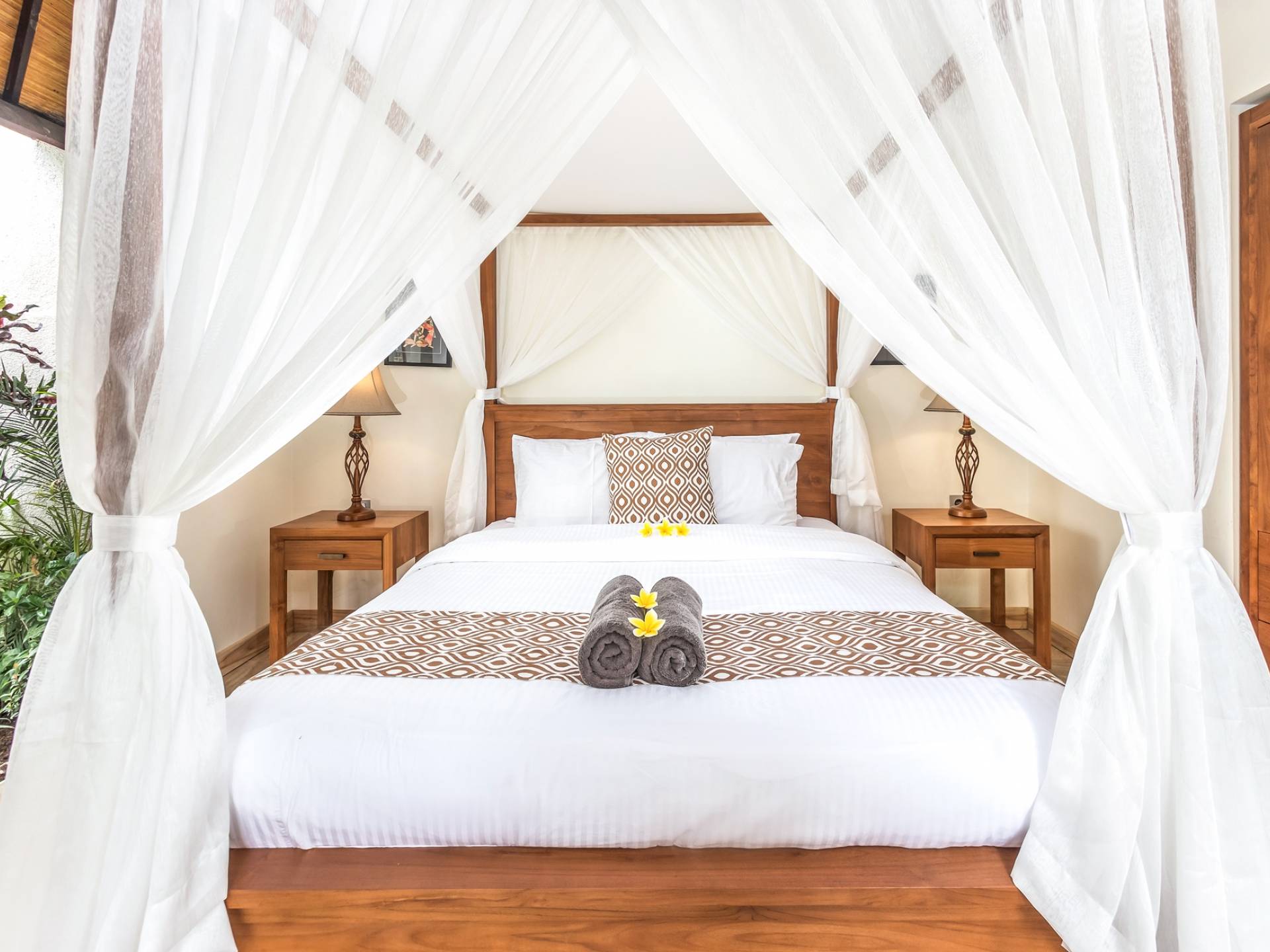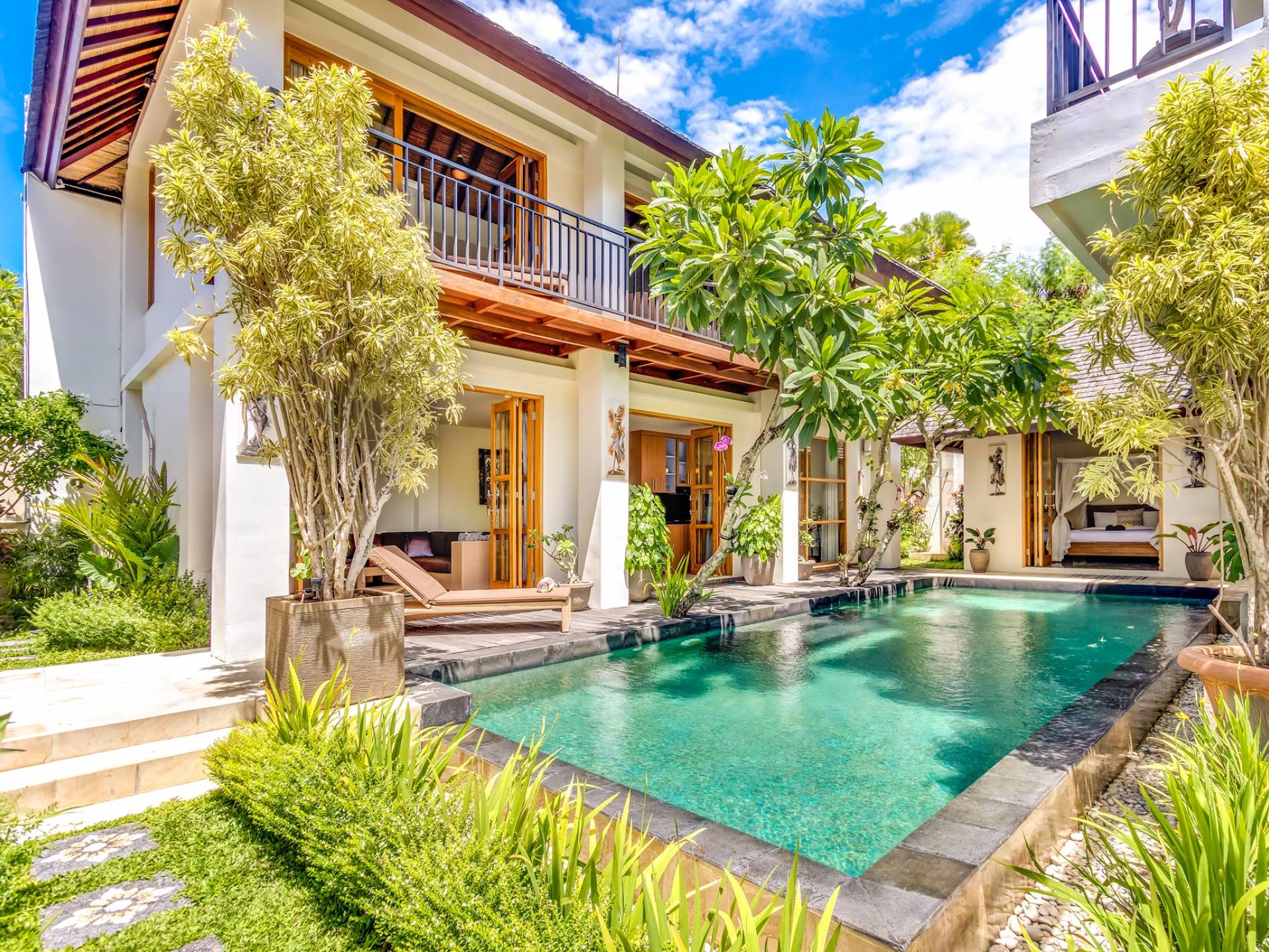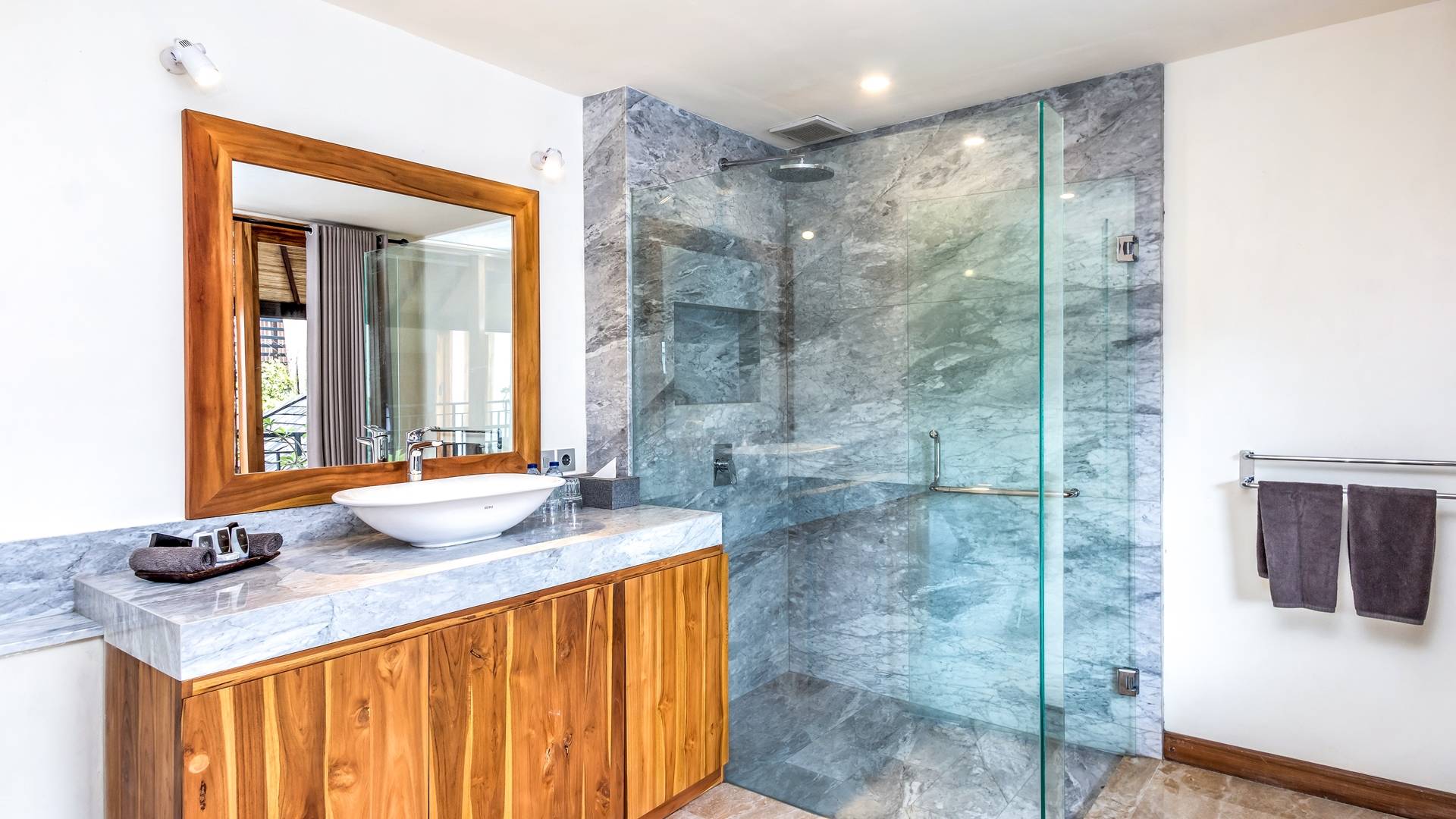 В 2 гостевых спальнях также есть роскошные двуспальные кровати и ванные комнаты. Одна расположена у бассейна и ведет прямо на деревянную террасу, а вторая гостевая спальня находится на втором этаже. Вилла предлагает уединение для каждой спальни, оставаясь интимной собственностью.