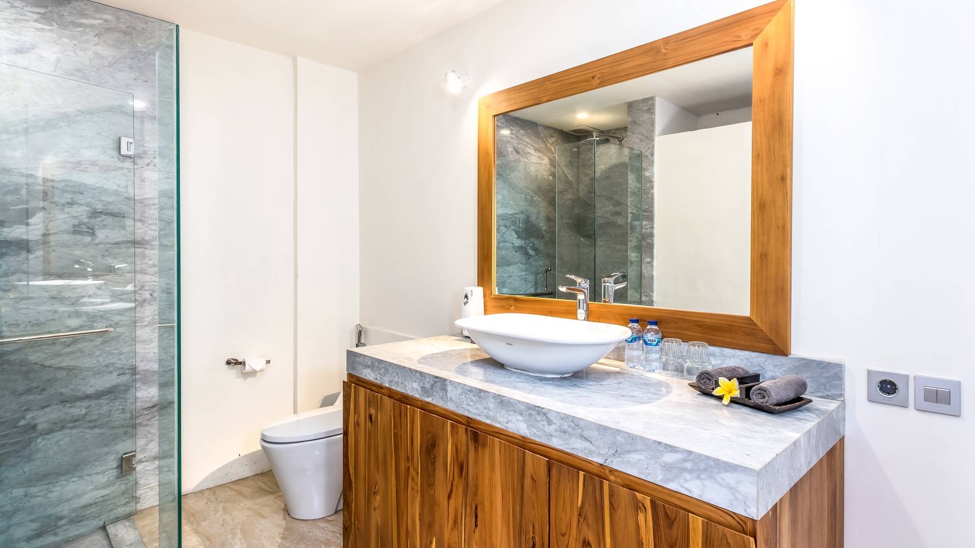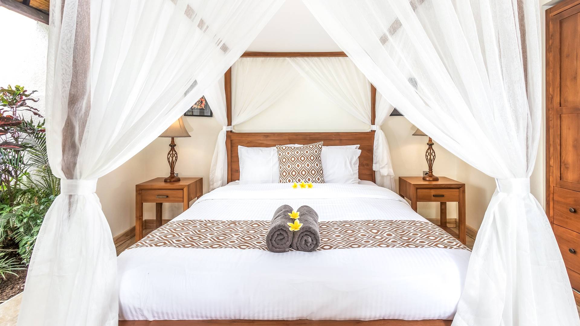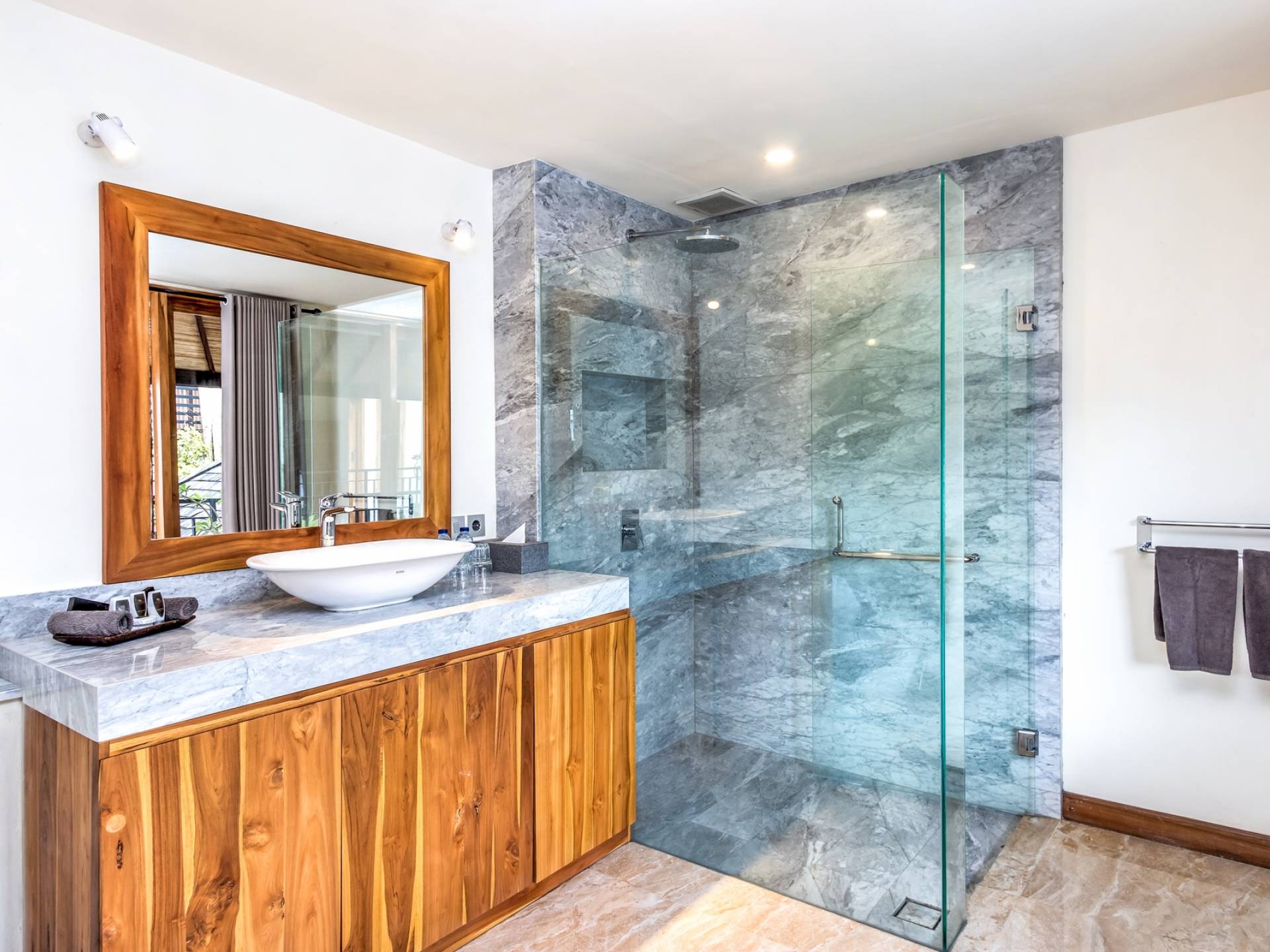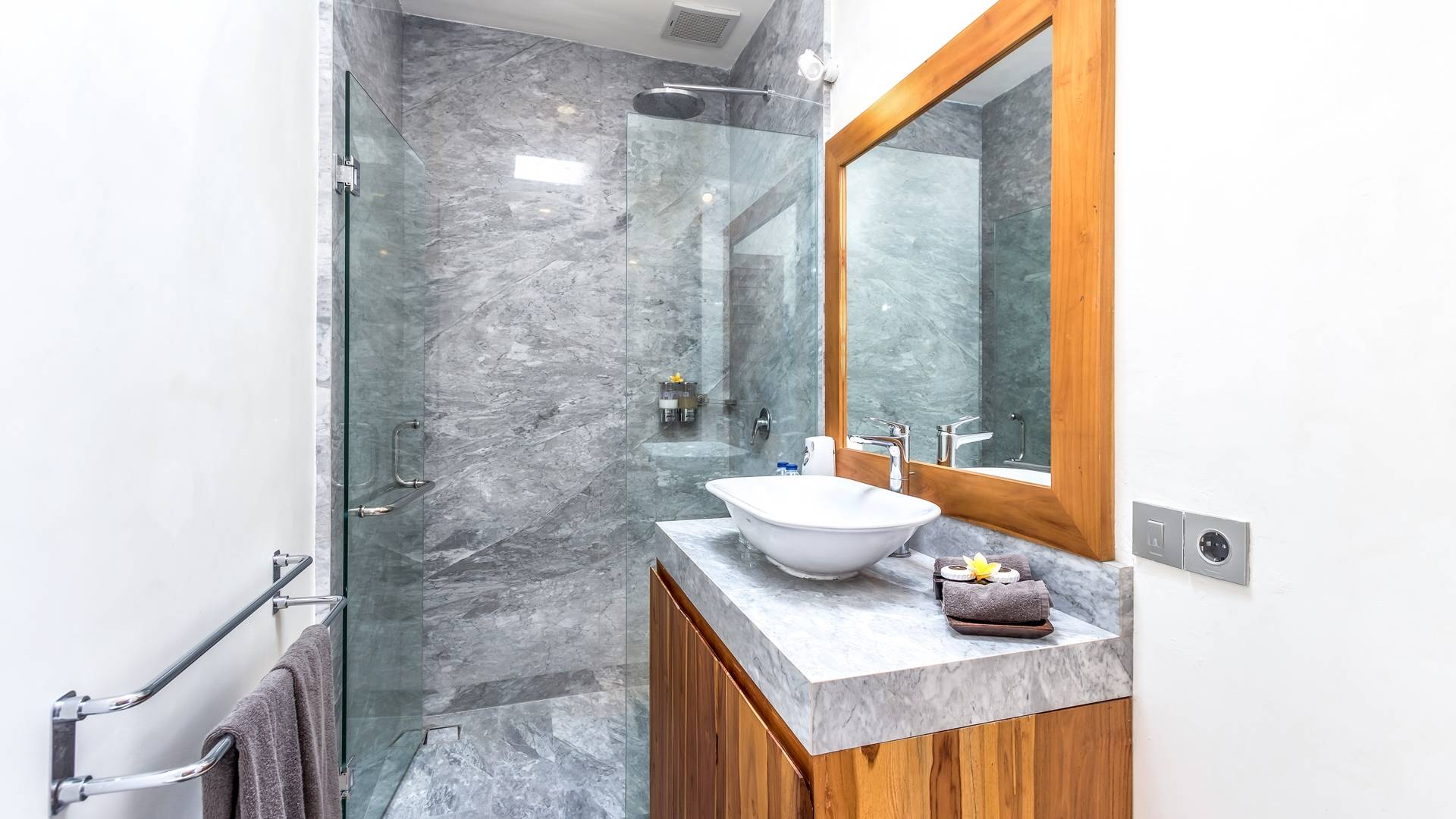 В 2 гостевых спальнях также есть роскошные двуспальные кровати и ванные комнаты. Одна расположена у бассейна и ведет прямо на деревянную террасу, а вторая гостевая спальня находится на втором этаже. Вилла предлагает уединение для каждой спальни, оставаясь интимной собственностью.