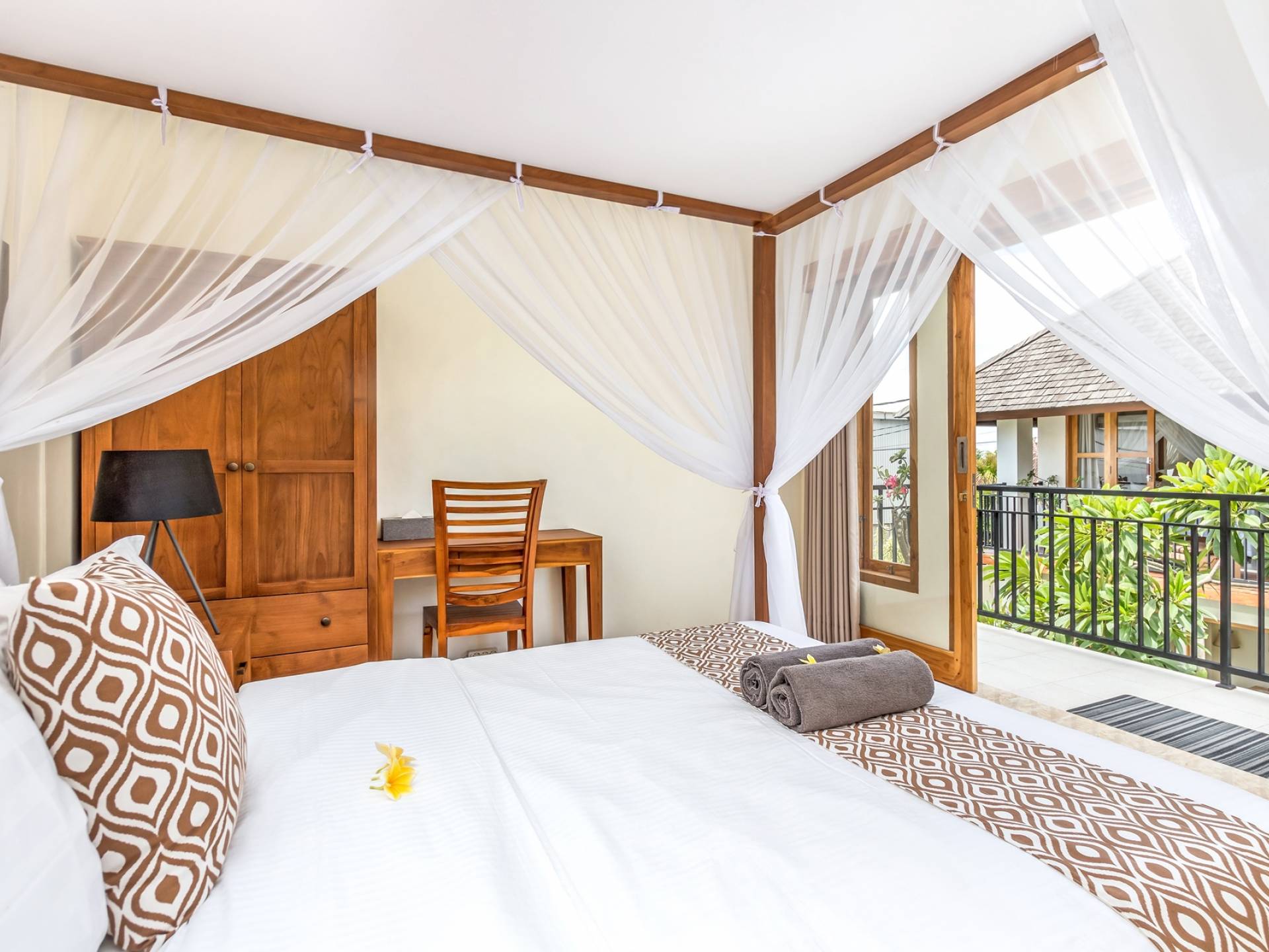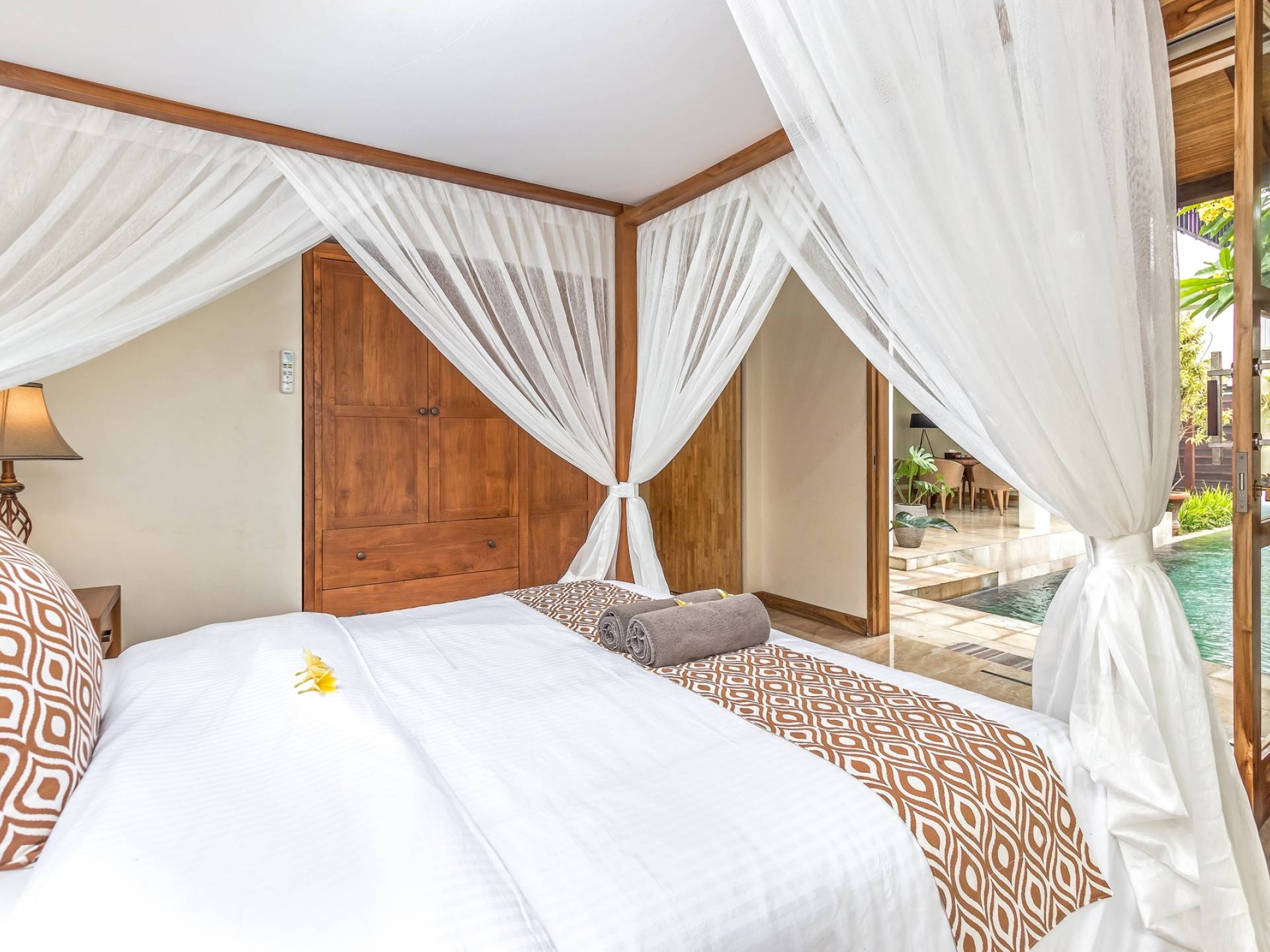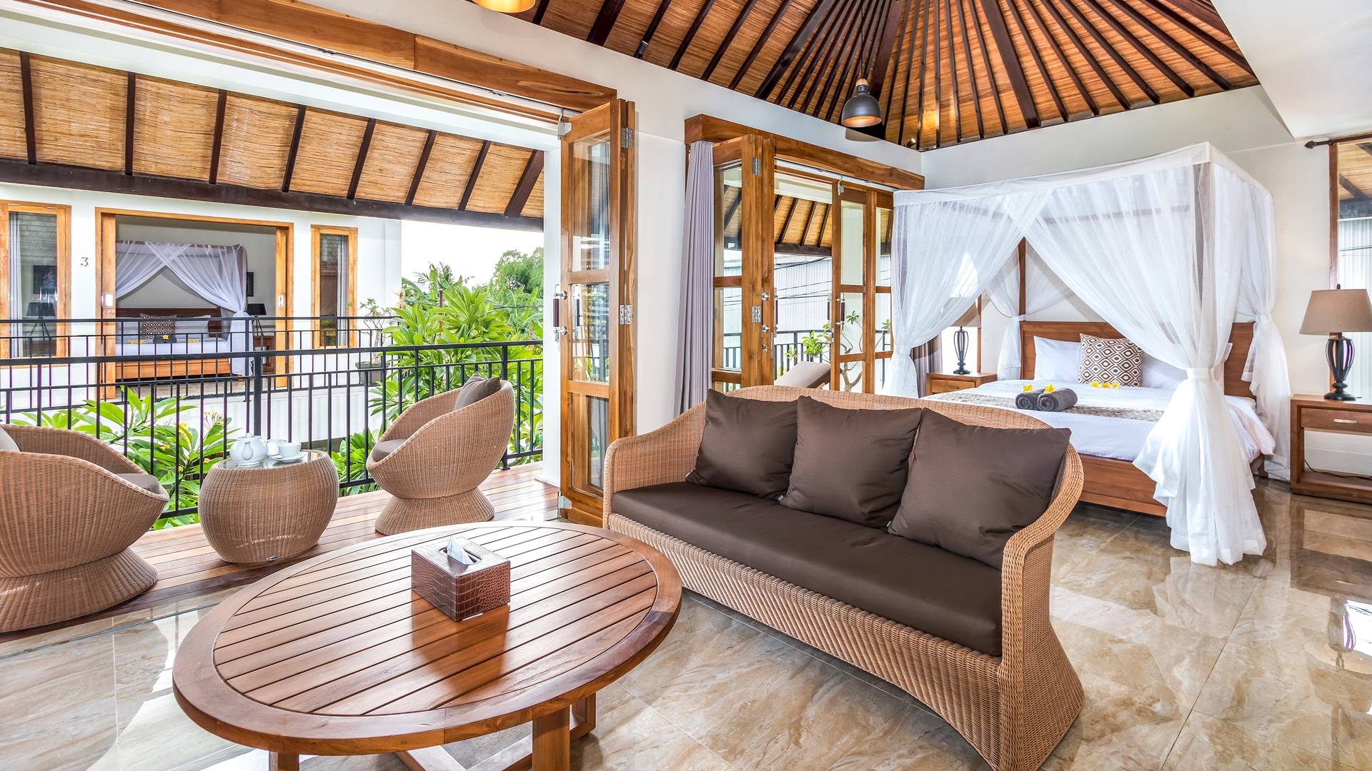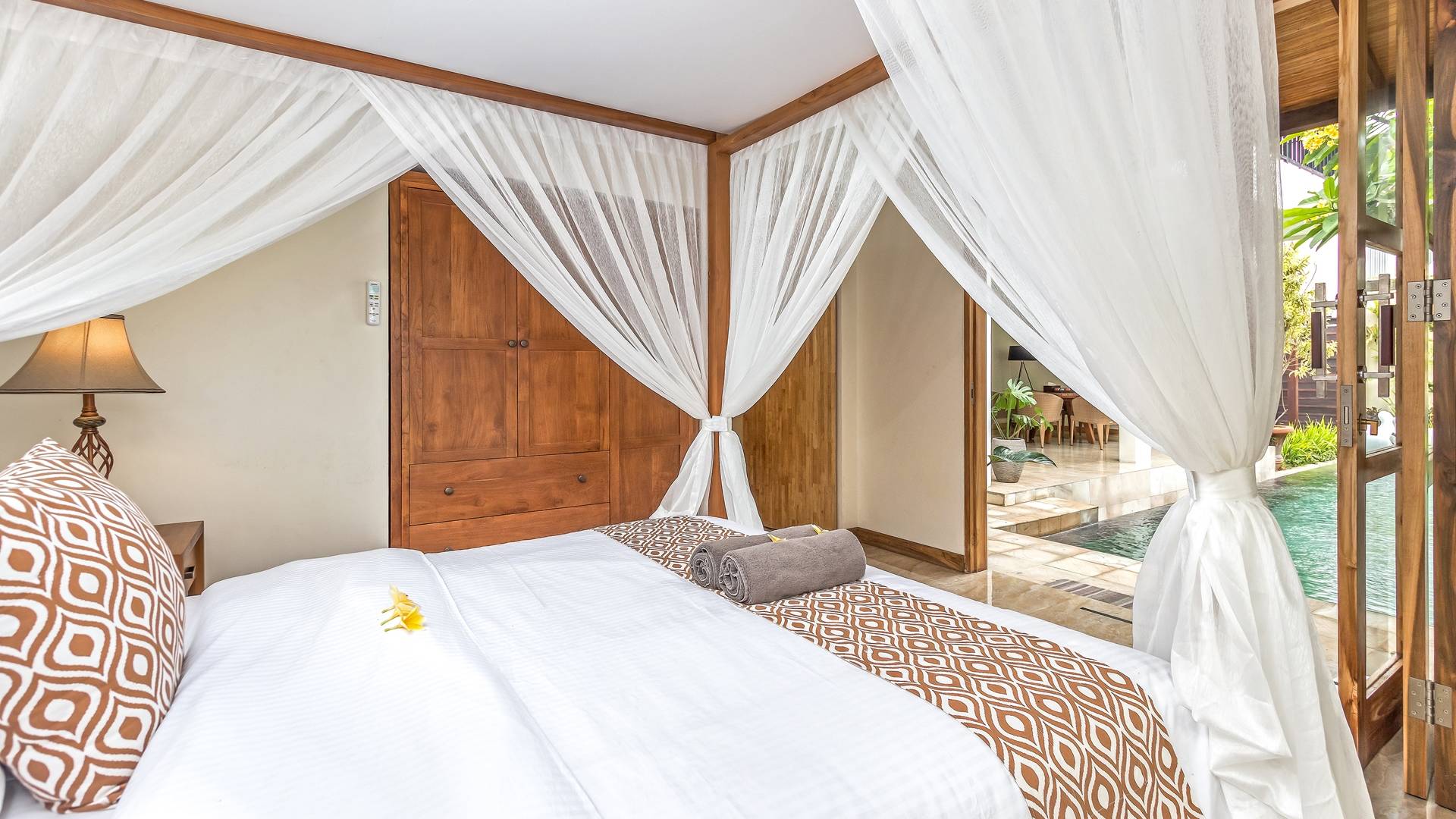 Главная спальня на вилле Amrina расположена на втором этаже и предлагает просторную комнату с большой двуспальной кроватью, отдельной гостиной и ванной комнатой. Раздвижные двери патио ведут на огромный балкон с видом на бассейн и сады. Высокие потолки с балками создают воздушную атмосферу, обеспечивая комфорт для спокойного ночного сна. В собственной ванной комнате есть большой тропический душ, большое зеркало и современные удобства. Идеально подходит для романтического уединения.