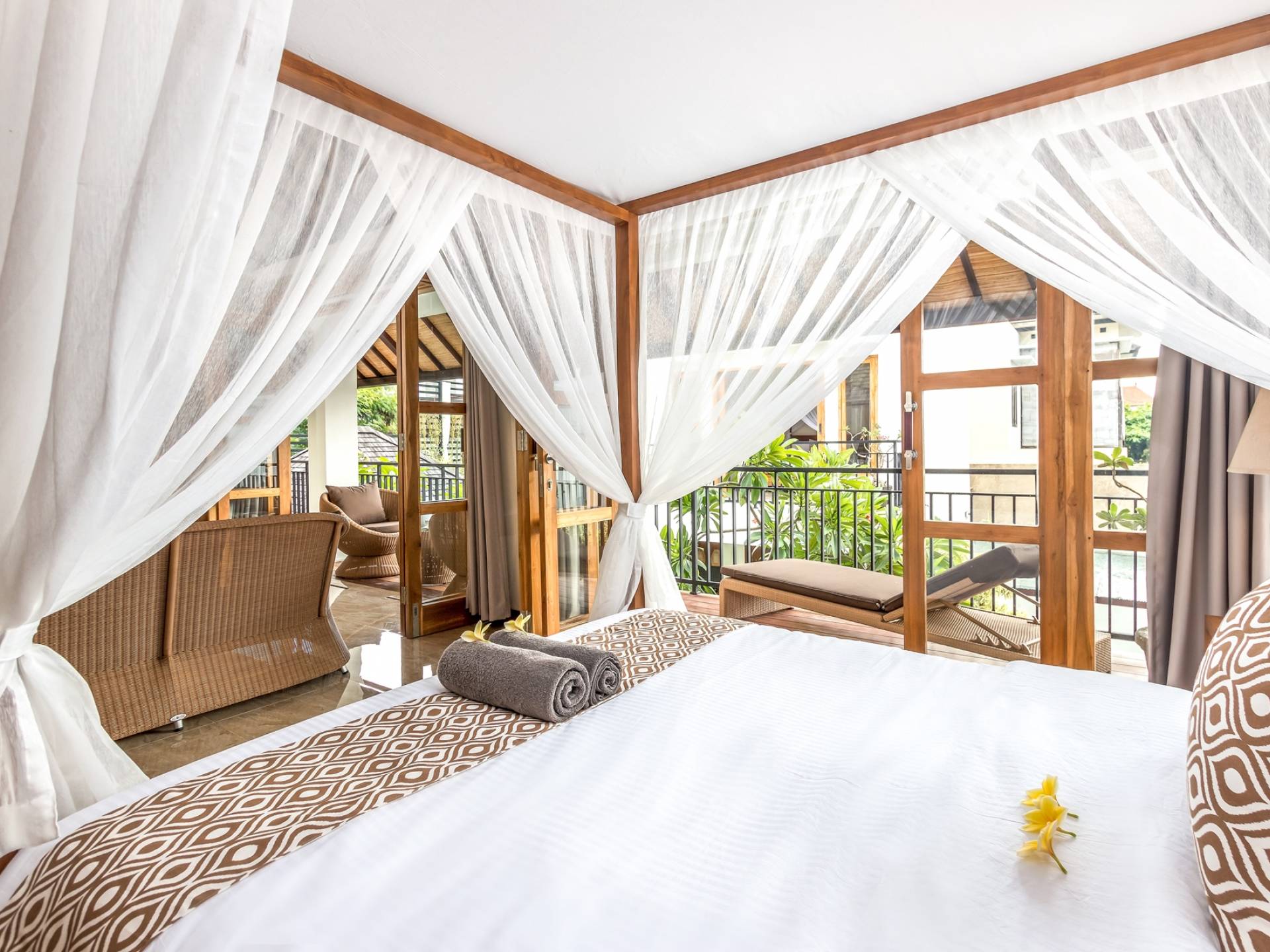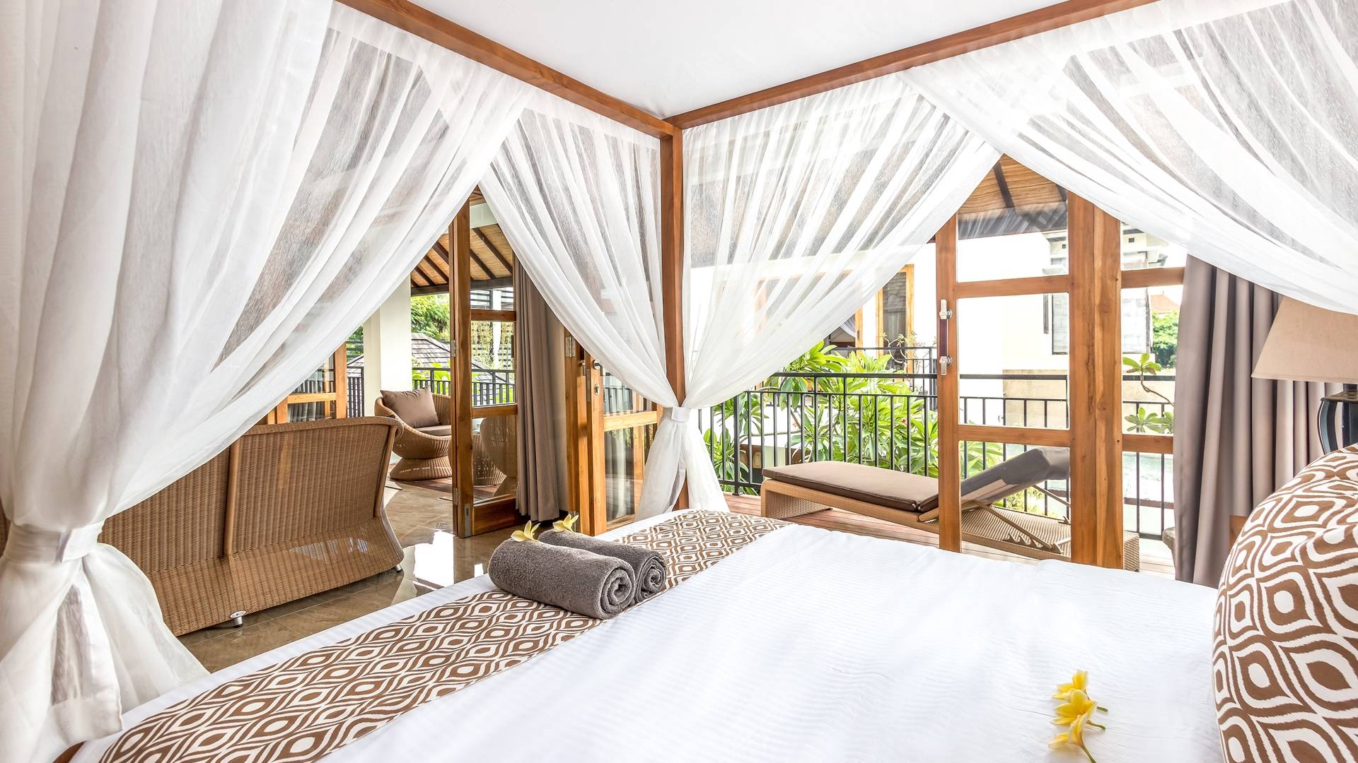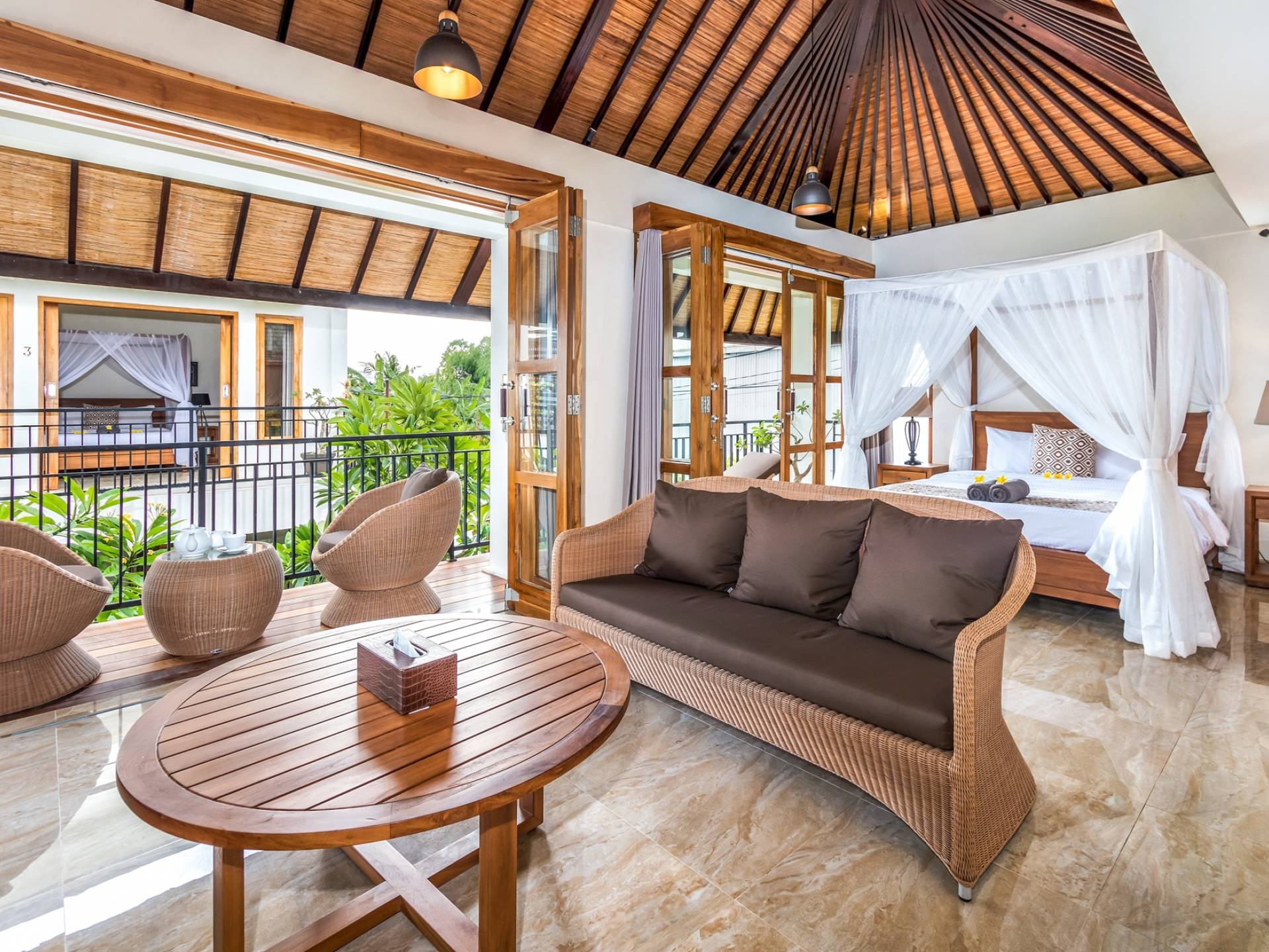 Главная спальня на вилле Amrina расположена на втором этаже и предлагает просторную комнату с большой двуспальной кроватью, отдельной гостиной и ванной комнатой. Раздвижные двери патио ведут на огромный балкон с видом на бассейн и сады. Высокие потолки с балками создают воздушную атмосферу, обеспечивая комфорт для спокойного ночного сна. В собственной ванной комнате есть большой тропический душ, большое зеркало и современные удобства. Идеально подходит для романтического уединения.