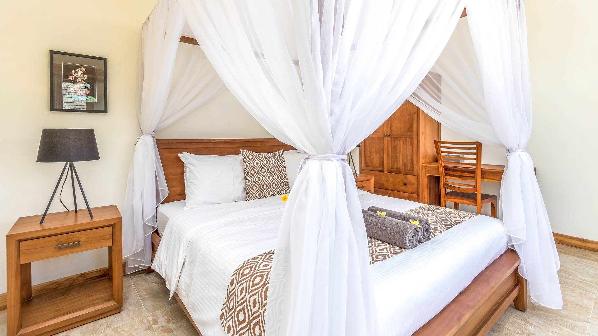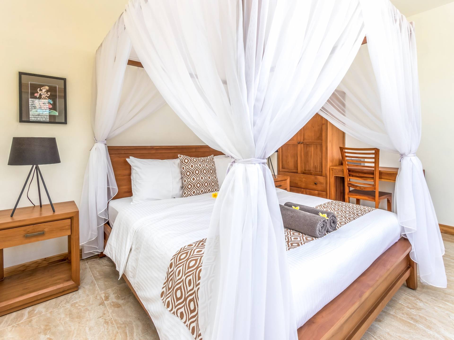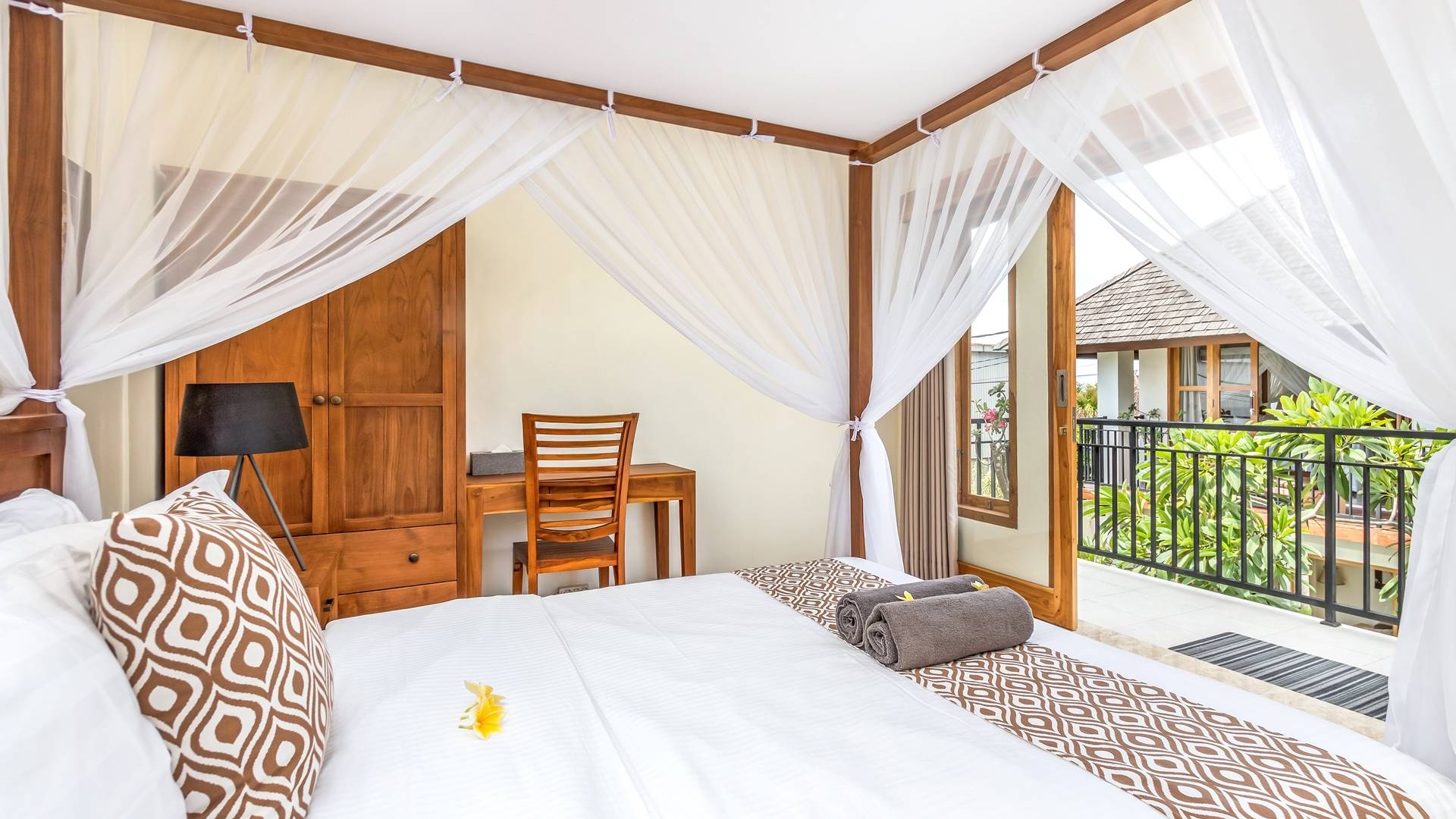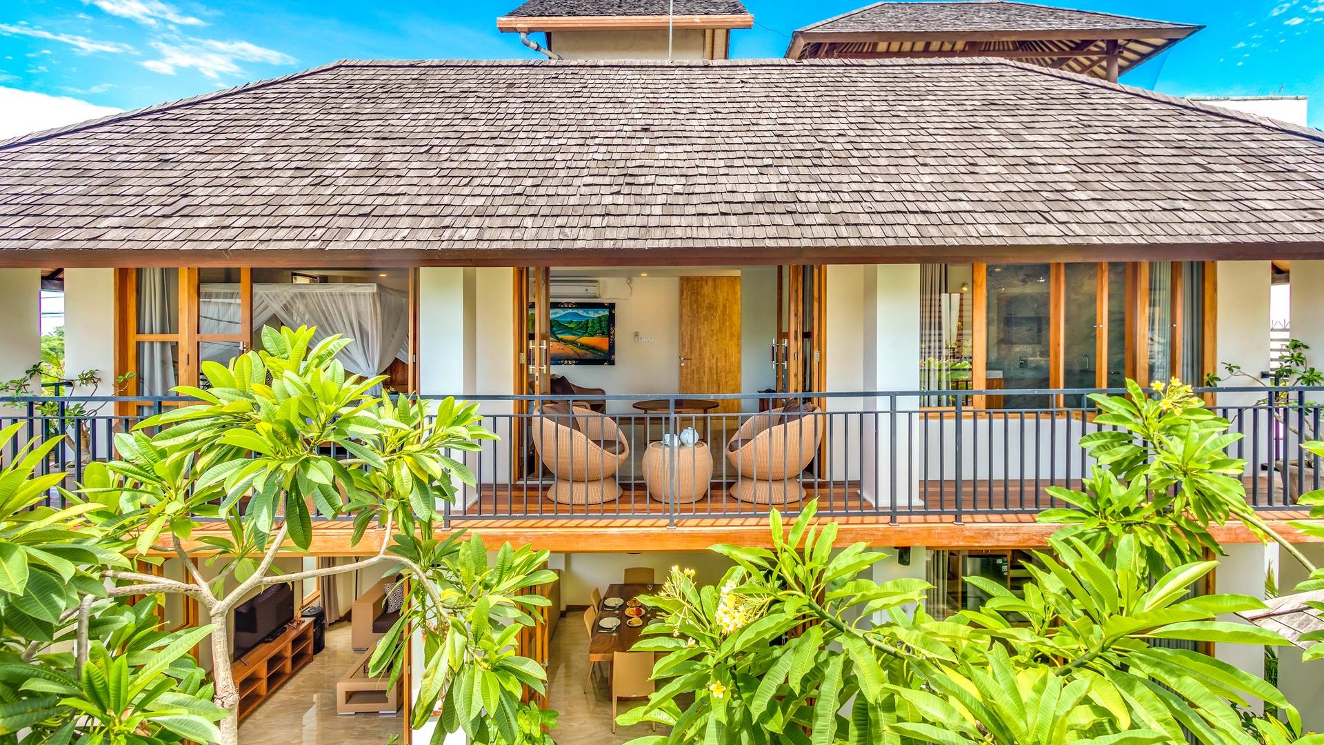 Главная спальня на вилле Amrina расположена на втором этаже и предлагает просторную комнату с большой двуспальной кроватью, отдельной гостиной и ванной комнатой. Раздвижные двери патио ведут на огромный балкон с видом на бассейн и сады. Высокие потолки с балками создают воздушную атмосферу, обеспечивая комфорт для спокойного ночного сна. В собственной ванной комнате есть большой тропический душ, большое зеркало и современные удобства. Идеально подходит для романтического уединения.