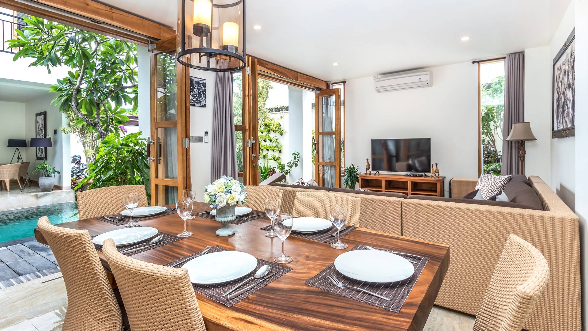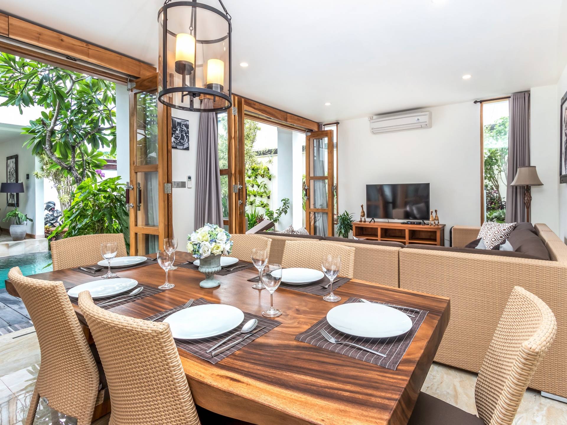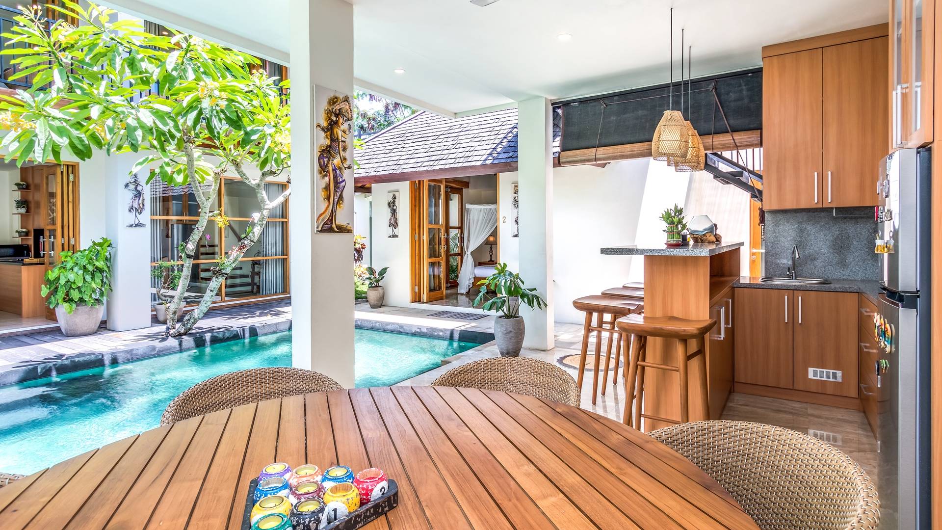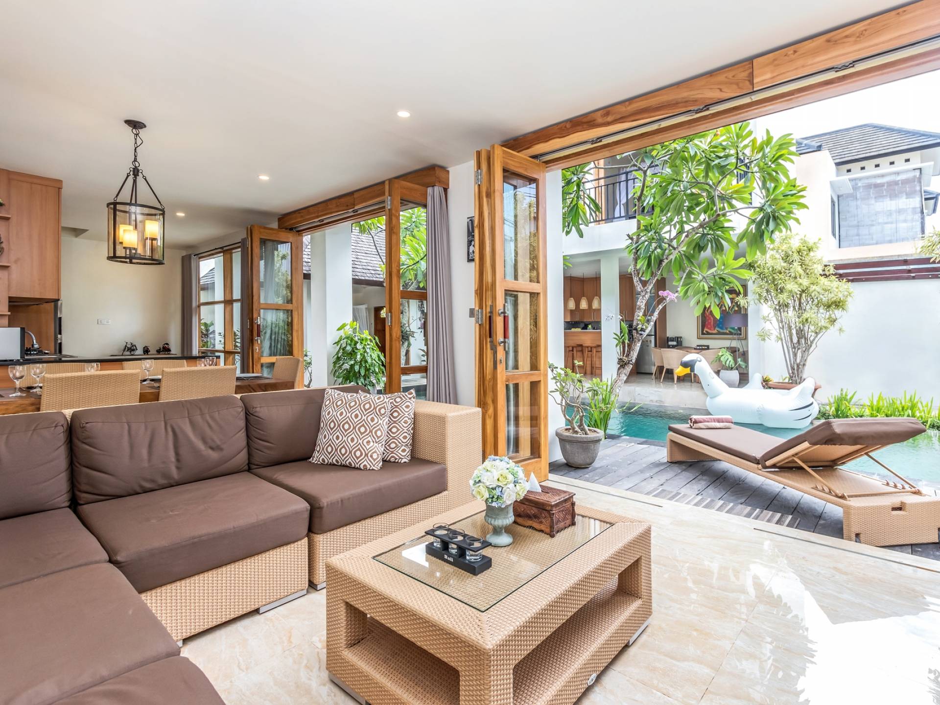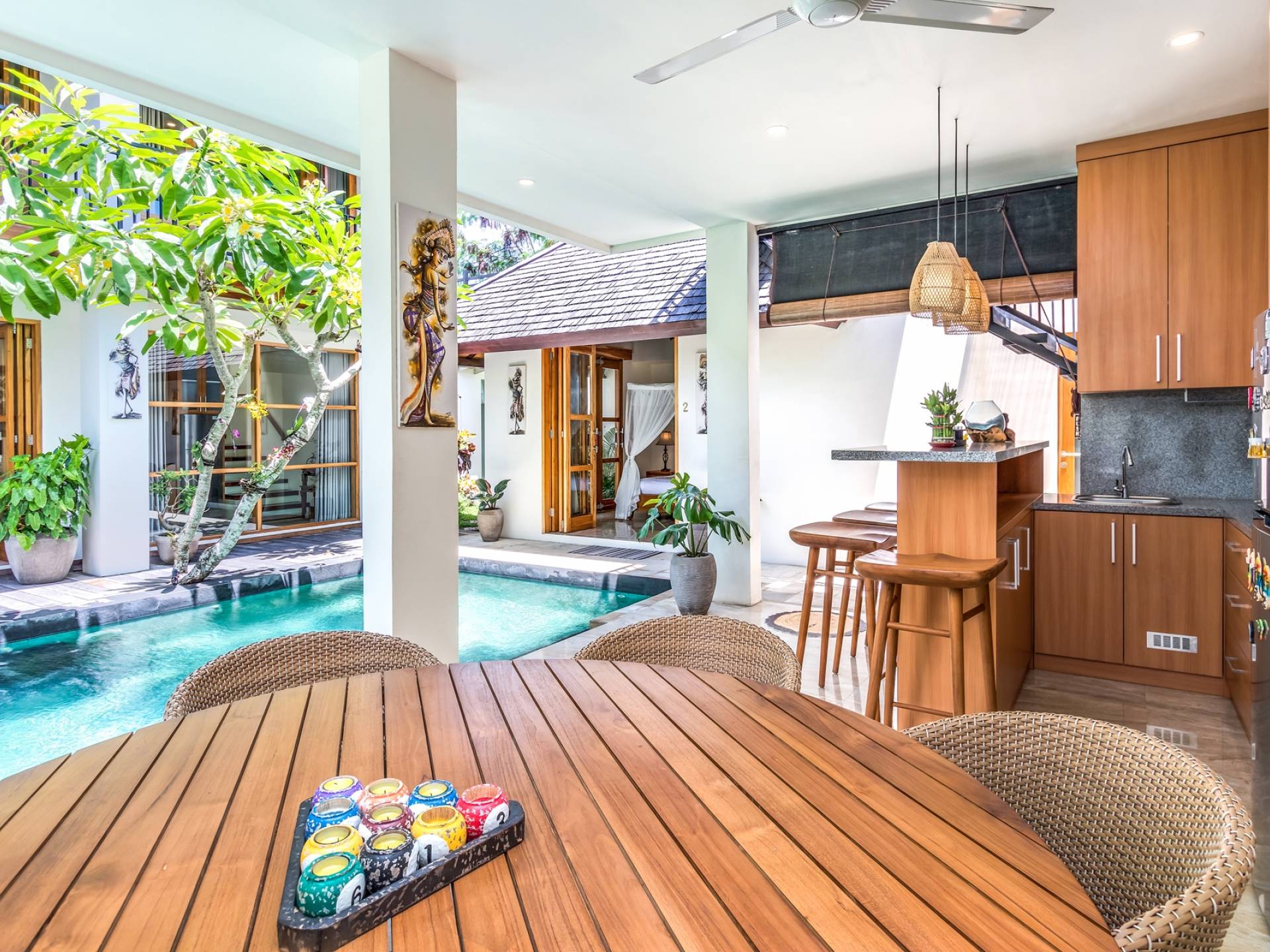 Вилла Amrina может похвастаться закрытой гостиной и столовой, а также второй полностью оборудованной кухней. Идеально подходит для приготовления вкусных блюд в помещении с кондиционером. Вы можете с комфортом поужинать за большим обеденным столом. Гостиная оборудована удобными диванами и современной развлекательной системой для спокойной ночи и отдыха после долгого дня приключений на острове.