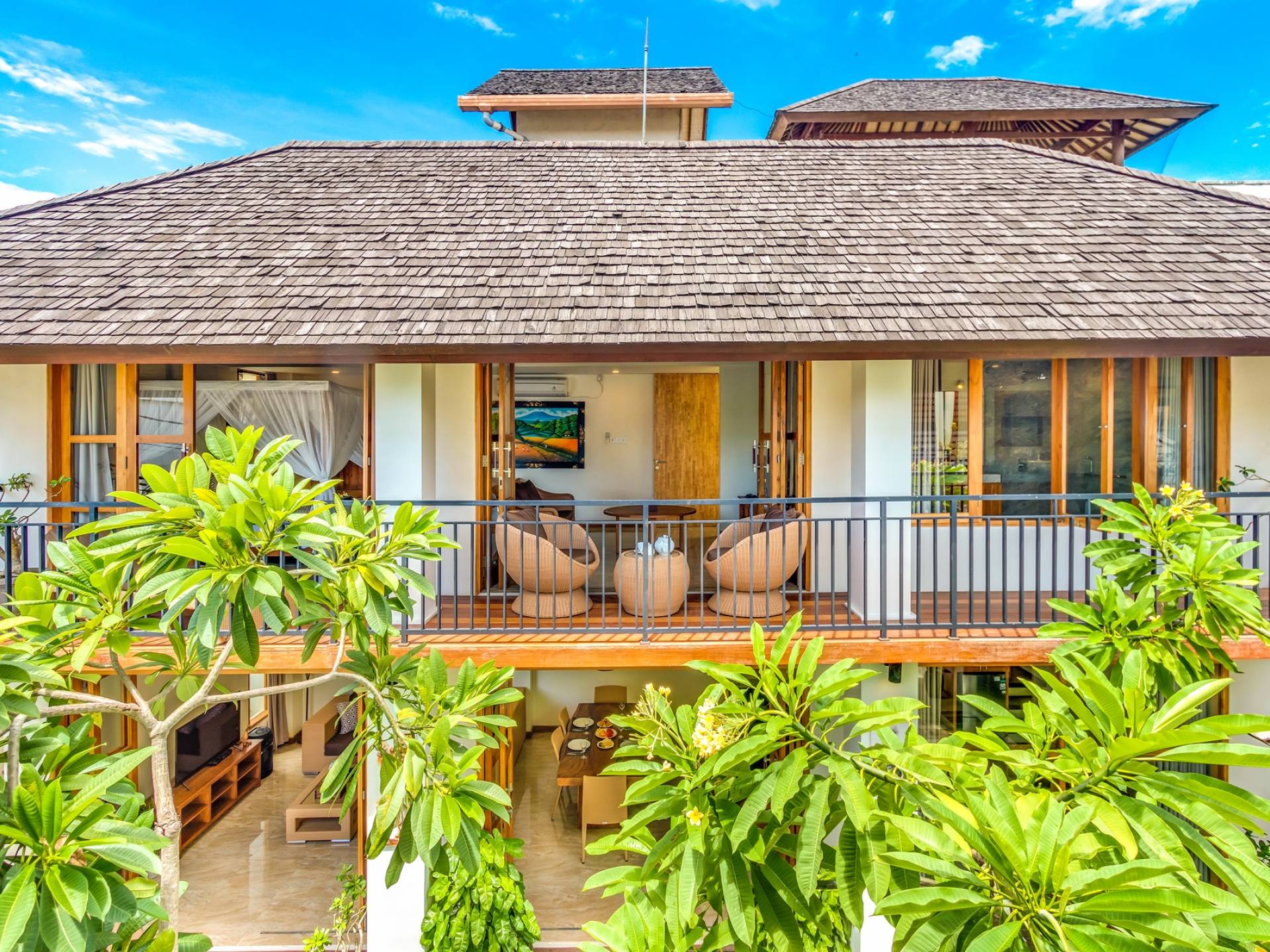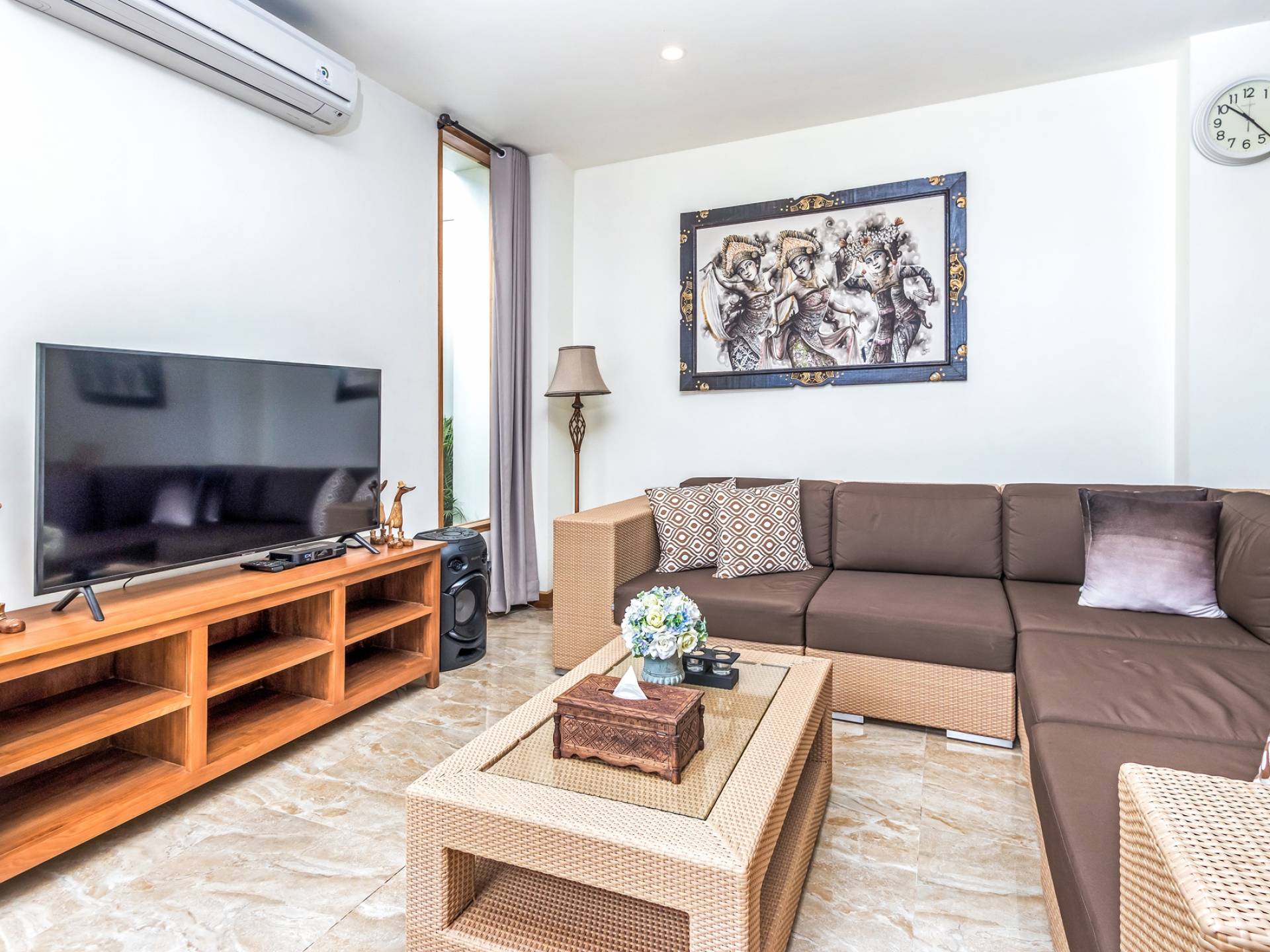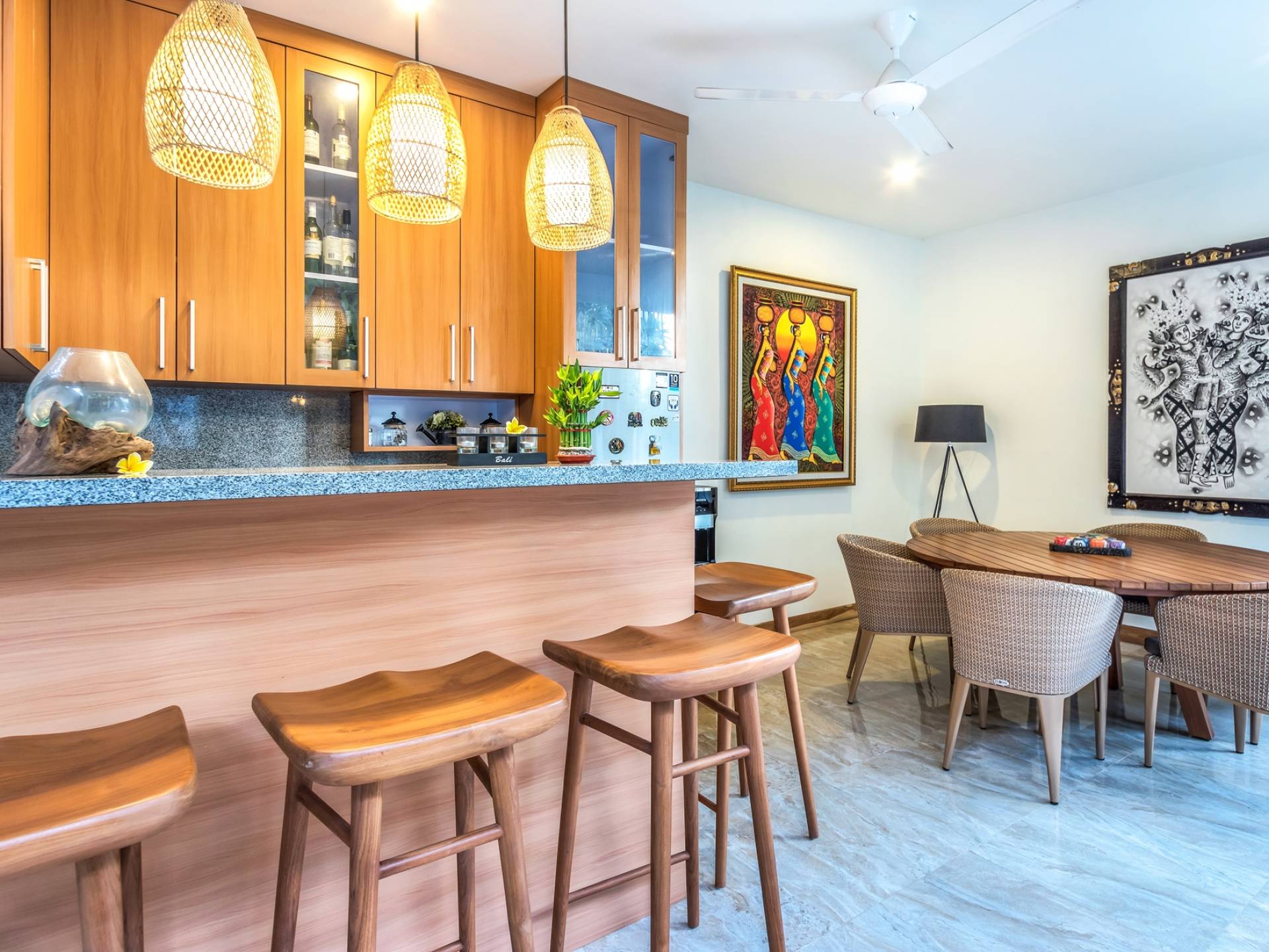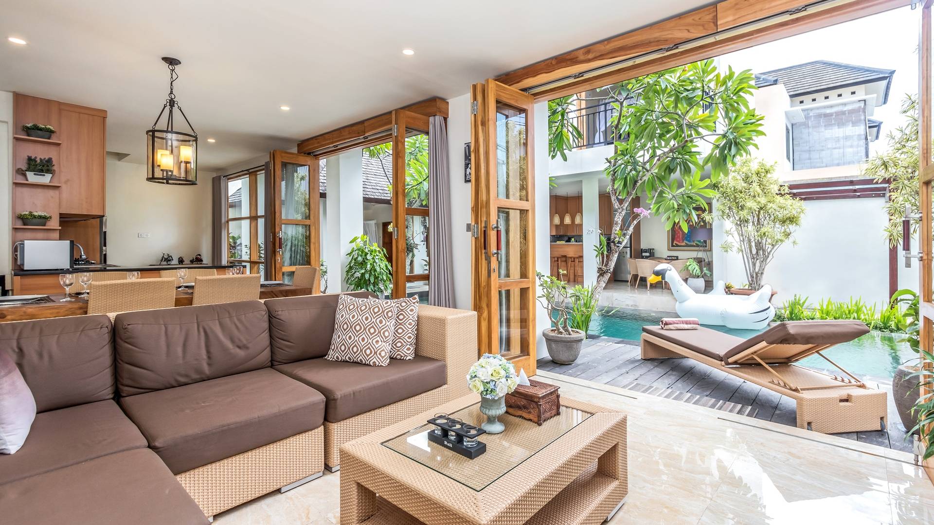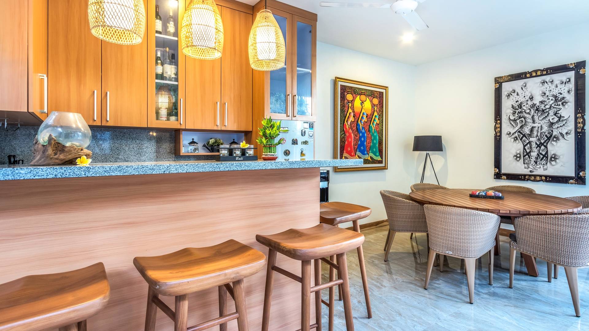 Вилла Amrina может похвастаться закрытой гостиной и столовой, а также второй полностью оборудованной кухней. Идеально подходит для приготовления вкусных блюд в помещении с кондиционером. Вы можете с комфортом поужинать за большим обеденным столом. Гостиная оборудована удобными диванами и современной развлекательной системой для спокойной ночи и отдыха после долгого дня приключений на острове.