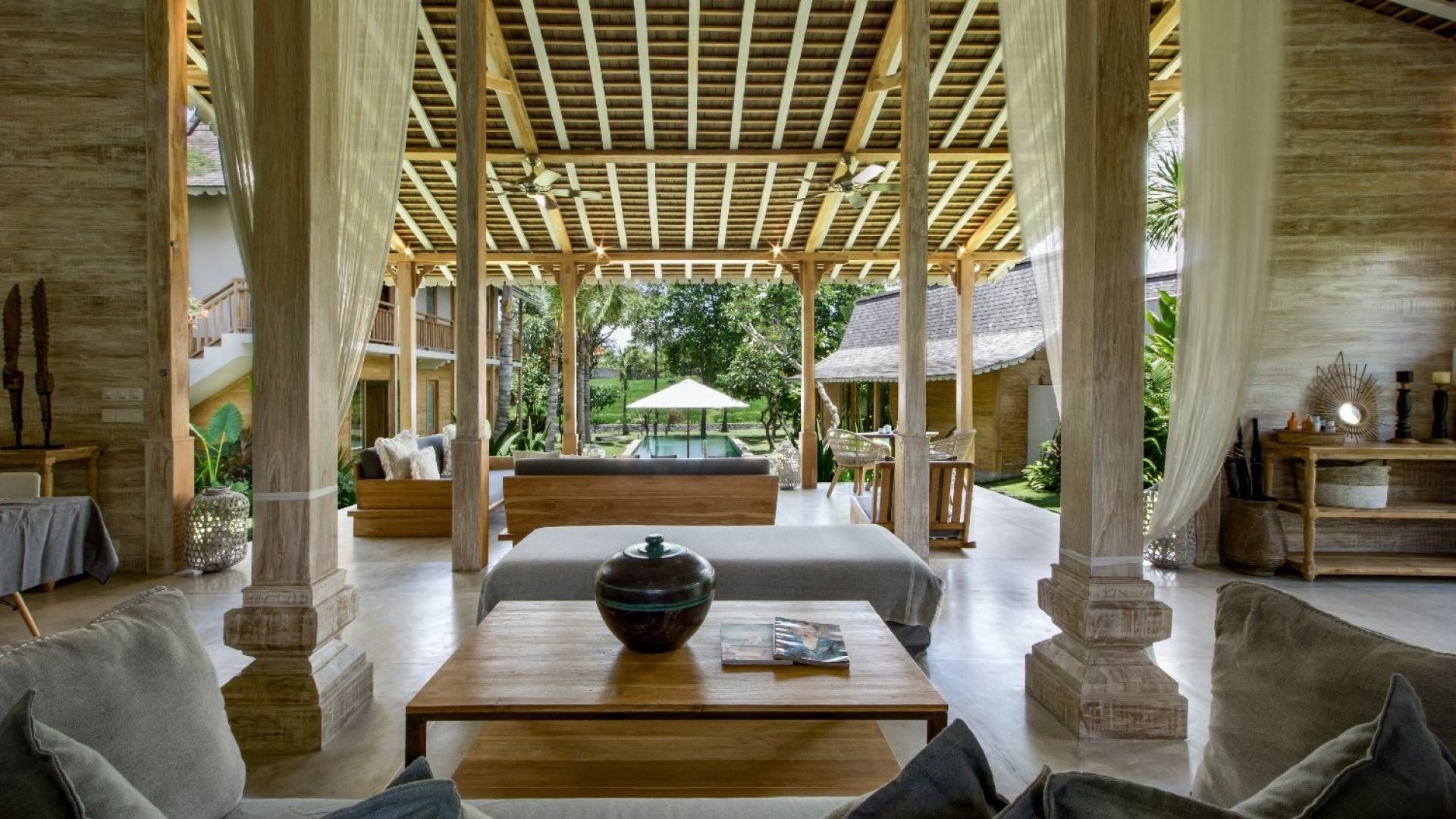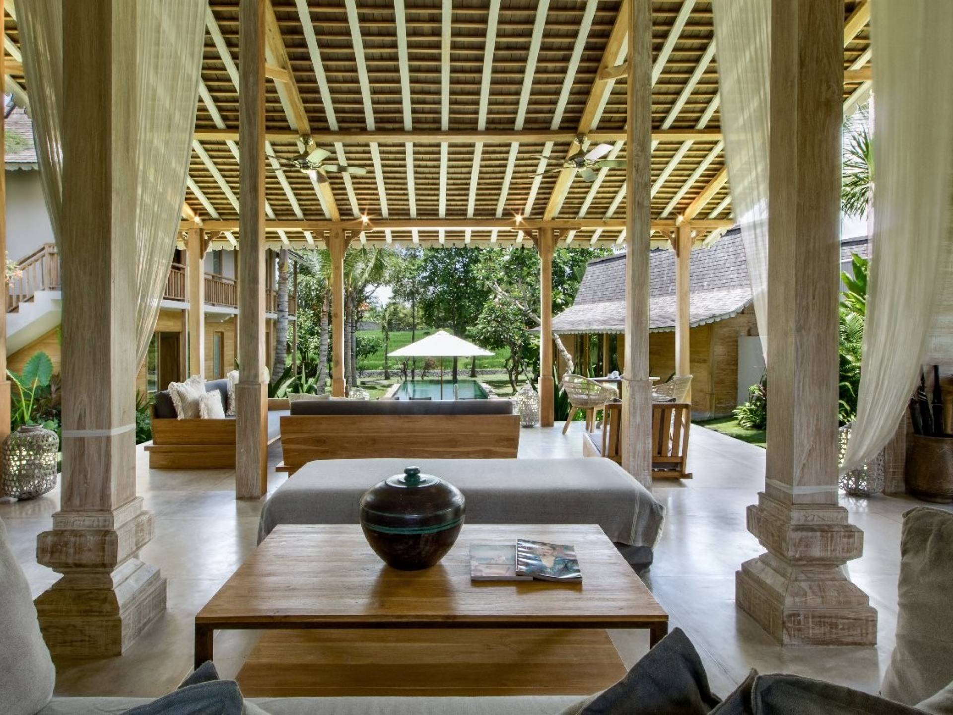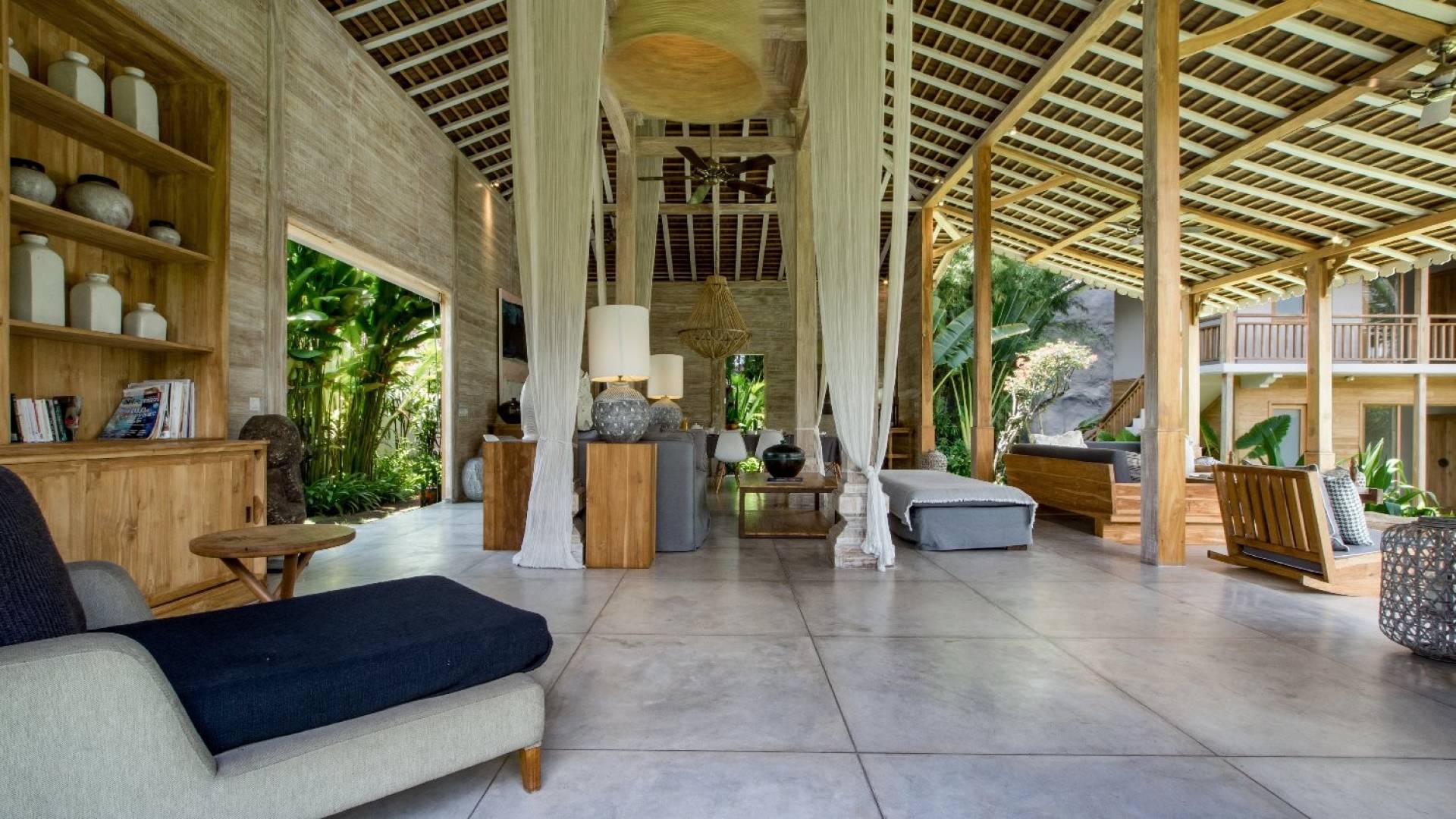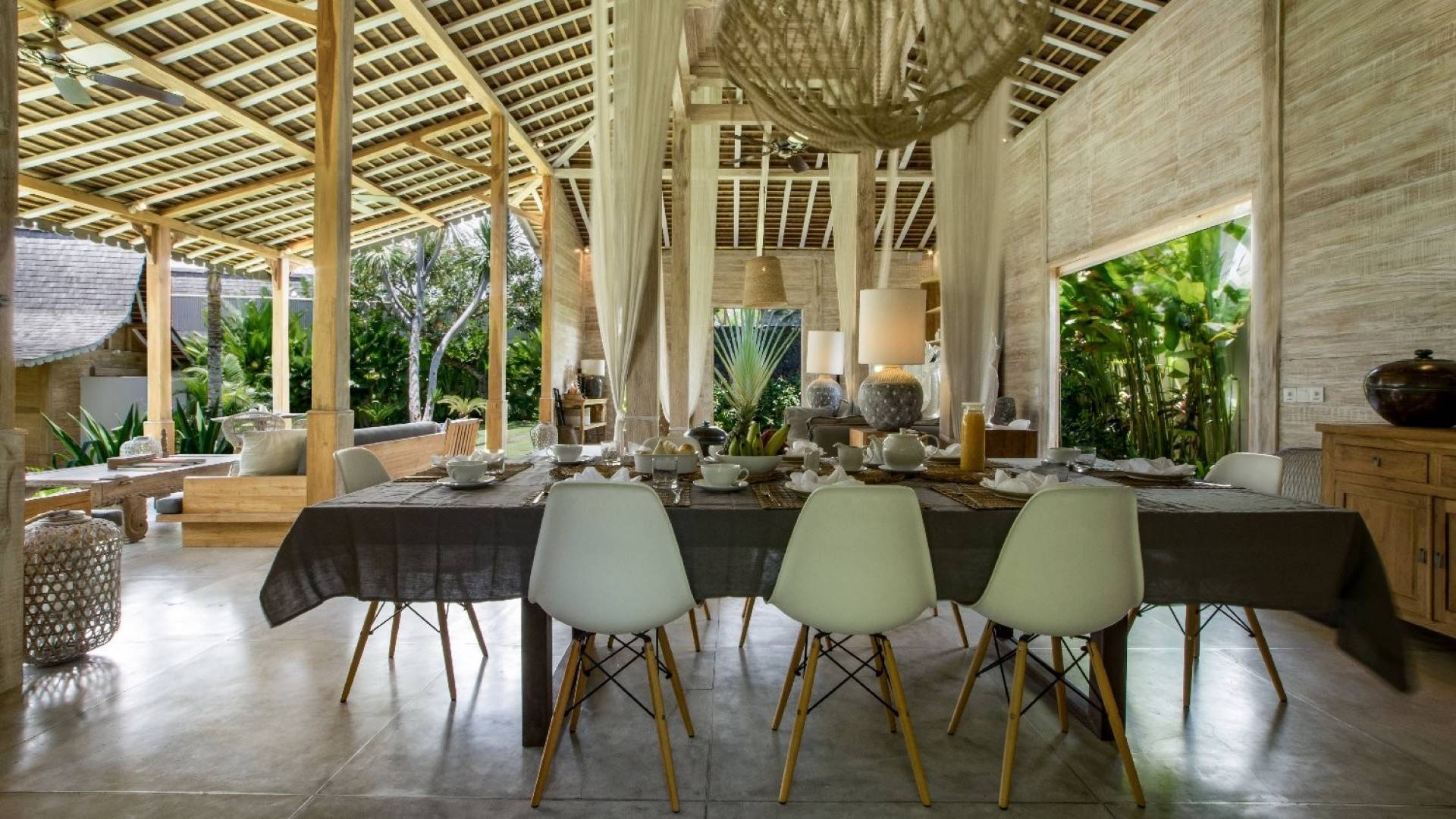 Под высокой парящей крышей Joglo, откуда ваше внимание привлекает величественная люстра, интерьер этой высокой гостиной элегантен и прост в использовании с полированным серым мраморным полом, мебелью из тикового дерева ручной работы и интригующими традиционными произведениями искусства. В качестве альтернативы есть красиво украшенные традиционные балийские кушетки для дневного отдыха и большие плюшевые диваны, где можно свернуться калачиком с книгой. В деревянных шкафах представлен широкий выбор книг. Для прекрасных общих ужинов есть большой стол из тикового дерева с десятью умными стульями, чтобы по вечерам вкусно поесть и поговорить в волшебной атмосфере, создаваемой светом люстры.