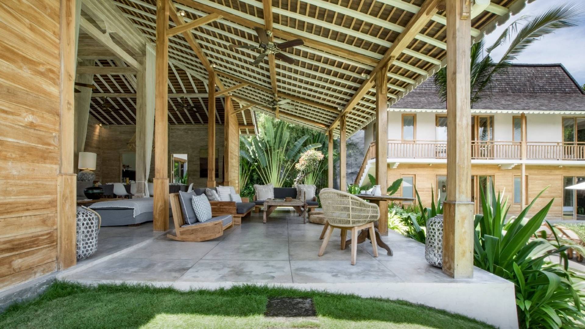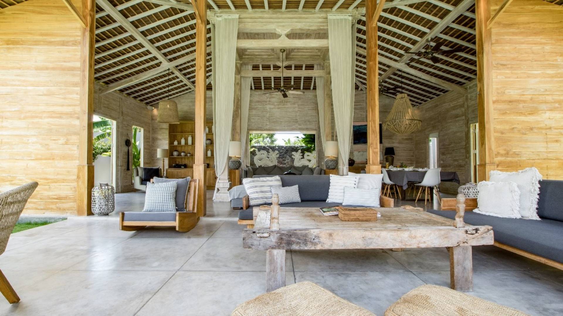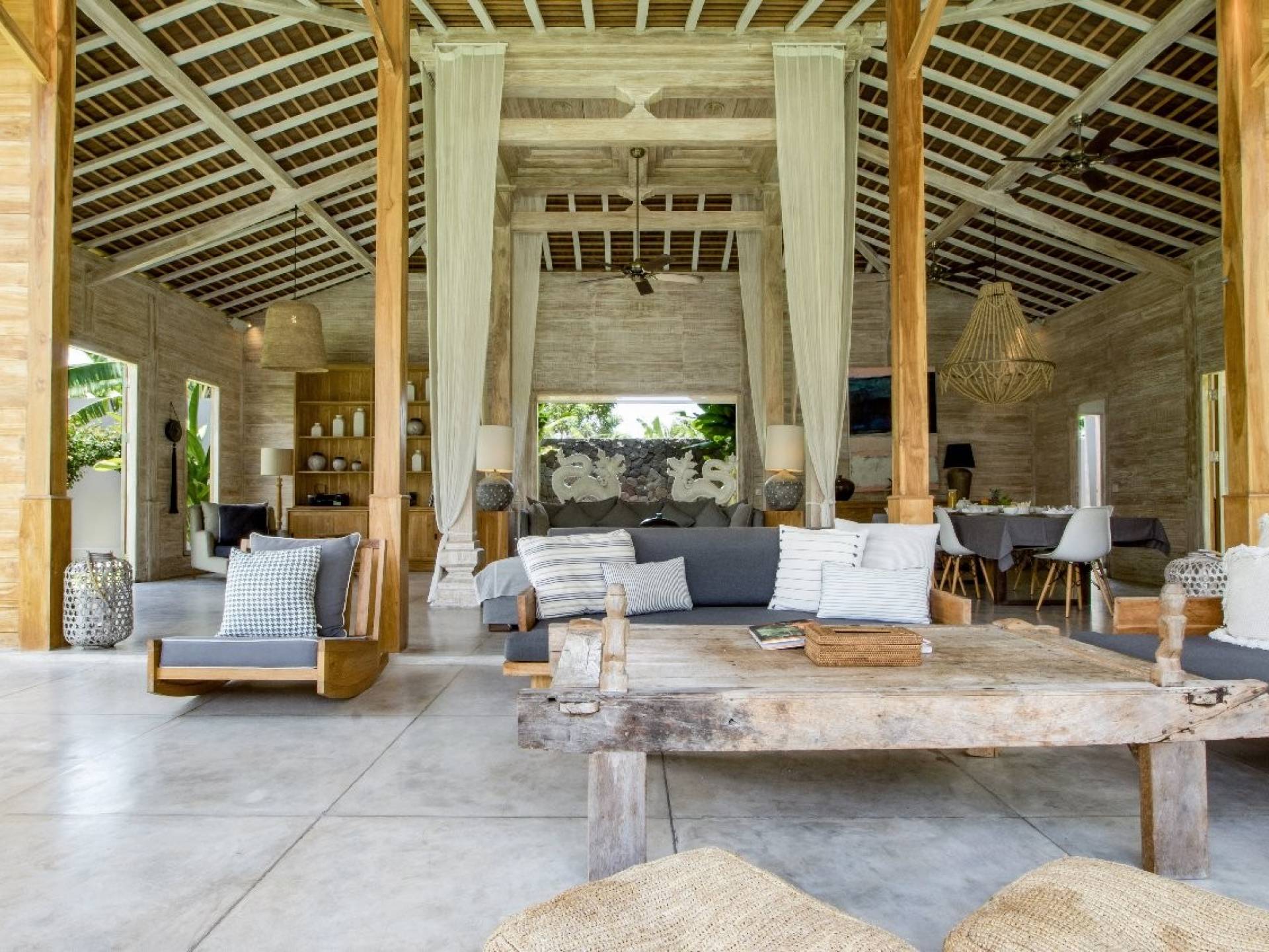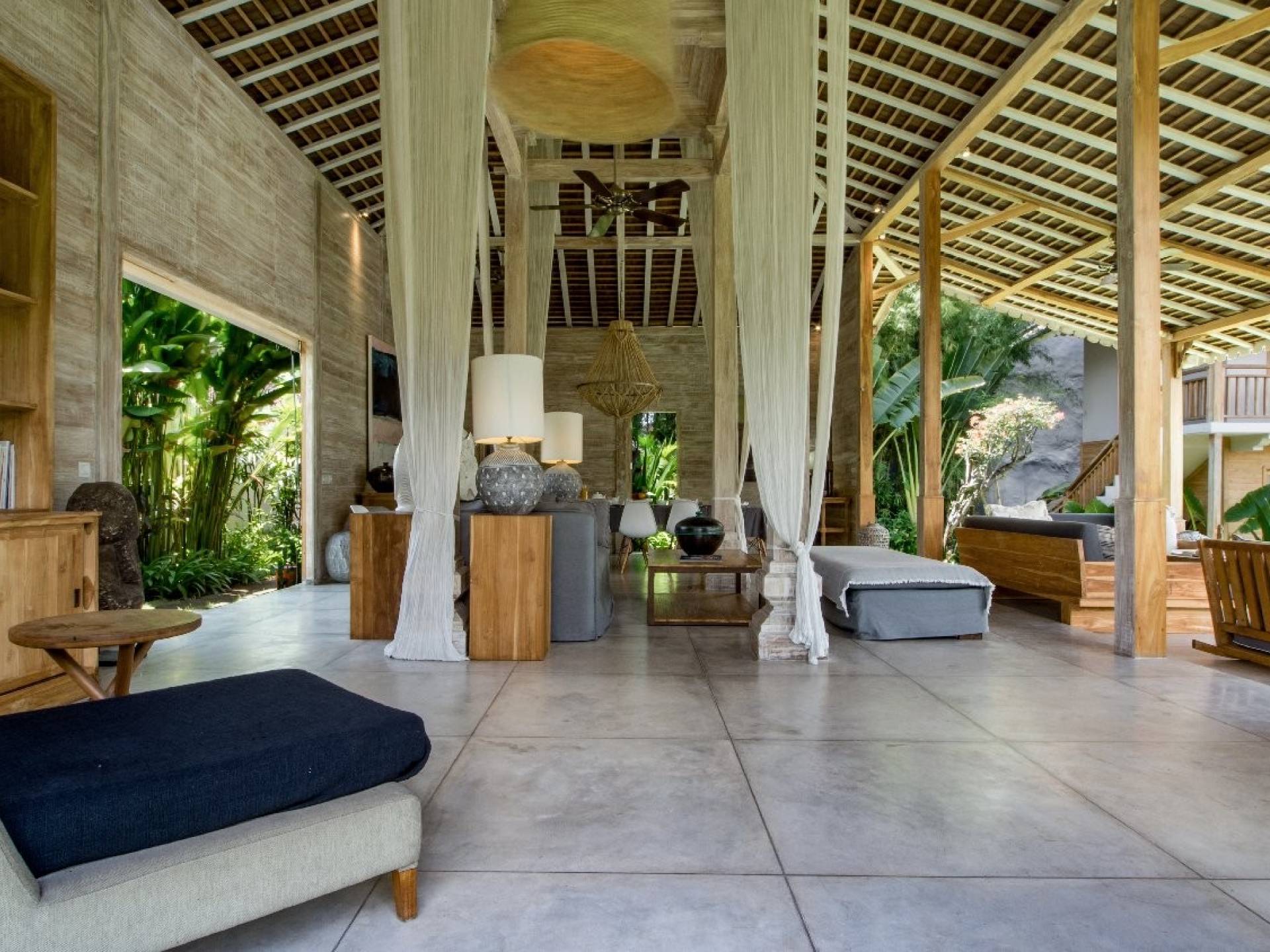 Под высокой парящей крышей Joglo, откуда ваше внимание привлекает величественная люстра, интерьер этой высокой гостиной элегантен и прост в использовании с полированным серым мраморным полом, мебелью из тикового дерева ручной работы и интригующими традиционными произведениями искусства. В качестве альтернативы есть красиво украшенные традиционные балийские кушетки для дневного отдыха и большие плюшевые диваны, где можно свернуться калачиком с книгой. В деревянных шкафах представлен широкий выбор книг. Для прекрасных общих ужинов есть большой стол из тикового дерева с десятью умными стульями, чтобы по вечерам вкусно поесть и поговорить в волшебной атмосфере, создаваемой светом люстры.