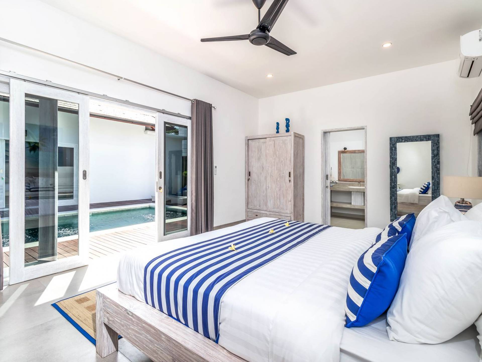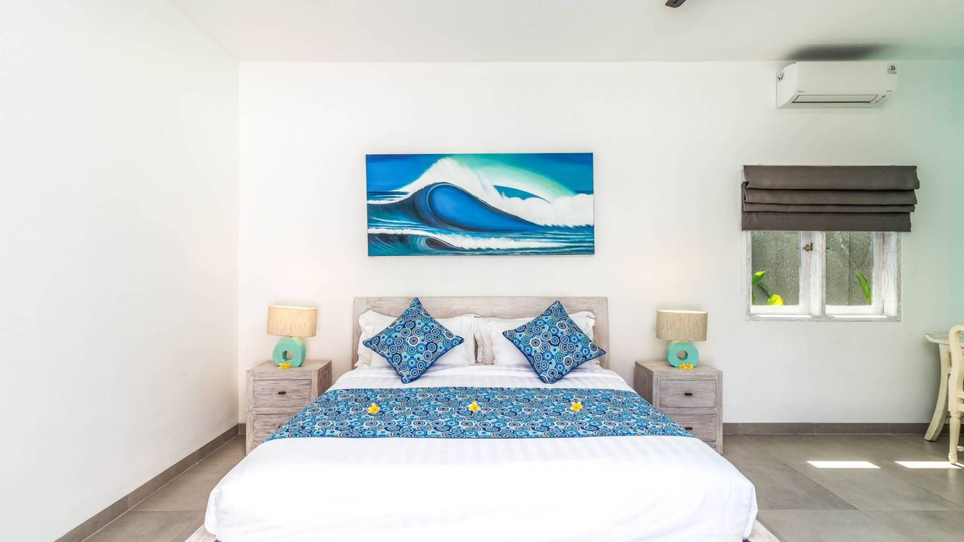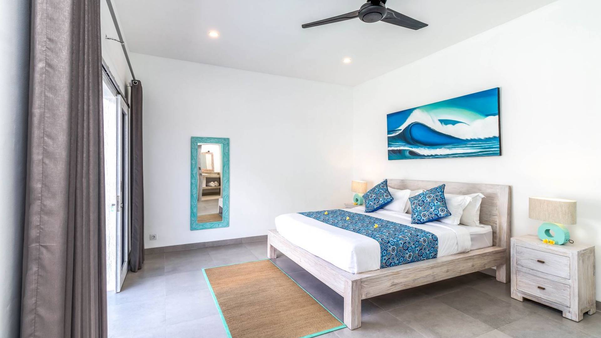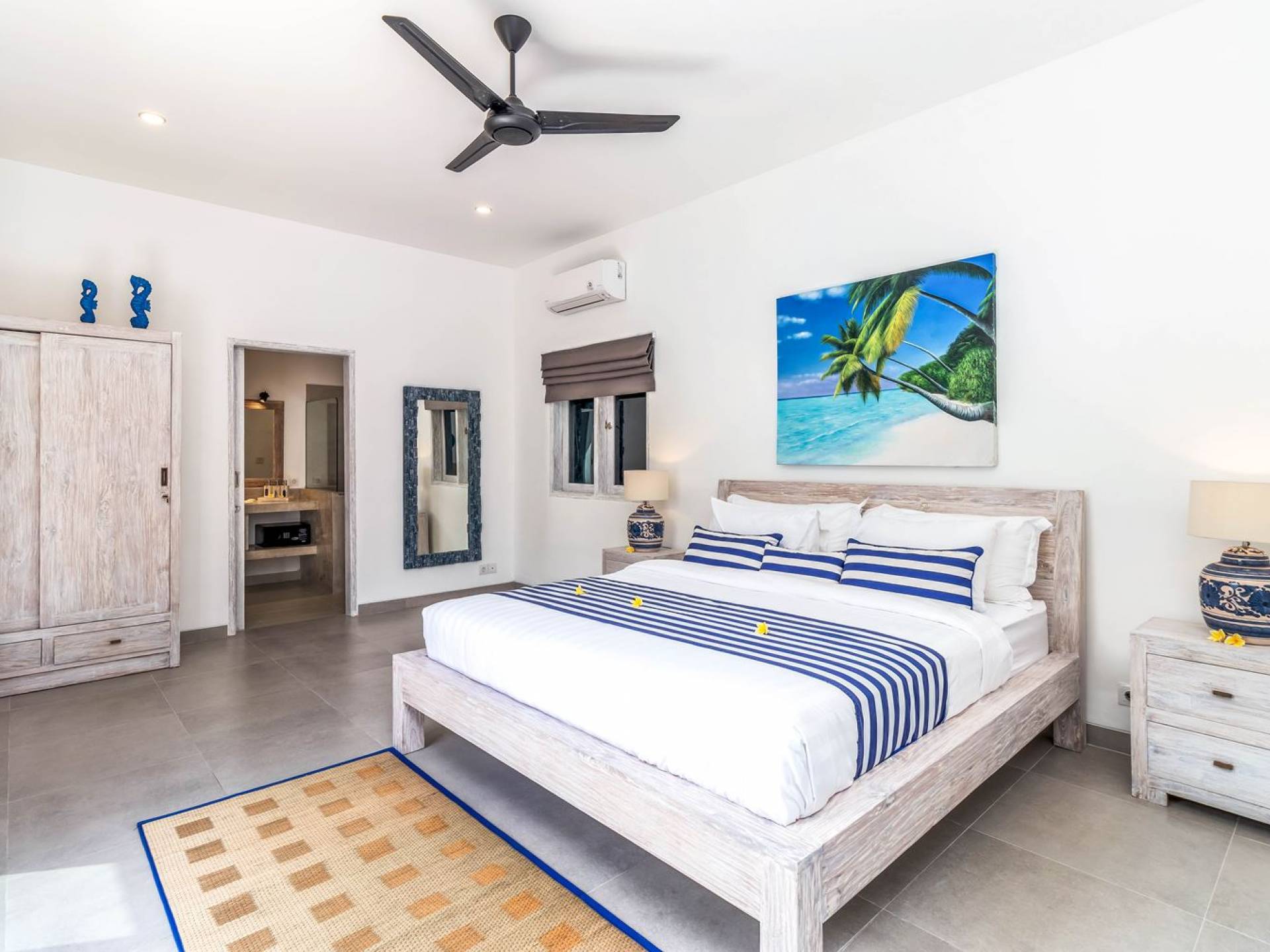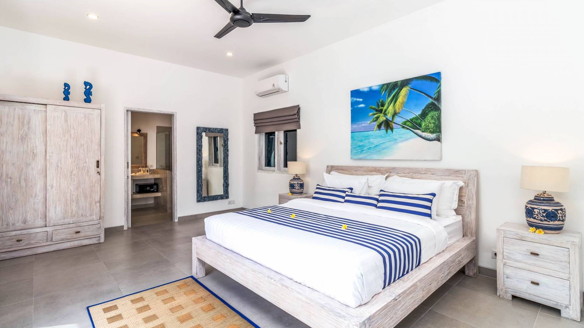 3 спальни расположены вокруг бассейна со стеклянными дверями, которые открываются на открытую площадку, где вы можете прыгнуть прямо в бассейн. Каждый номер оснащен кондиционером и индивидуально оформлен в элегантном тропическом стиле. Что у них общего, так это синий цвет, пропитанный декоративными элементами и другими деталями. В каждом номере есть большая и удобная кровать размера "queen-size" для сна, есть шкафы из побеленного дерева, в которые можно положить одежду и самые ценные вещи, во всех номерах есть сейф. Просторные ванные комнаты оборудованы тропическим душем, ручным душем, умывальником и туалетом. 2 спальни соединены между собой, что отлично подходит для семей, желающих оставаться рядом со своими детьми.