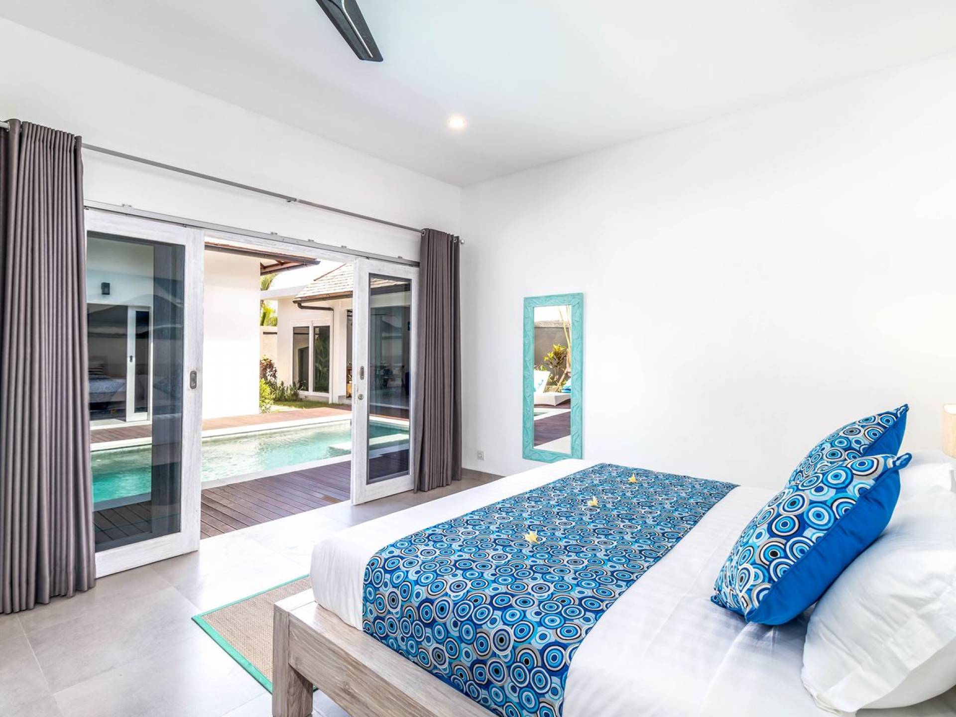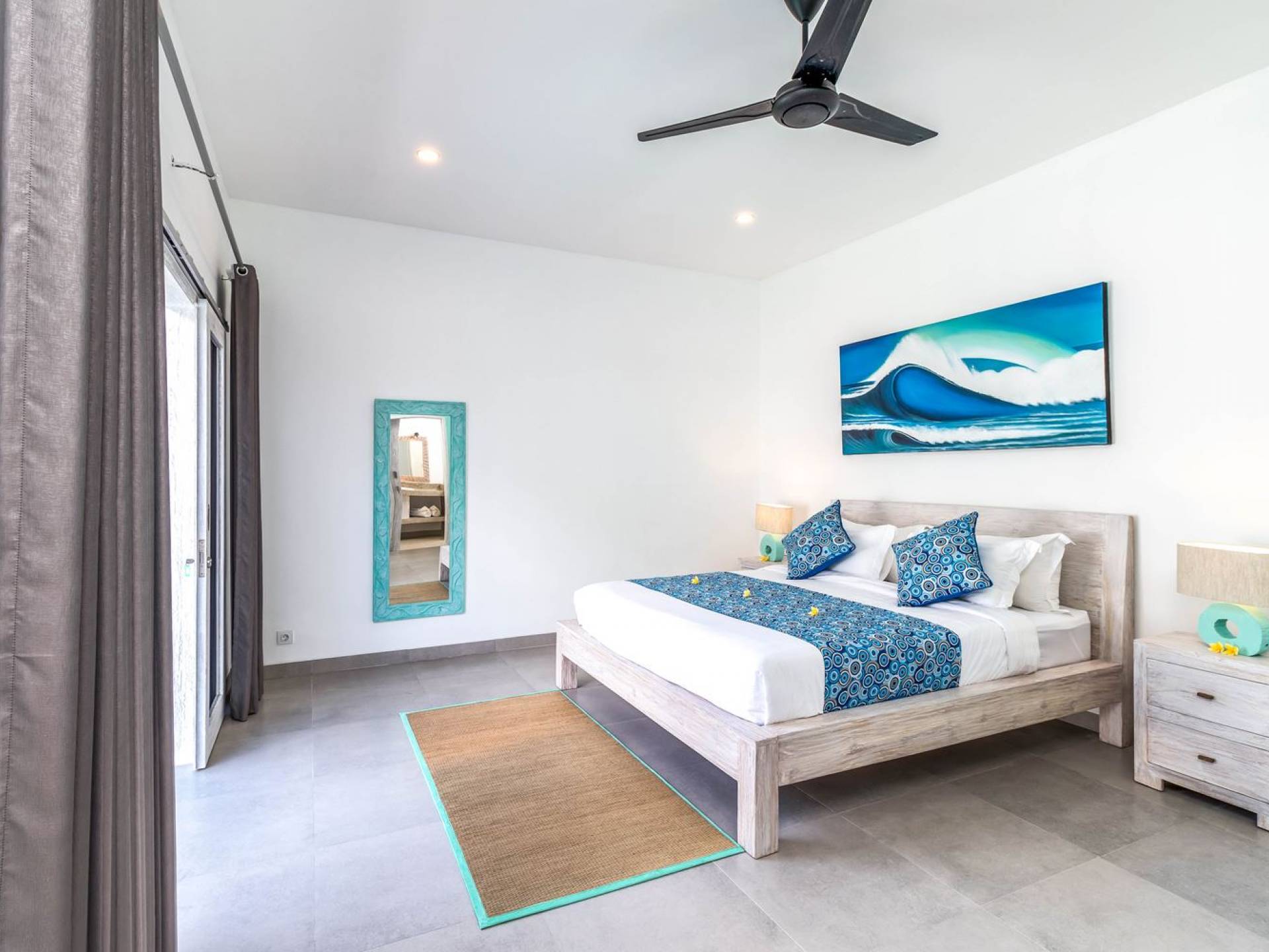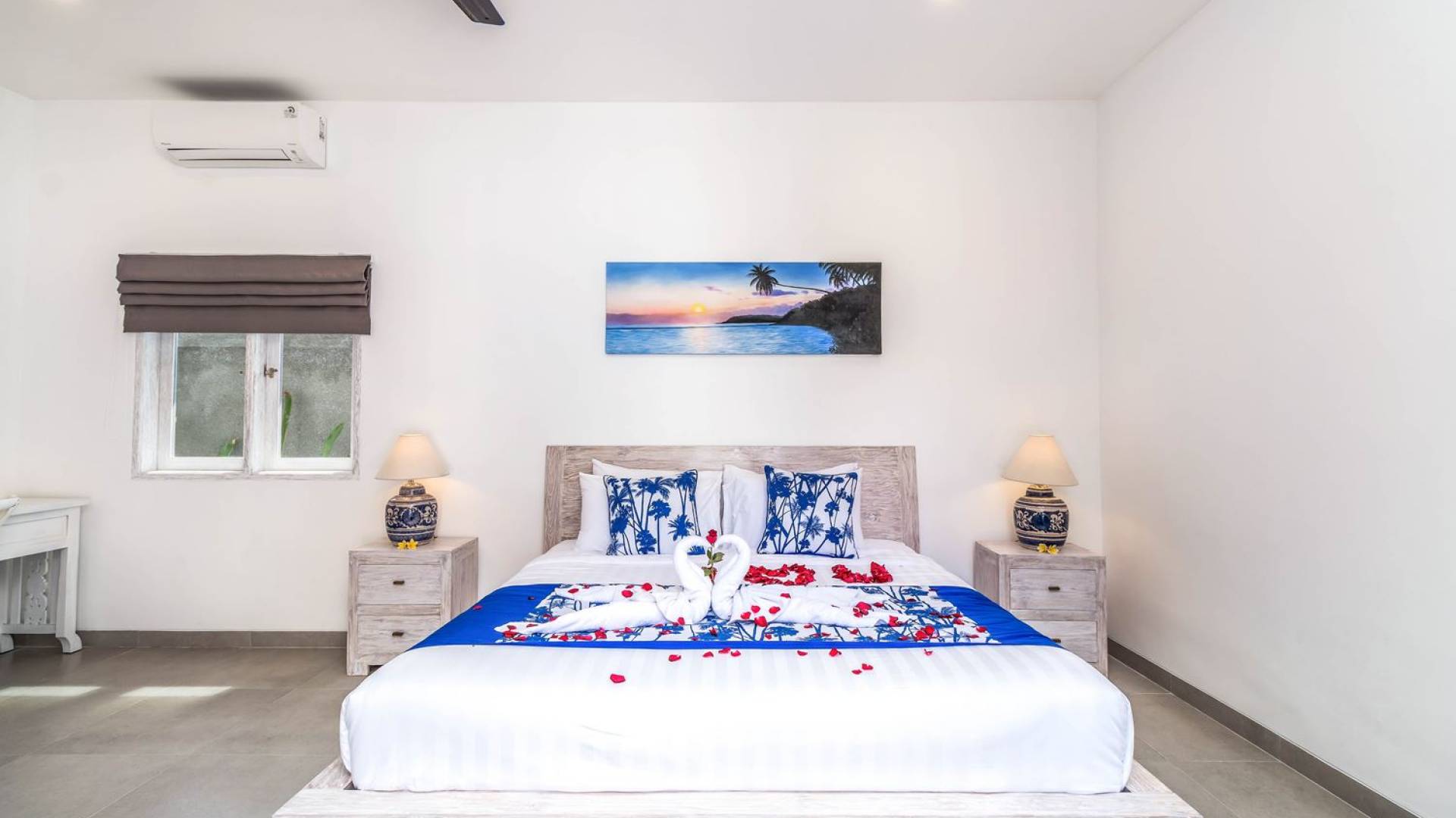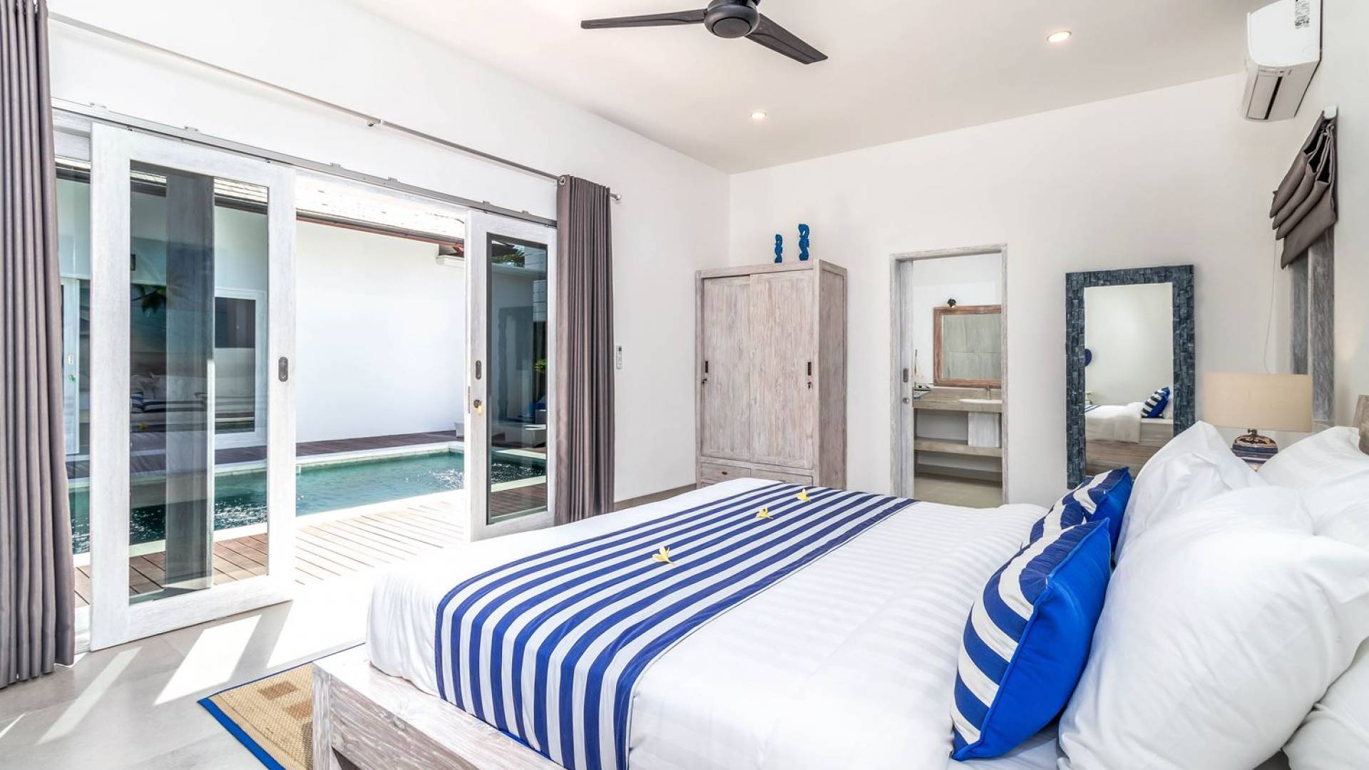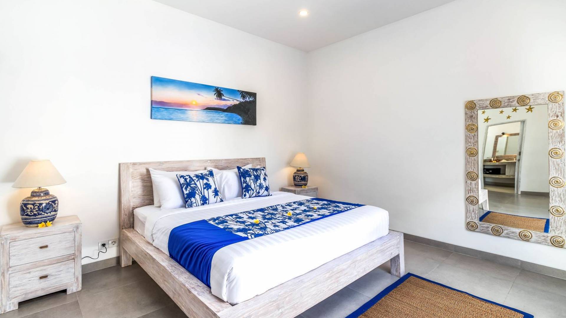 3 спальни расположены вокруг бассейна со стеклянными дверями, которые открываются на открытую площадку, где вы можете прыгнуть прямо в бассейн. Каждый номер оснащен кондиционером и индивидуально оформлен в элегантном тропическом стиле. Что у них общего, так это синий цвет, пропитанный декоративными элементами и другими деталями. В каждом номере есть большая и удобная кровать размера "queen-size" для сна, есть шкафы из побеленного дерева, в которые можно положить одежду и самые ценные вещи, во всех номерах есть сейф. Просторные ванные комнаты оборудованы тропическим душем, ручным душем, умывальником и туалетом. 2 спальни соединены между собой, что отлично подходит для семей, желающих оставаться рядом со своими детьми.