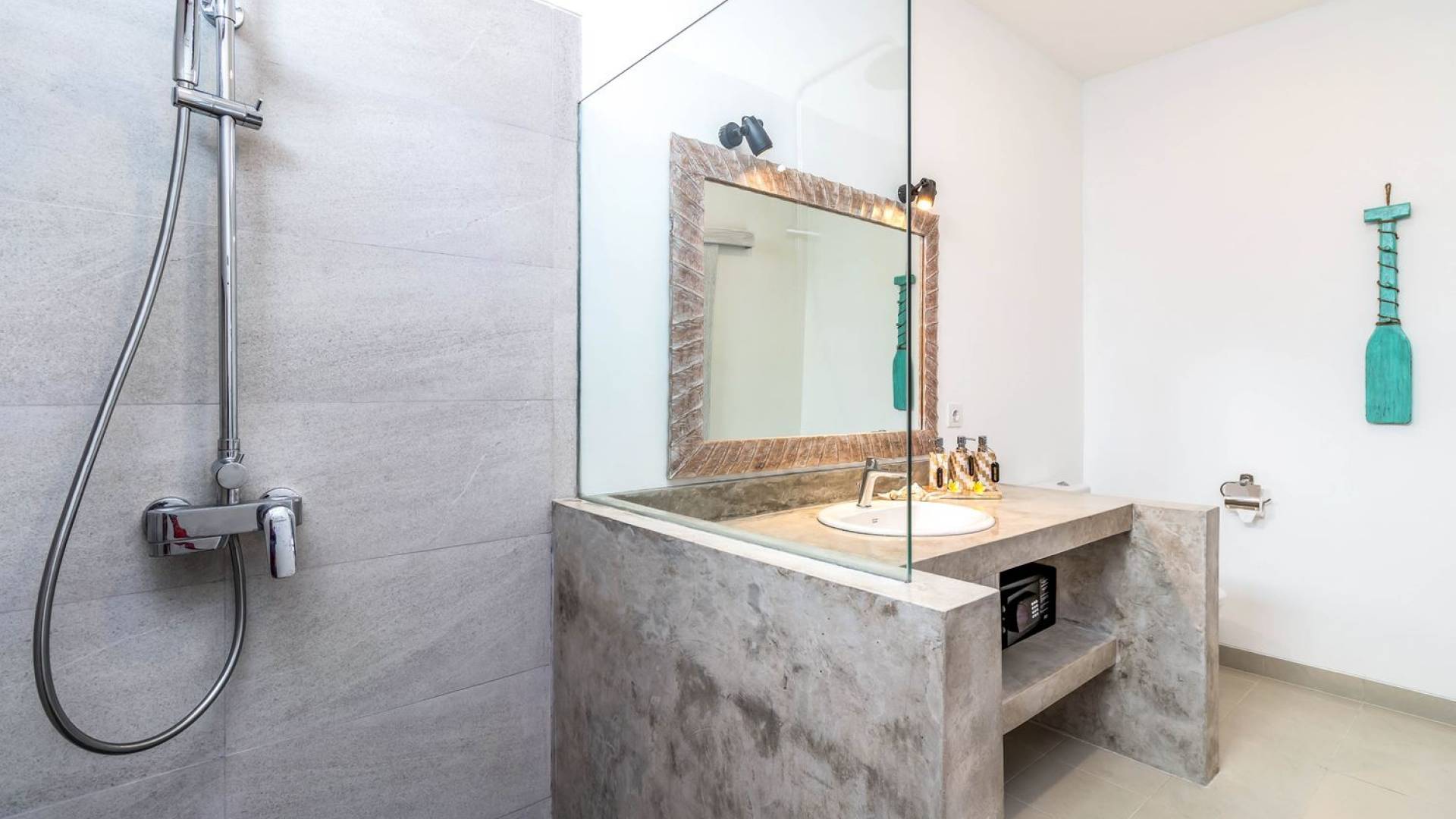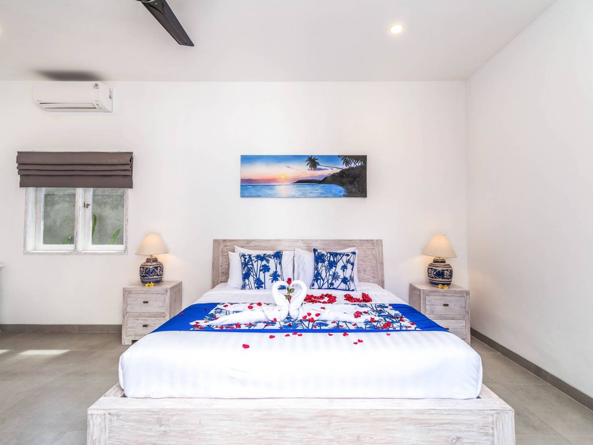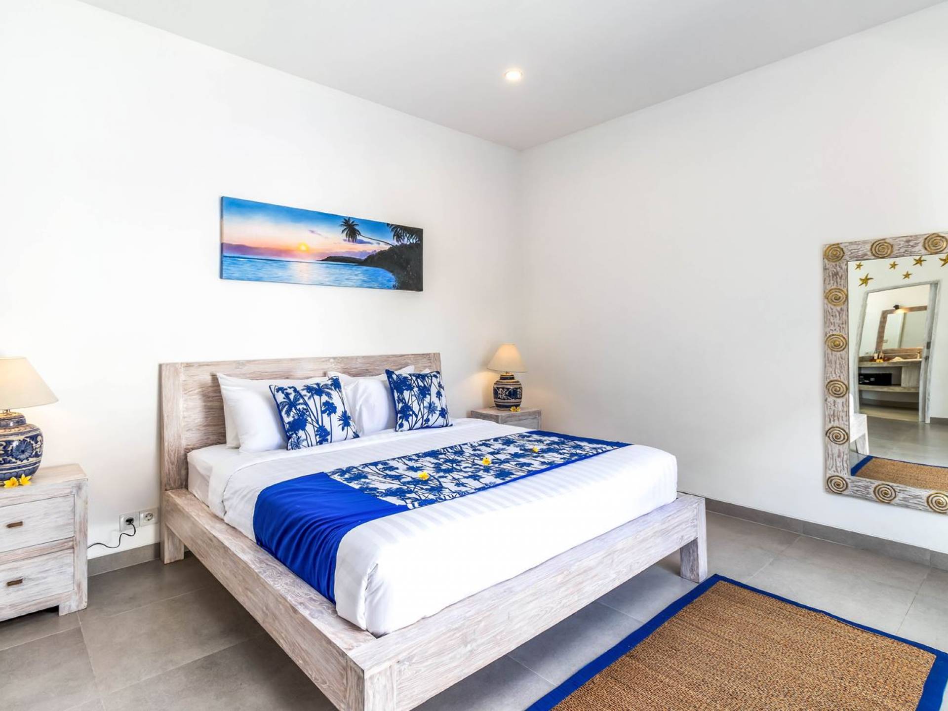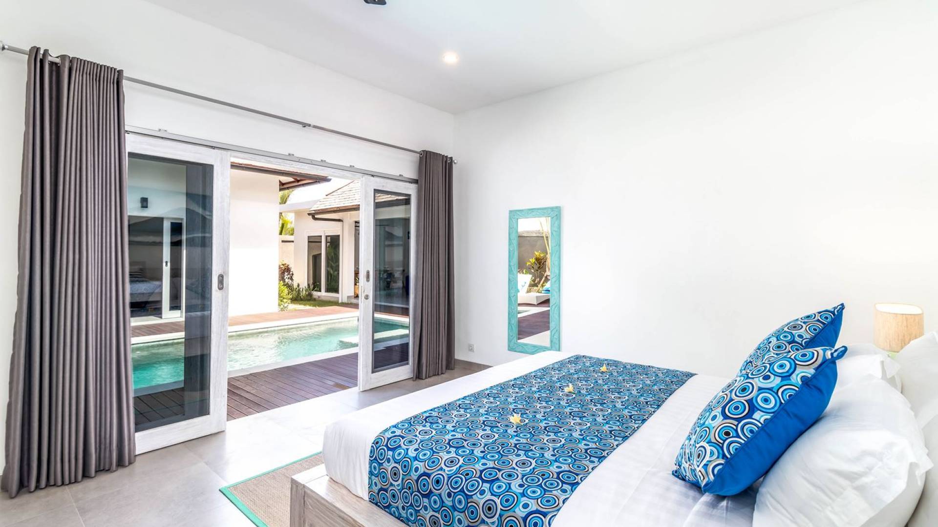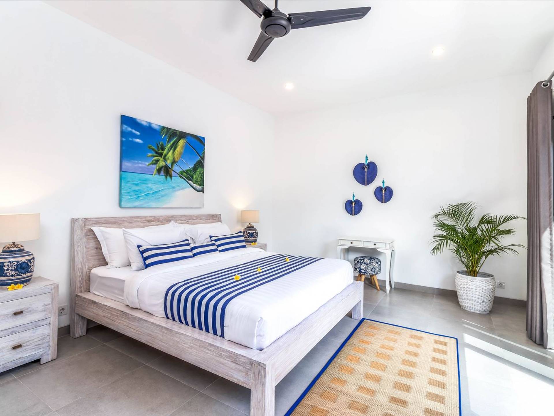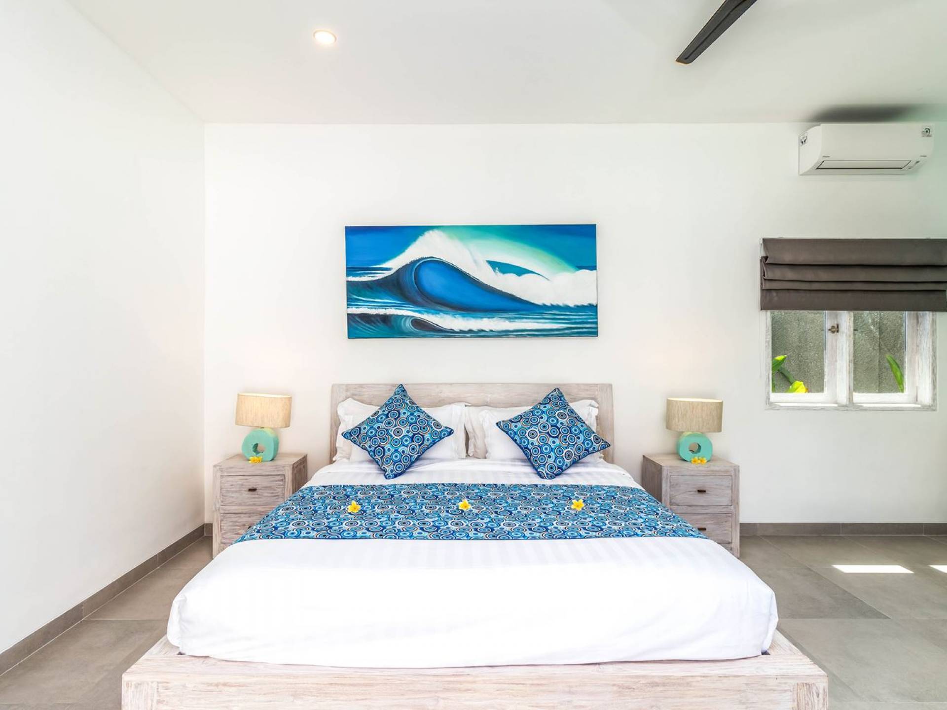 3 спальни расположены вокруг бассейна со стеклянными дверями, которые открываются на открытую площадку, где вы можете прыгнуть прямо в бассейн. Каждый номер оснащен кондиционером и индивидуально оформлен в элегантном тропическом стиле. Что у них общего, так это синий цвет, пропитанный декоративными элементами и другими деталями. В каждом номере есть большая и удобная кровать размера "queen-size" для сна, есть шкафы из побеленного дерева, в которые можно положить одежду и самые ценные вещи, во всех номерах есть сейф. Просторные ванные комнаты оборудованы тропическим душем, ручным душем, умывальником и туалетом. 2 спальни соединены между собой, что отлично подходит для семей, желающих оставаться рядом со своими детьми.