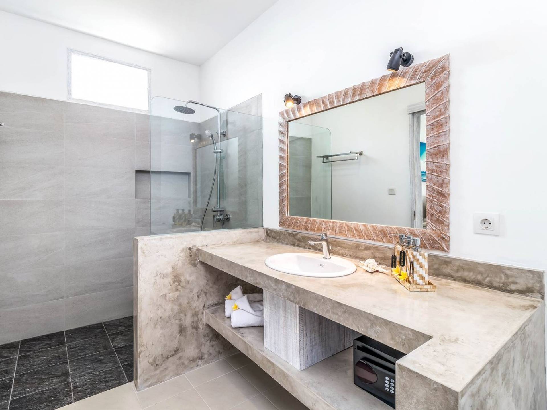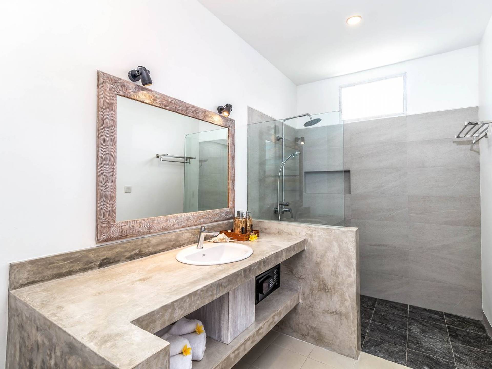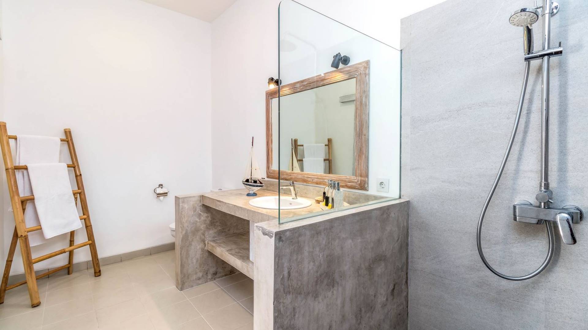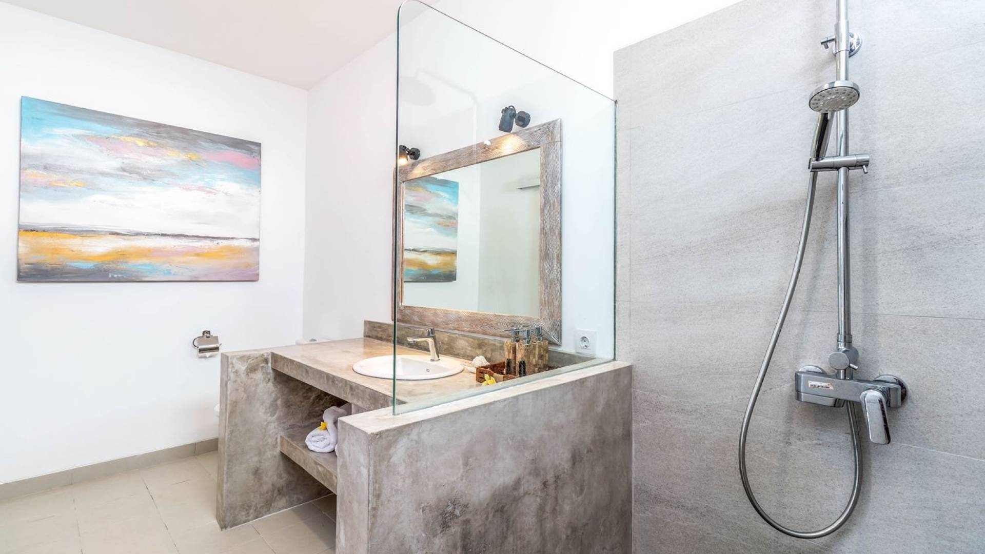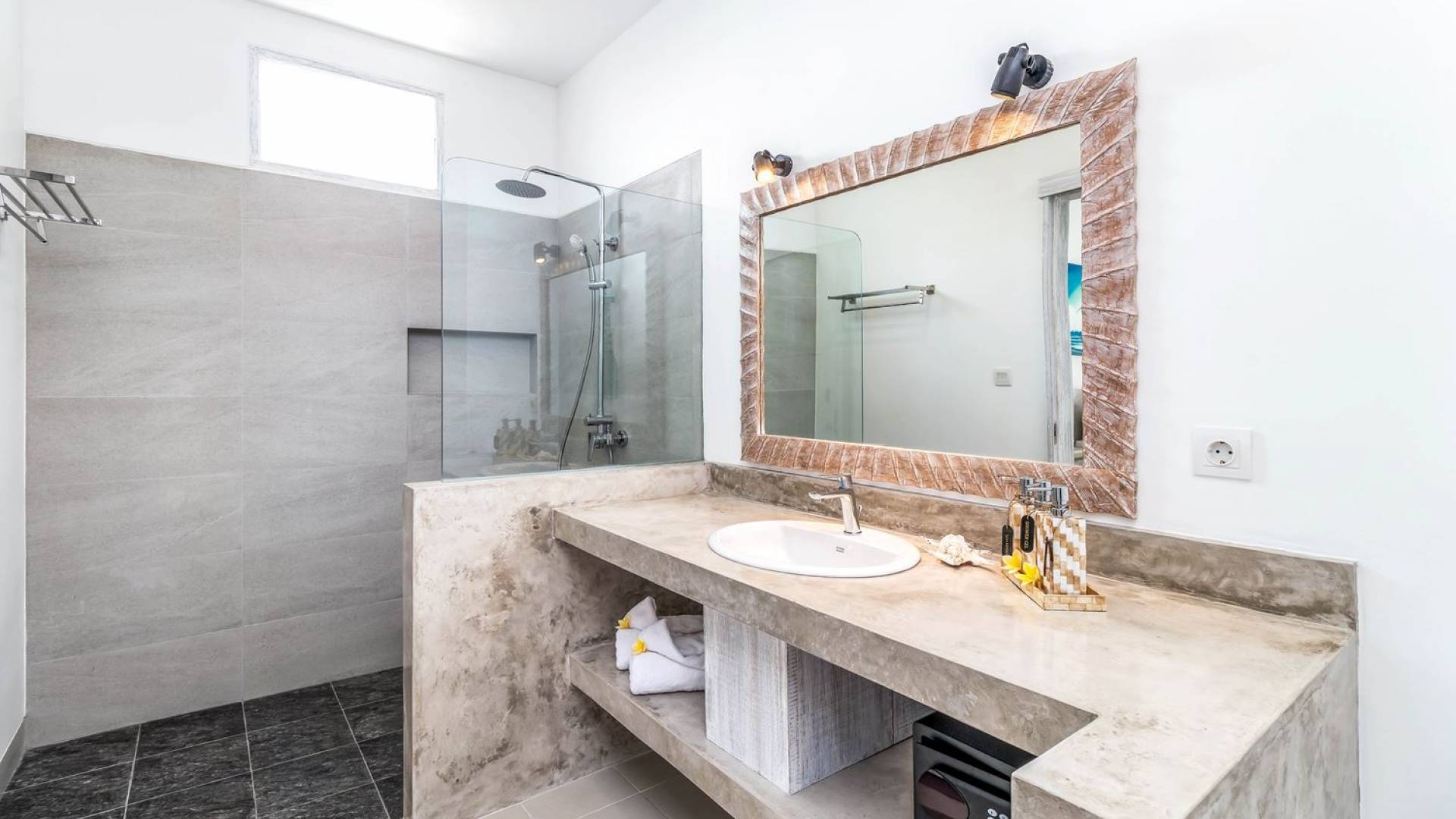 3 спальни расположены вокруг бассейна со стеклянными дверями, которые открываются на открытую площадку, где вы можете прыгнуть прямо в бассейн. Каждый номер оснащен кондиционером и индивидуально оформлен в элегантном тропическом стиле. Что у них общего, так это синий цвет, пропитанный декоративными элементами и другими деталями. В каждом номере есть большая и удобная кровать размера "queen-size" для сна, есть шкафы из побеленного дерева, в которые можно положить одежду и самые ценные вещи, во всех номерах есть сейф. Просторные ванные комнаты оборудованы тропическим душем, ручным душем, умывальником и туалетом. 2 спальни соединены между собой, что отлично подходит для семей, желающих оставаться рядом со своими детьми.