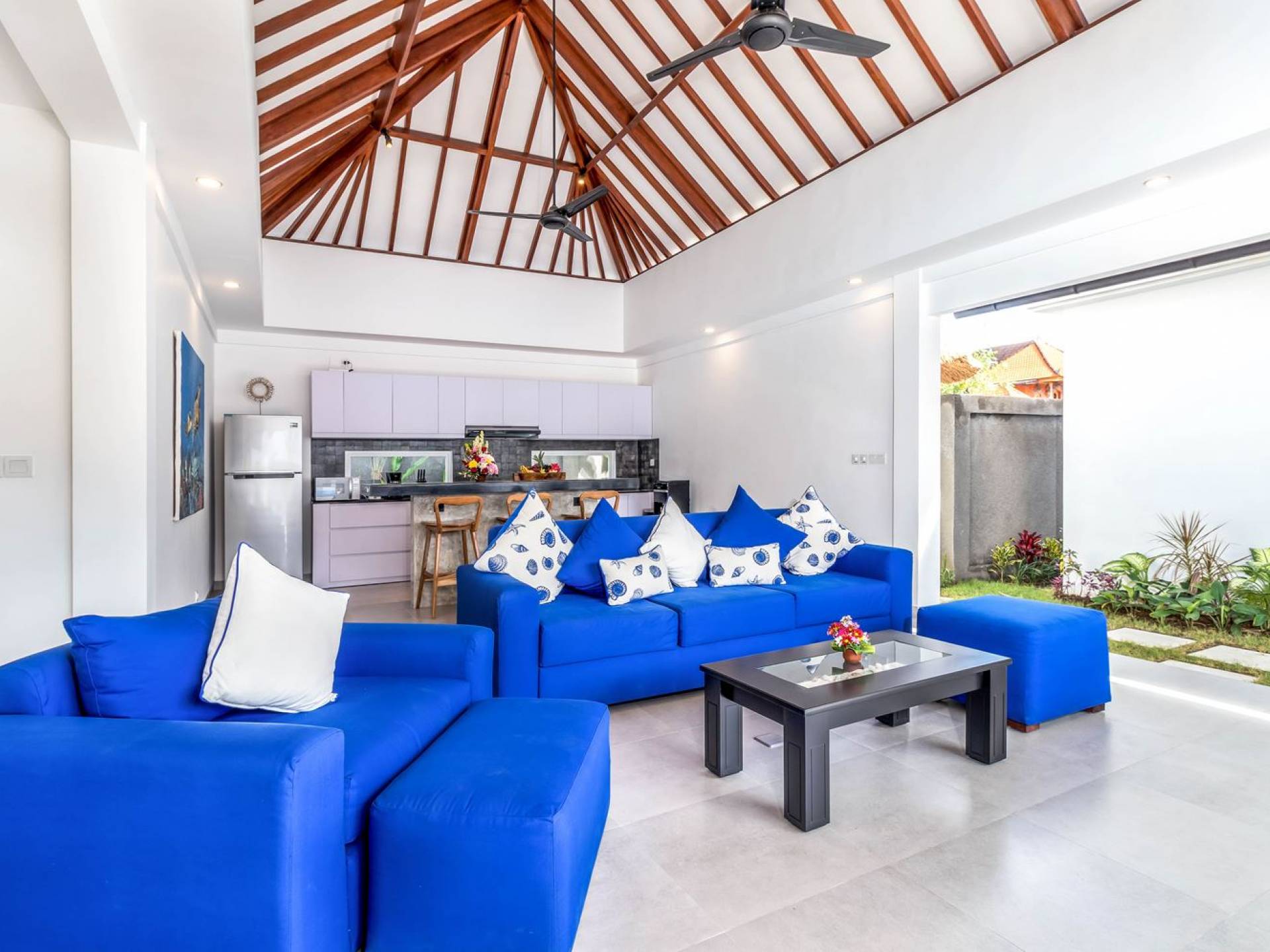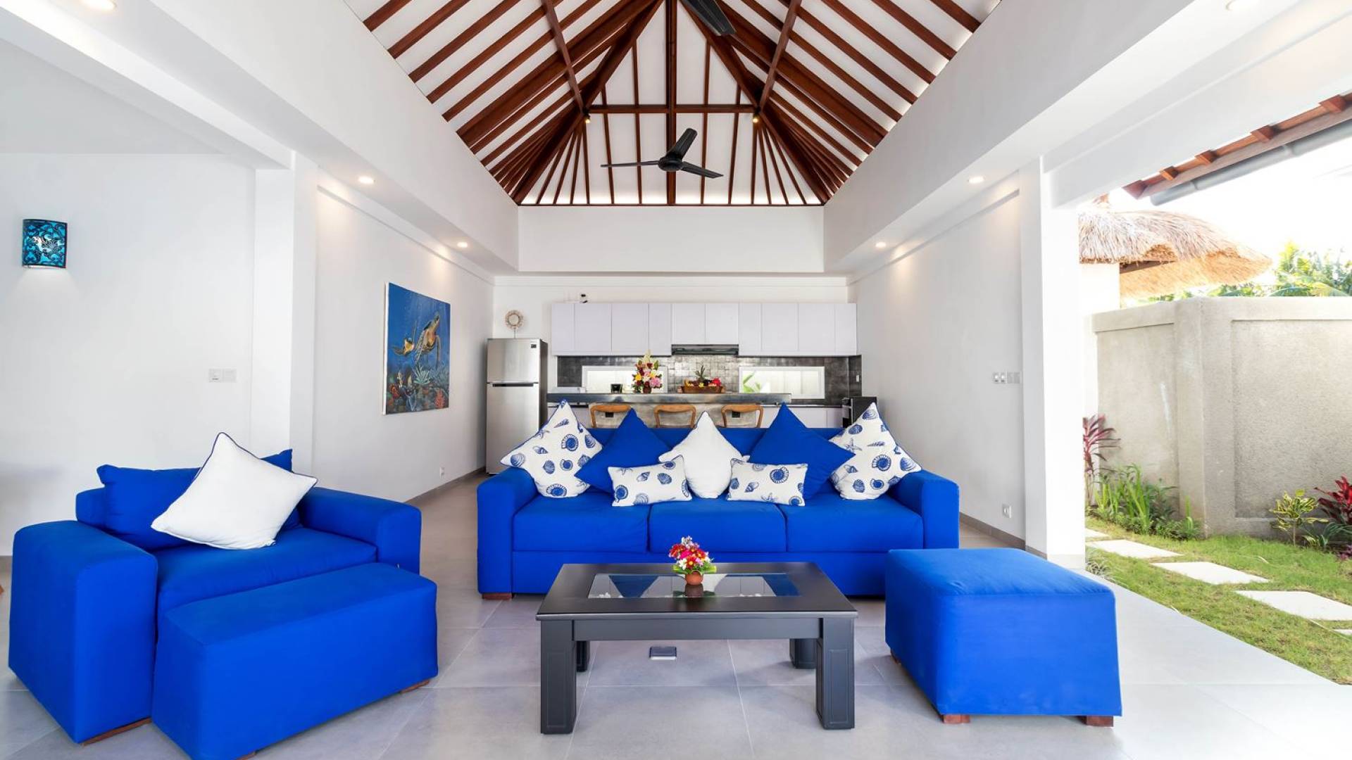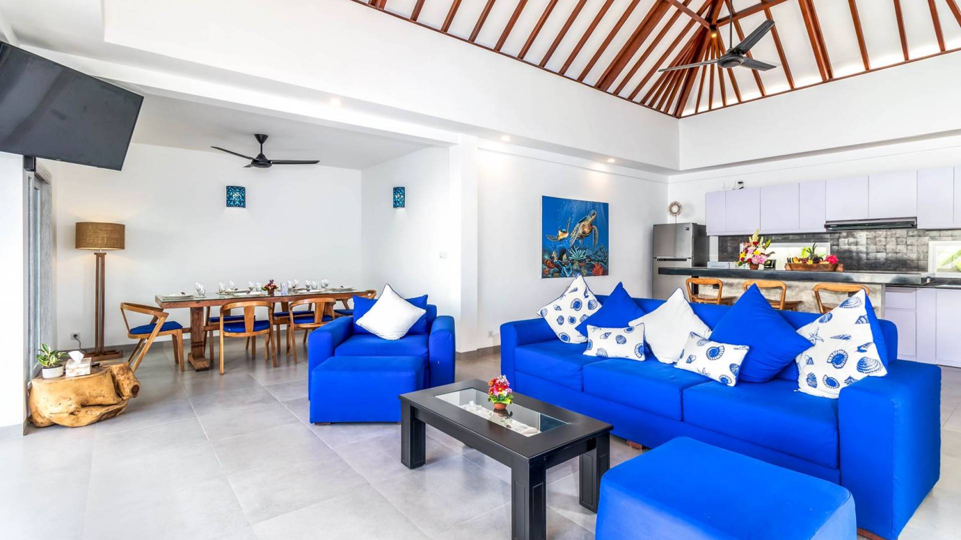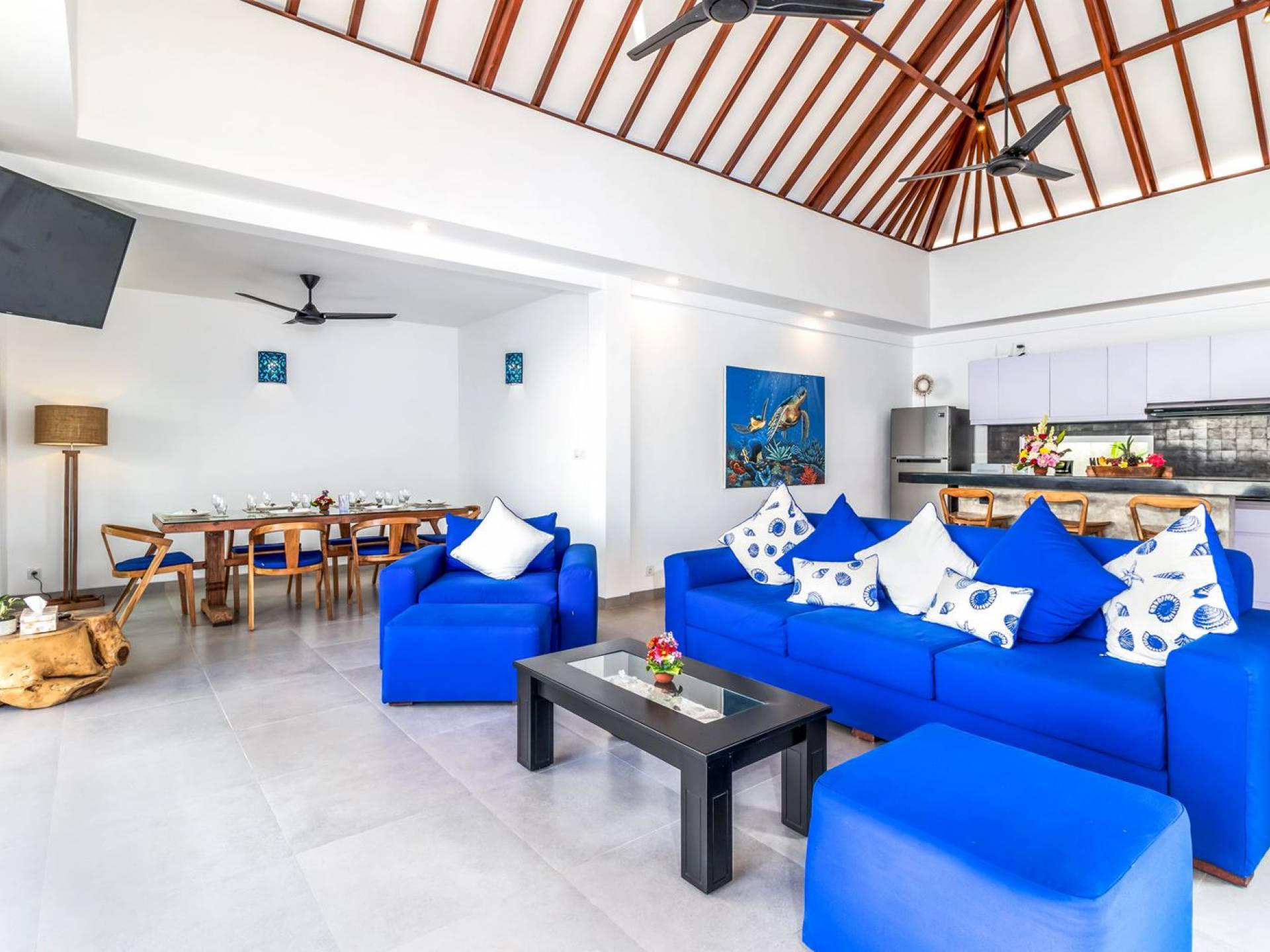 Главный павильон выполнен в традиционном стиле с высокой крышей и гостиной открытой планировки. Оснащенная всеми современными удобствами, такими как диван, обеденный стол, телевизор и открытая кухня с барной стойкой и высокими стульями, на вилле Hiburan 2 жить хорошо! Тема всей виллы тропическая и вдохновлена синим цветом. Диван-гостиная темно-синего цвета, на стенах висят синие светильники, картины синие — в интерьере этой виллы преобладает синий цвет, придающий ей стильный вид и распространяющий мирную, безмятежную атмосферу.