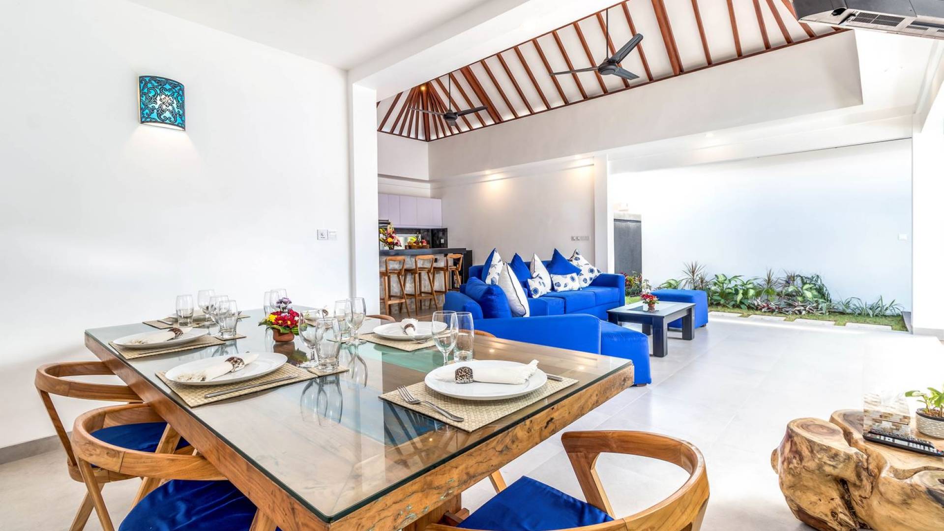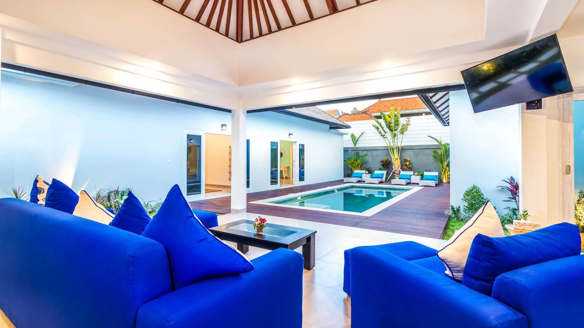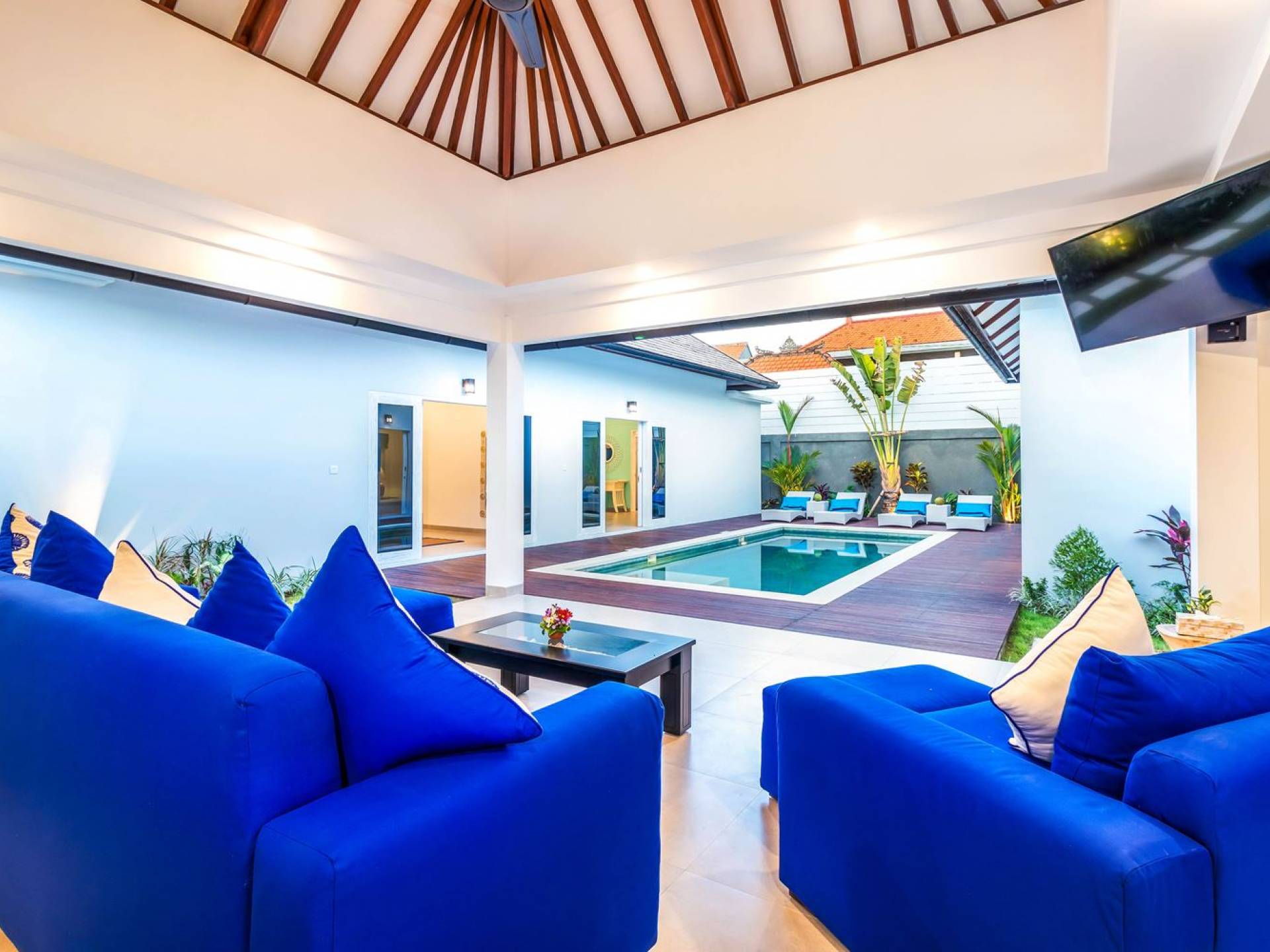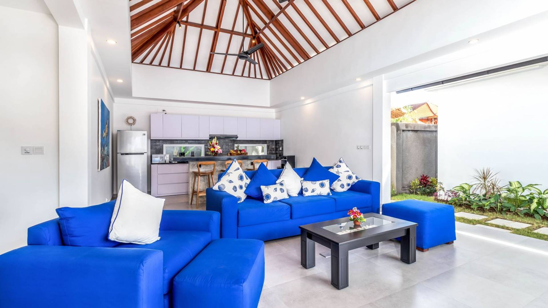 Главный павильон выполнен в традиционном стиле с высокой крышей и гостиной открытой планировки. Оснащенная всеми современными удобствами, такими как диван, обеденный стол, телевизор и открытая кухня с барной стойкой и высокими стульями, на вилле Hiburan 2 жить хорошо! Тема всей виллы тропическая и вдохновлена синим цветом. Диван-гостиная темно-синего цвета, на стенах висят синие светильники, картины синие — в интерьере этой виллы преобладает синий цвет, придающий ей стильный вид и распространяющий мирную, безмятежную атмосферу.
