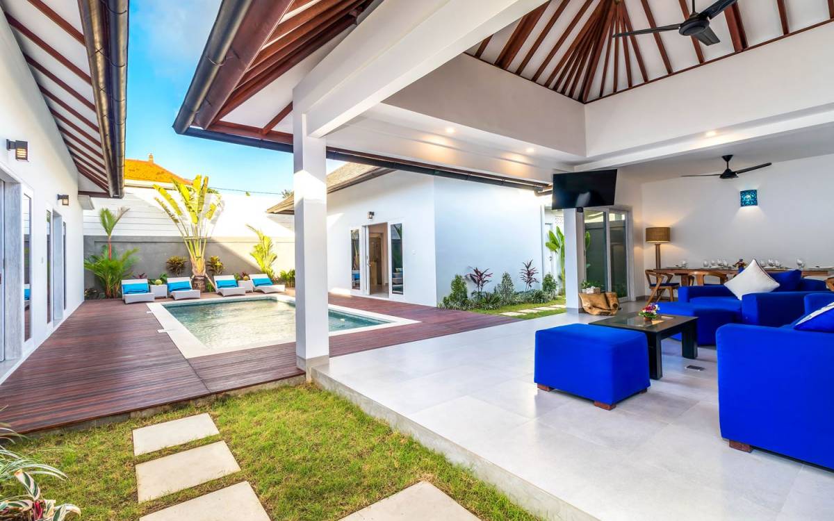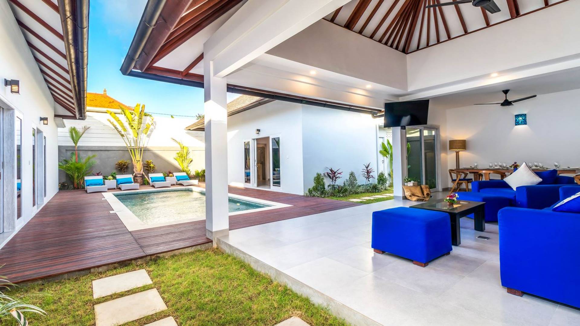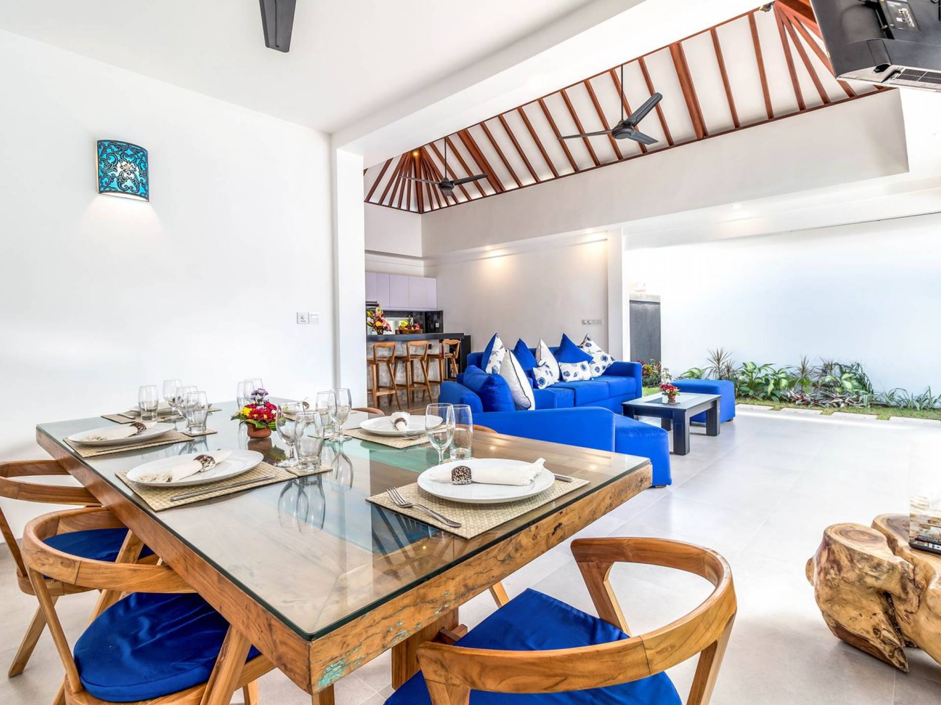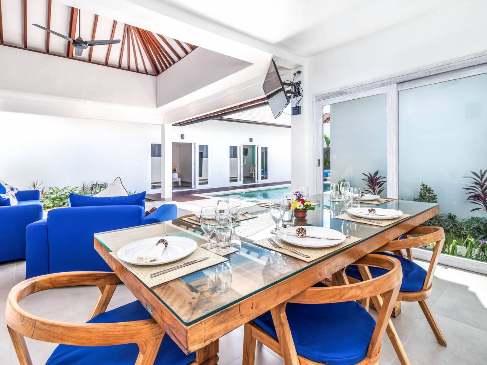 Главный павильон выполнен в традиционном стиле с высокой крышей и гостиной открытой планировки. Оснащенная всеми современными удобствами, такими как диван, обеденный стол, телевизор и открытая кухня с барной стойкой и высокими стульями, на вилле Hiburan 2 жить хорошо! Тема всей виллы тропическая и вдохновлена синим цветом. Диван-гостиная темно-синего цвета, на стенах висят синие светильники, картины синие — в интерьере этой виллы преобладает синий цвет, придающий ей стильный вид и распространяющий мирную, безмятежную атмосферу.