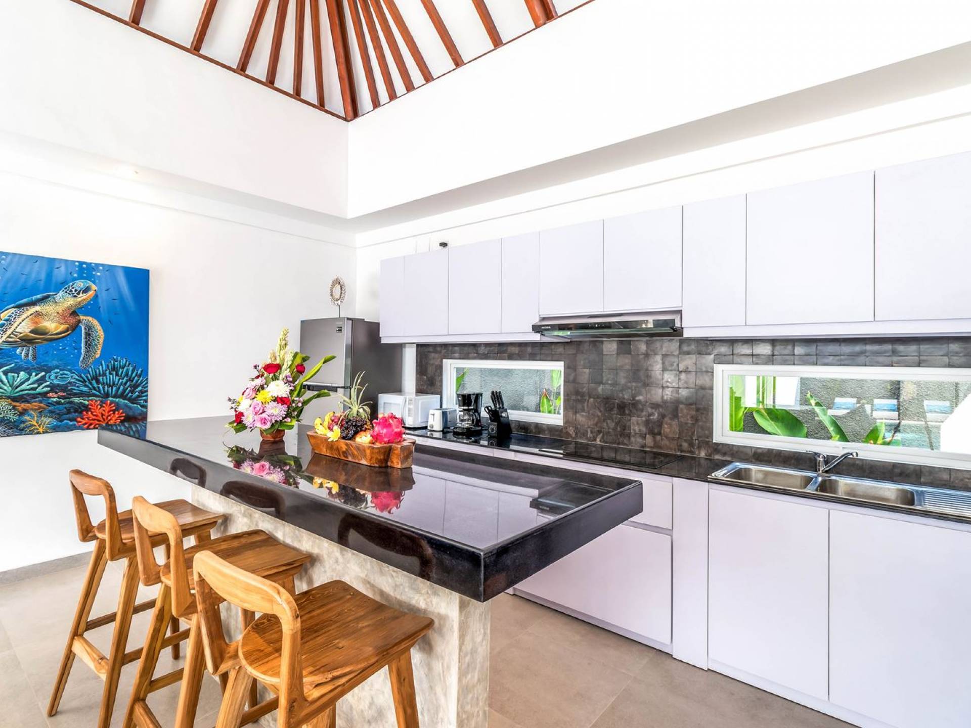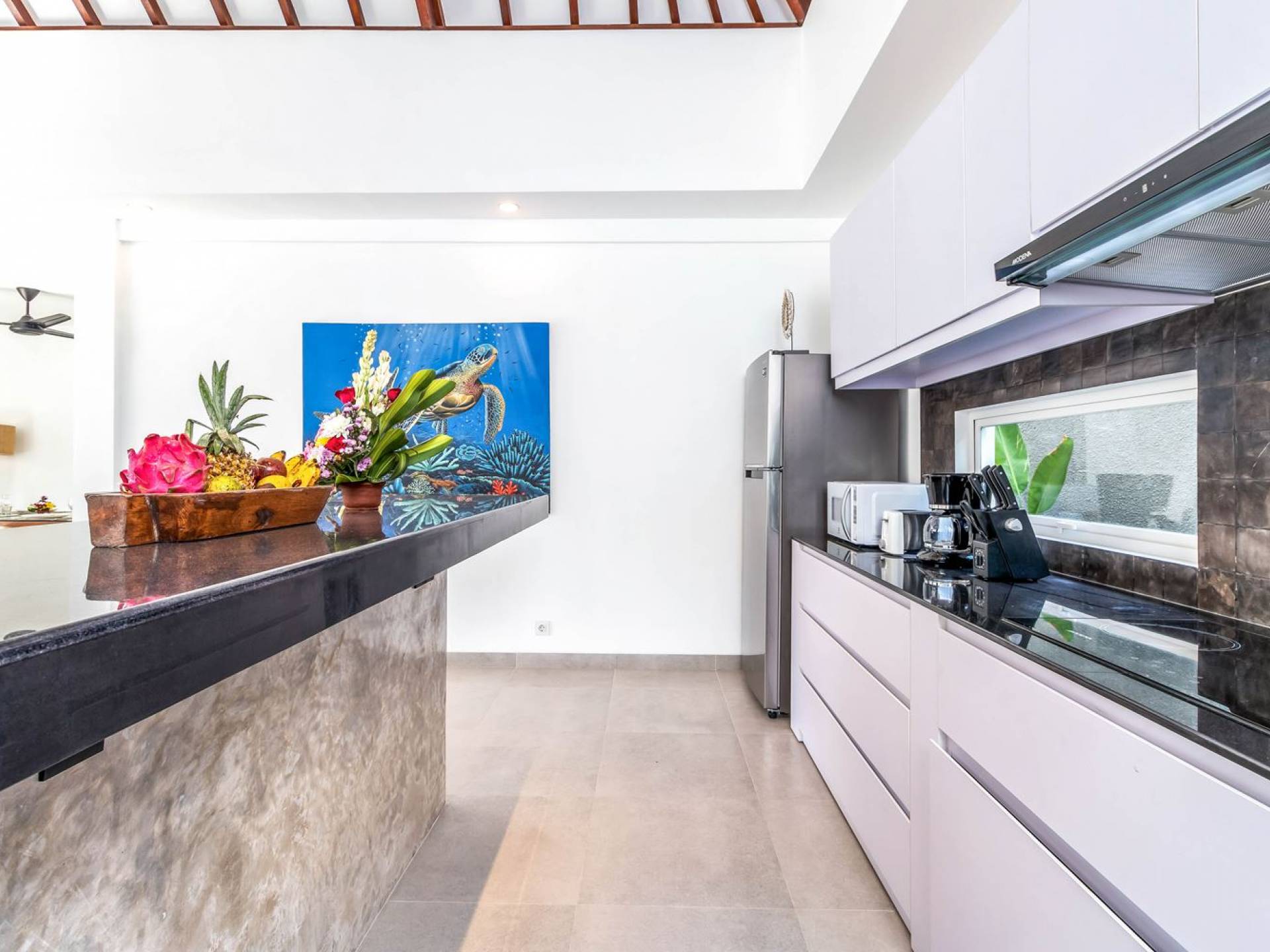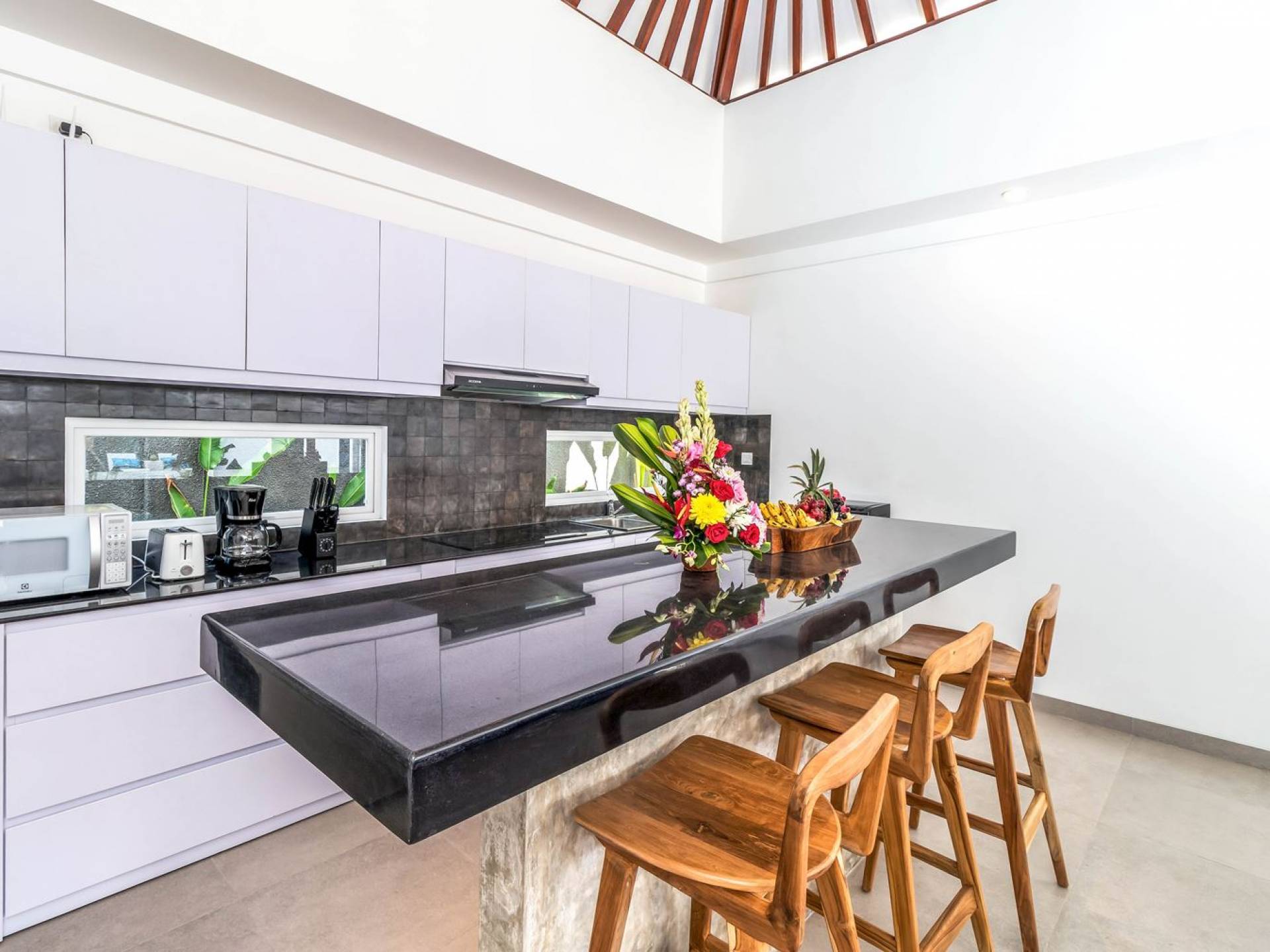 Кухня очень просторная и оснащена микроволновой печью, тостером, кофеваркой, электрической плитой и большим холодильником. Бар на острове с деревянными высокими стульями — прекрасное место, где можно посидеть с любимым напитком. На диване можно любоваться видом на сад, смотреть, как дети играют в бассейне, или смотреть фильмы для развлечения в любое время дня и вечера. В бассейне есть неглубокая зона для детей, что делает его идеальным для семей и семейного отдыха под тропическим солнцем Бали и ясным голубым небом.