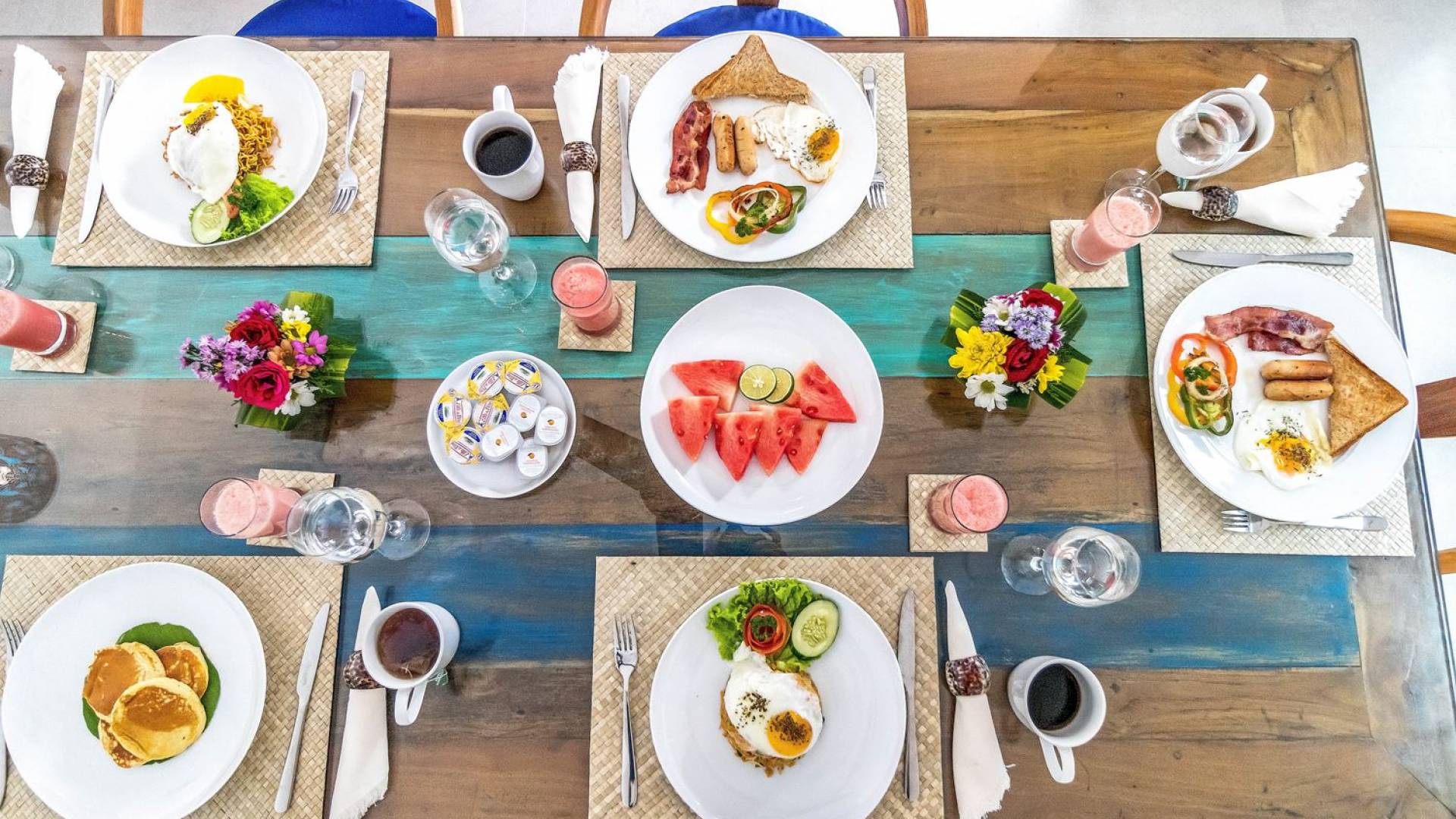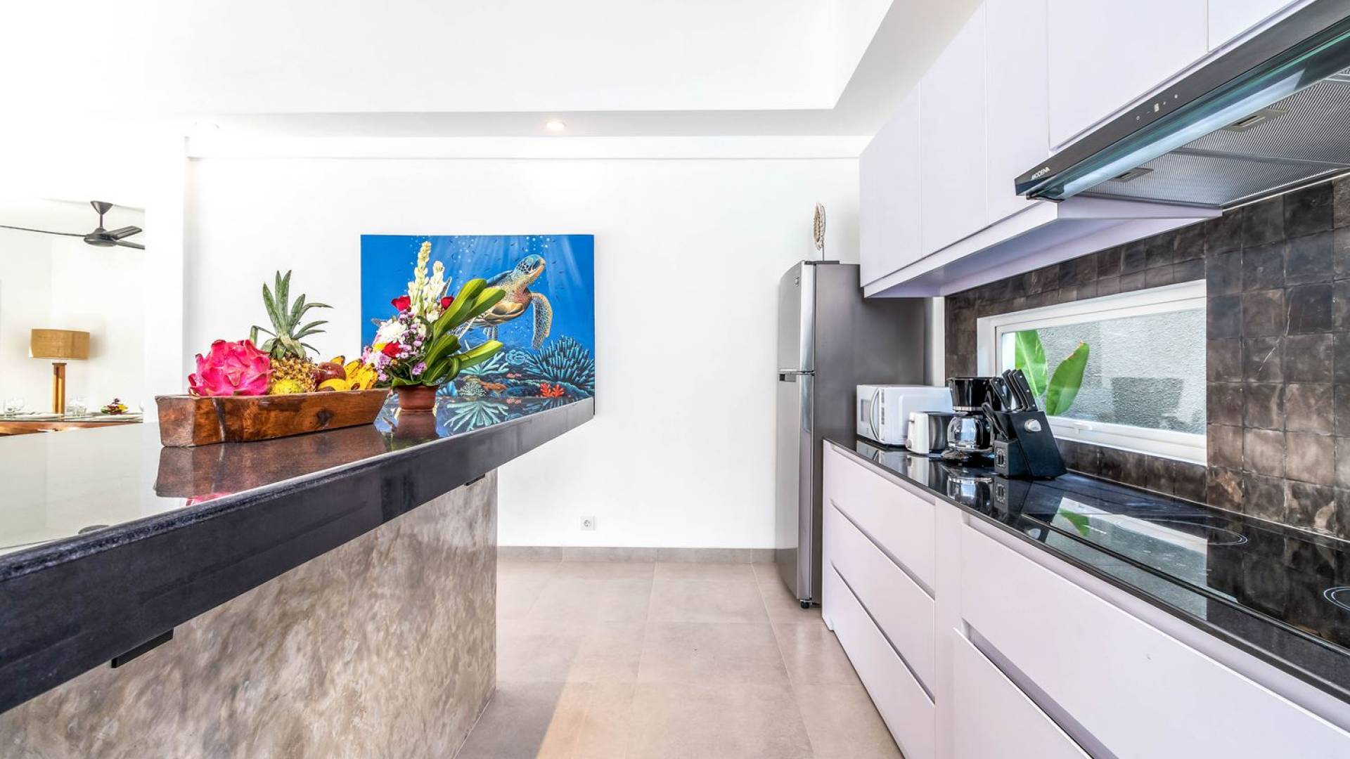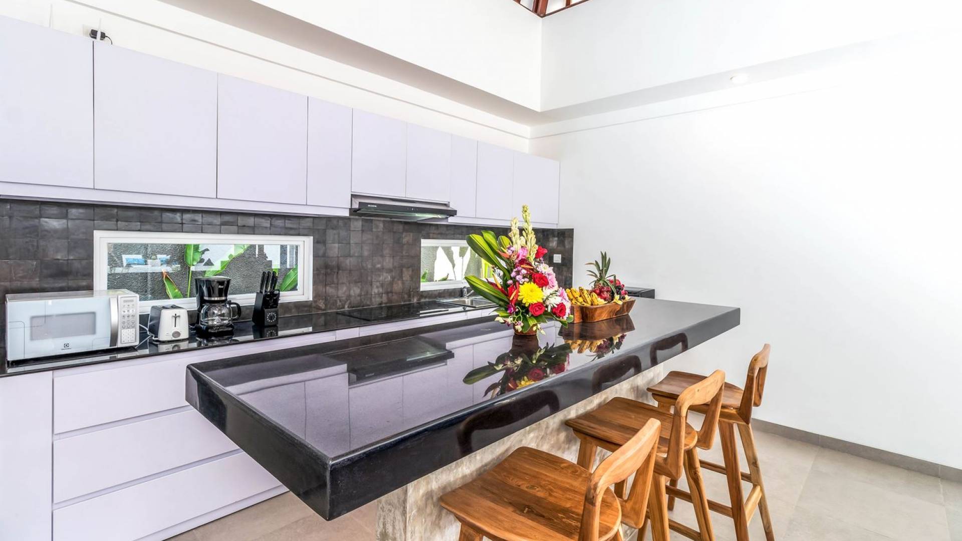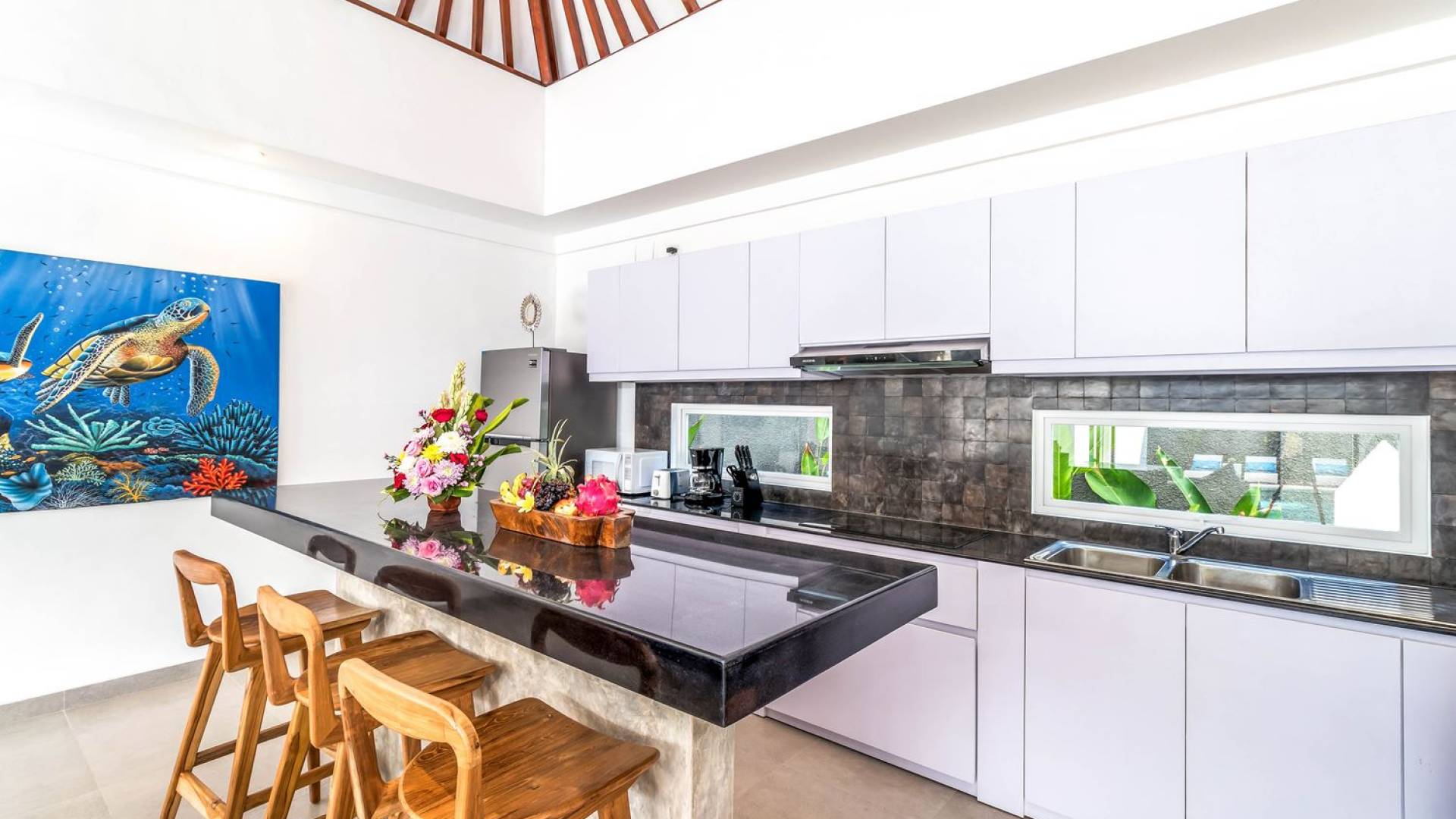 Кухня очень просторная и оснащена микроволновой печью, тостером, кофеваркой, электрической плитой и большим холодильником. Бар на острове с деревянными высокими стульями — прекрасное место, где можно посидеть с любимым напитком. На диване можно любоваться видом на сад, смотреть, как дети играют в бассейне, или смотреть фильмы для развлечения в любое время дня и вечера. В бассейне есть неглубокая зона для детей, что делает его идеальным для семей и семейного отдыха под тропическим солнцем Бали и ясным голубым небом.