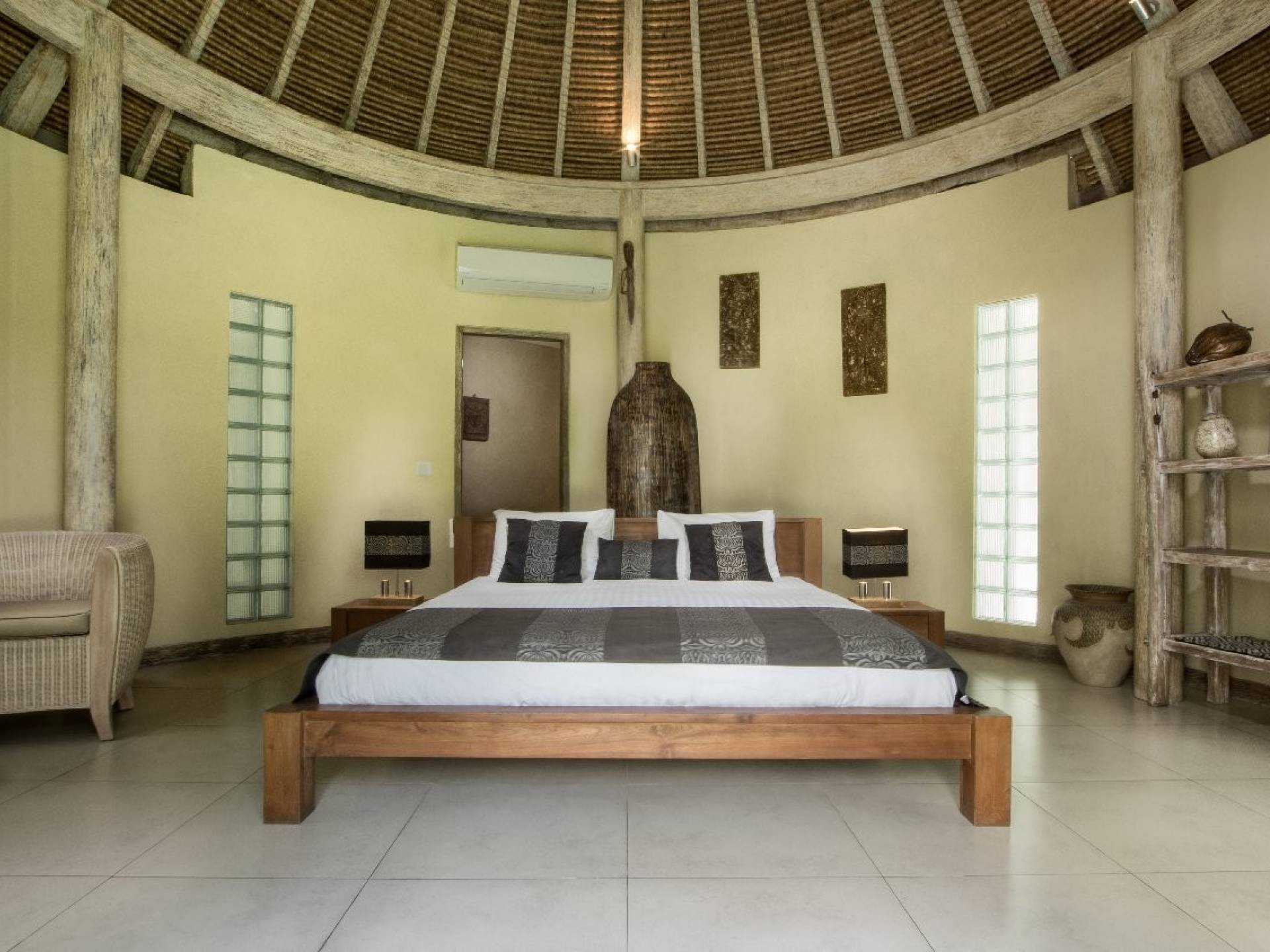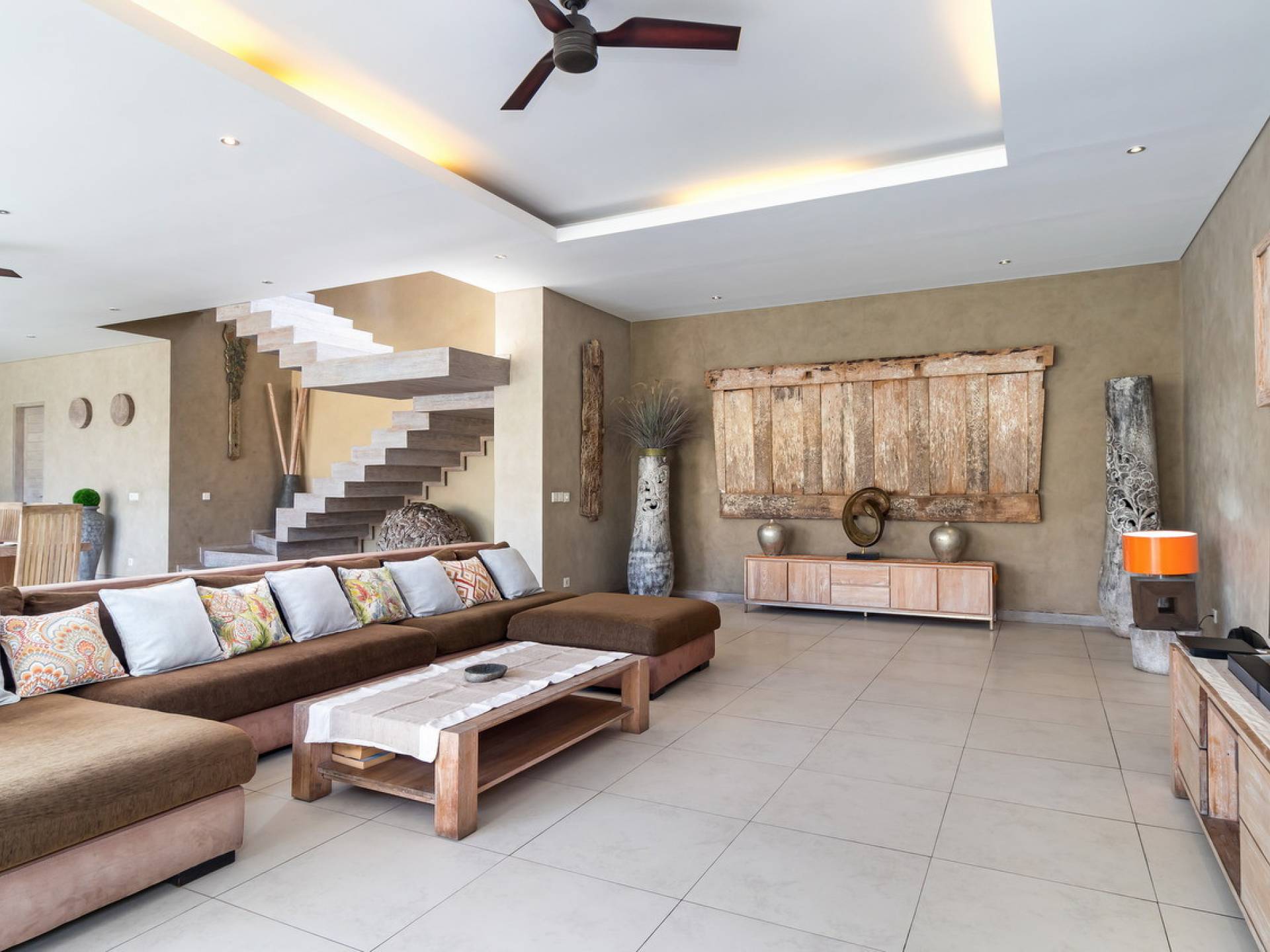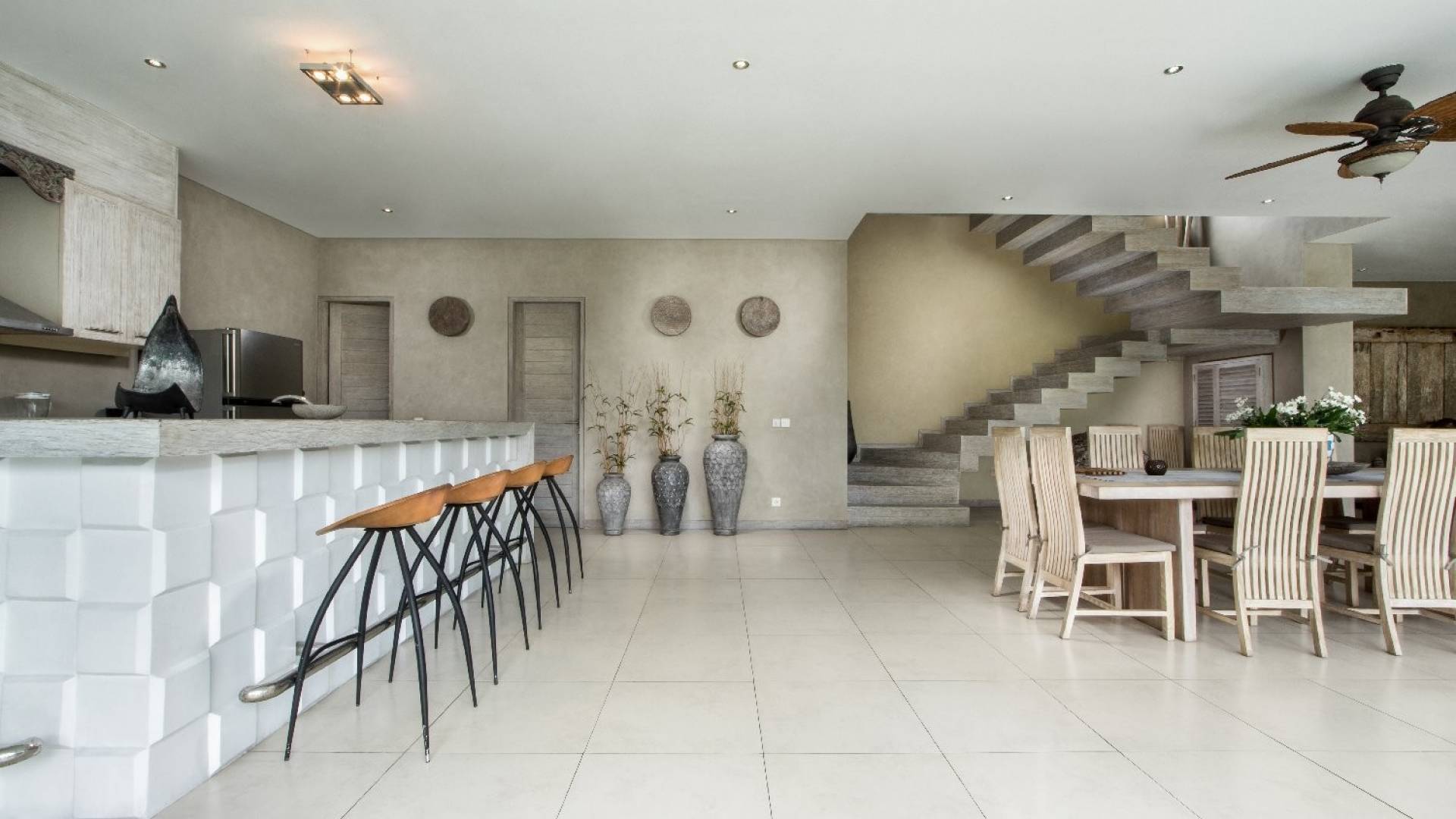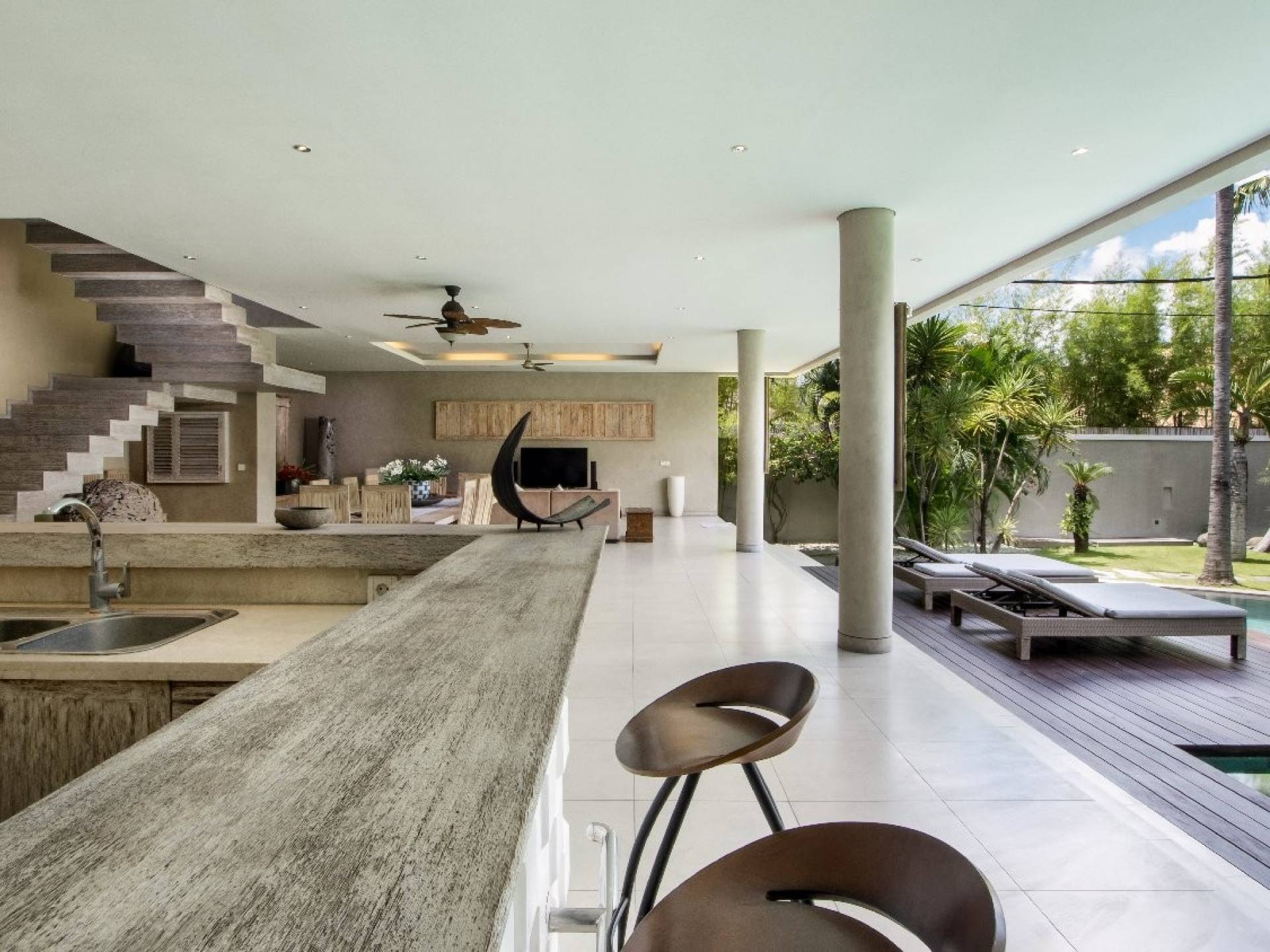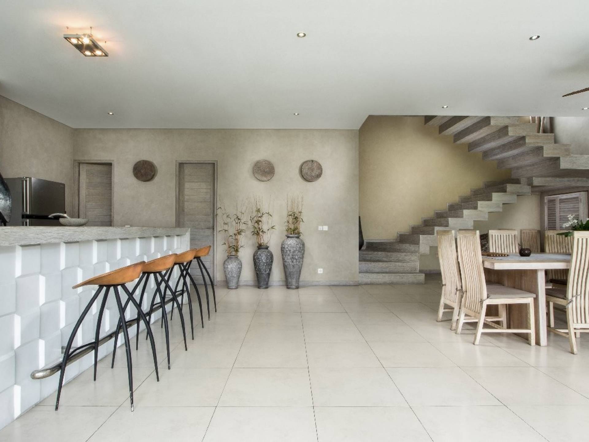 На первом уровне двухэтажного павильона вы найдете элегантное жилое пространство открытой планировки виллы Lisa, с прямым выходом на деревянную террасу для загара, откуда вы можете прыгнуть в сверкающую воду бассейна. . Благодаря потрясающему минималистичному дизайну интерьера, отделанному натуральным местным камнем и деревом, вилла Lisa дышит элегантностью и безмятежностью. Пространство обогащено тщательно подобранными традиционными произведениями искусства, придающими пространству этническую атмосферу, и предлагает удобные места, где можно вместе насладиться напитками, пообедать и посмотреть фильмы. На кухне есть барная стойка с табуретами, где можно насладиться кофе утром и коктейлями вечером. В центре стоит деревянный обеденный стол для завтрака, обеда и ужина, если вы не собираетесь еще раз поужинать на знаменитой улице еды в модном районе Оберой в Семиньяке. Справа находится современный плюшевый диван, на котором можно расслабиться, напротив огромного настенного телевизора с плоским экраном, чтобы развлечься на вилле в уютный вечер, проведенный в помещении.