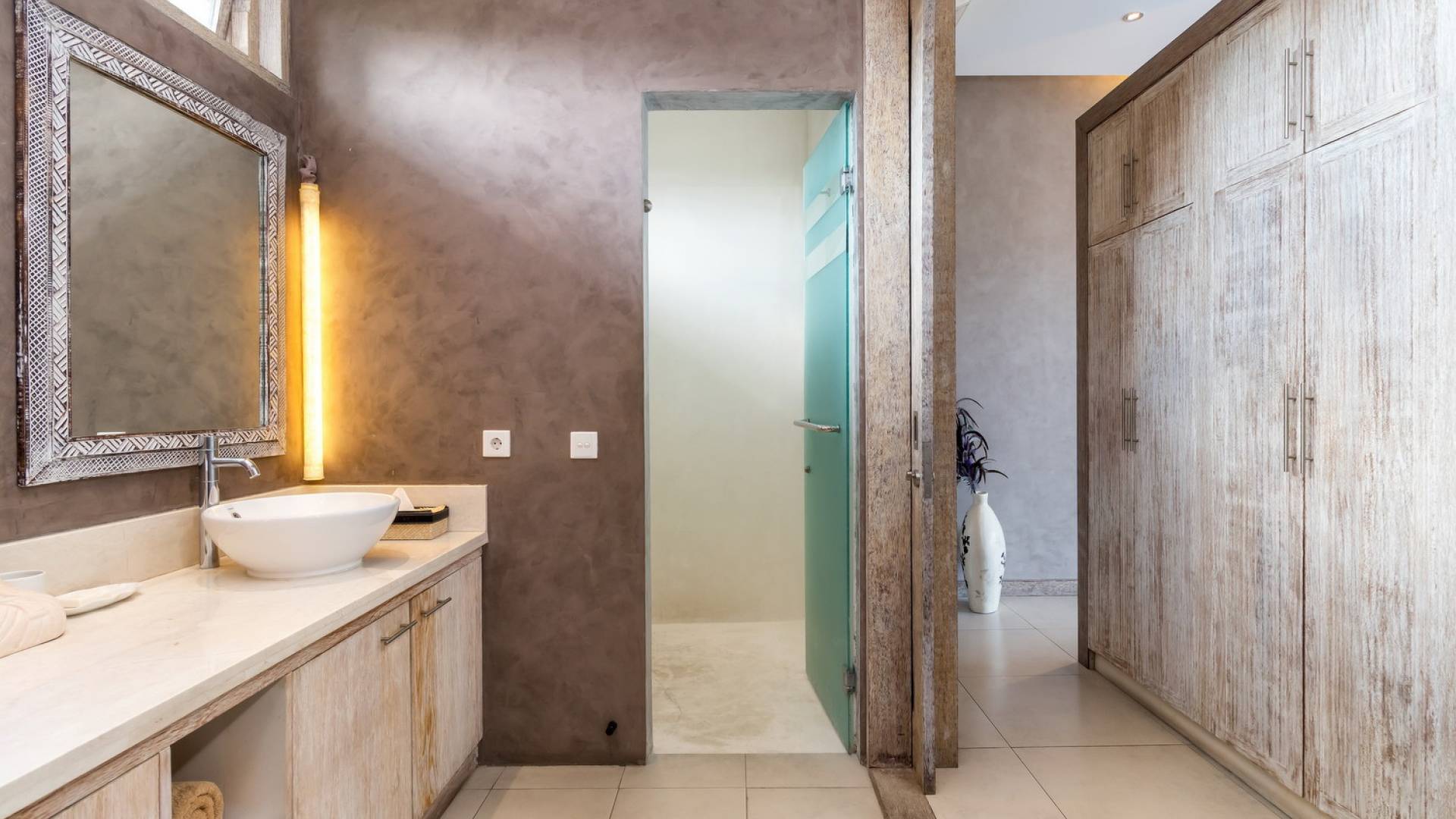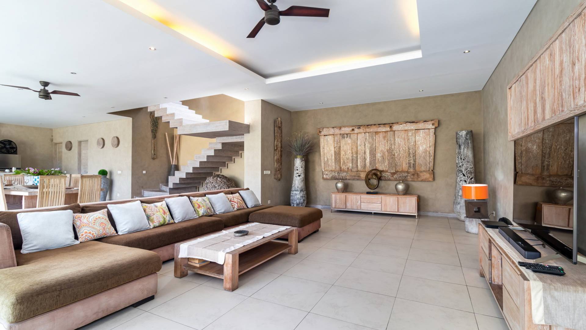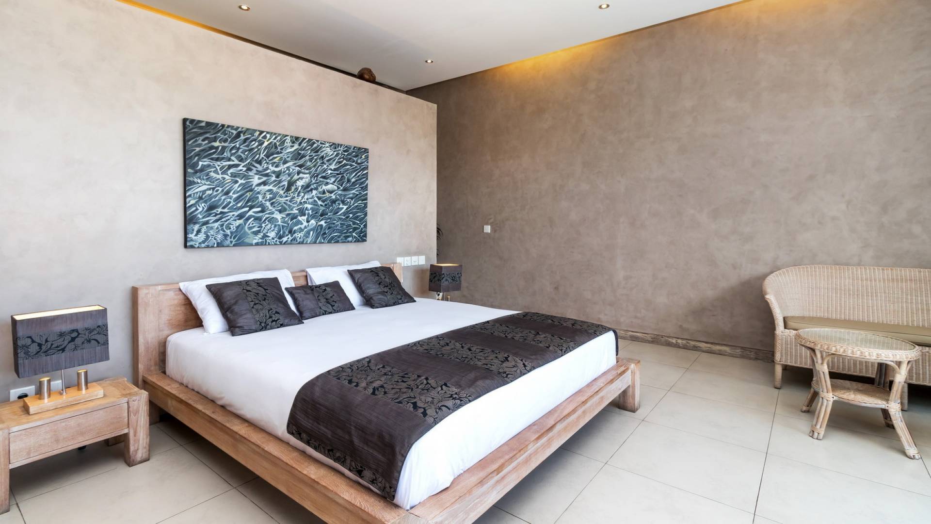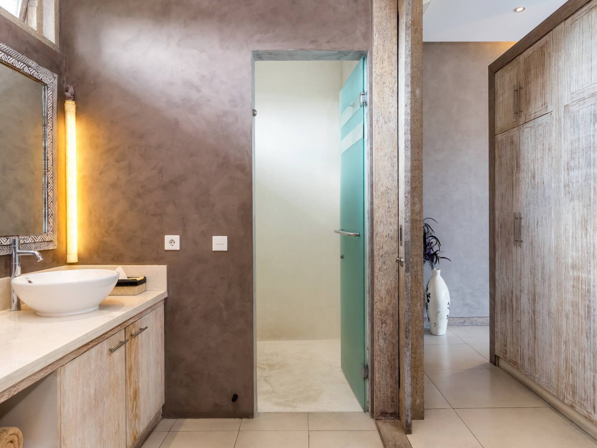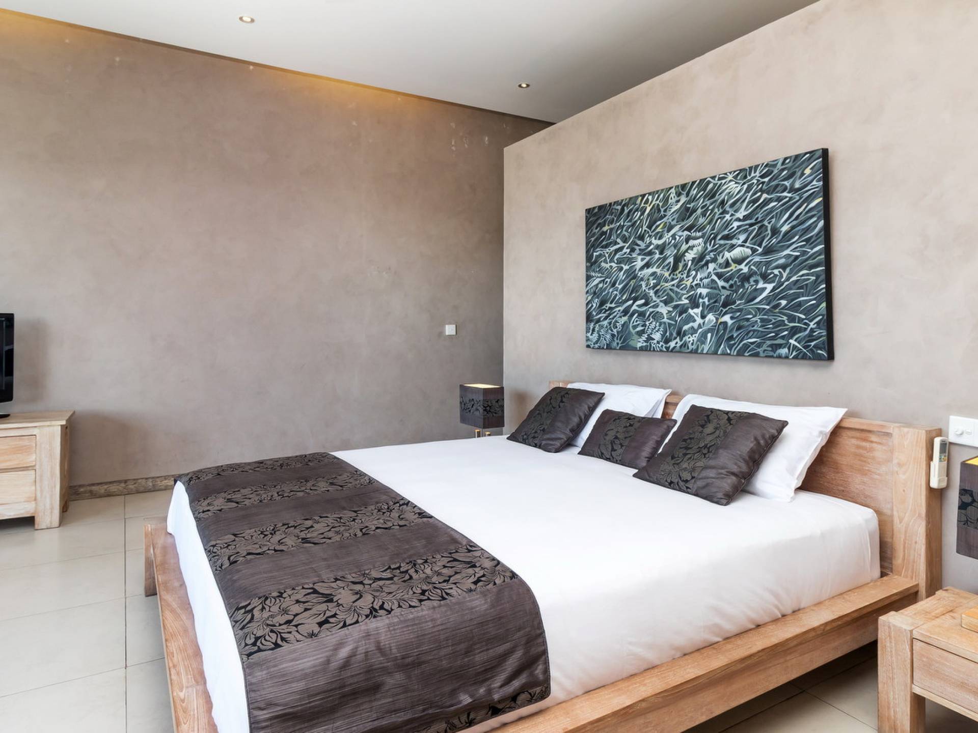 На первом уровне двухэтажного павильона вы найдете элегантное жилое пространство открытой планировки виллы Lisa, с прямым выходом на деревянную террасу для загара, откуда вы можете прыгнуть в сверкающую воду бассейна. . Благодаря потрясающему минималистичному дизайну интерьера, отделанному натуральным местным камнем и деревом, вилла Lisa дышит элегантностью и безмятежностью. Пространство обогащено тщательно подобранными традиционными произведениями искусства, придающими пространству этническую атмосферу, и предлагает удобные места, где можно вместе насладиться напитками, пообедать и посмотреть фильмы. На кухне есть барная стойка с табуретами, где можно насладиться кофе утром и коктейлями вечером. В центре стоит деревянный обеденный стол для завтрака, обеда и ужина, если вы не собираетесь еще раз поужинать на знаменитой улице еды в модном районе Оберой в Семиньяке. Справа находится современный плюшевый диван, на котором можно расслабиться, напротив огромного настенного телевизора с плоским экраном, чтобы развлечься на вилле в уютный вечер, проведенный в помещении.