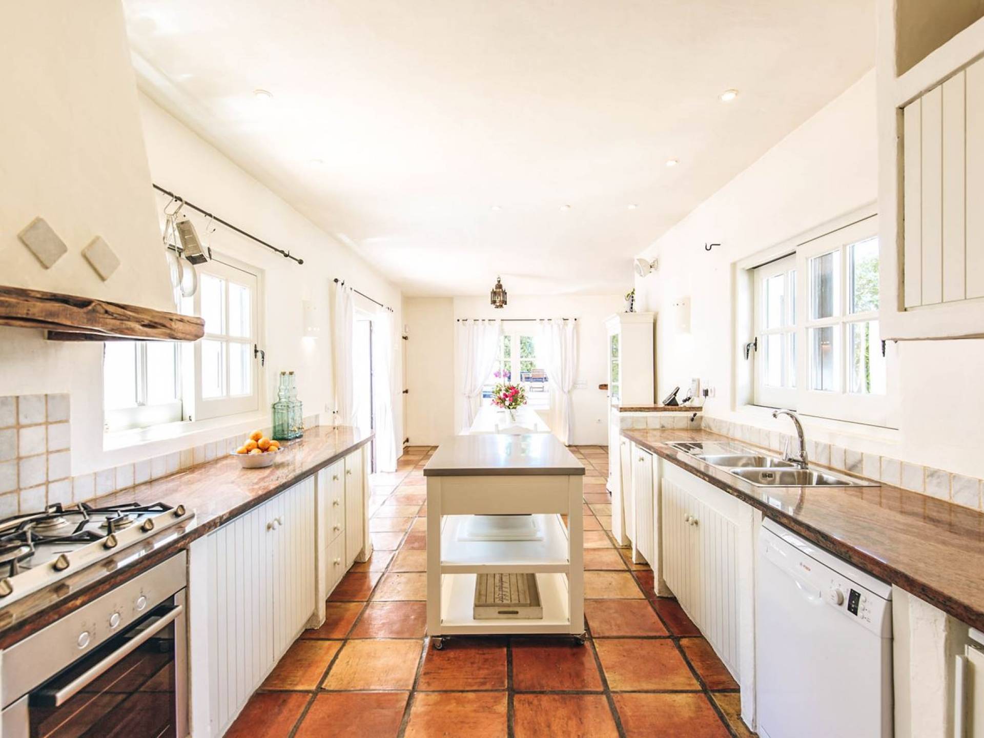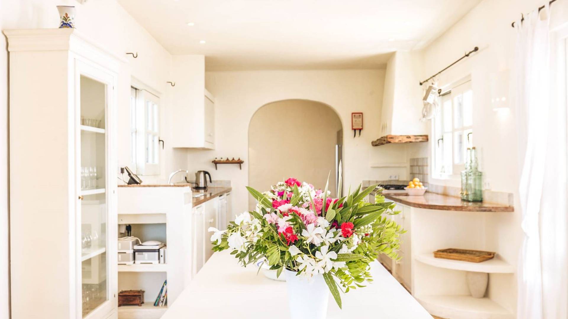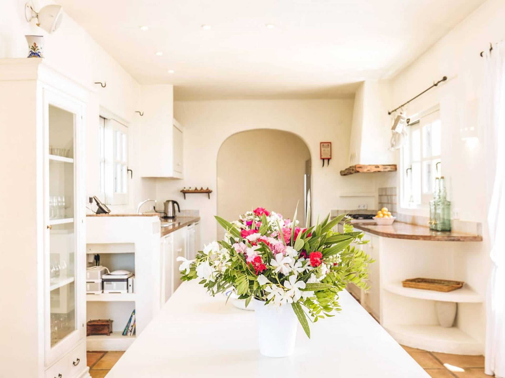 Внутри есть просторная гостиная с огромными диванами и камином; есть большой телевизор с доступом к спутниковому пакету Movistar, двойные стеклянные двери, ведущие на террасу, ведущую к бассейну, кондиционер, Wi-Fi и система Sonos. В холле на первом этаже есть гостевой туалет для удобства. Большая, светлая кухня в традиционном стиле полностью оборудована и имеет открытую планировку с обеденной зоной, а также имеет двойные стеклянные двери, ведущие на террасу.