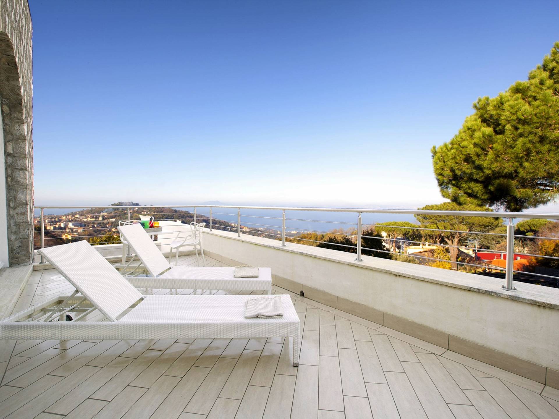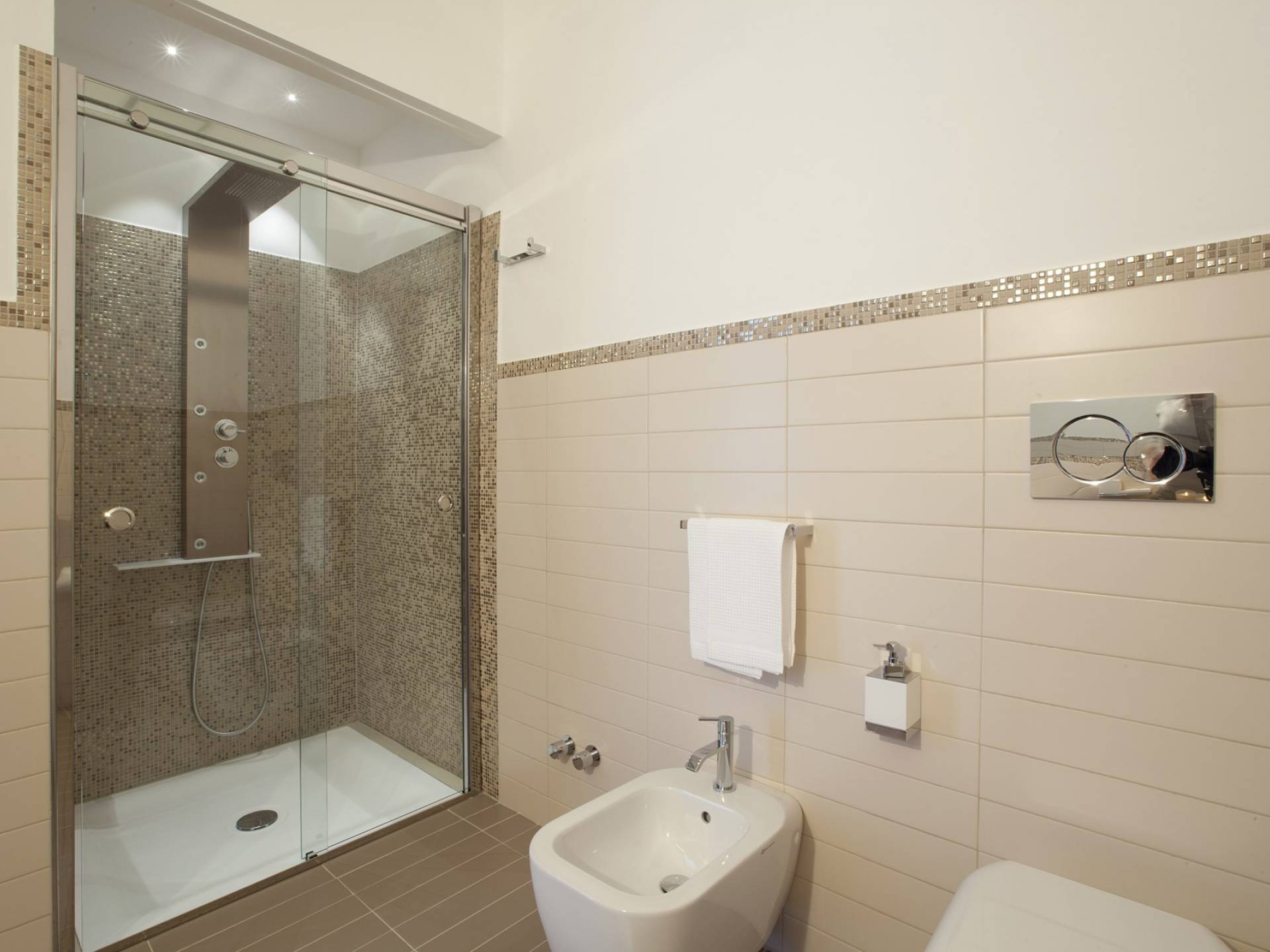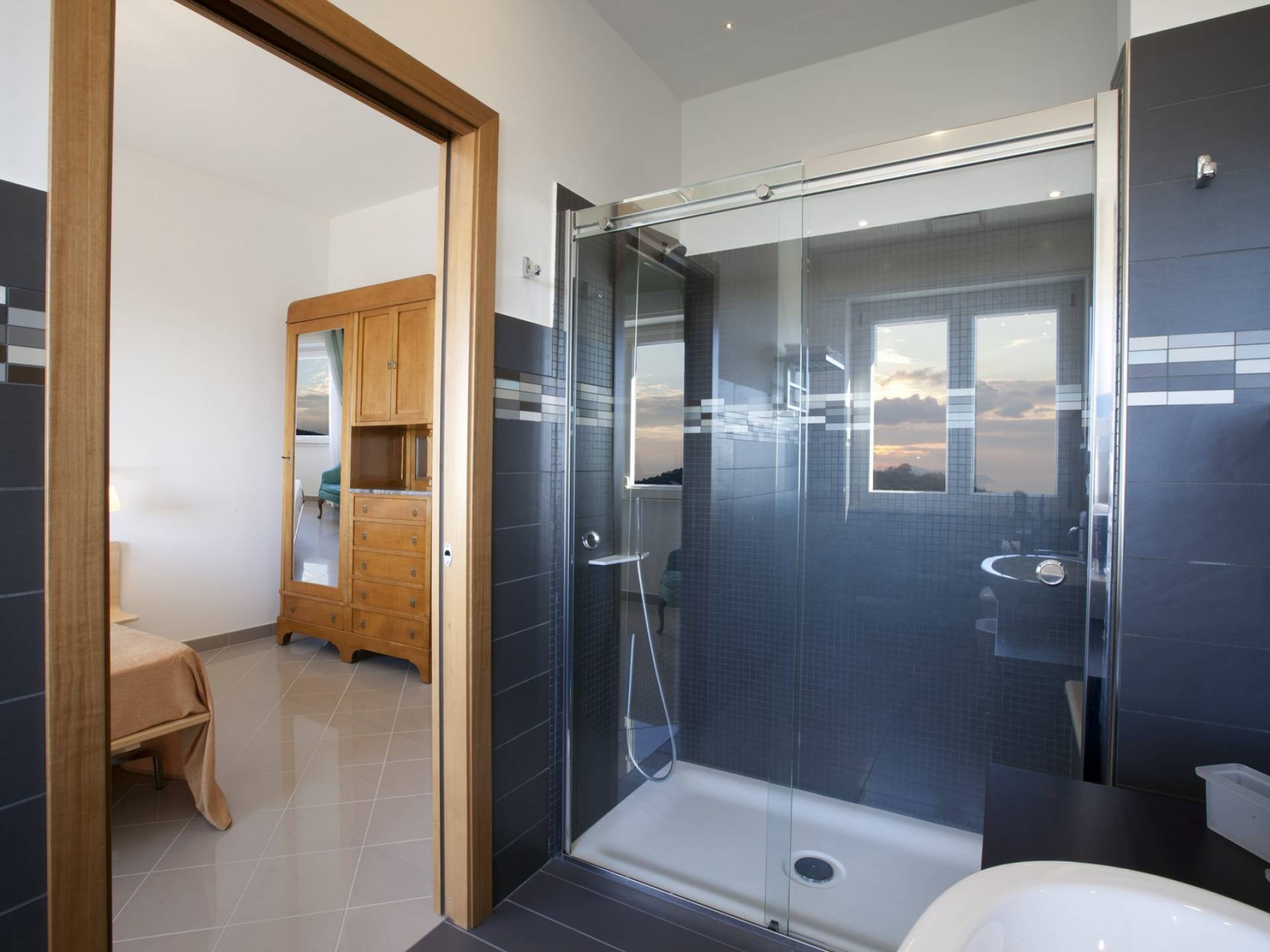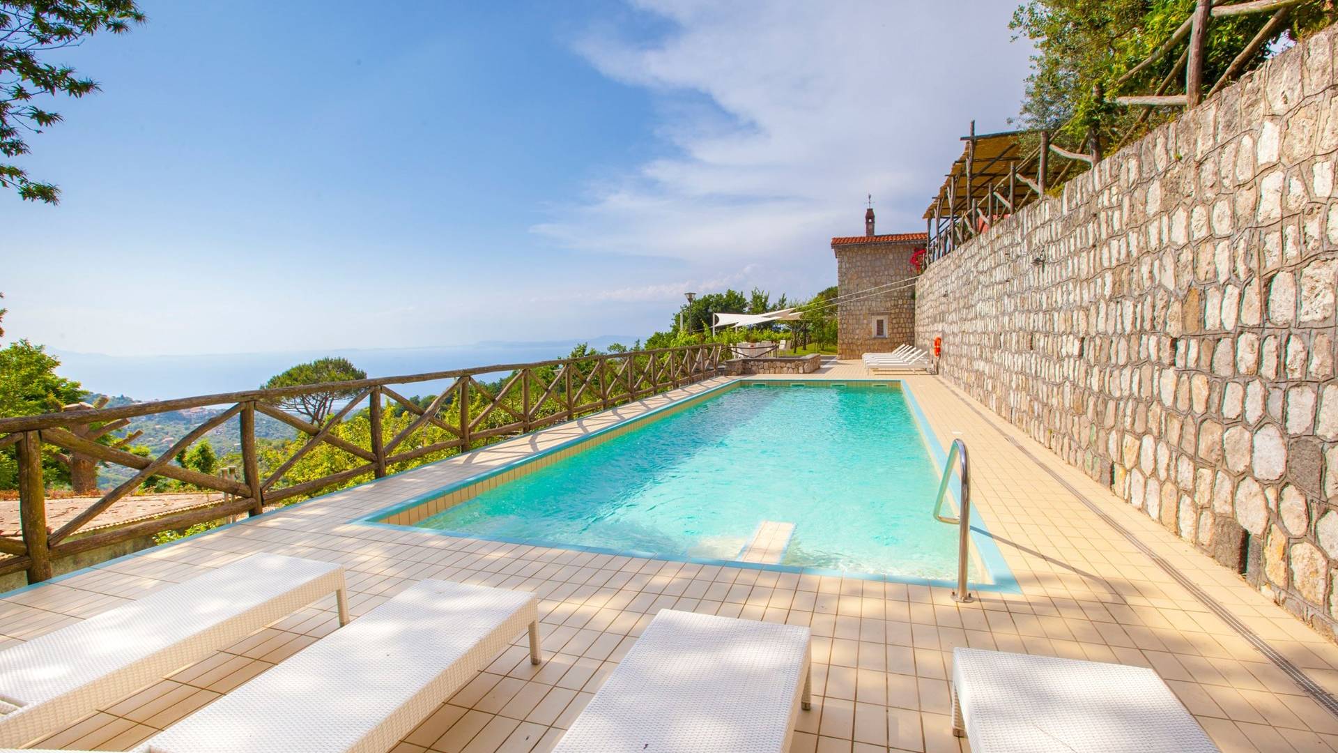 На нижней террасе находится великолепный бассейн с внутренним гидромассажем, большой солярий с шезлонгами, зонтиками, столами и стульями, внешний душ, а также удобная раздевалка с небольшой ванной. Также в вашем распоряжении характерная беседка со столами, стульями и дровяной печью, где вы можете насладиться приготовлением классической неаполитанской пиццы!