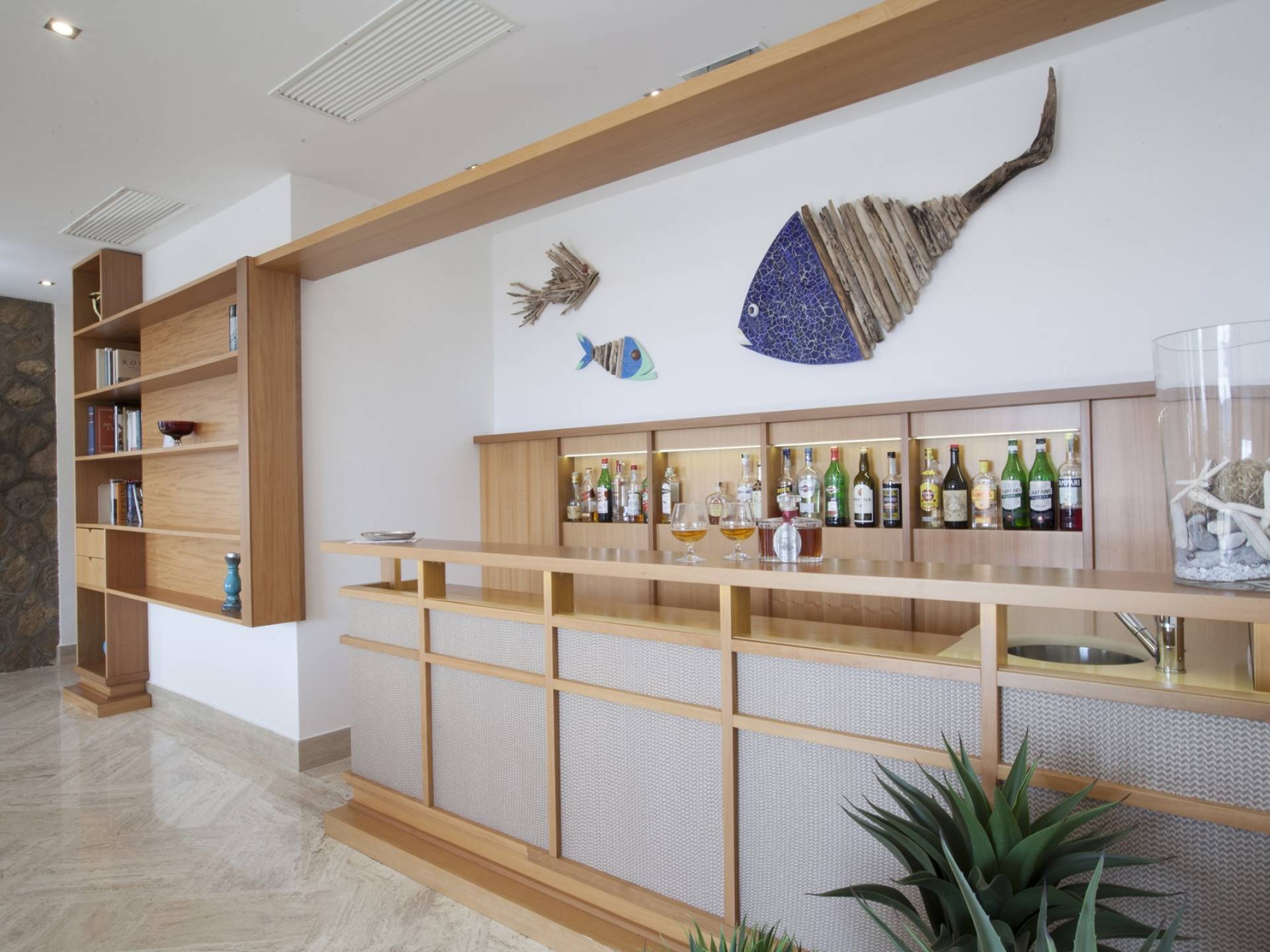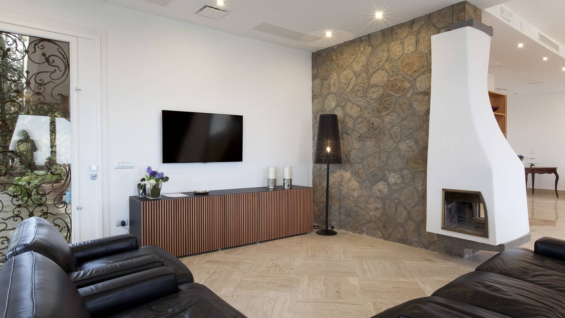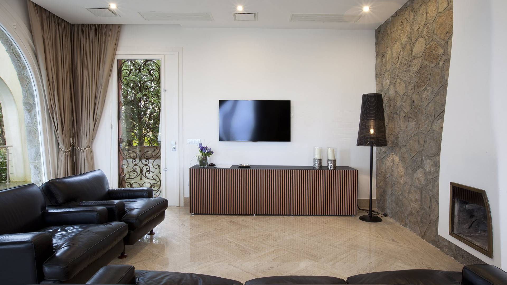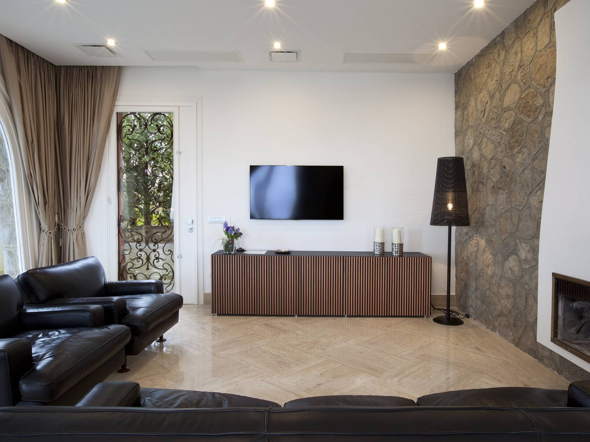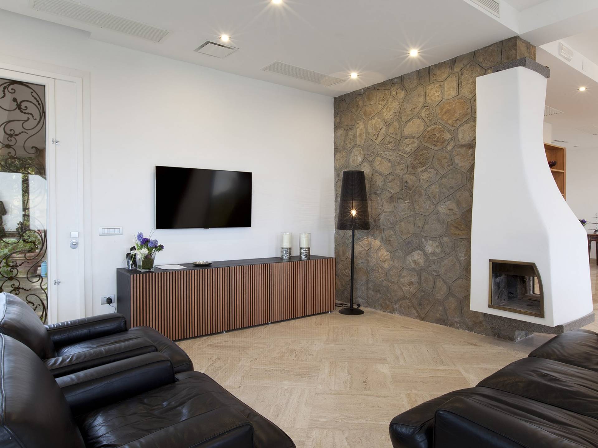 На первом этаже большая гостиная-столовая с камином, угловая барная стойка, просторная кухня, кабинет, туалет. На первом этаже, помимо комнат, вы найдете мини-бассейн с джакузи для любителей релаксации. Терраса соединяет виллу с полностью оборудованным тренажерным залом с сауной.