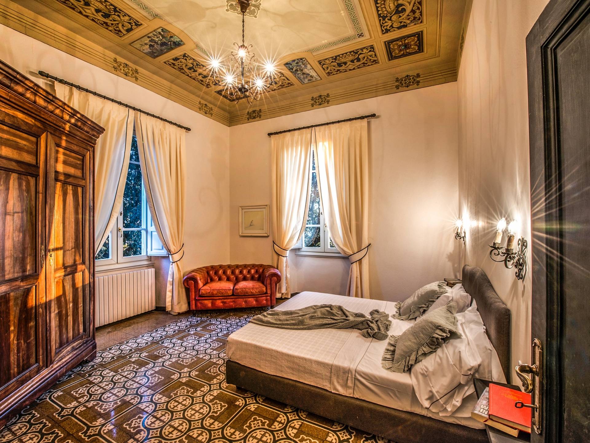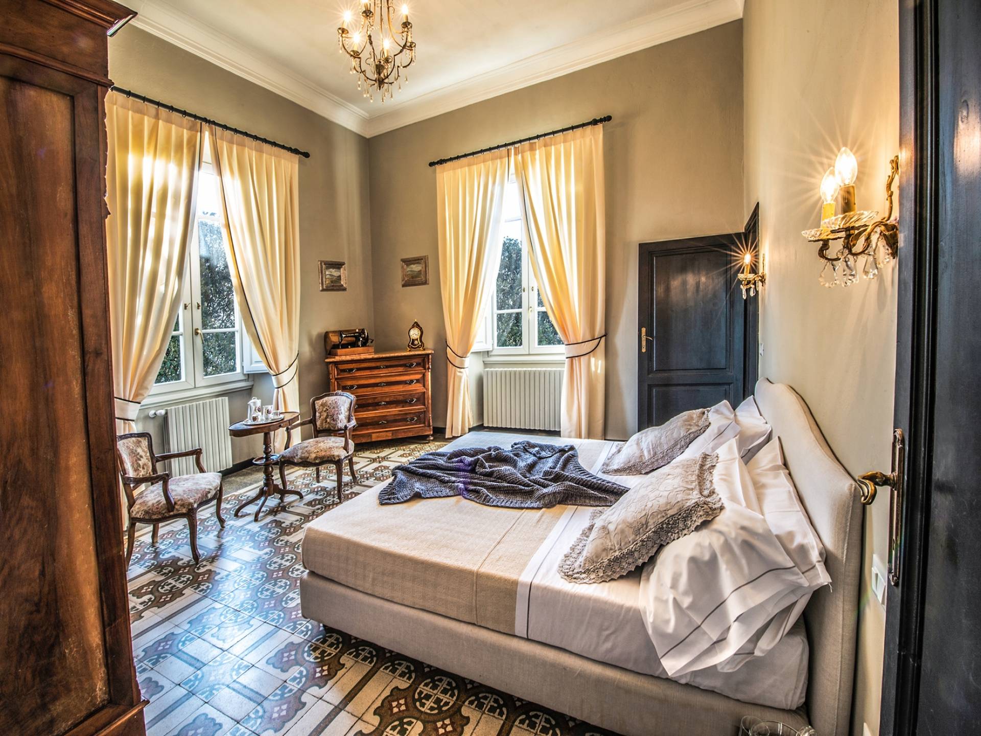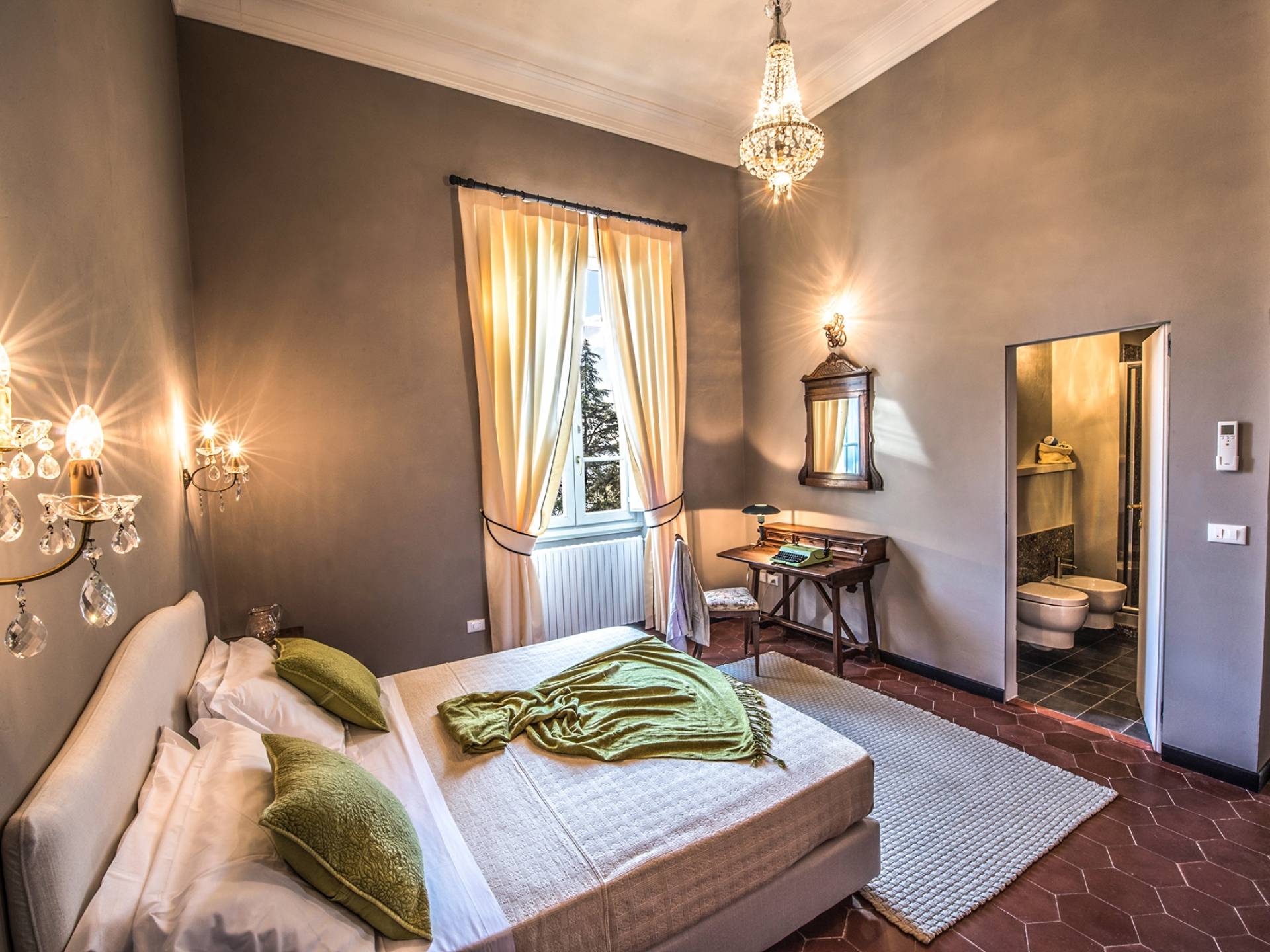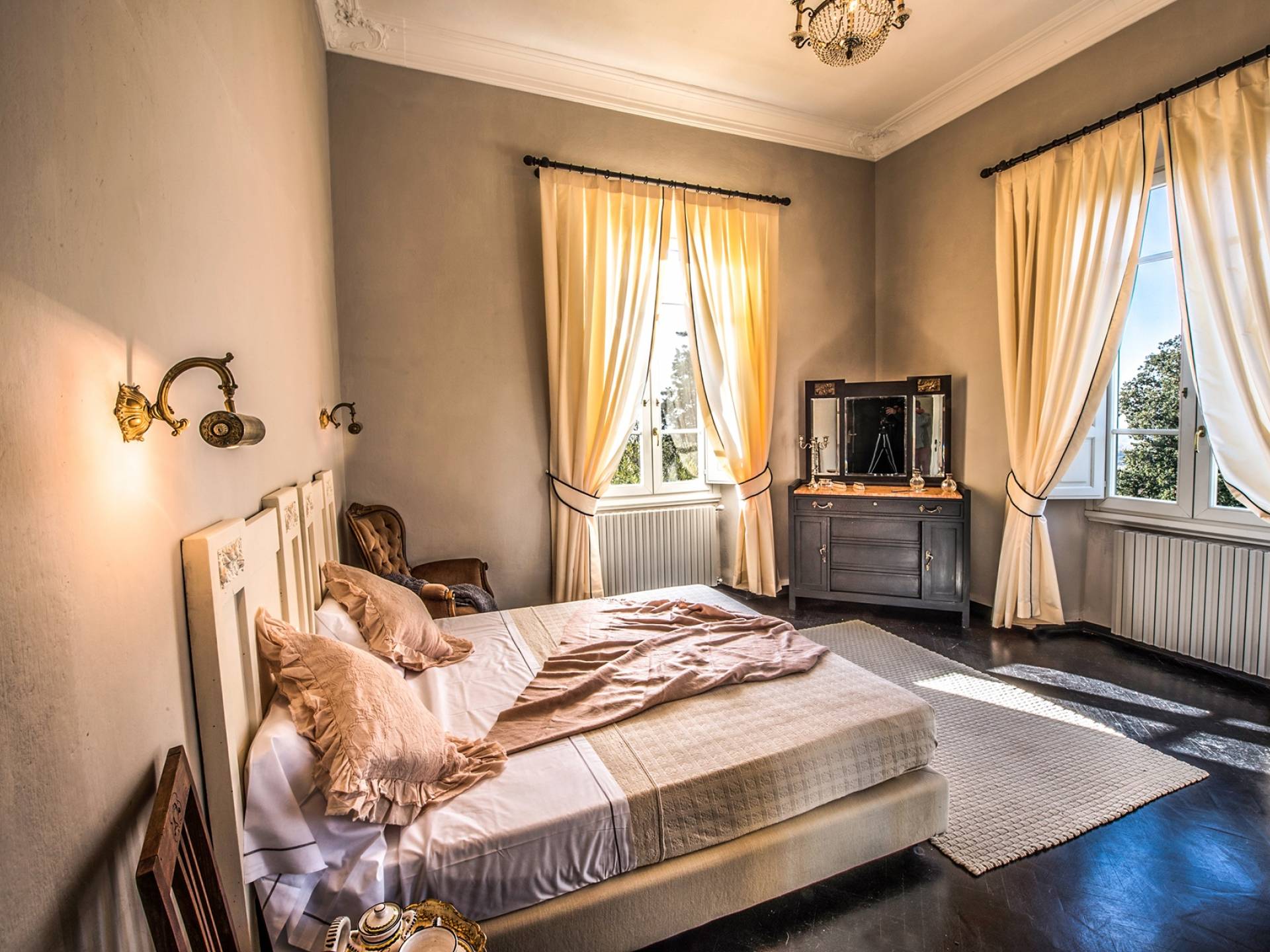 Спальни в спальной зоне очень большие, с французскими кроватями, старинными письменными столами, очень высокими потолками и оригинальной напольной плиткой начала 20 века, уникальной мебелью и шторами. В спальню ведет очаровательная мраморная лестница. Вилла расположена на двух уровнях и занимает площадь около 500 квадратных метров. В большой гостиной вас ждут комфортабельные гостиные с камином, диванами с пуфами, удобными креслами и уголками для чтения. Большая кухня (плита с пятью конфорками, духовка, посудомоечная машина, микроволновая печь, морозильная камера, кофеварка) также оборудована всем необходимым и может с комфортом разместить за столом десяток человек.