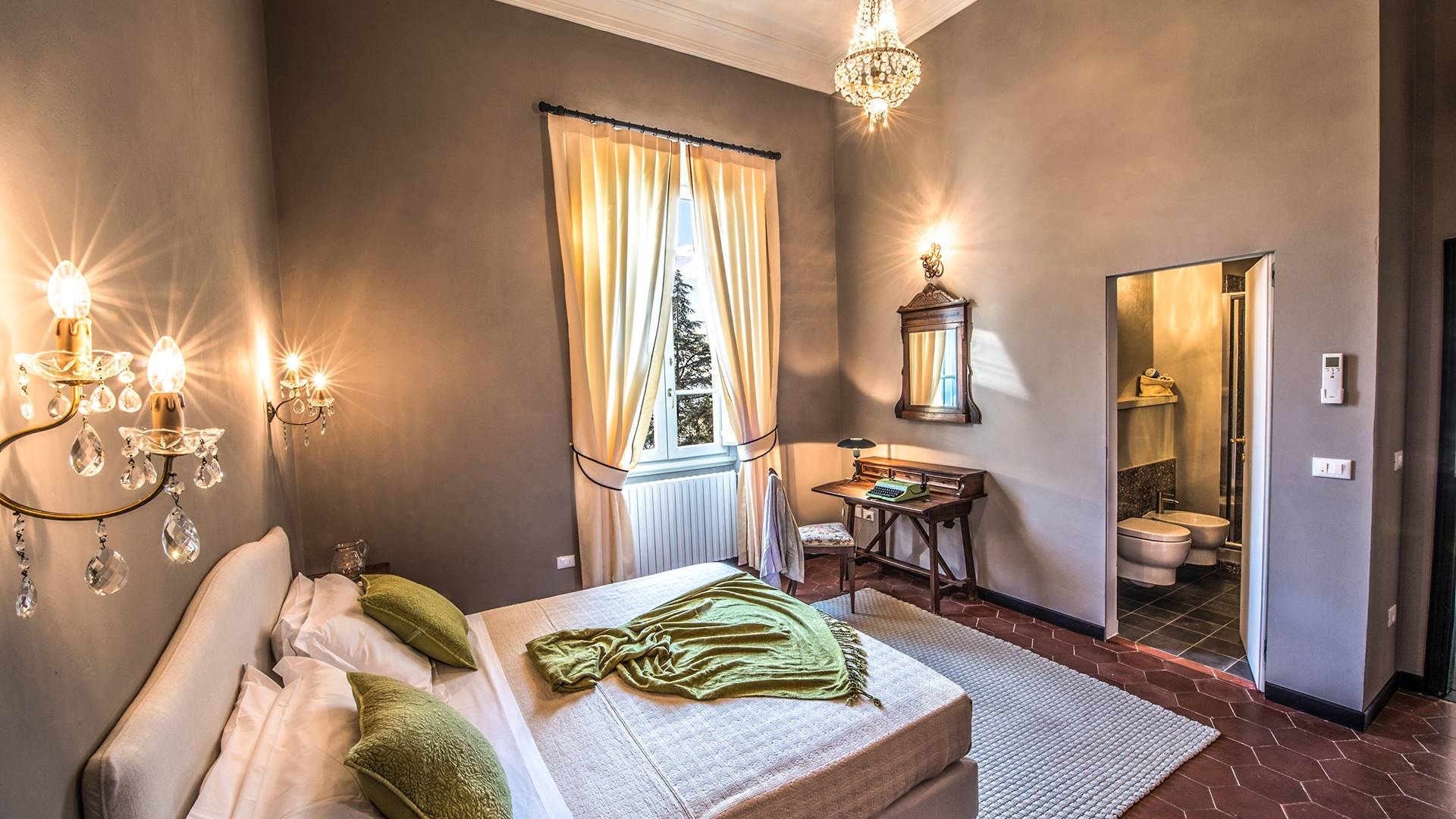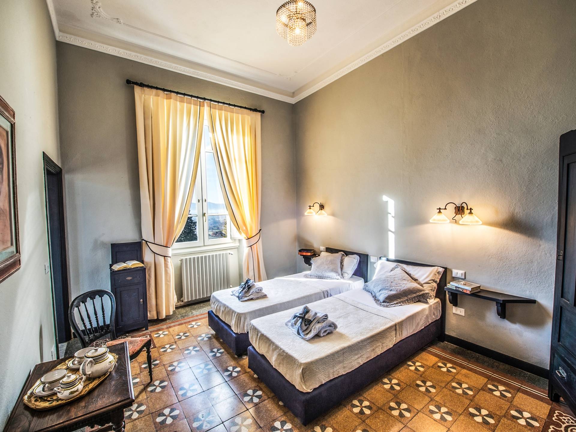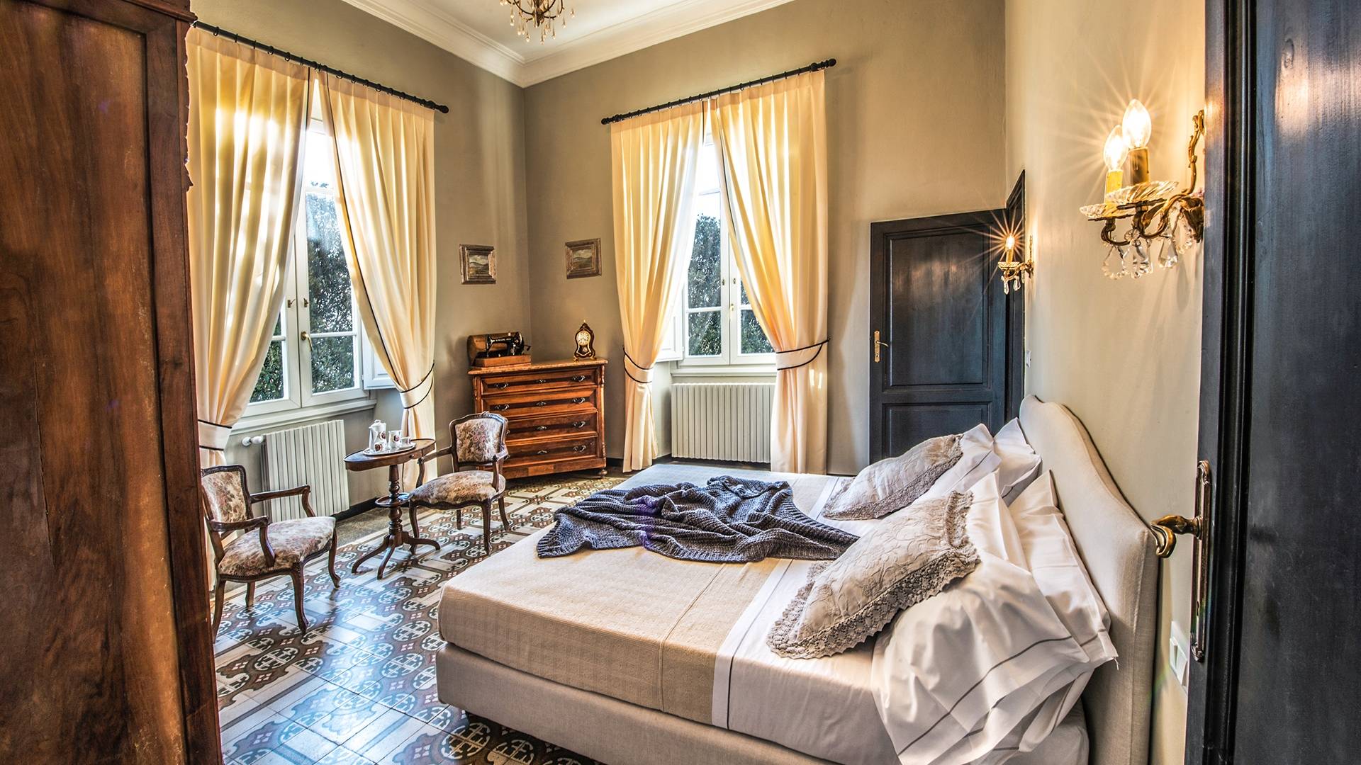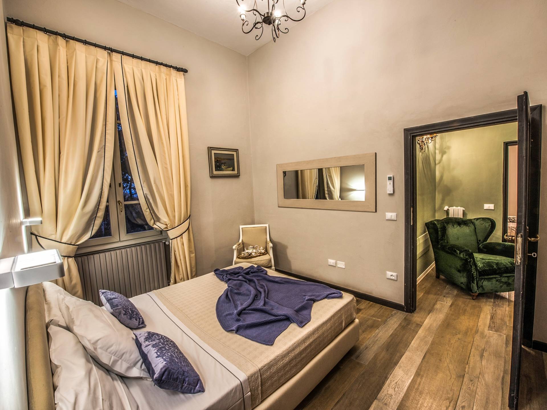 Спальни в спальной зоне очень большие, с французскими кроватями, старинными письменными столами, очень высокими потолками и оригинальной напольной плиткой начала 20 века, уникальной мебелью и шторами. В спальню ведет очаровательная мраморная лестница. Вилла расположена на двух уровнях и занимает площадь около 500 квадратных метров. В большой гостиной вас ждут комфортабельные гостиные с камином, диванами с пуфами, удобными креслами и уголками для чтения. Большая кухня (плита с пятью конфорками, духовка, посудомоечная машина, микроволновая печь, морозильная камера, кофеварка) также оборудована всем необходимым и может с комфортом разместить за столом десяток человек.