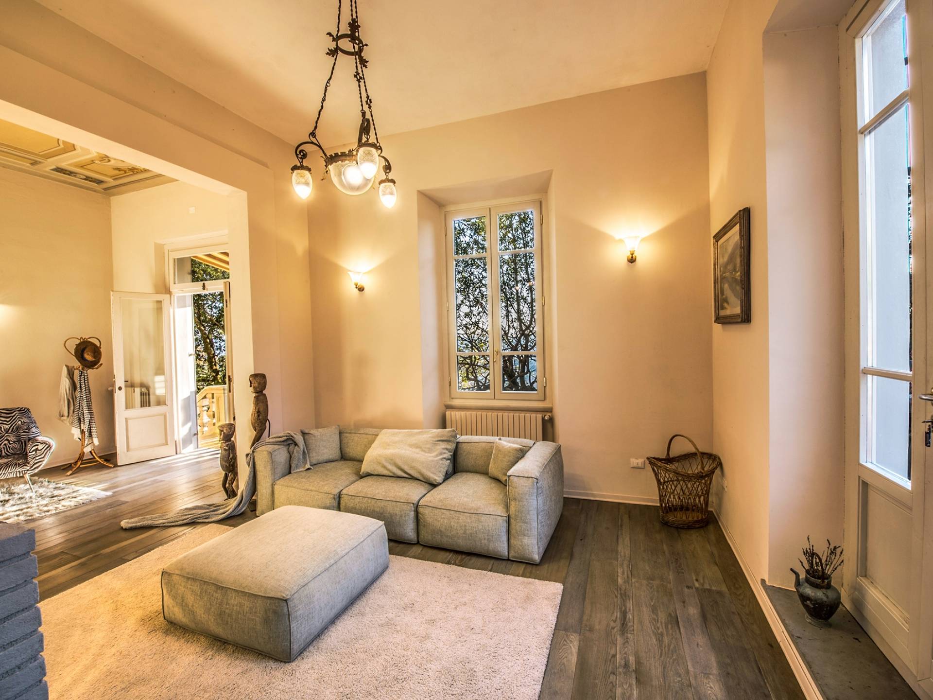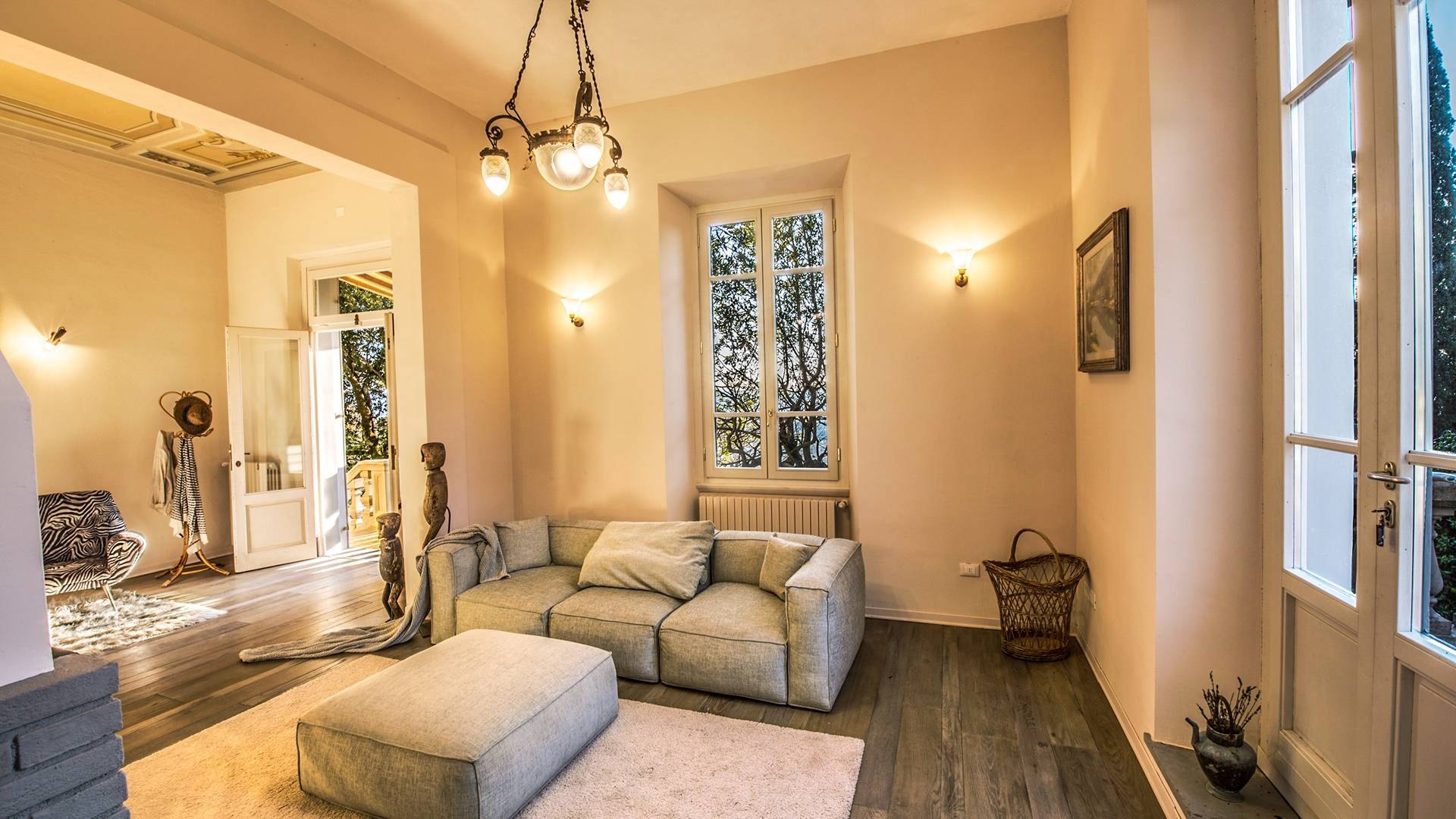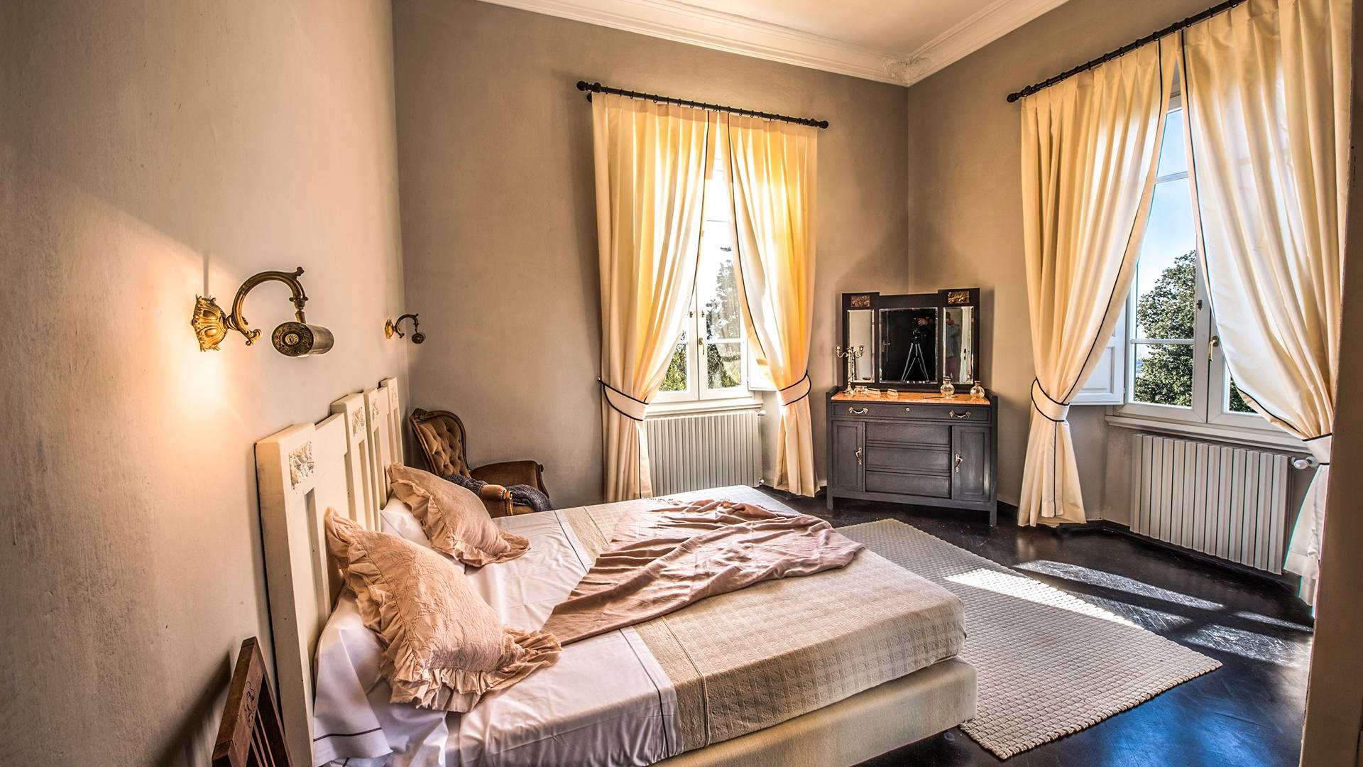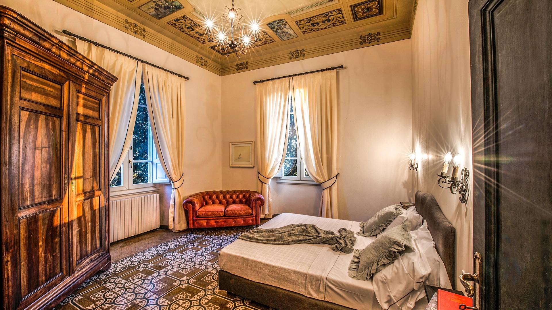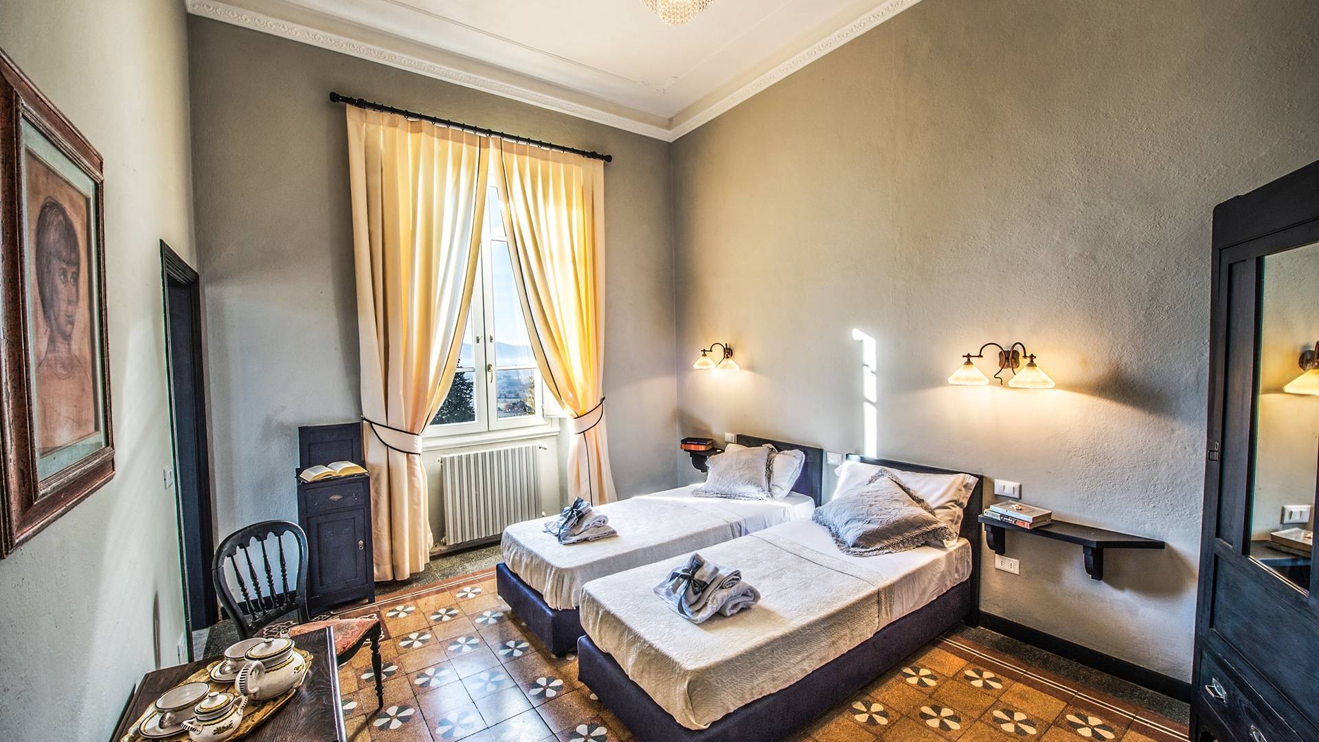 Спальни в спальной зоне очень большие, с французскими кроватями, старинными письменными столами, очень высокими потолками и оригинальной напольной плиткой начала 20 века, уникальной мебелью и шторами. В спальню ведет очаровательная мраморная лестница. Вилла расположена на двух уровнях и занимает площадь около 500 квадратных метров. В большой гостиной вас ждут комфортабельные гостиные с камином, диванами с пуфами, удобными креслами и уголками для чтения. Большая кухня (плита с пятью конфорками, духовка, посудомоечная машина, микроволновая печь, морозильная камера, кофеварка) также оборудована всем необходимым и может с комфортом разместить за столом десяток человек.