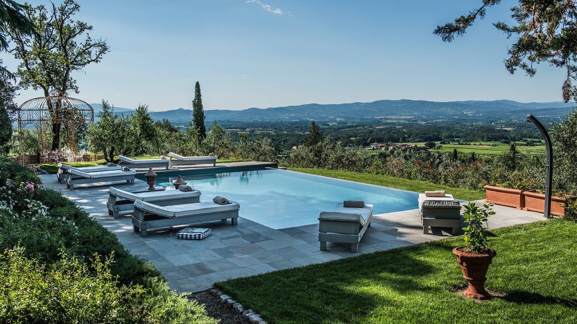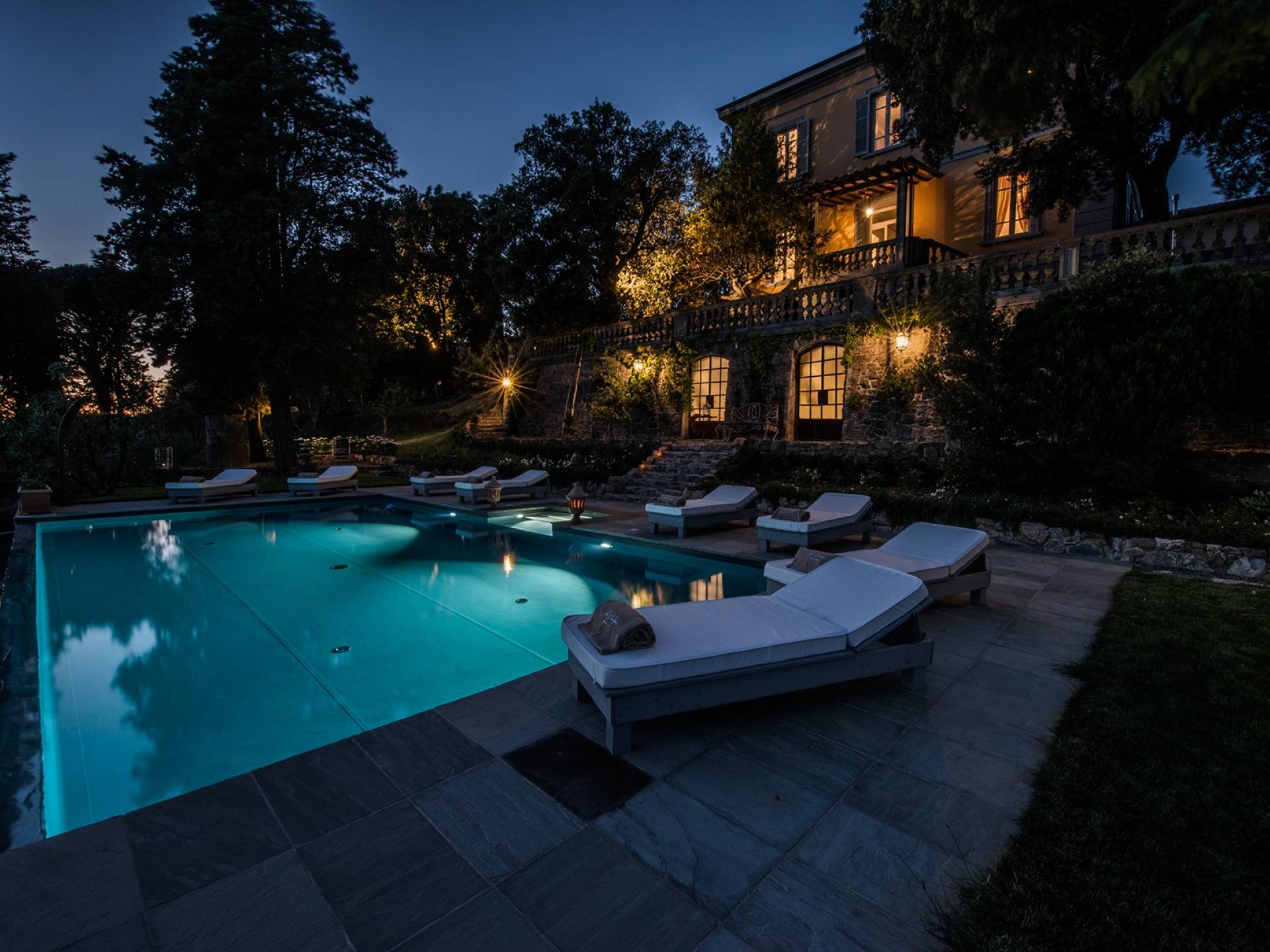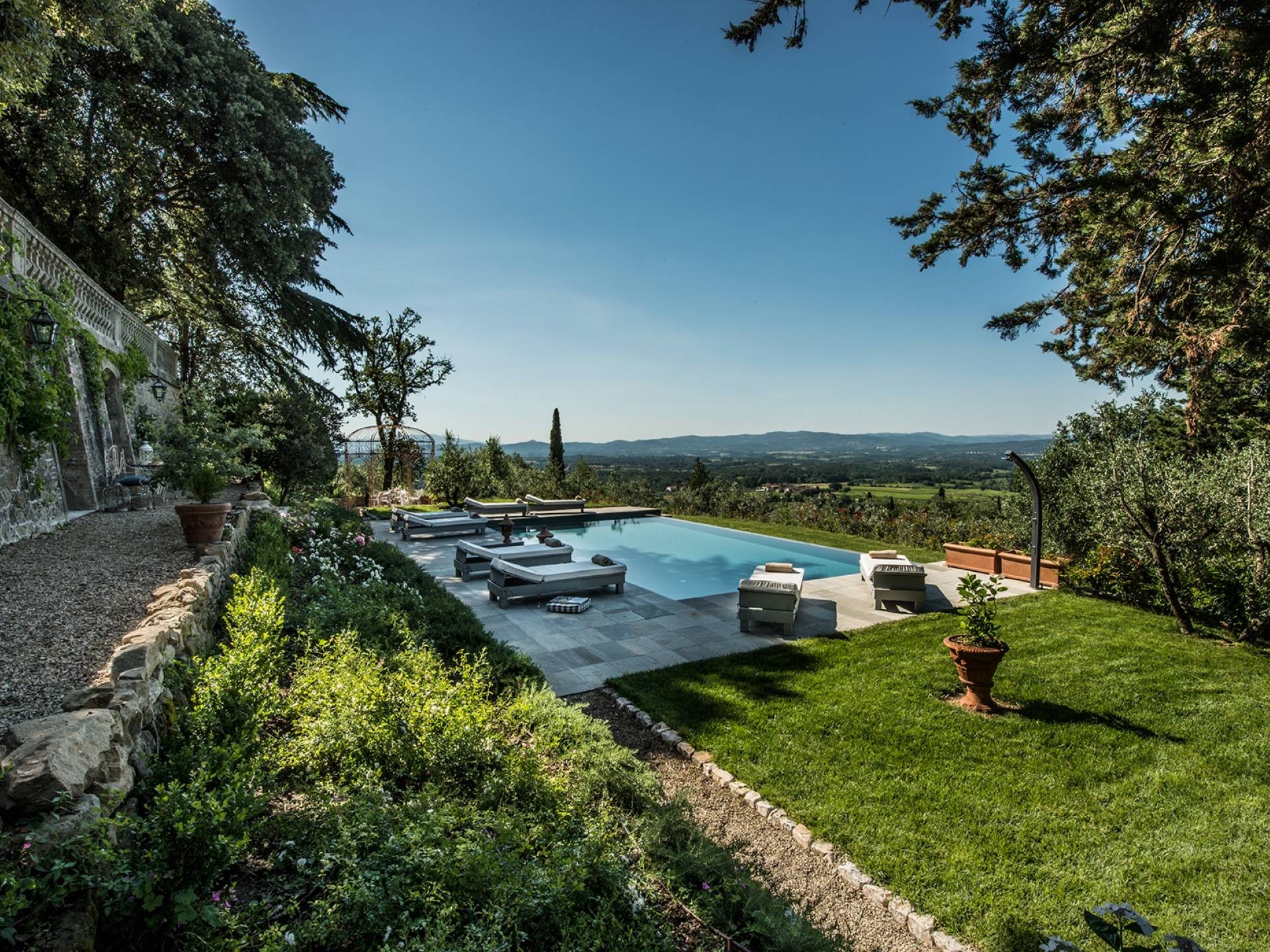 В парке, расположенном на территории площадью почти 2 гектара, полностью огороженной, очаровательный бассейн (12 м x 7) с бесконечной гранью заставит вас почувствовать себя погруженными в зеленую природу тосканских холмов. У бассейна удобные шезлонги сделают ваш день очень приятным. Кроме того, на улице есть большие террасы, где вы можете перекусить, насладиться напитком, остановиться на мгновение и посидеть, чтобы поговорить с друзьями или поделиться интимными моментами в паре или семье.
